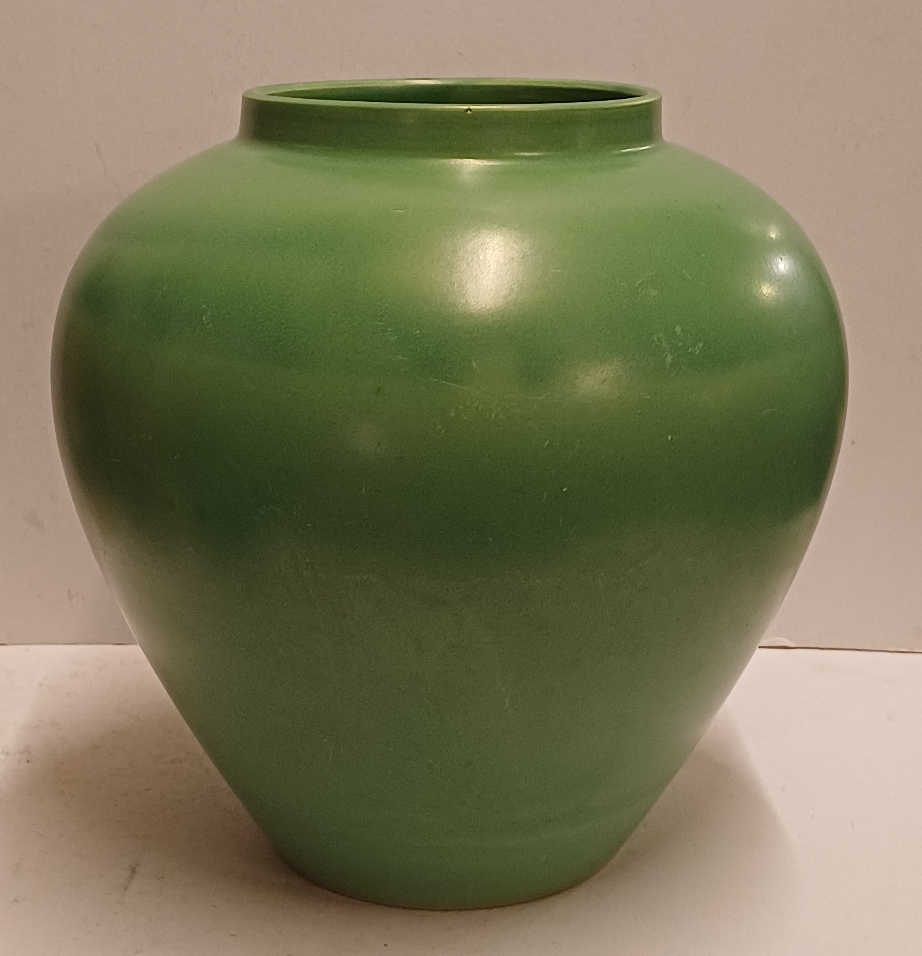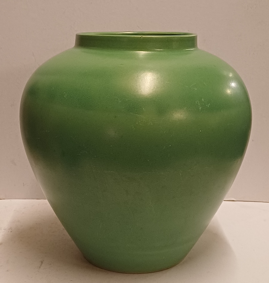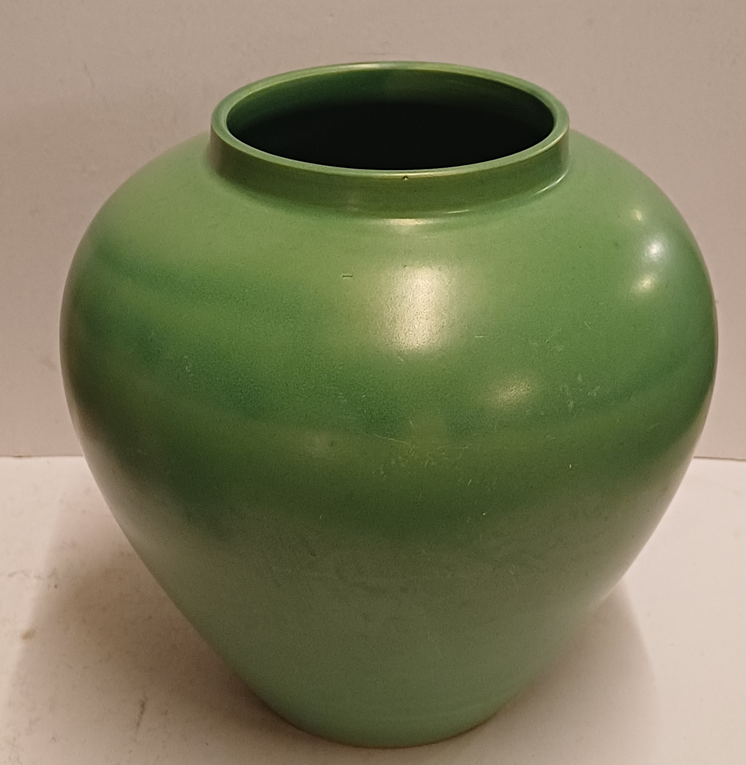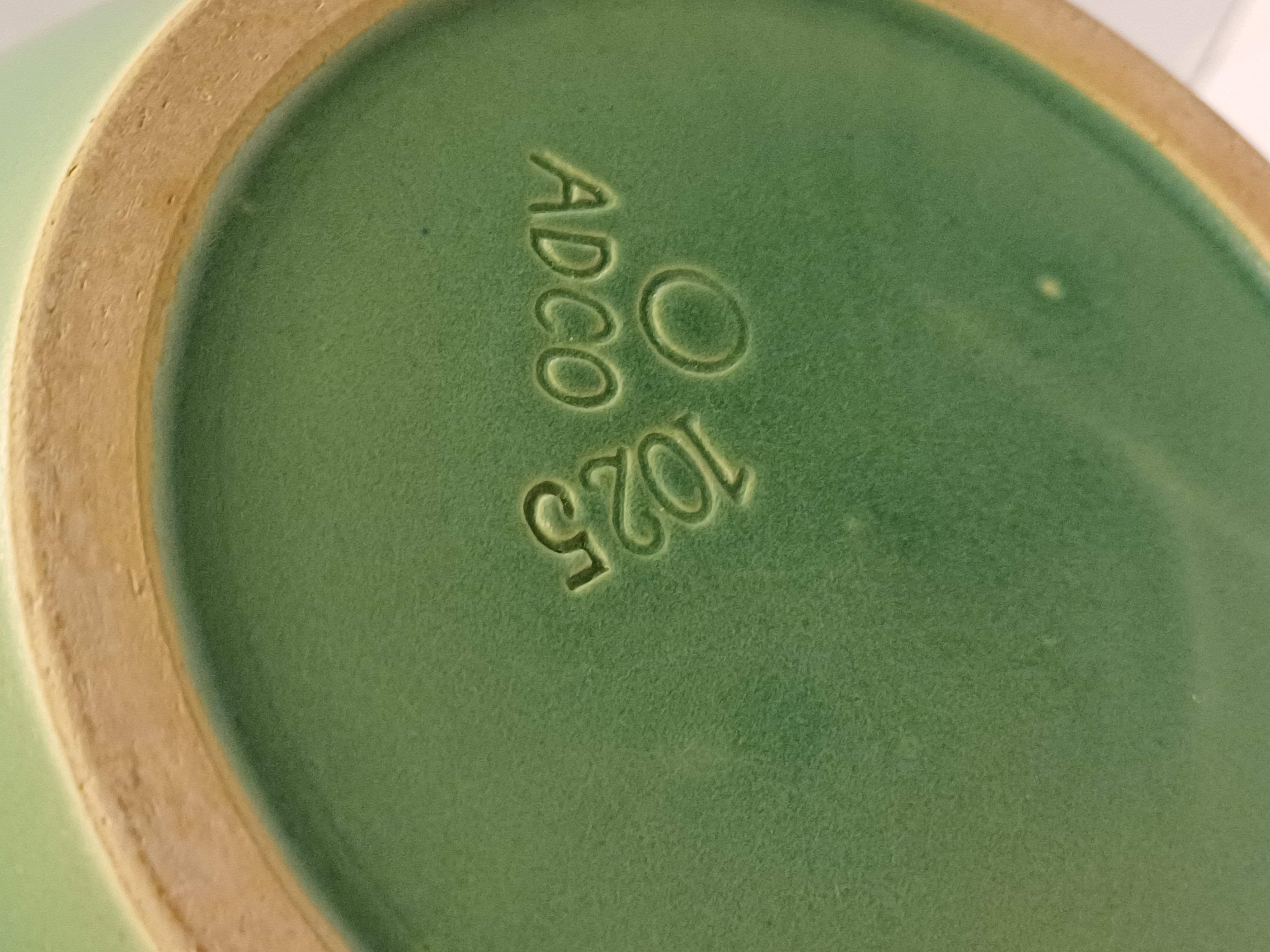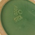 Aardewerken vaas met groene glazuur. Onderzijde met fabrieksmerk.