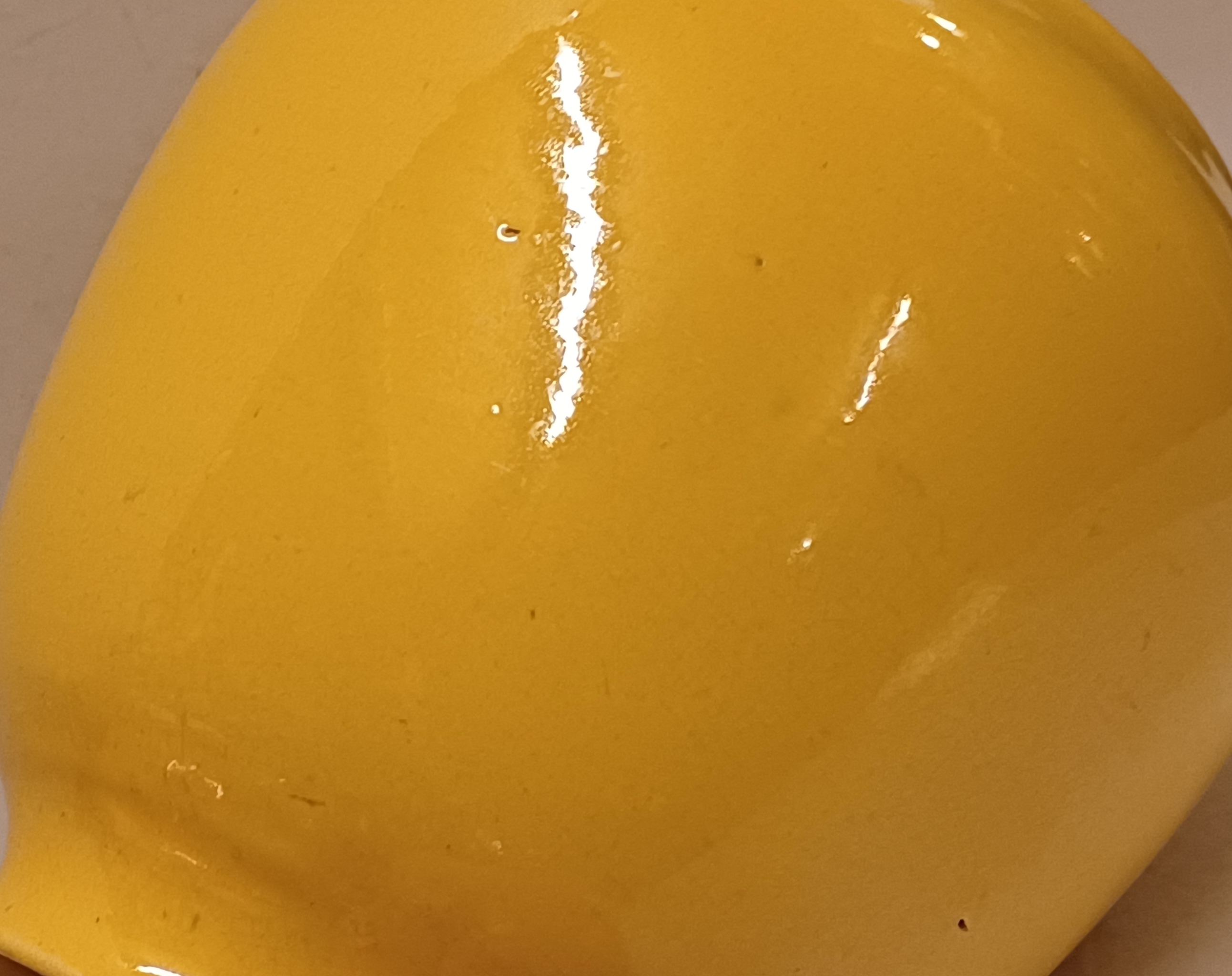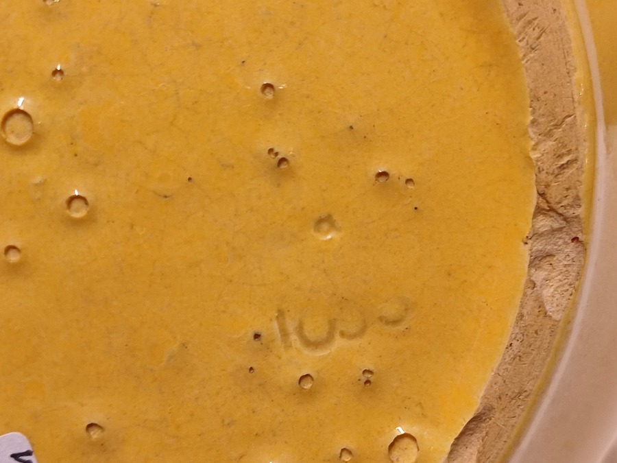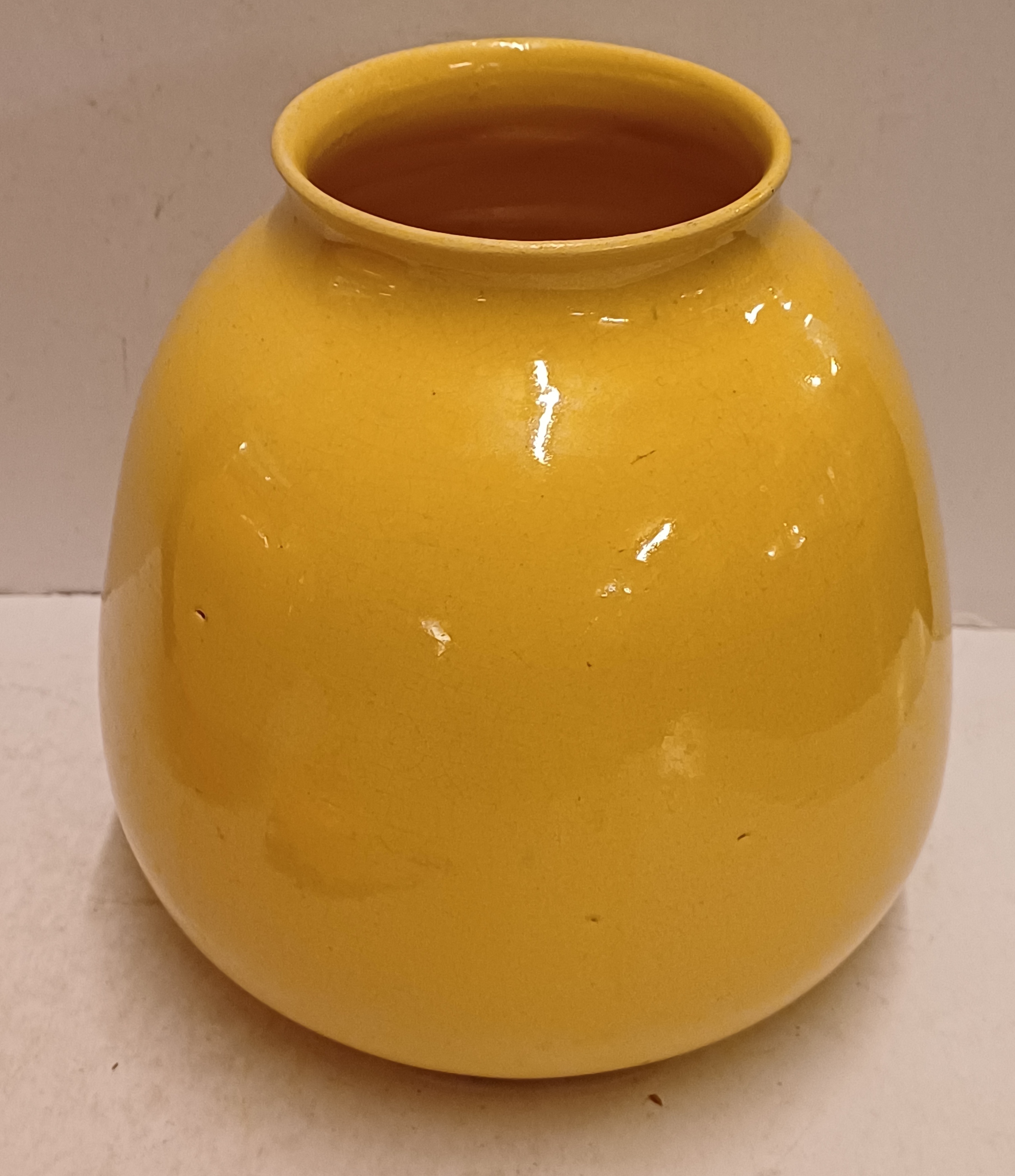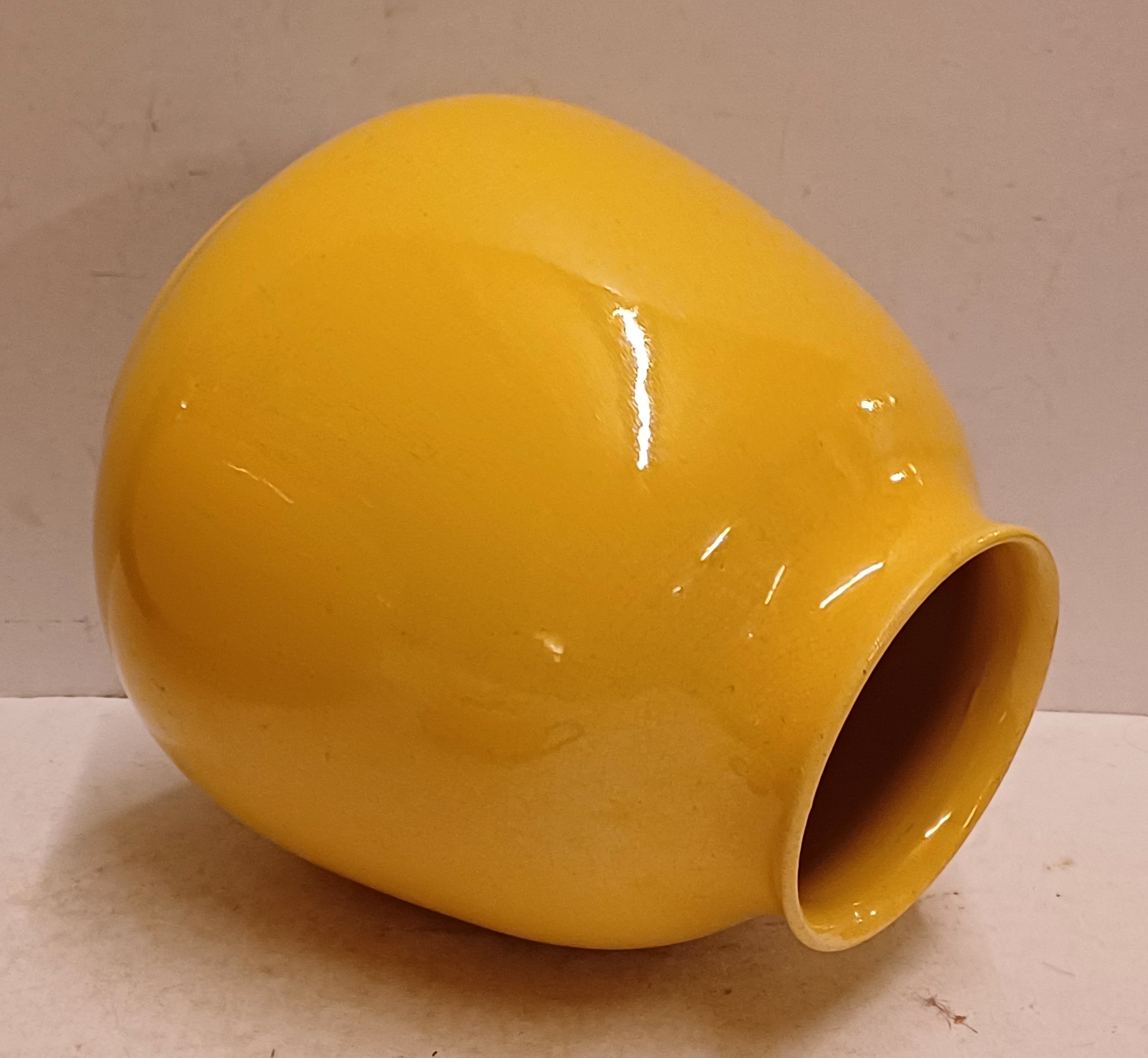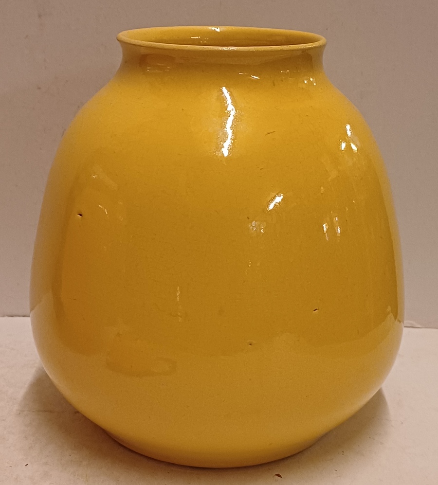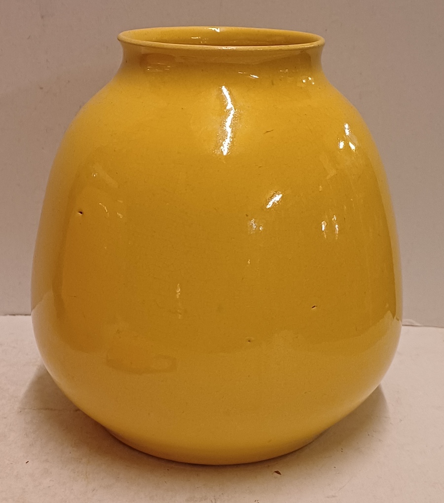 Aardewerken vaas met okergele glazuur. Onderzijde met fabrieksmerk en modelnummer.