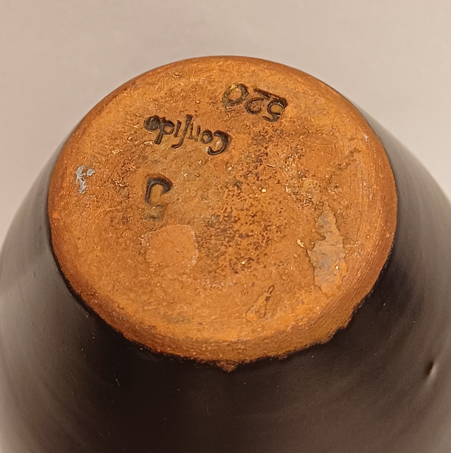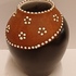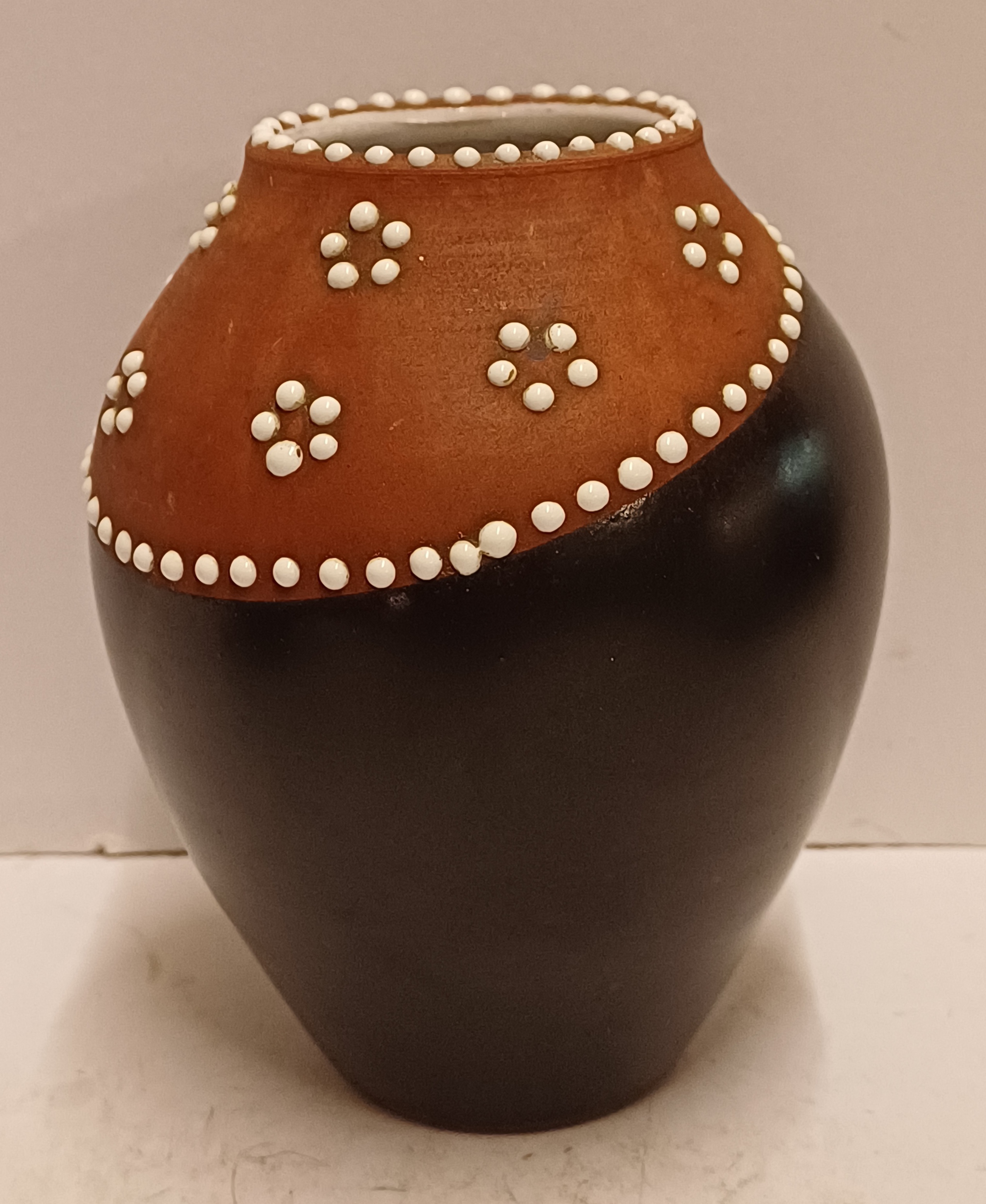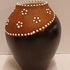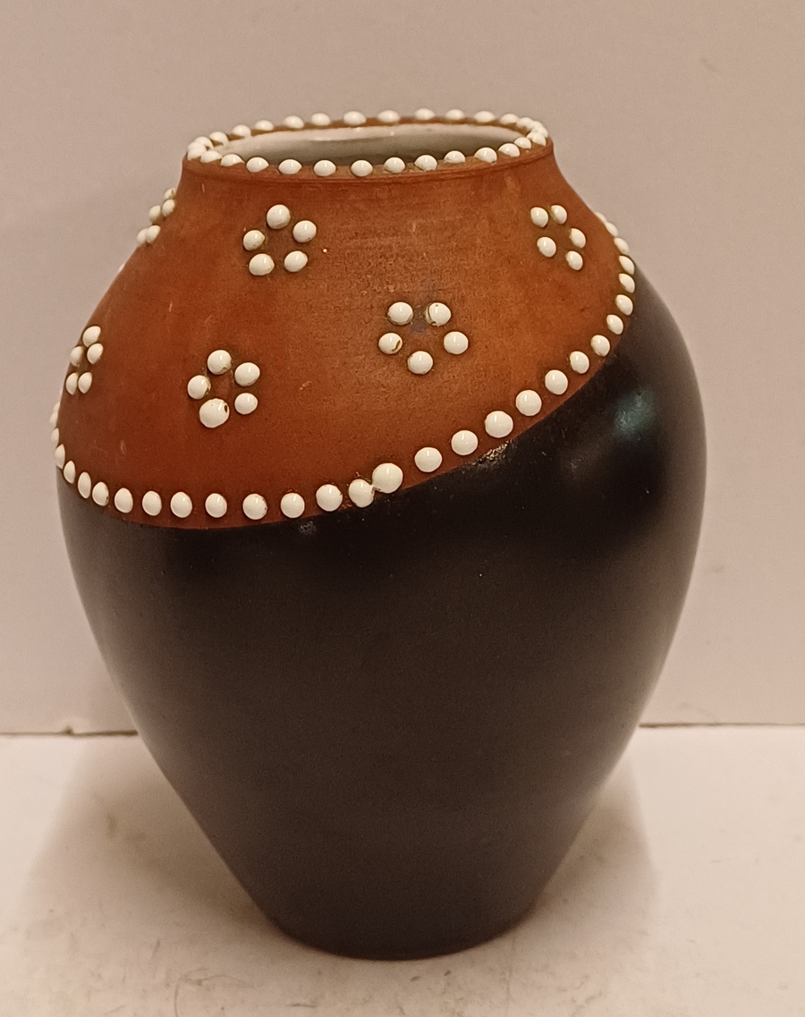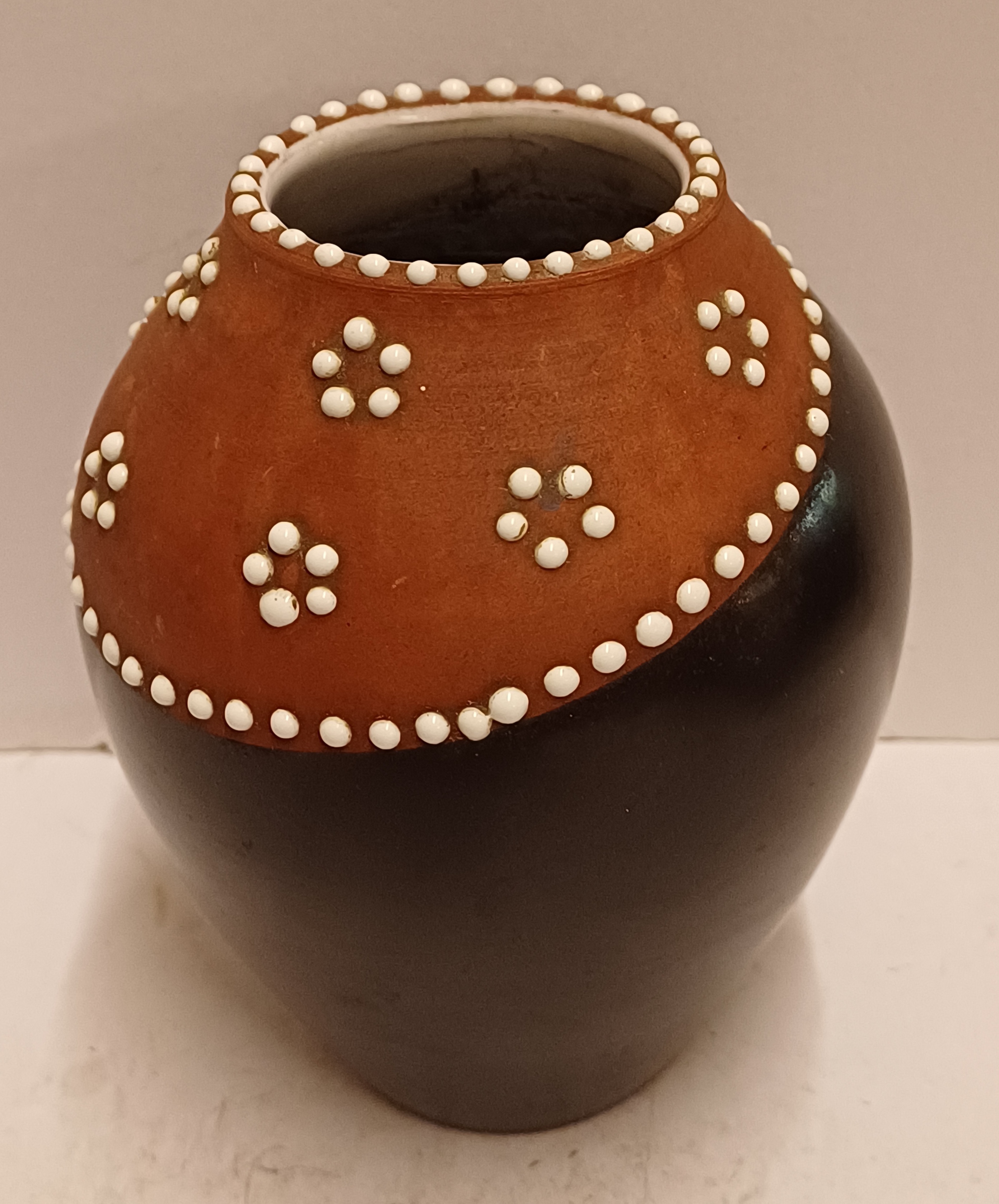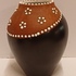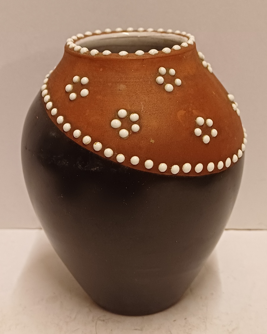 Jarrón de terracota con banda negra en el cuello y decoración de puntos de esmalte blanco. Parte inferior con marca estampada.