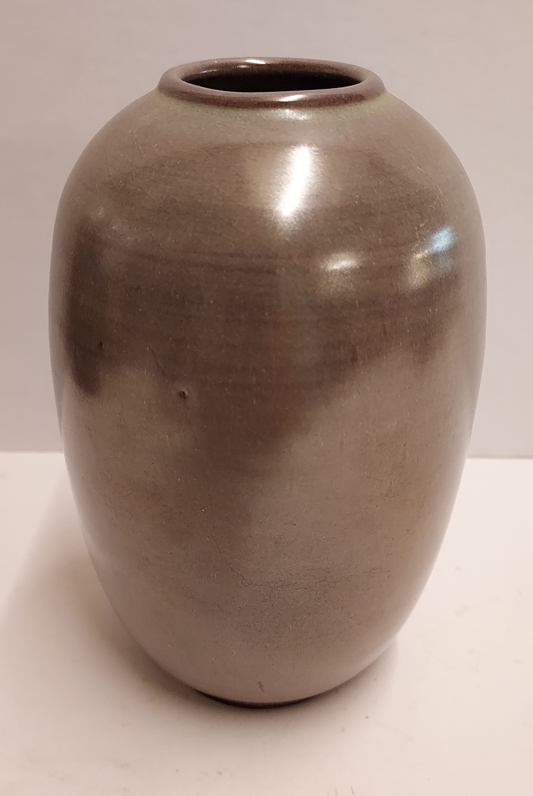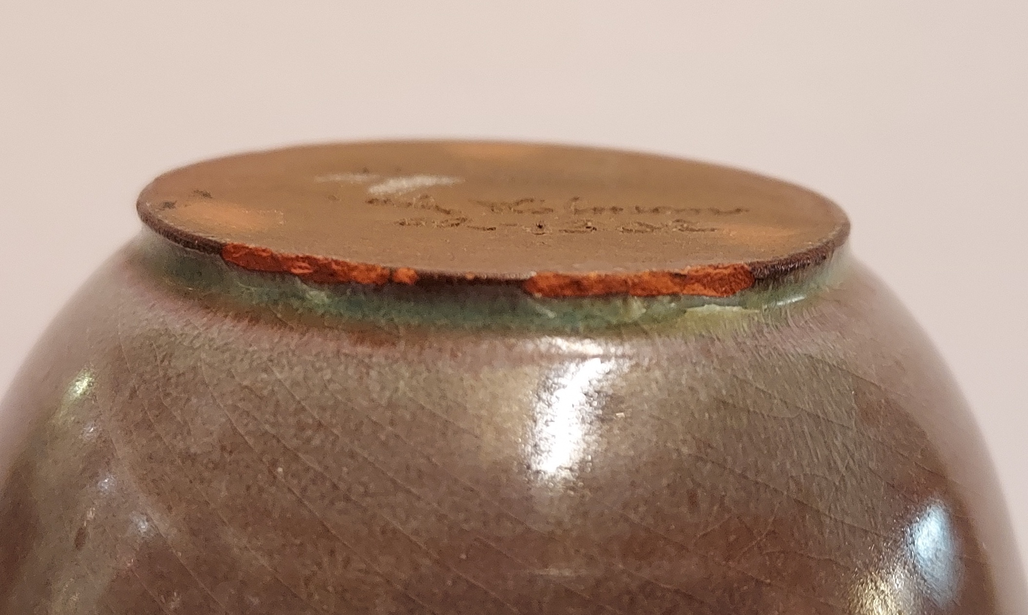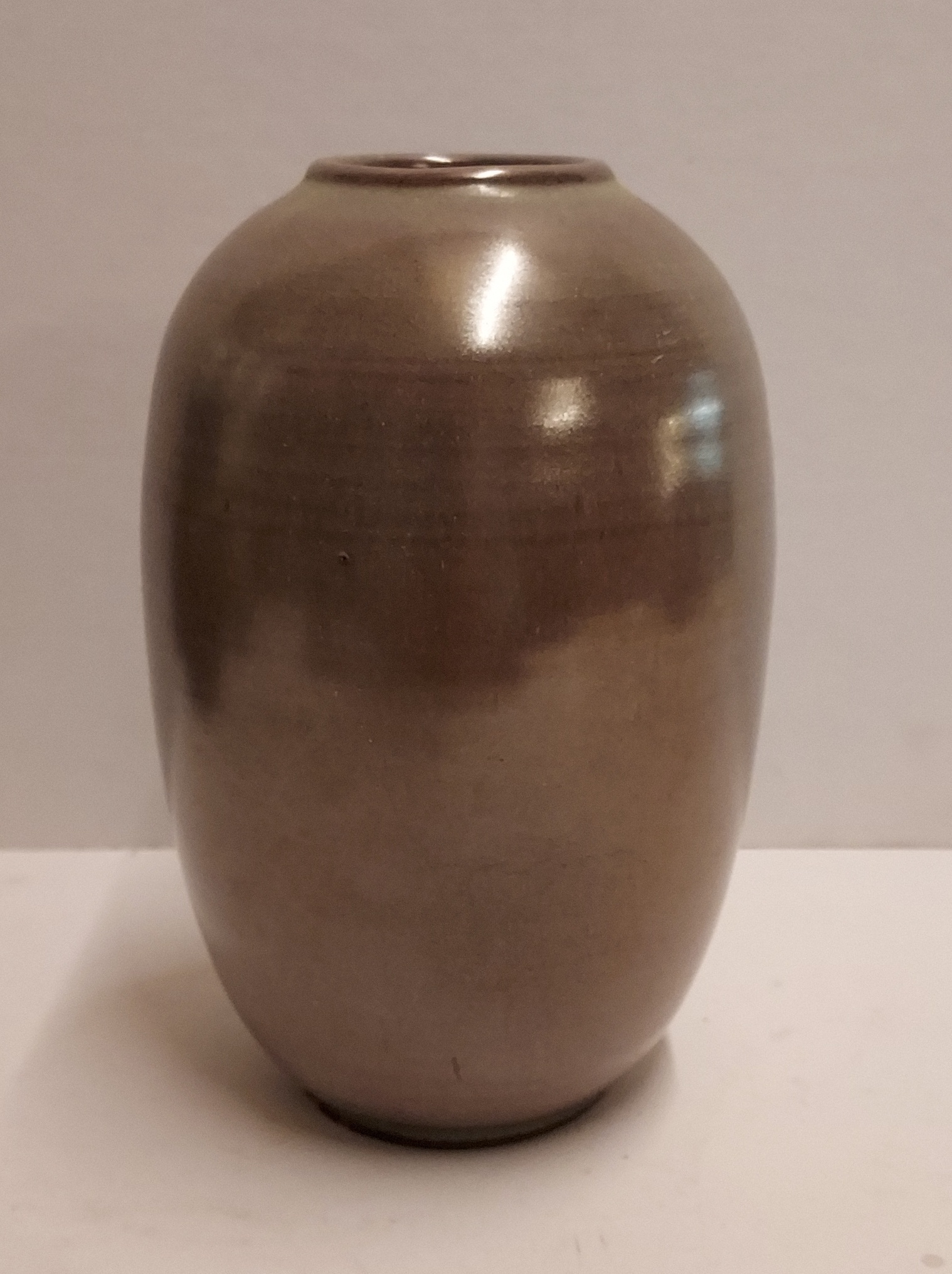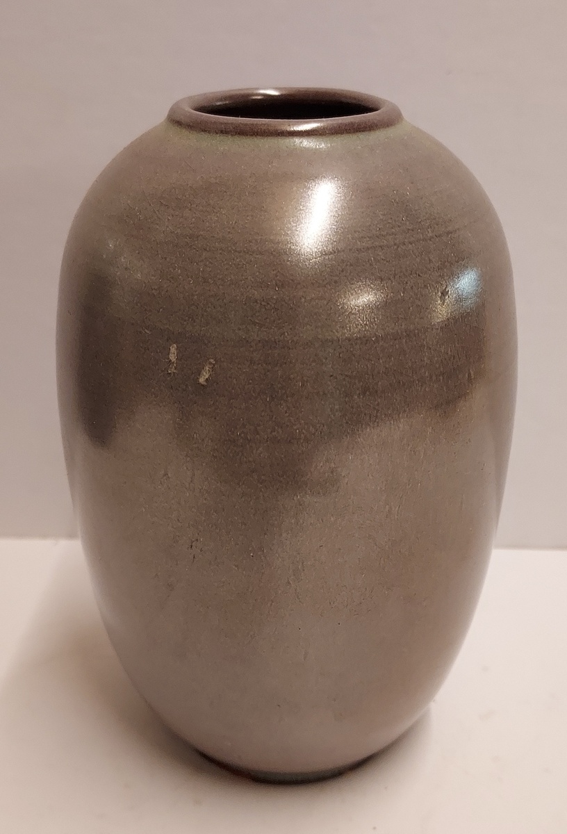 Jarrón esbelto con cuerpo esférico y esmalte brillante. Parte inferior firmada y fechada en 52.