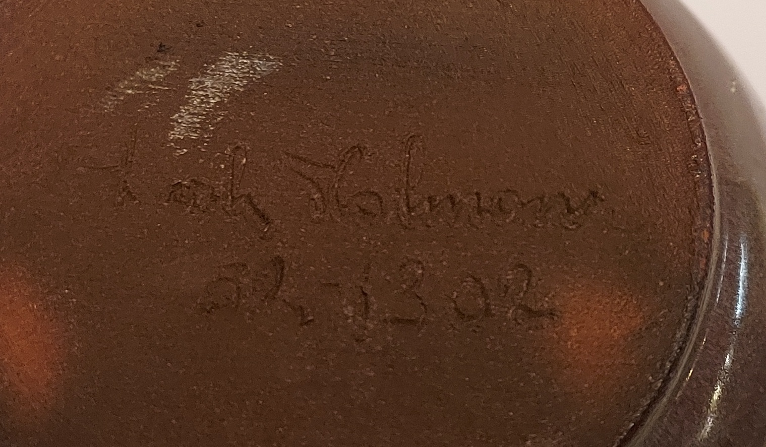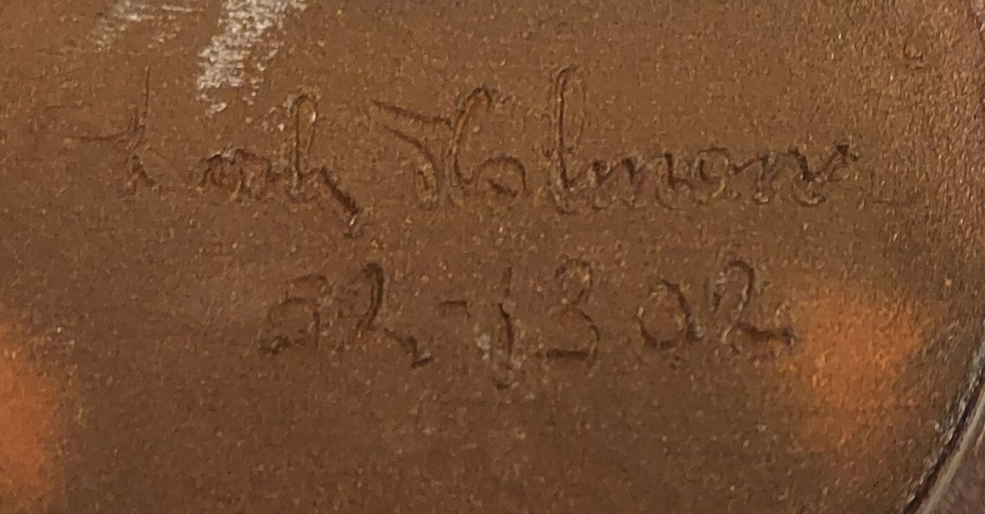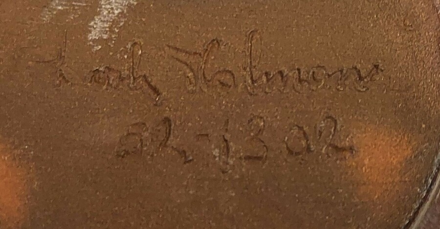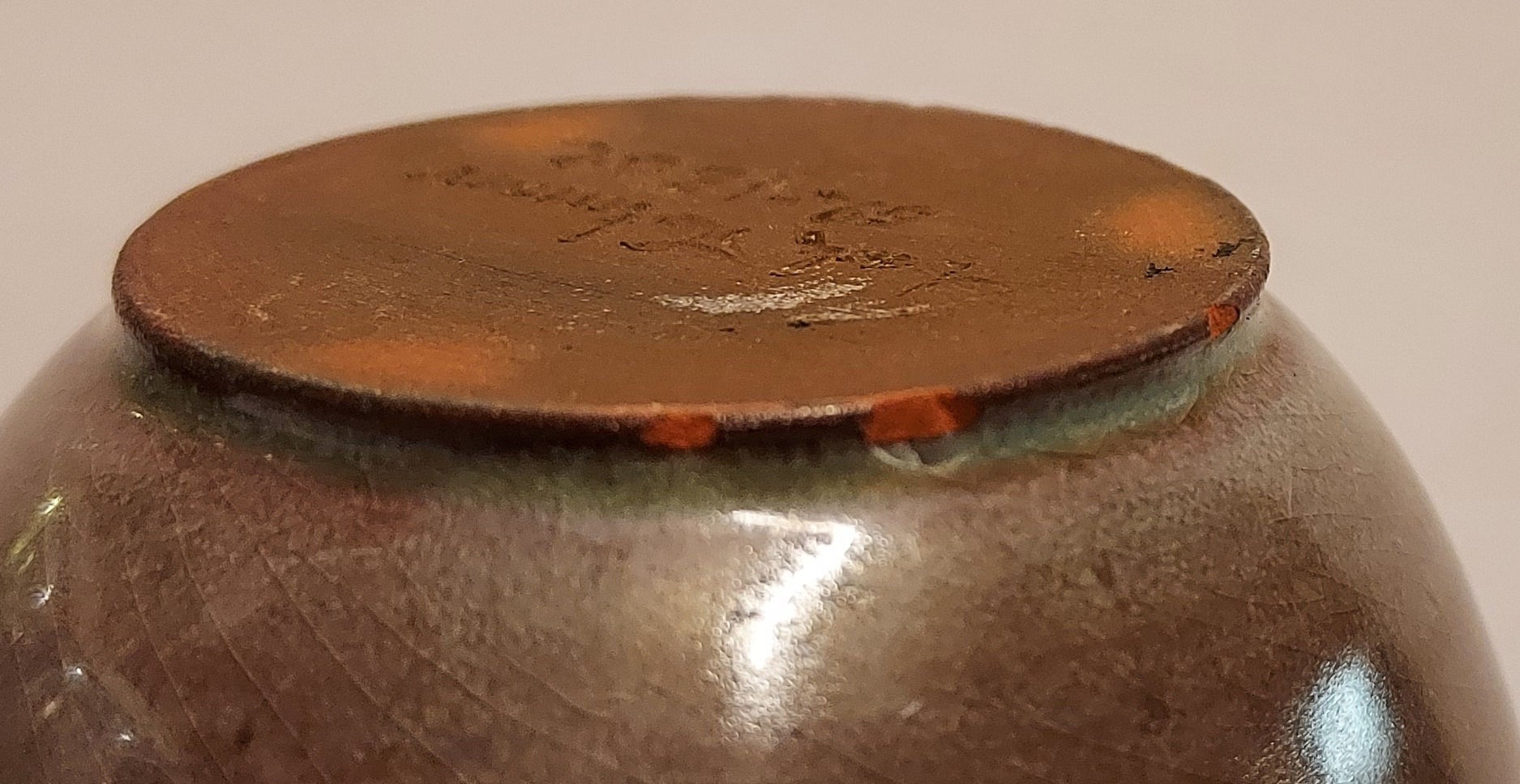Jarrón esbelto con cuerpo esférico y esmalte brillante. Parte inferior firmada y fechada en 52.