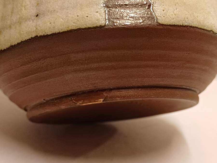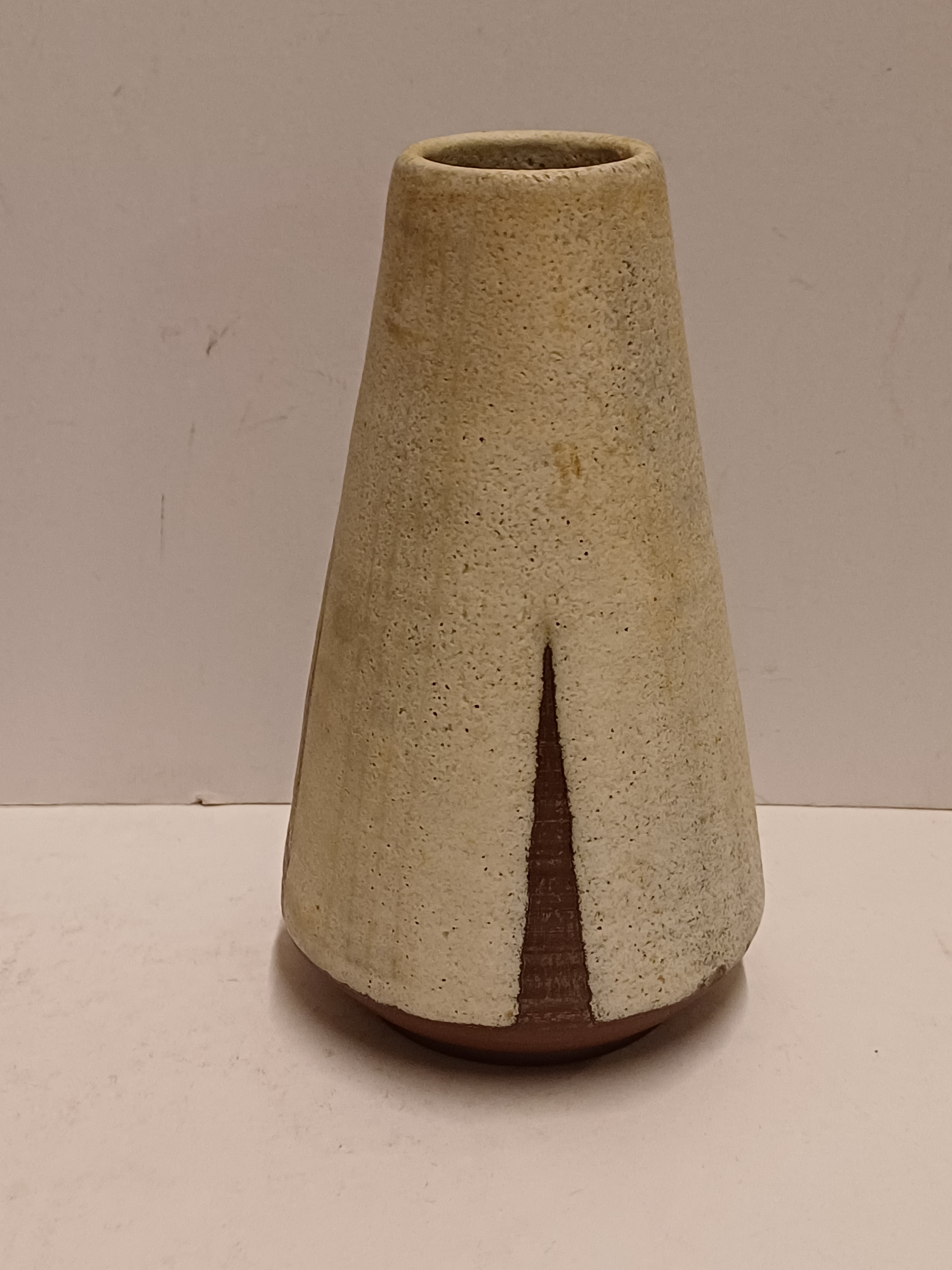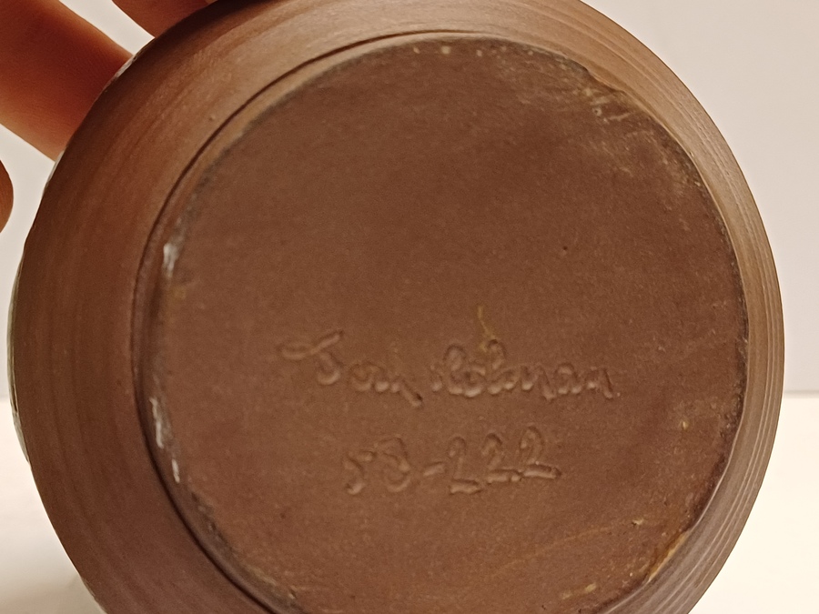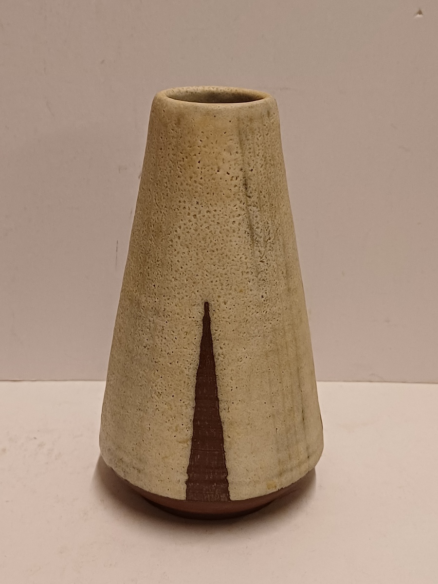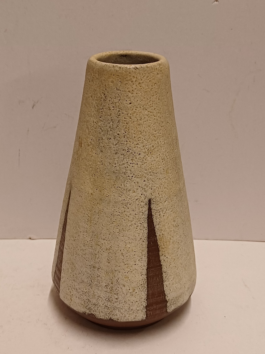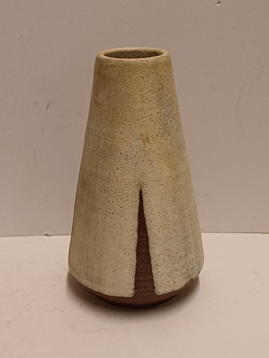 Jarrón de terracota con esmalte blanco y decoración recortada. Parte inferior con firma y fecha (19)53-222.