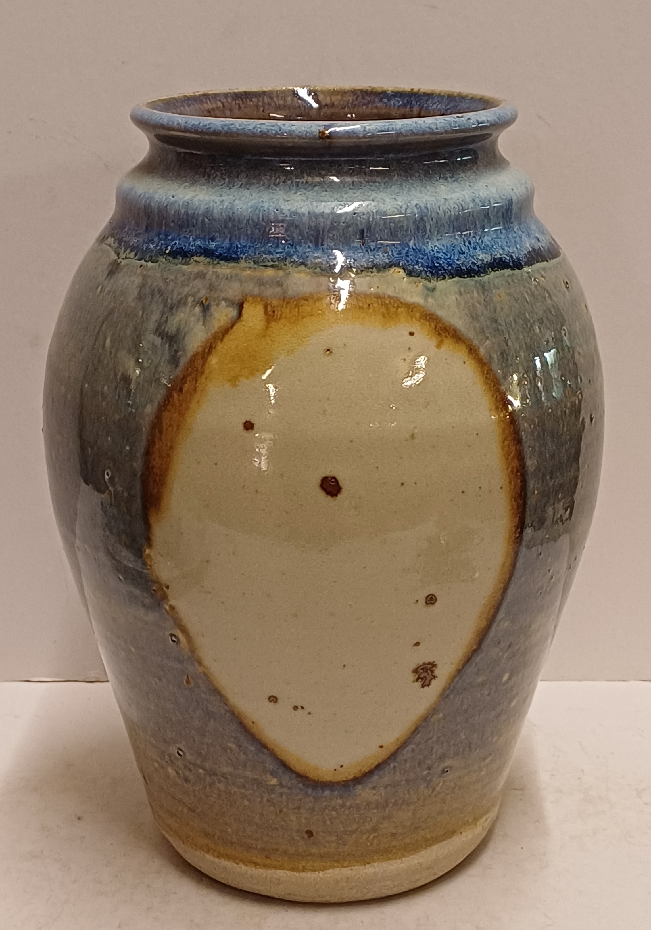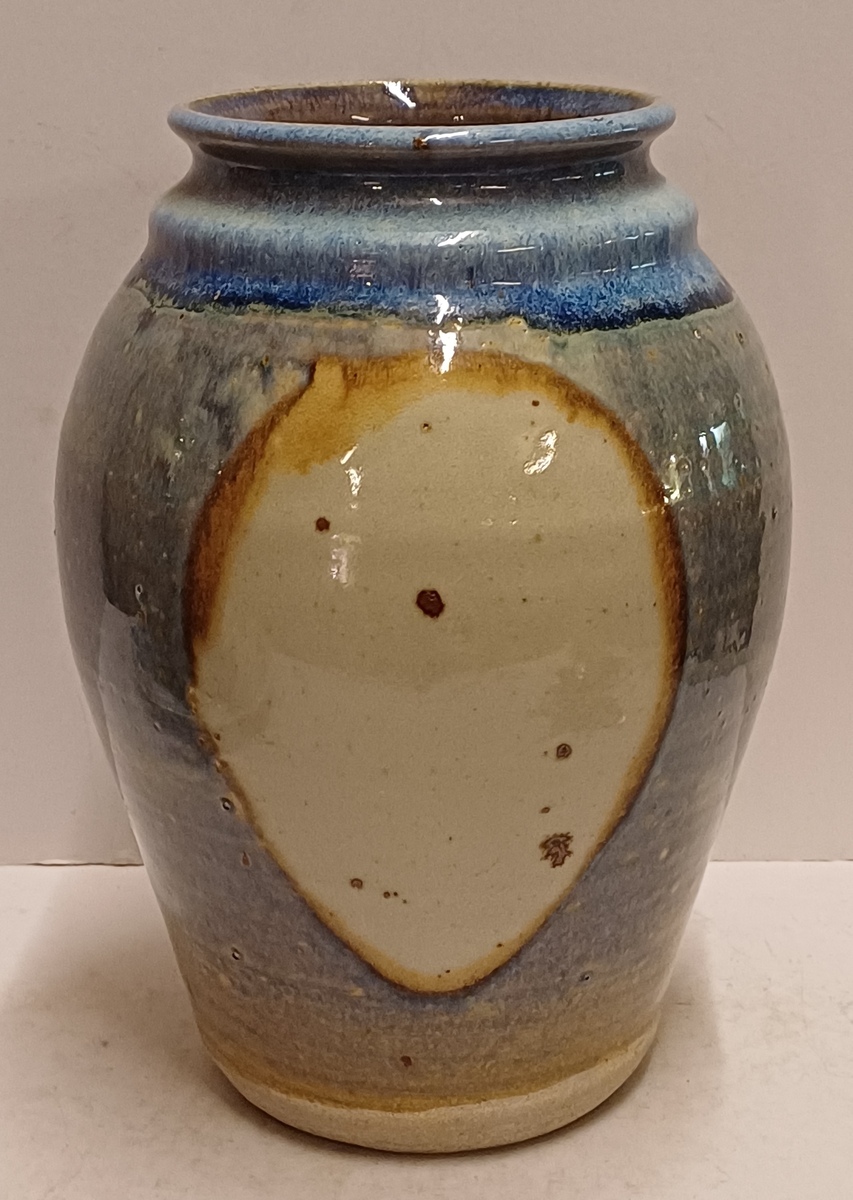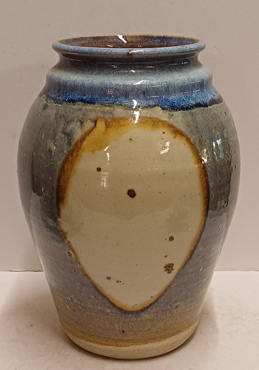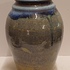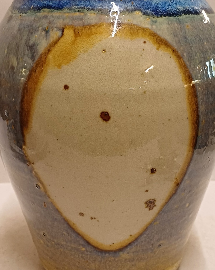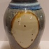 Jarrón con esmalte gris y óvalo crema en el frente, el cuello con borde azul púrpura. Firma en la parte inferior.