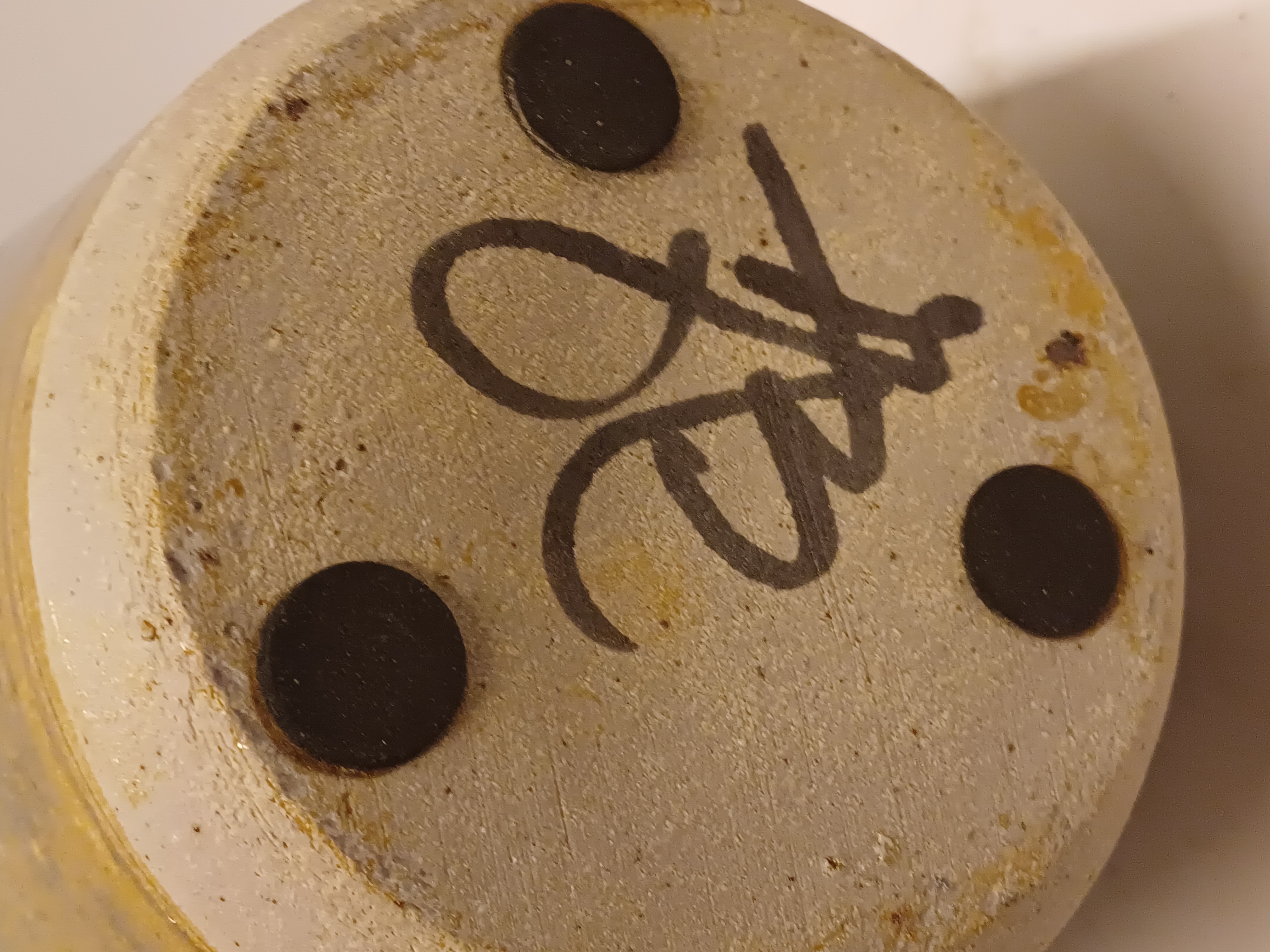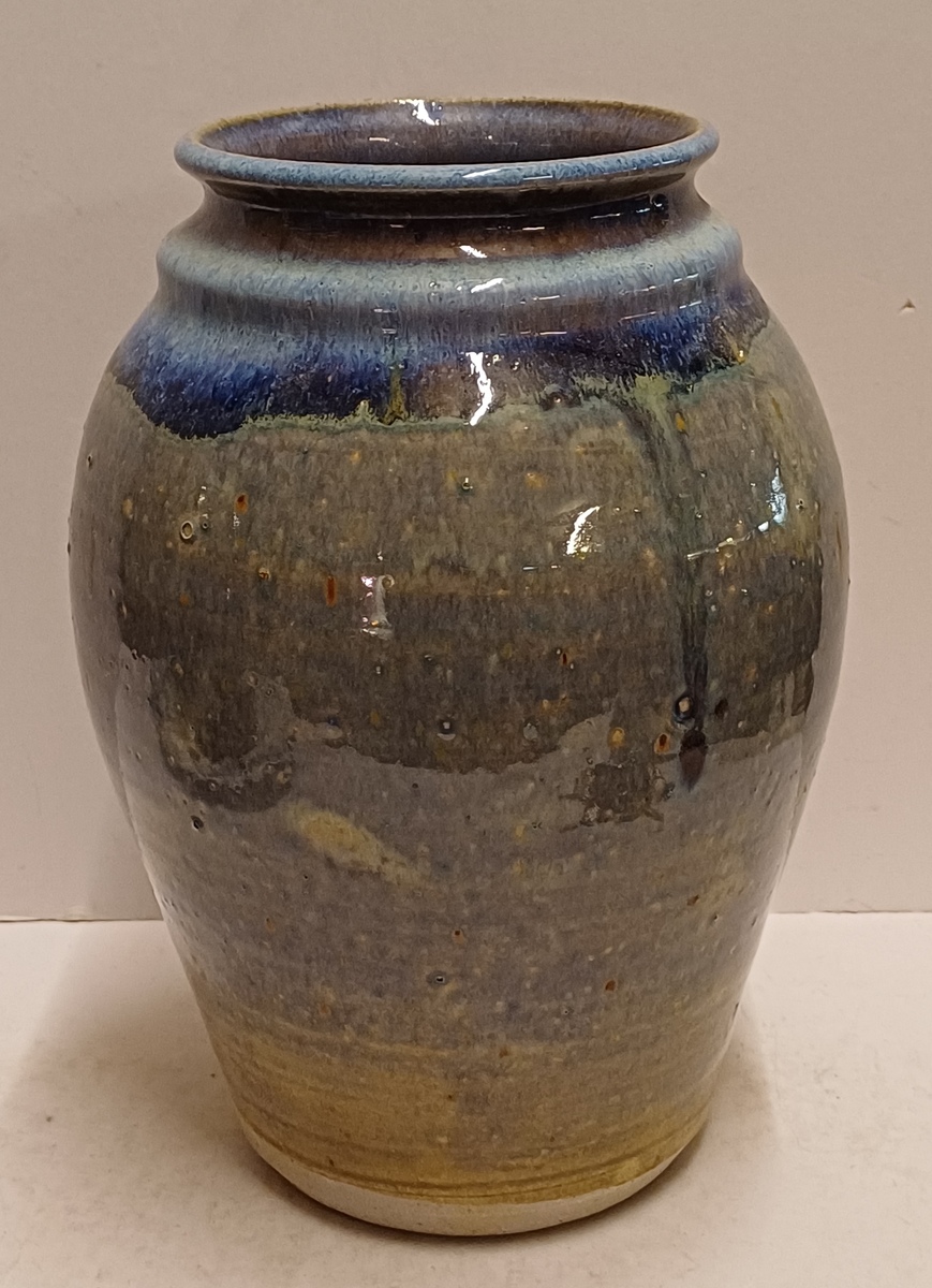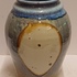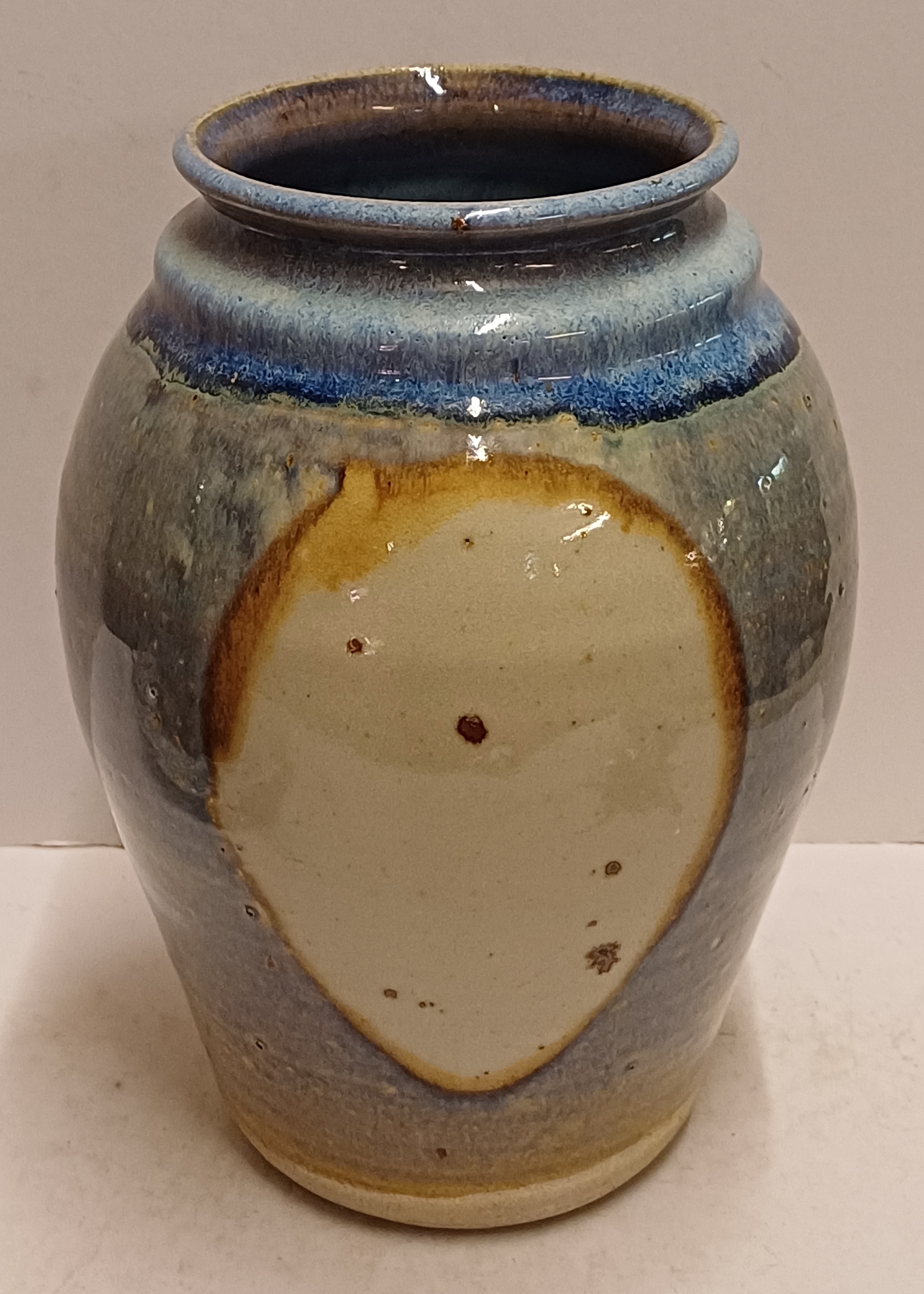 Jarrón con esmalte gris y óvalo crema en el frente, el cuello con borde azul púrpura. Firma en la parte inferior.