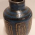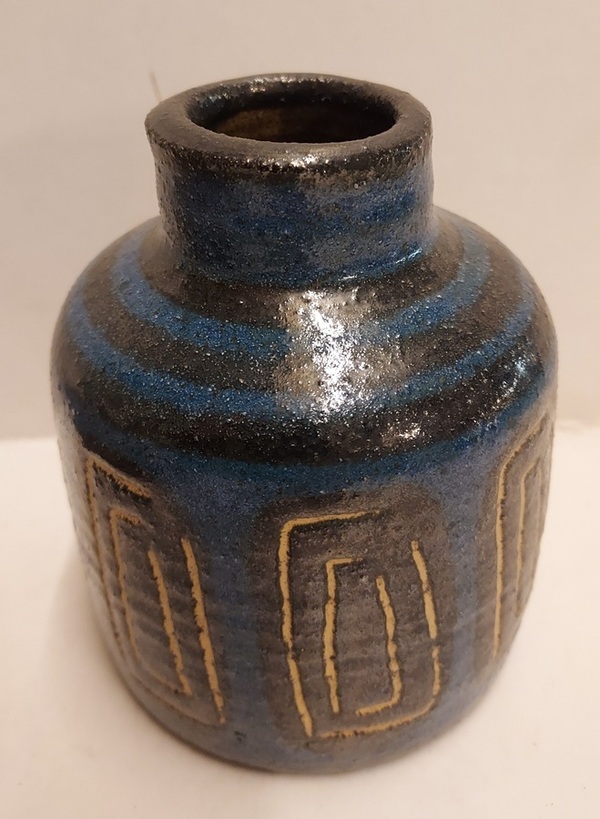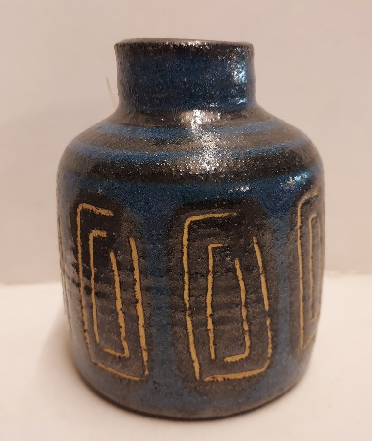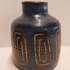 Jarrón con esmalte azul y decoración abstracta en negro. Parte inferior firmada.
