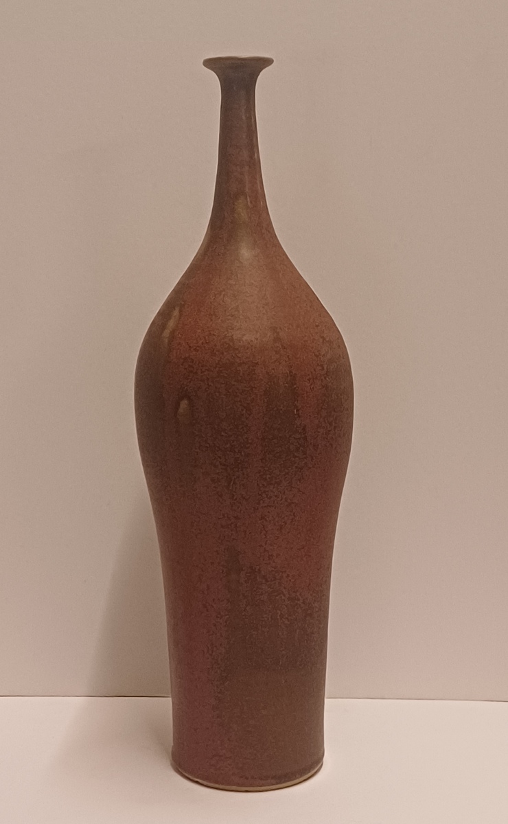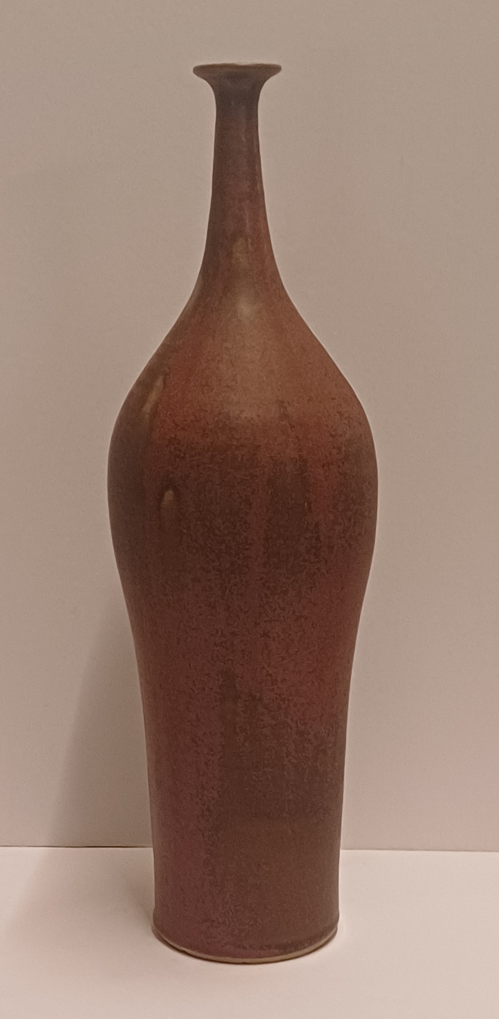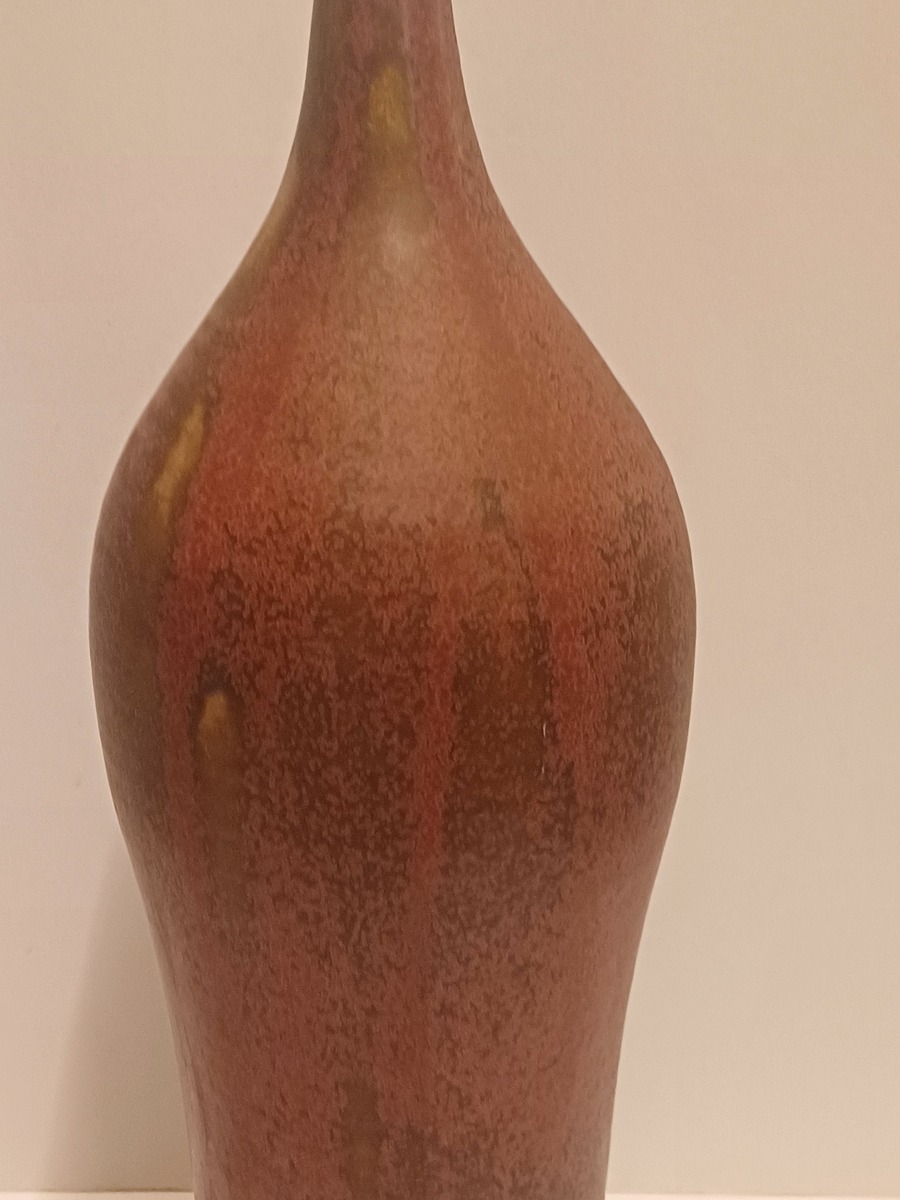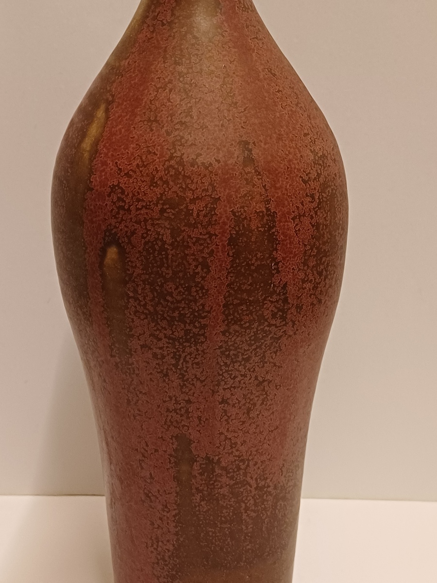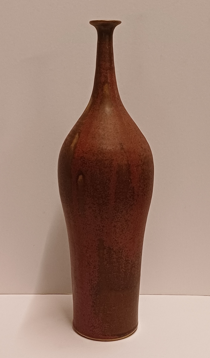 Vroege hoge ranke vaas met paarse rode glazuur en kleine mondopening. Onderzijde gesigneerd en gedateerd 1970.