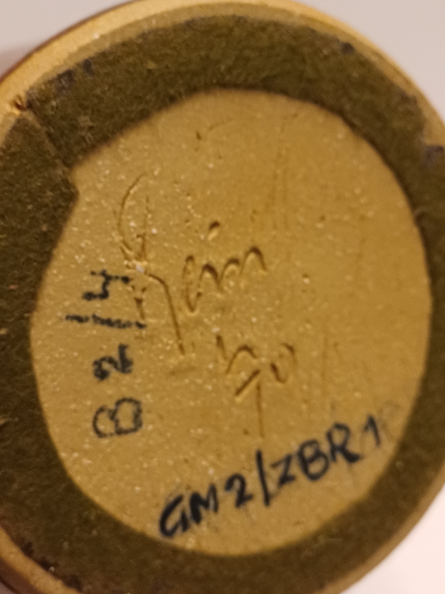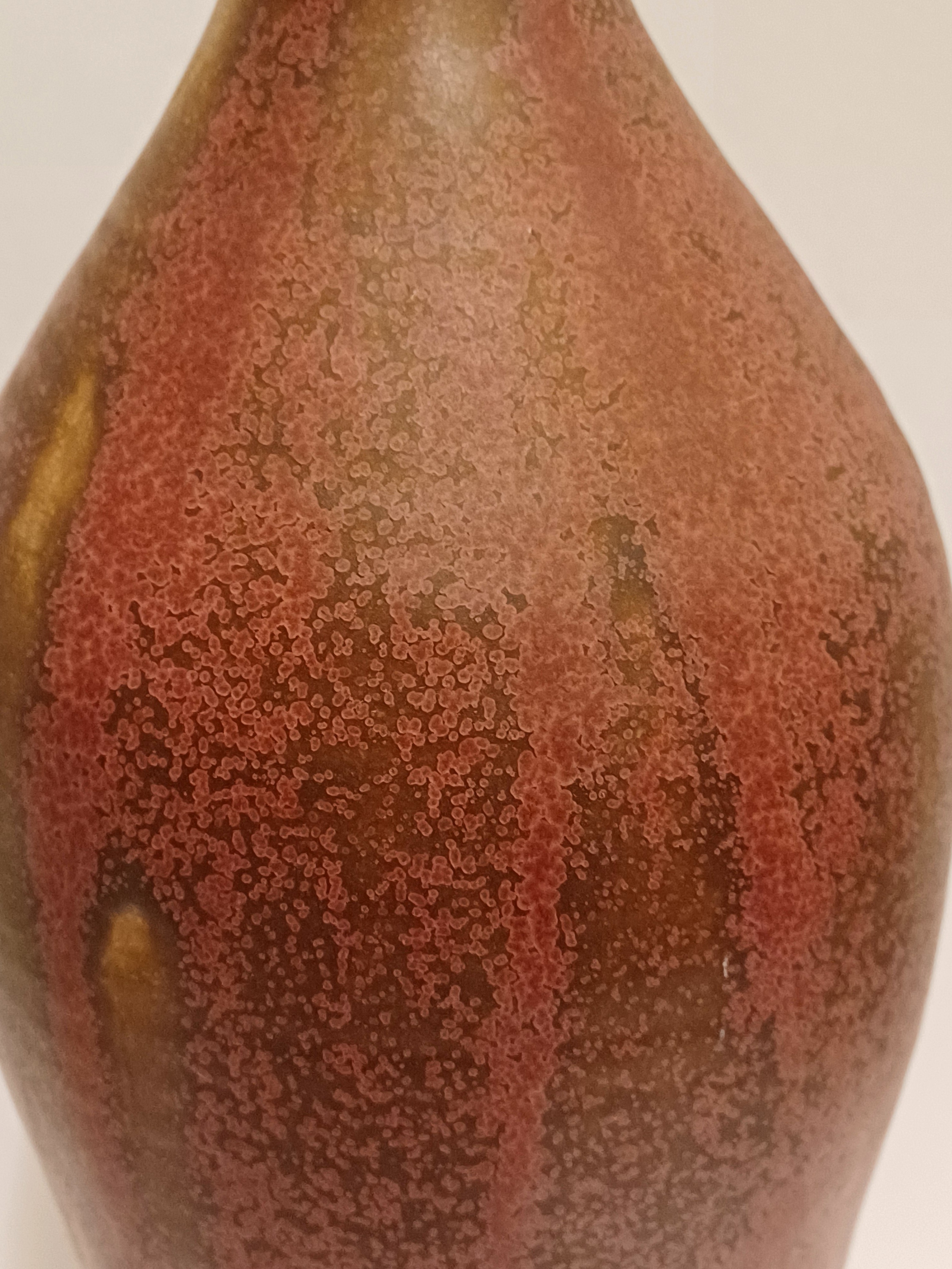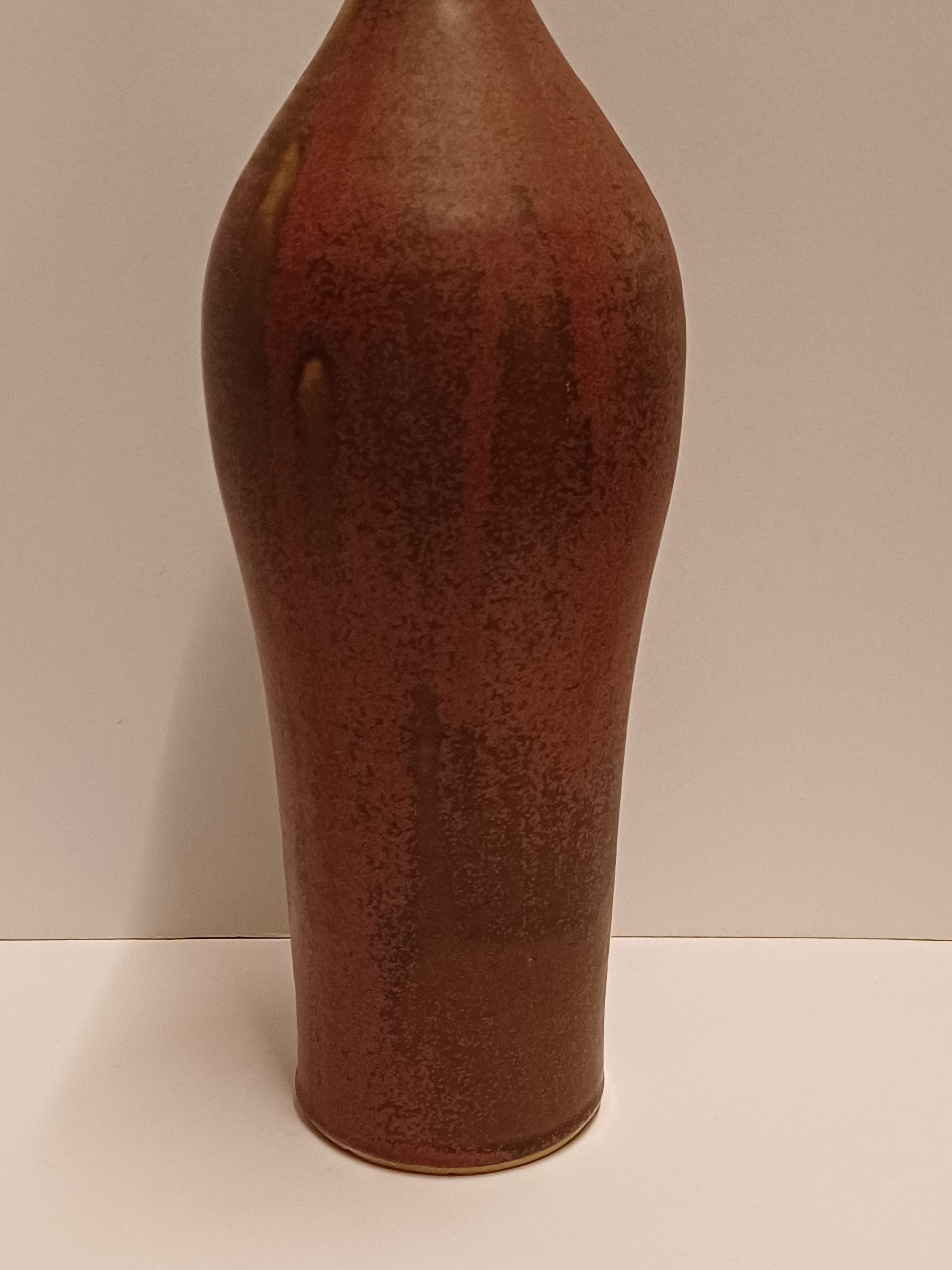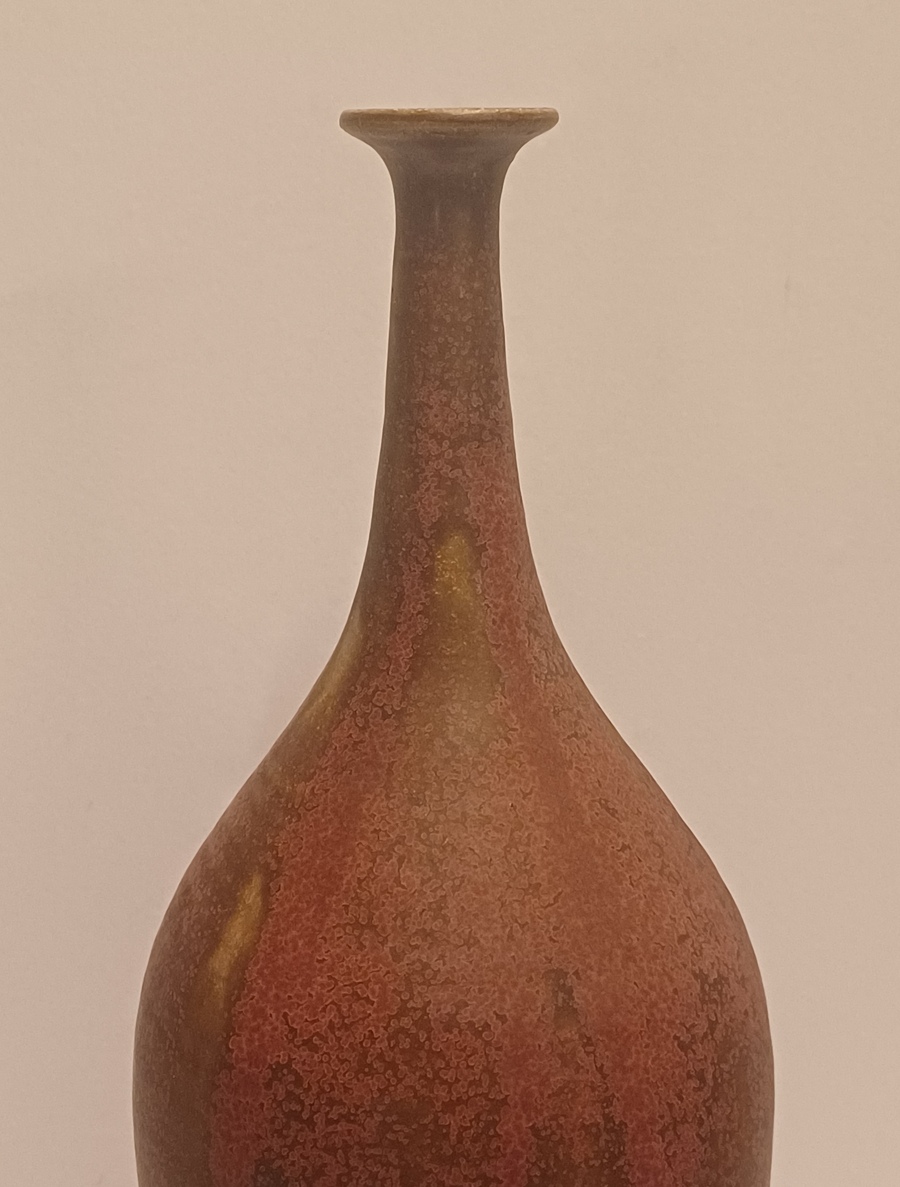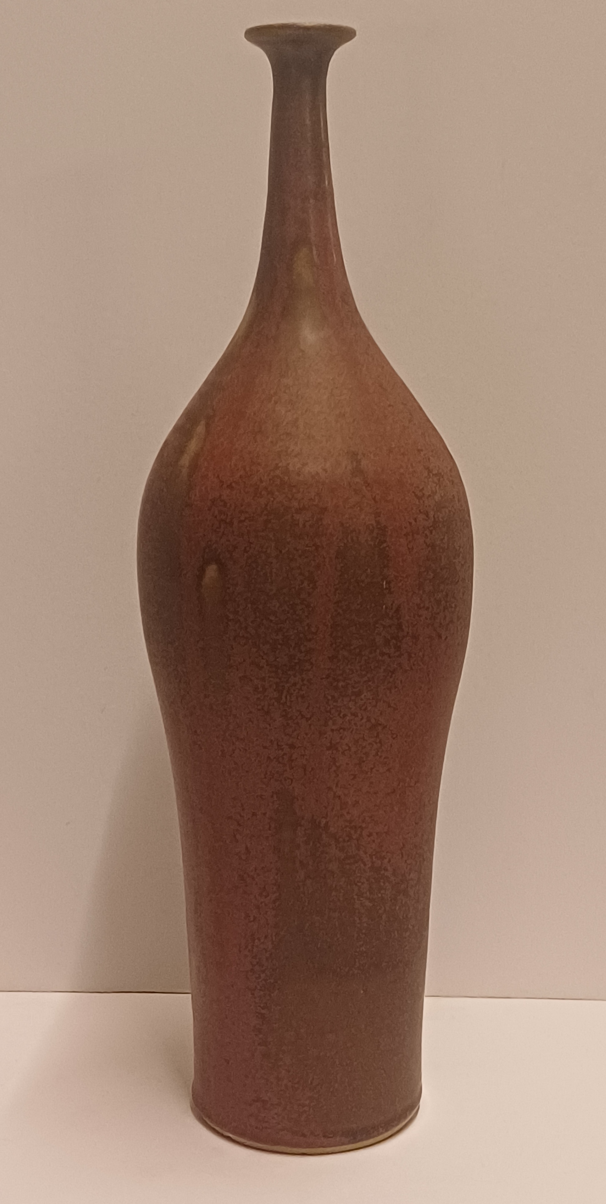 Vroege hoge ranke vaas met paarse rode glazuur en kleine mondopening. Onderzijde gesigneerd en gedateerd 1970.