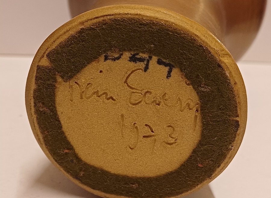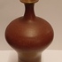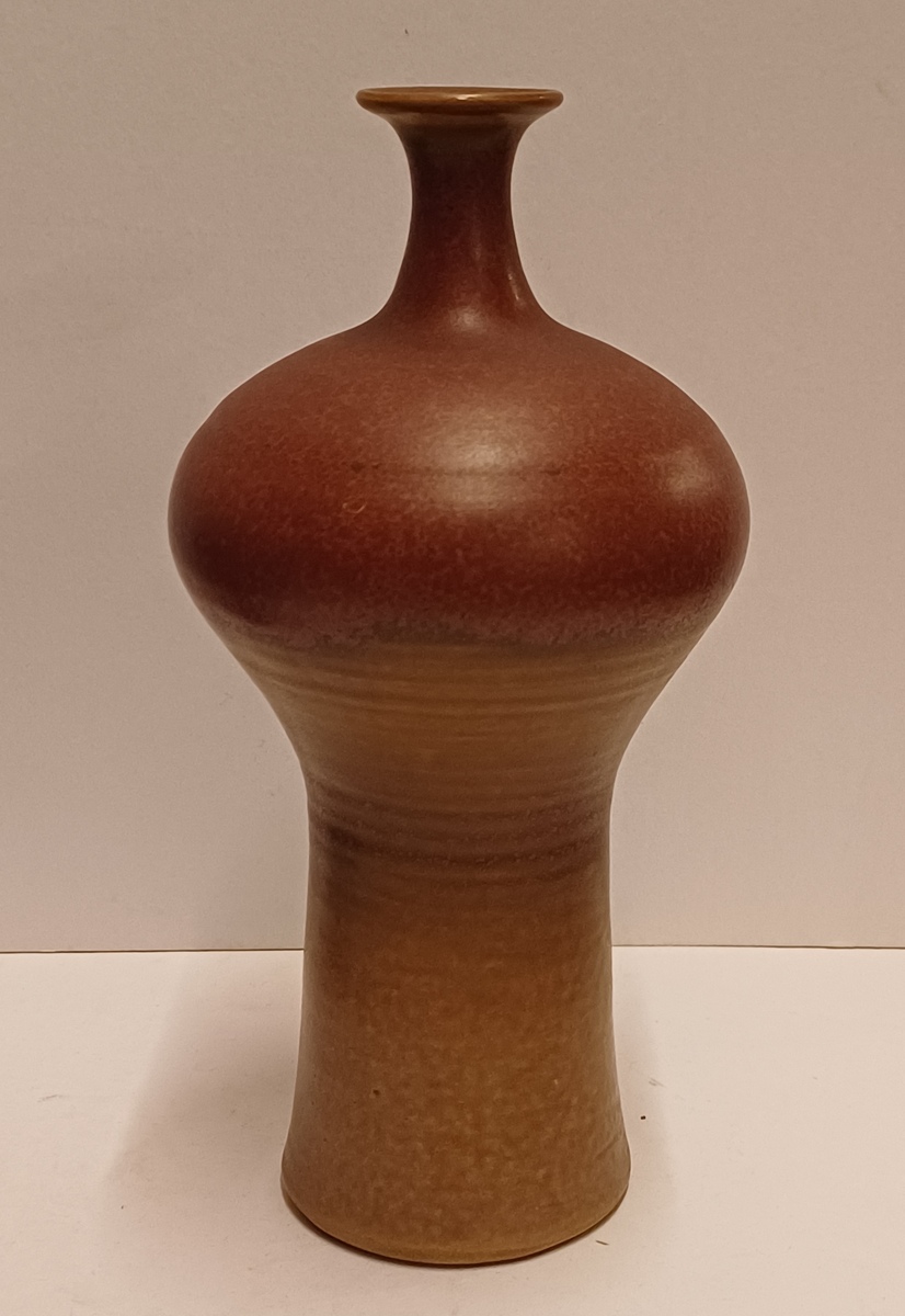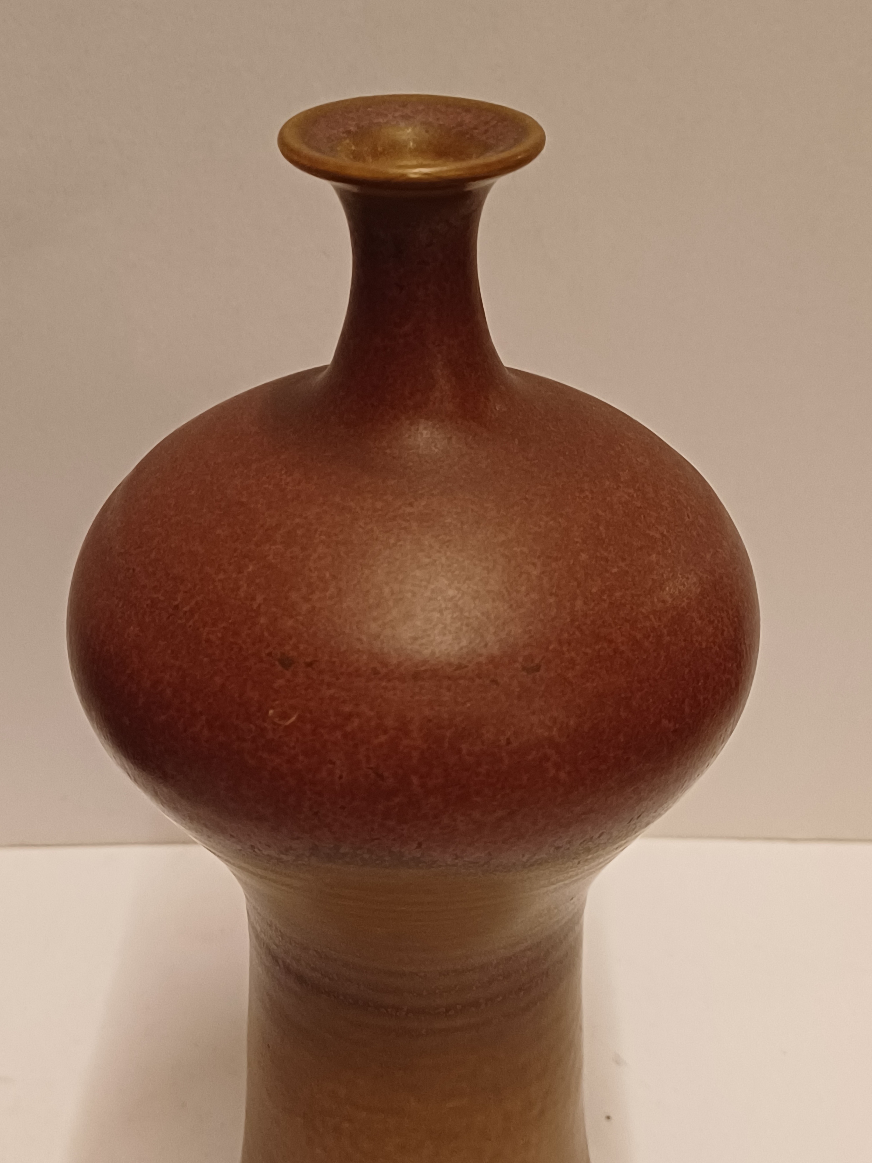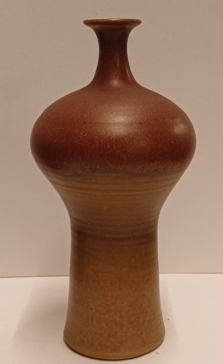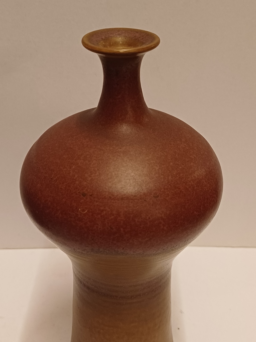 Vroege vaas met paarse rode glazuur en kleine mondopening. Onderzijde voluit gesigneerd en gedateerd 1973.