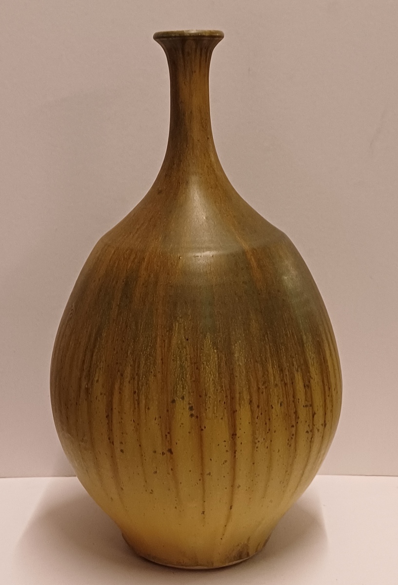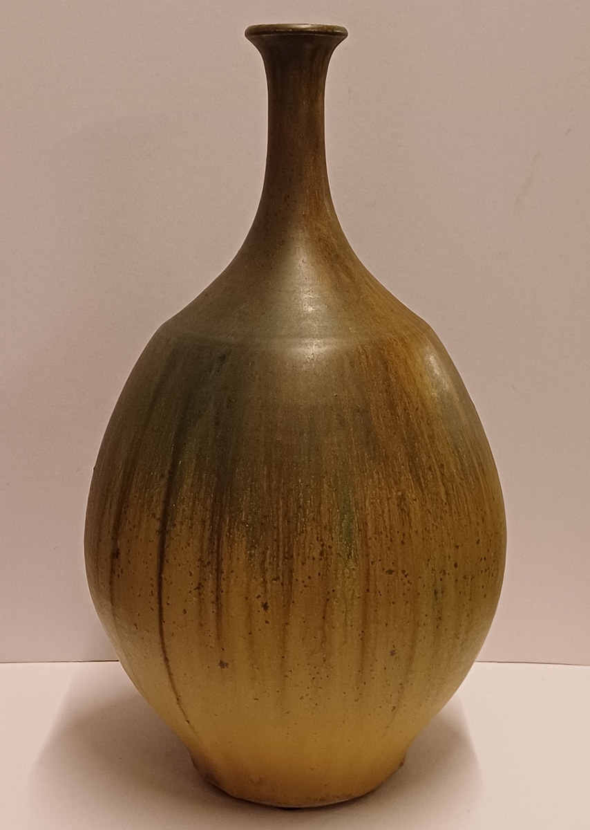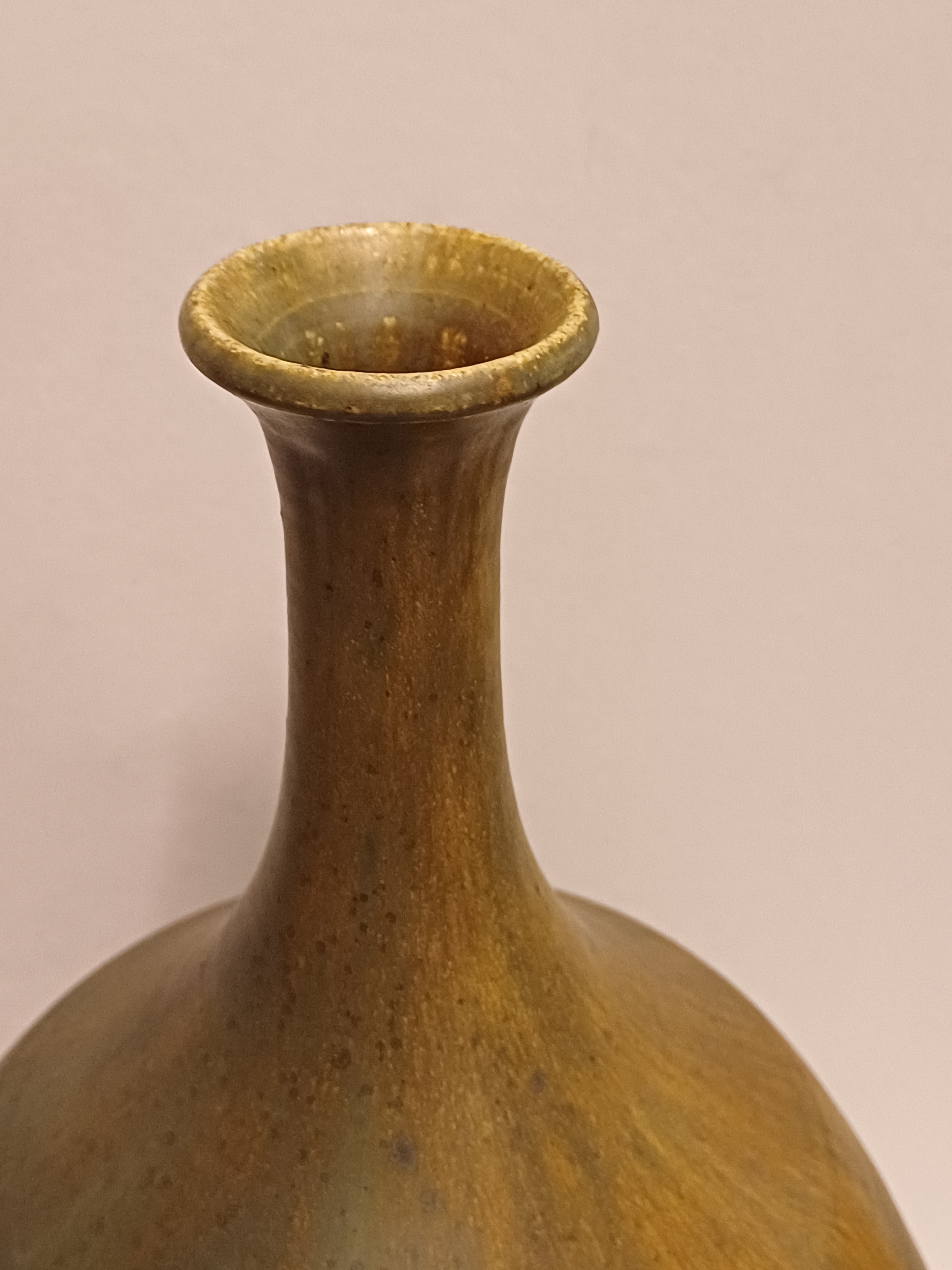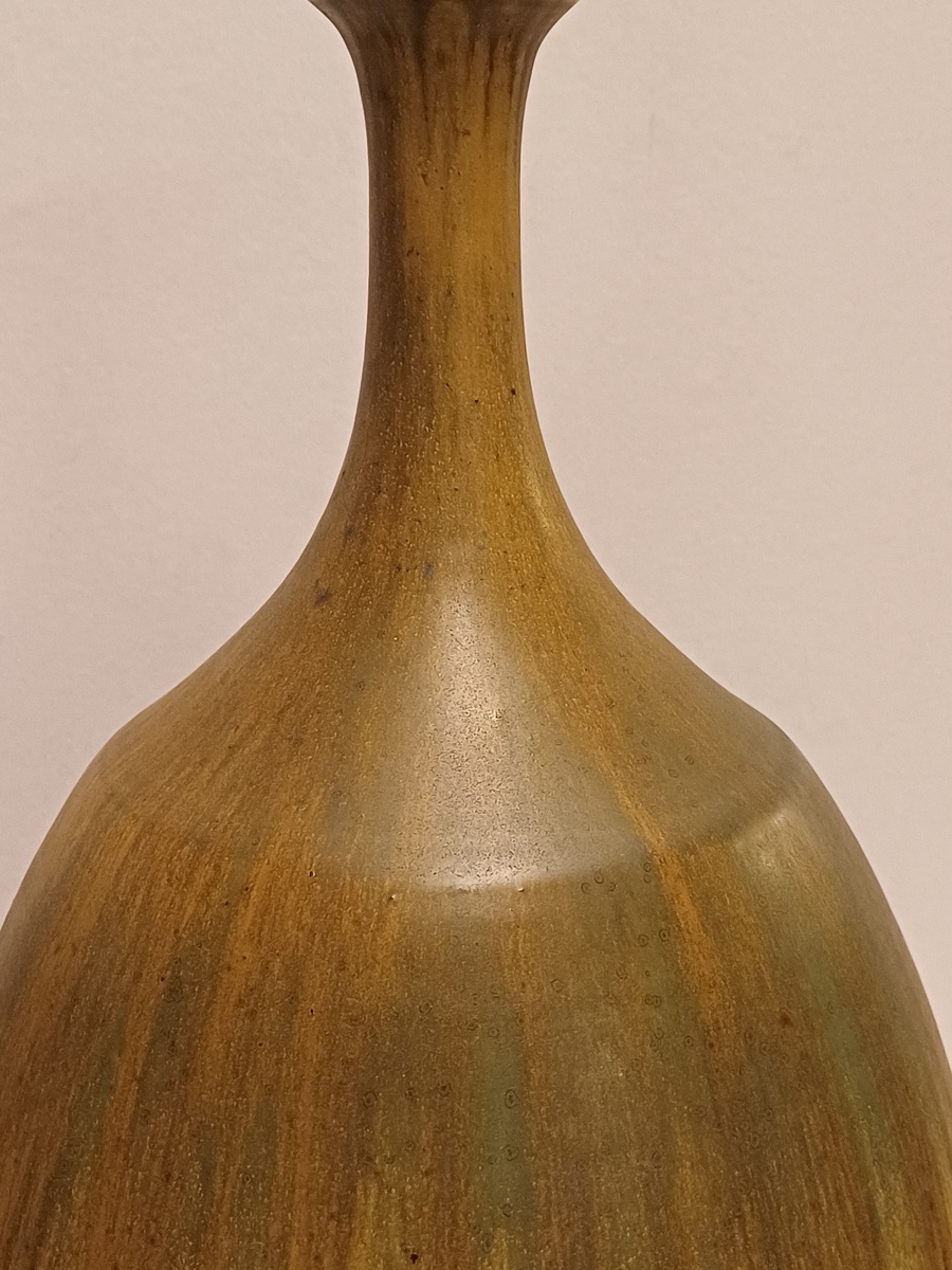 Vroege forse vaas met stroom glazuur in groen tinten op creme fond en smalle hals. Onderzijde voluit gesigneerd.
