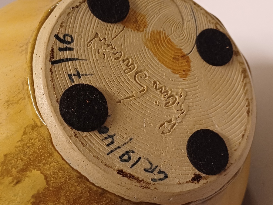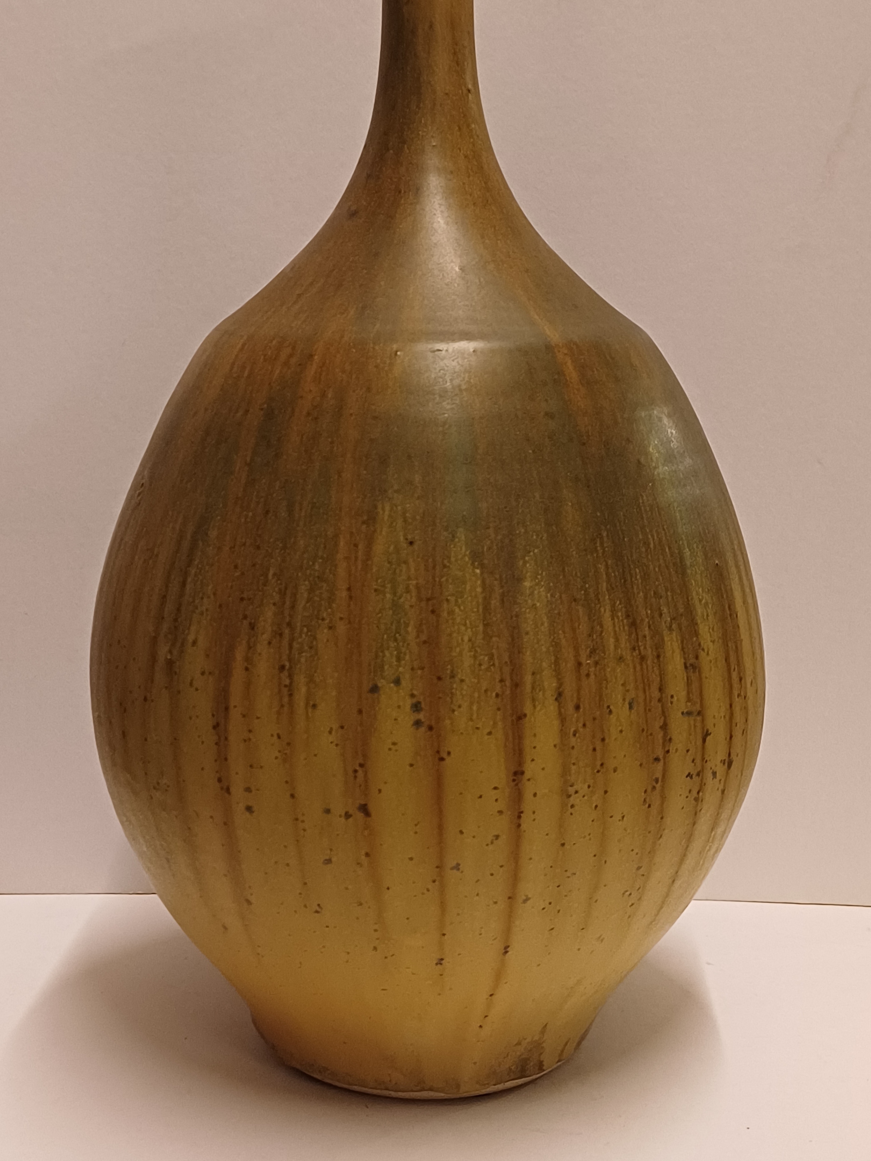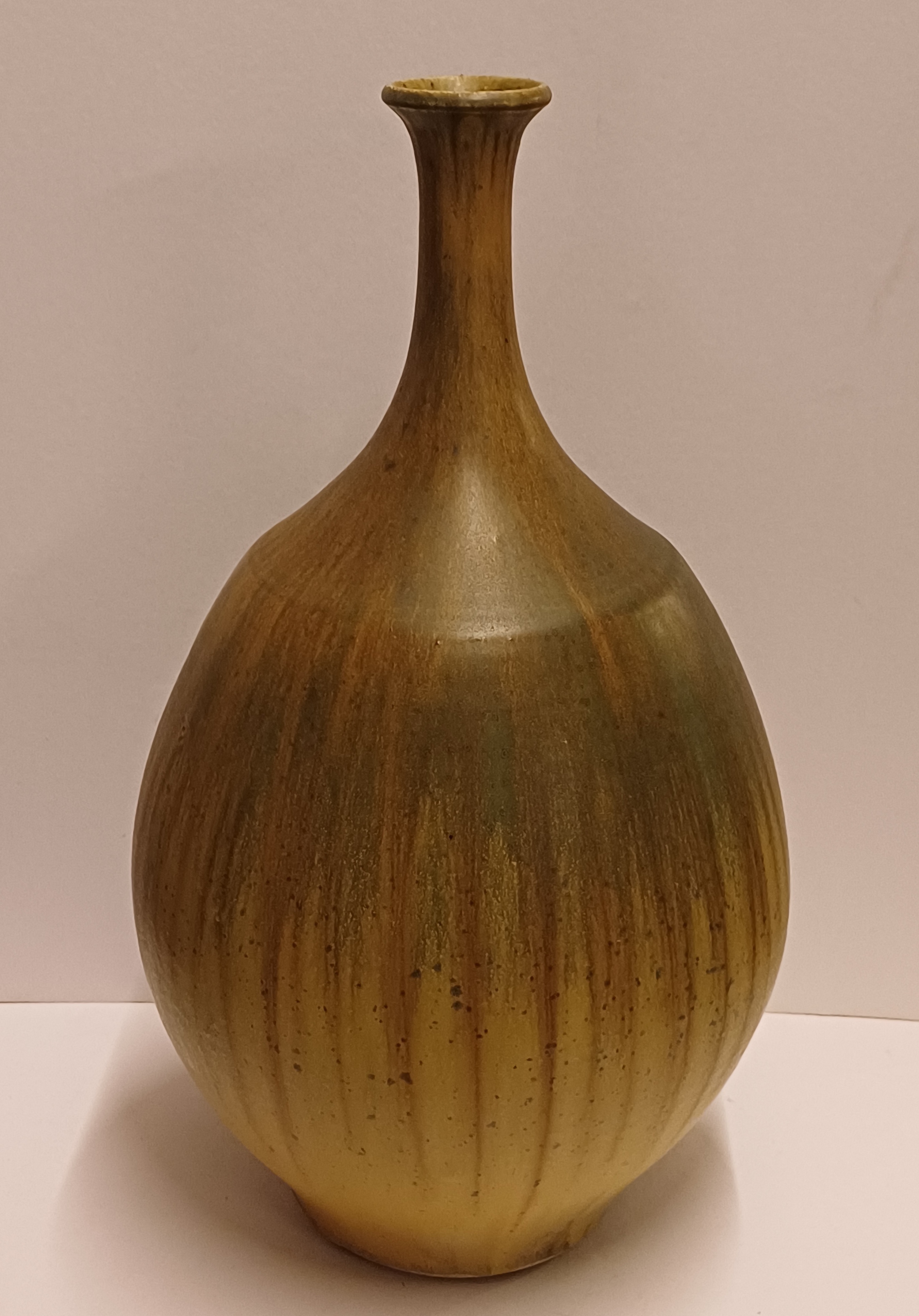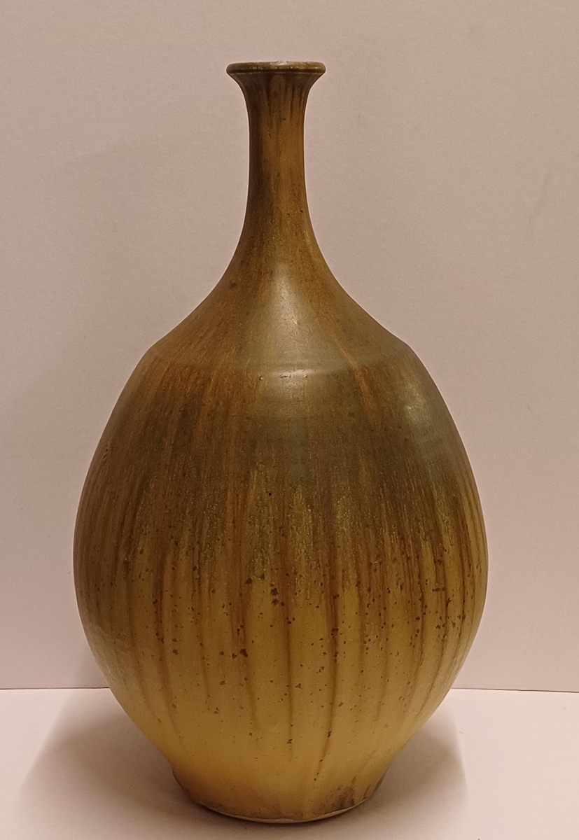 Vroege forse vaas met stroom glazuur in groen tinten op creme fond en smalle hals. Onderzijde voluit gesigneerd.