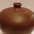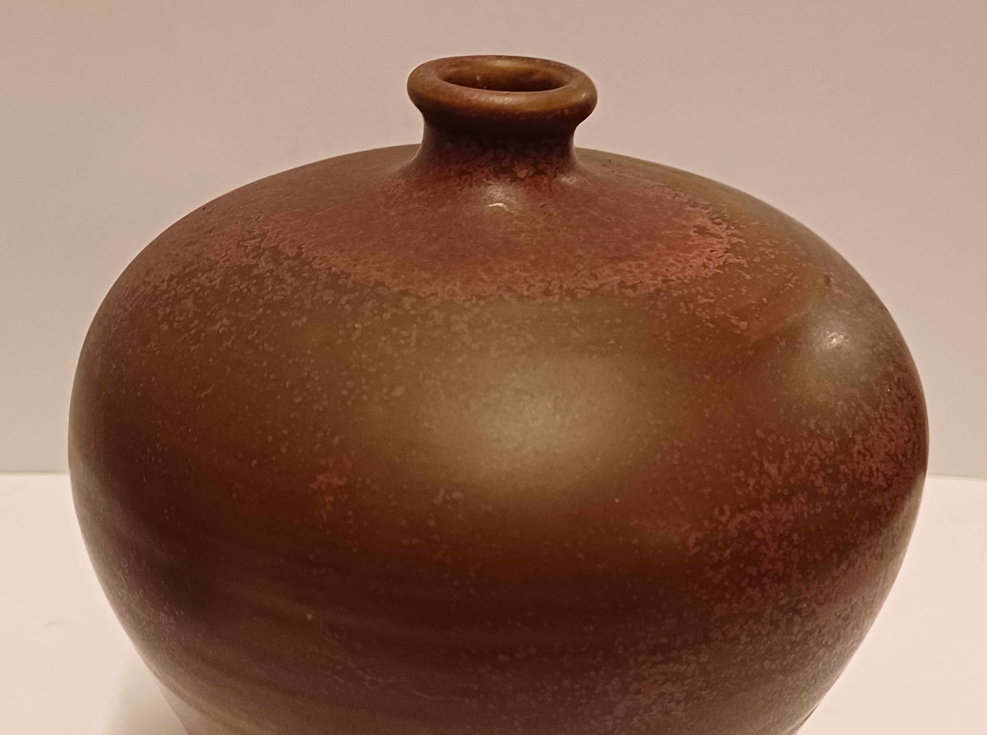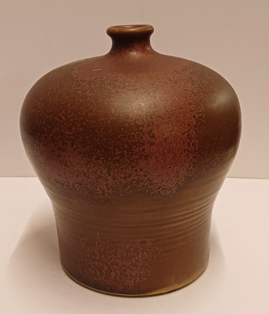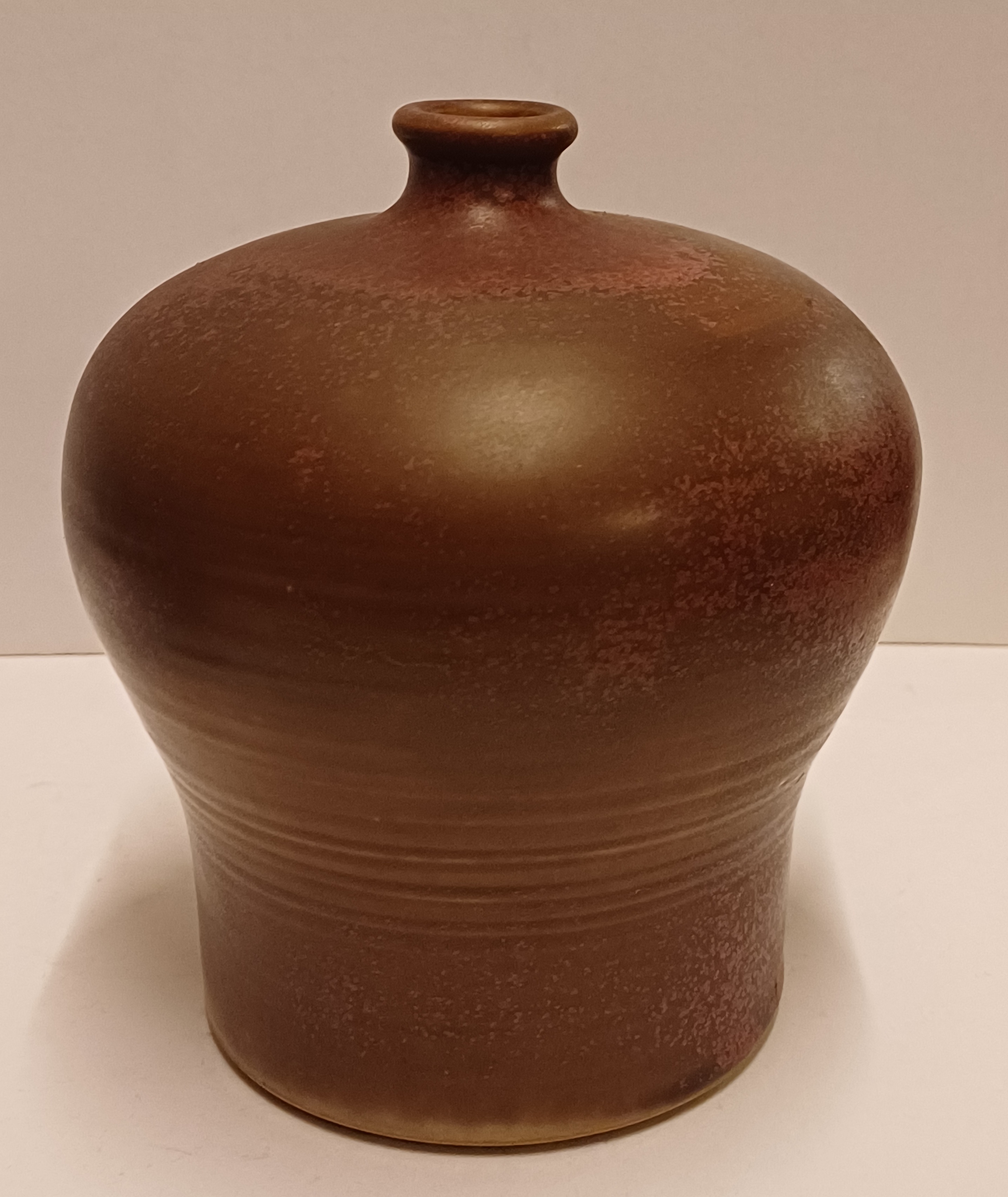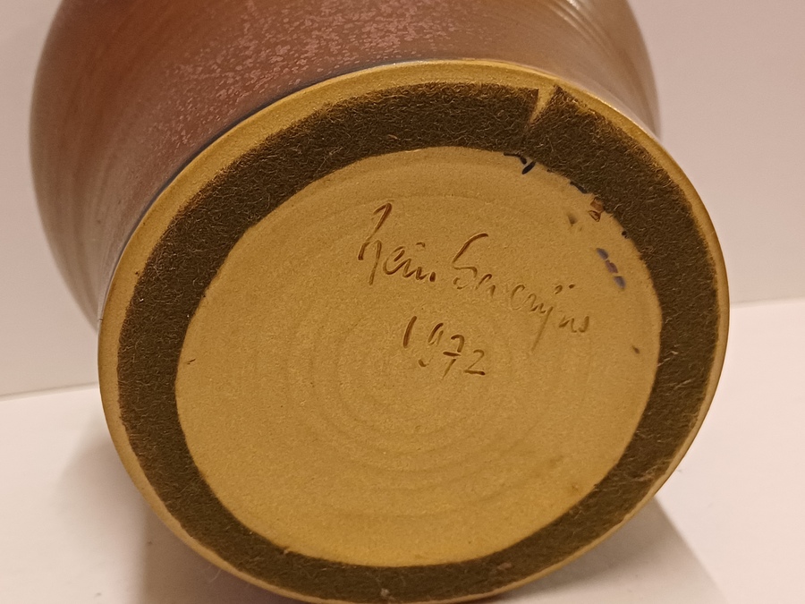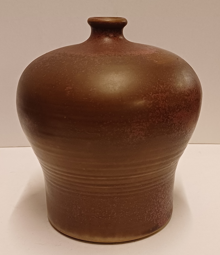Vroege vaas met paarse rode glazuur en kleine mondopening. Onderzijde voluit gesigneerd en gedateerd 1972.
