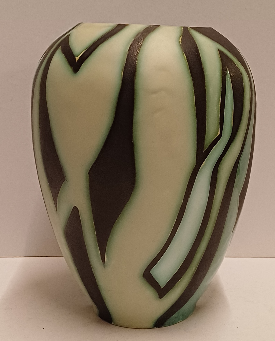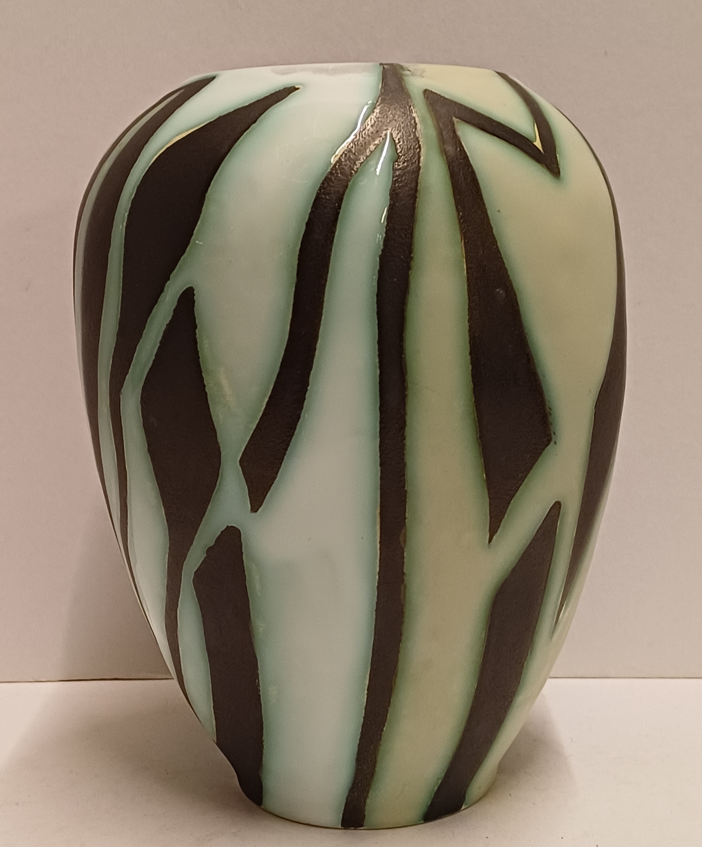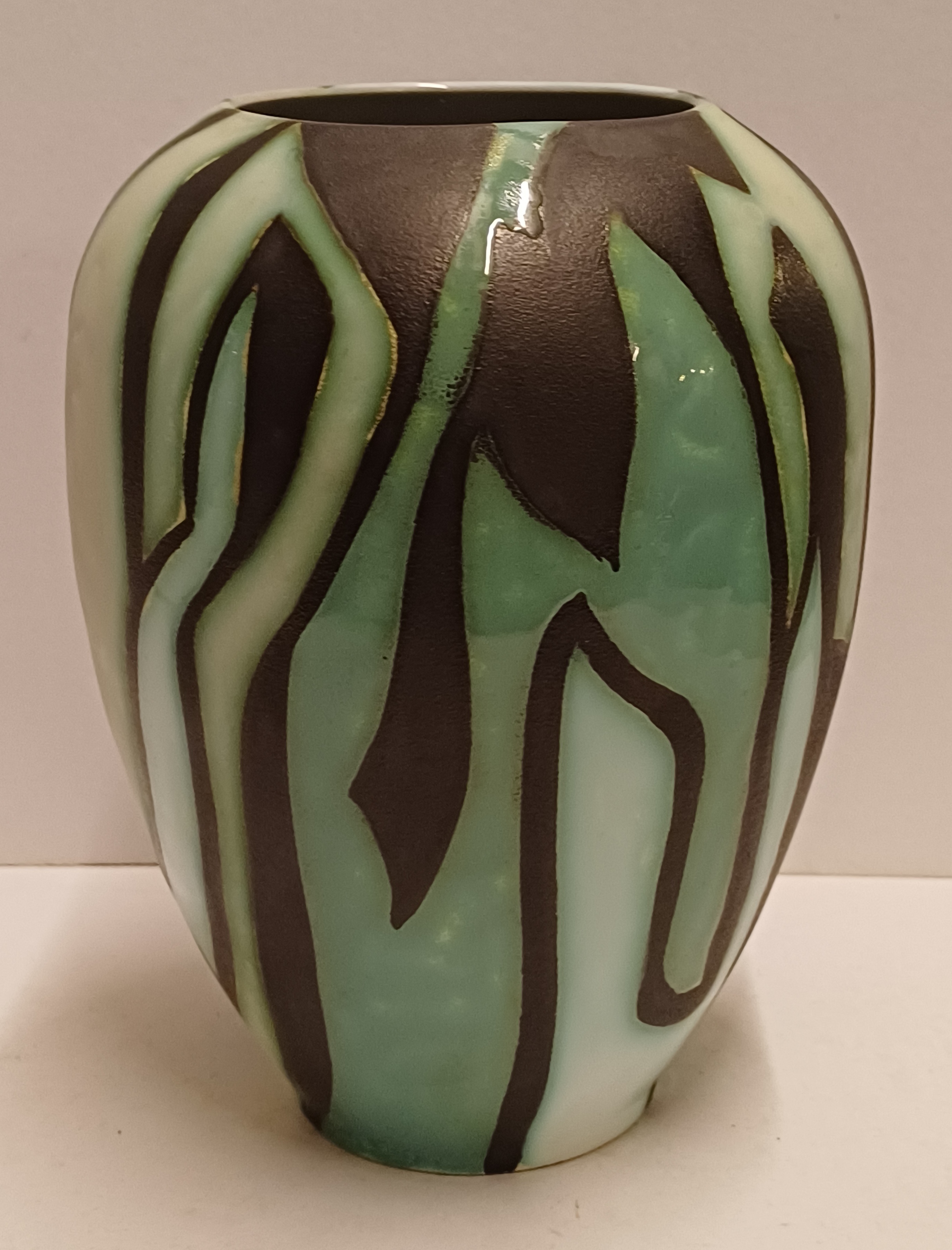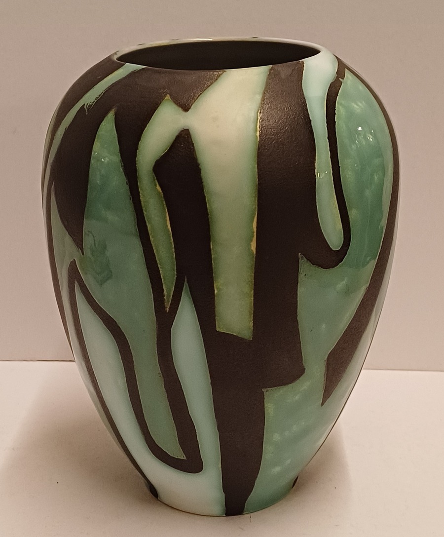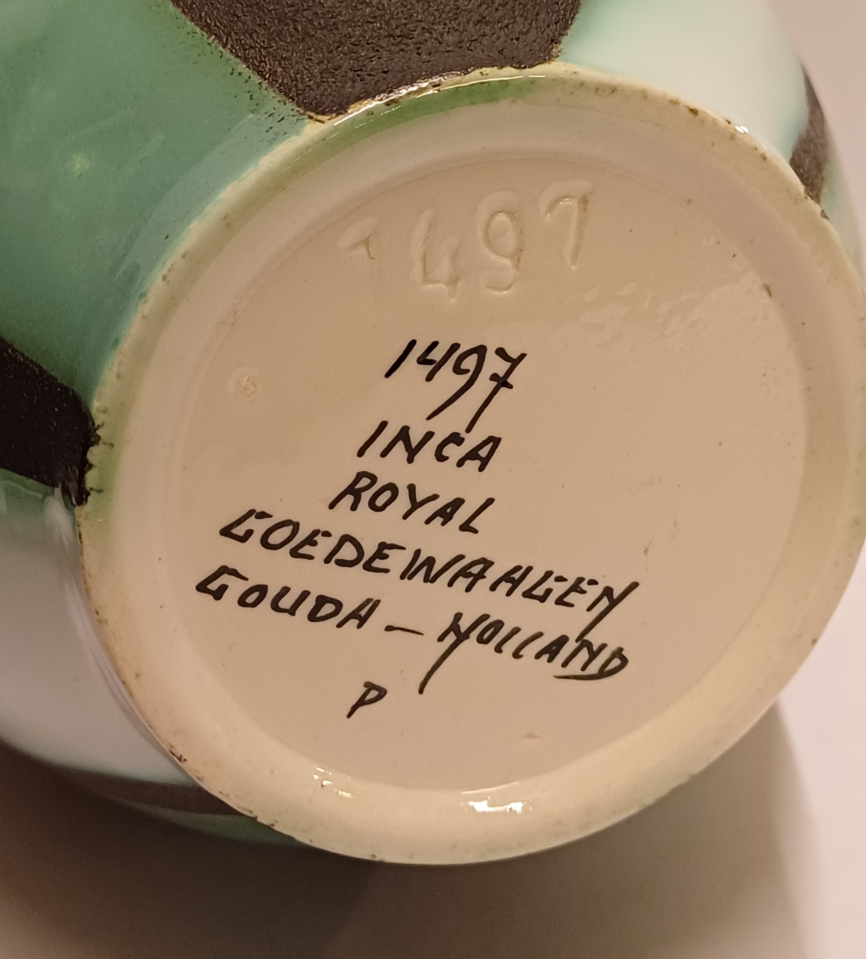 Een gegoten plateel vaas met meerkleurig gestileerd decor Inca. Ontwerp Willem van Norden voor Goedewagen Gouda. Modelnummer 1497.