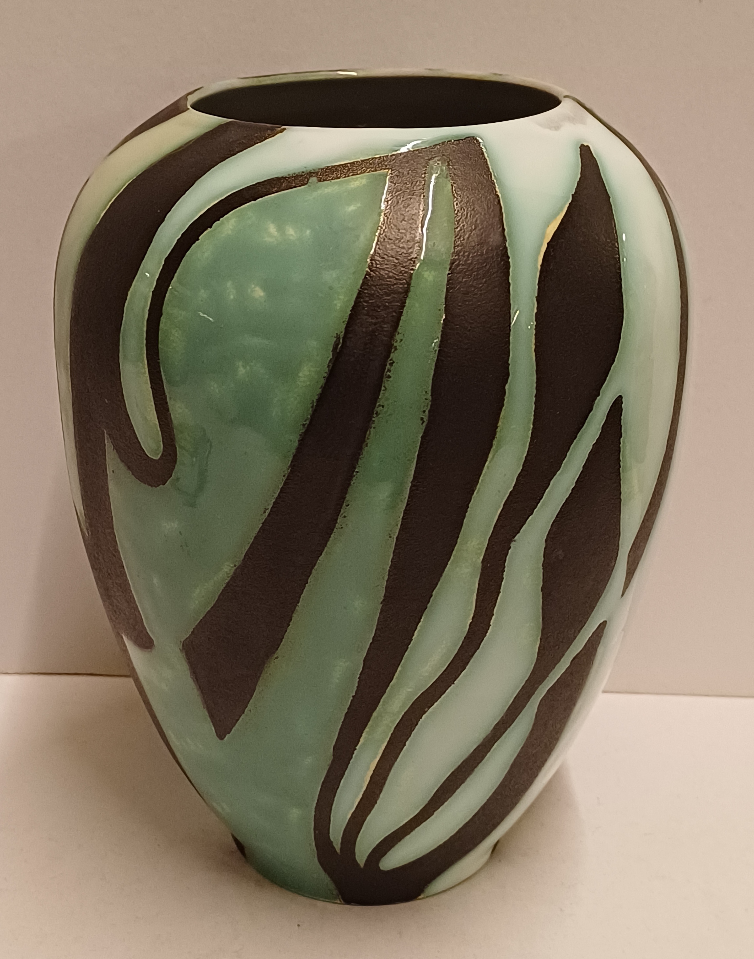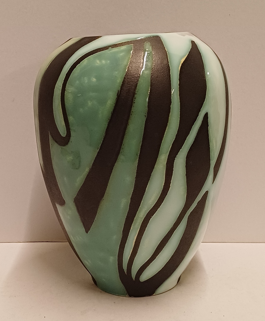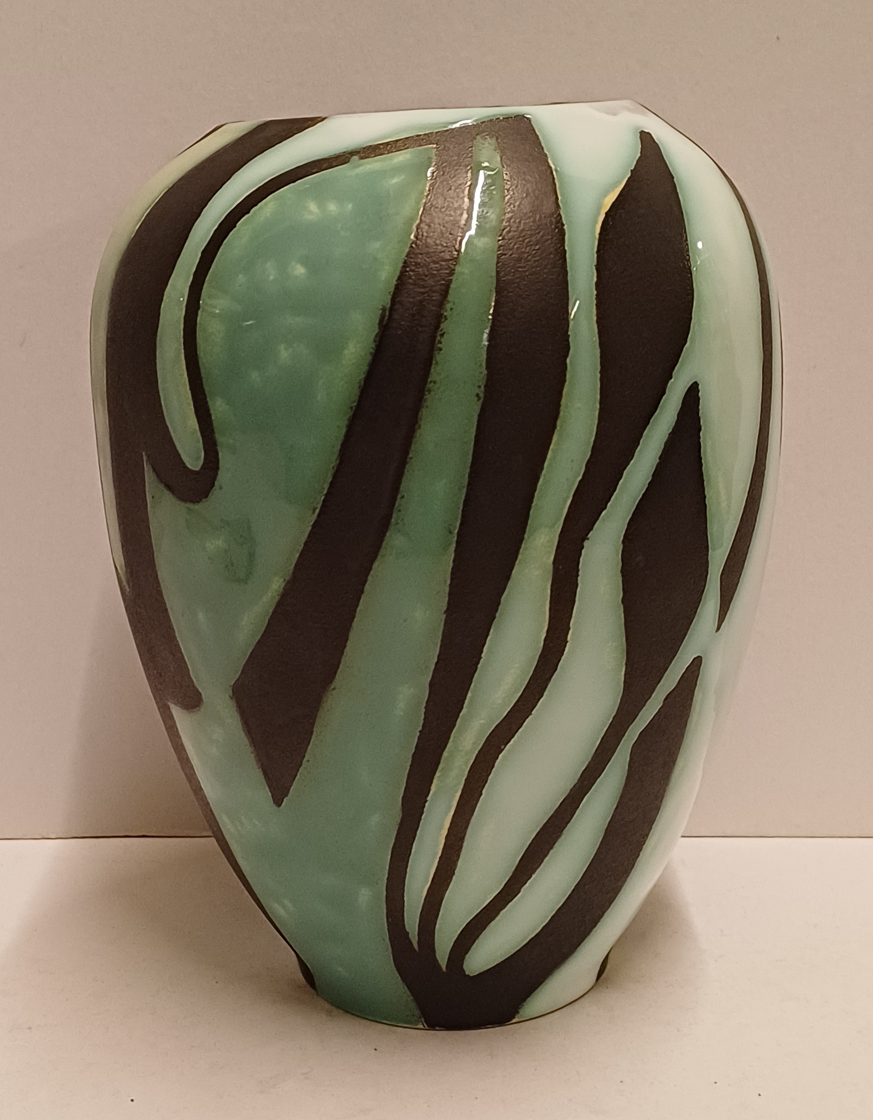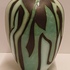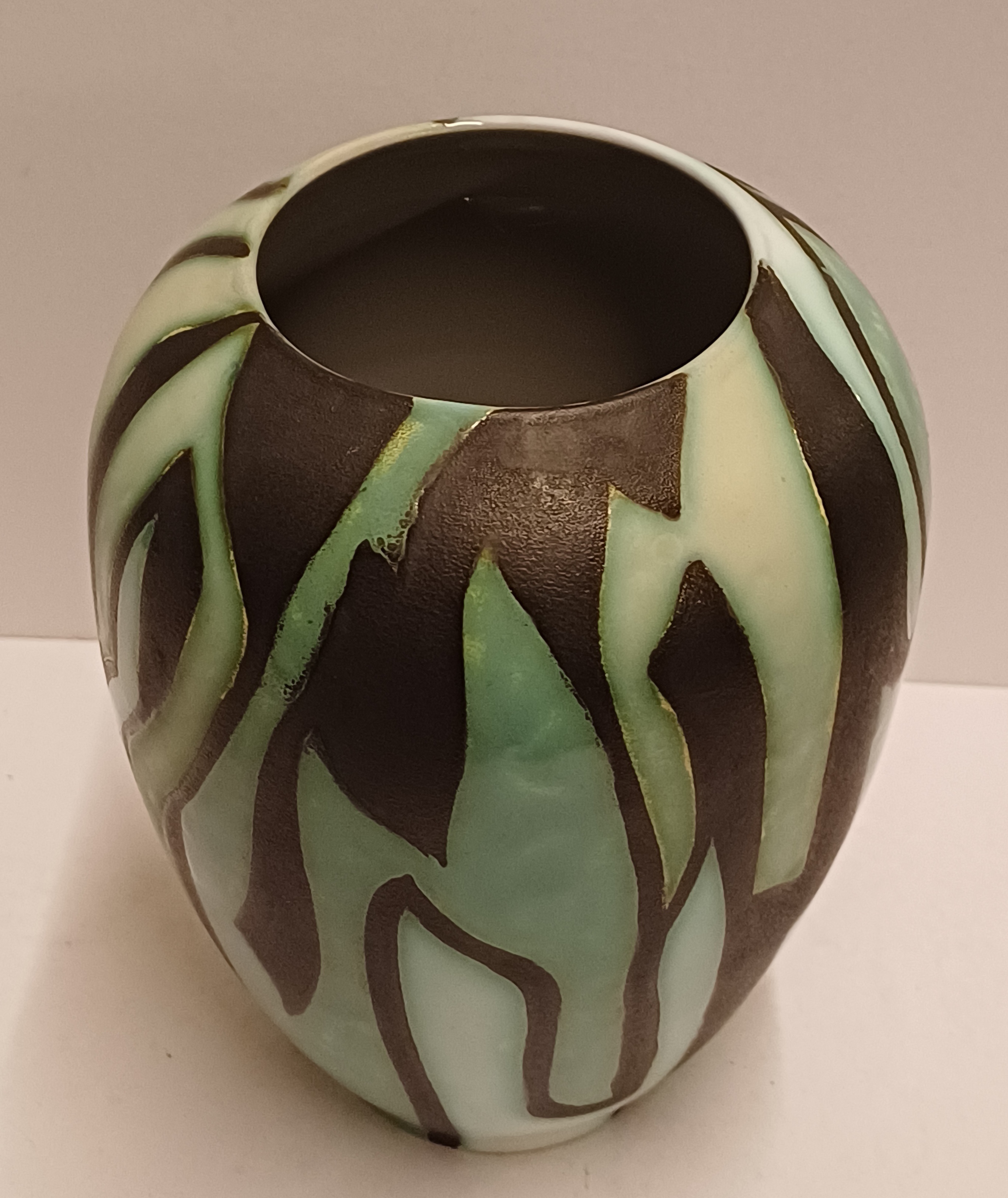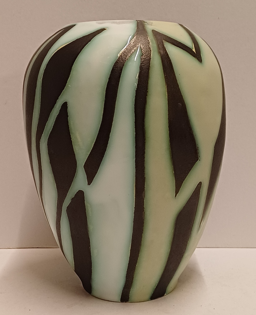 Een gegoten plateel vaas met meerkleurig gestileerd decor Inca. Ontwerp Willem van Norden voor Goedewagen Gouda. Modelnummer 1497.