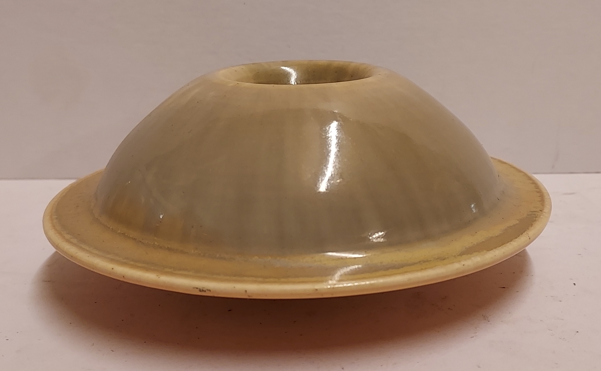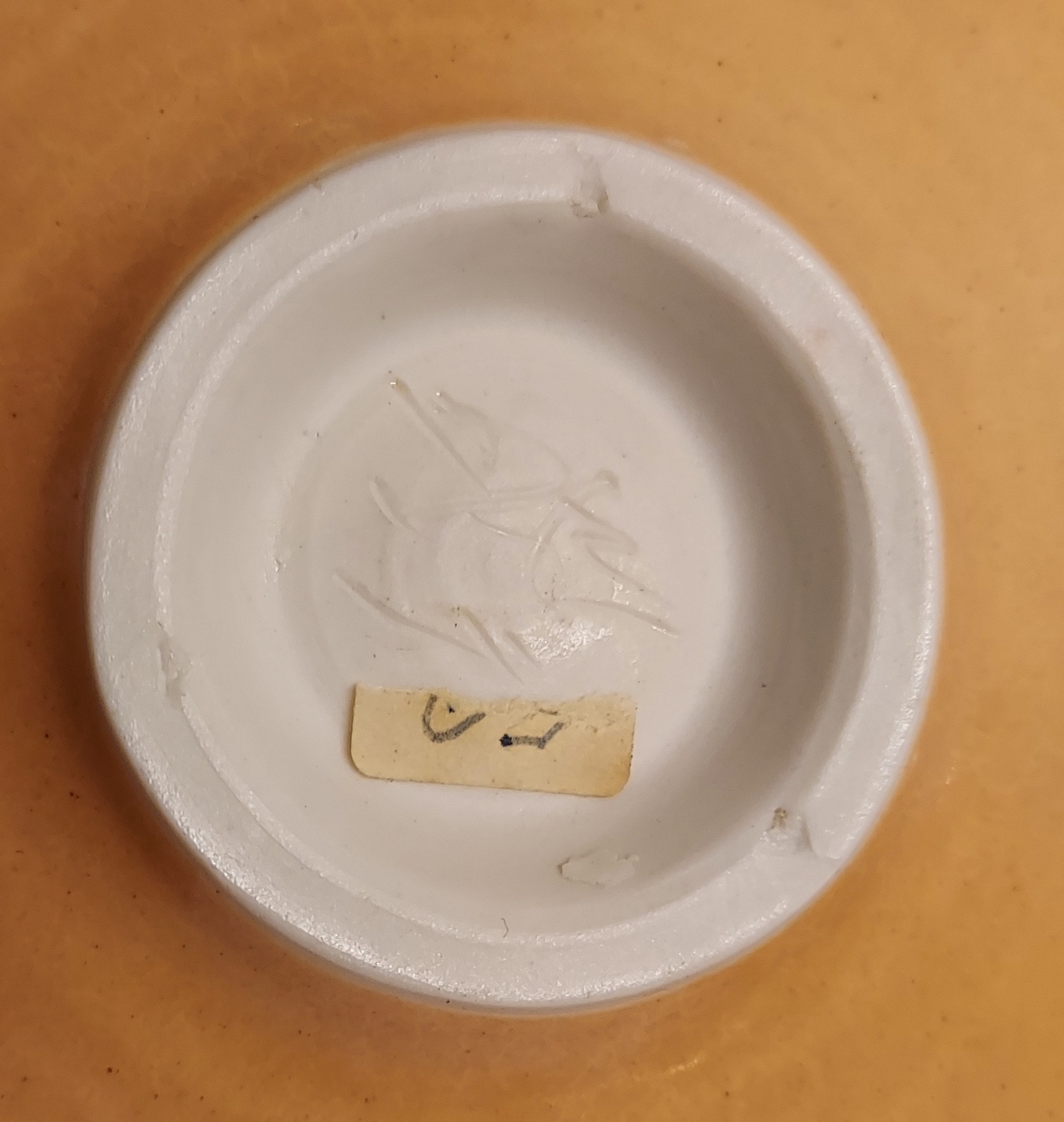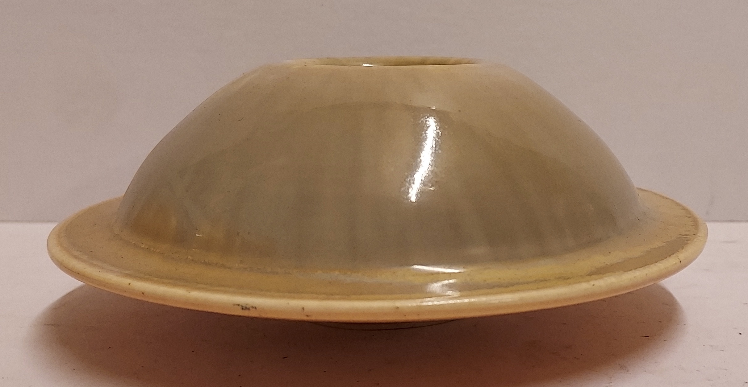 Vasija de disco con esmalte marrón beige. Parte inferior con firma.
