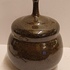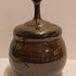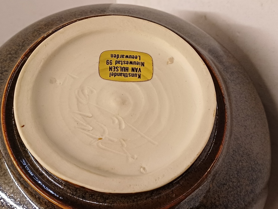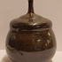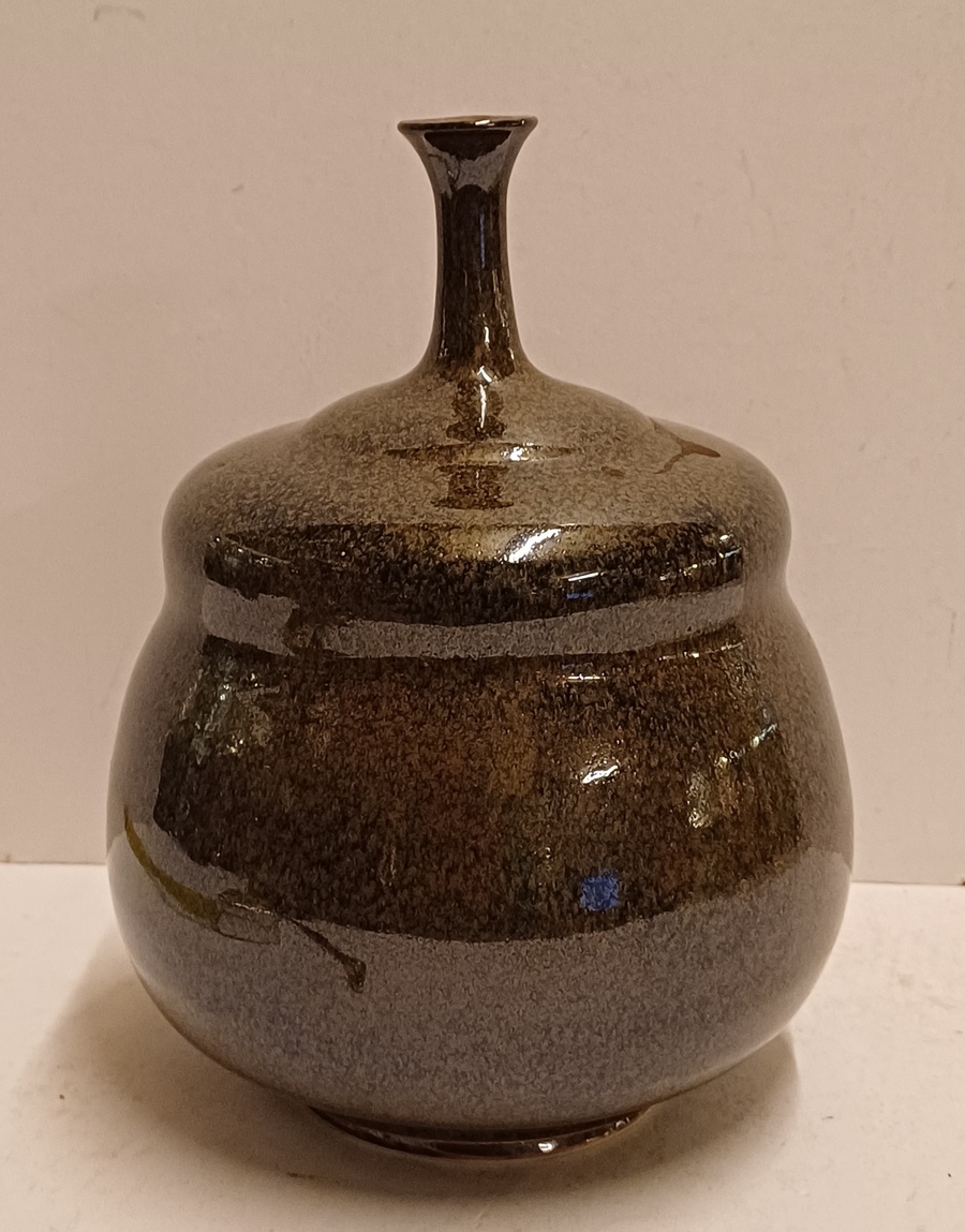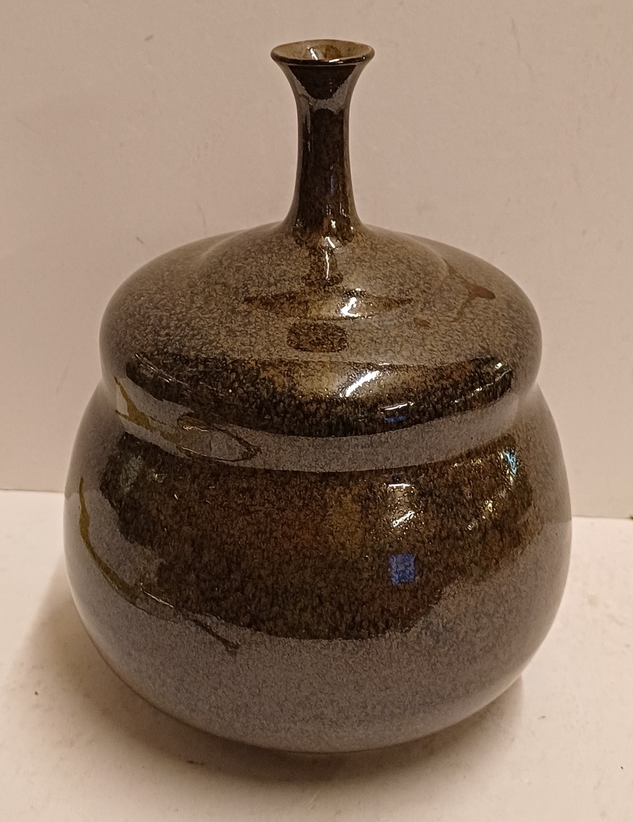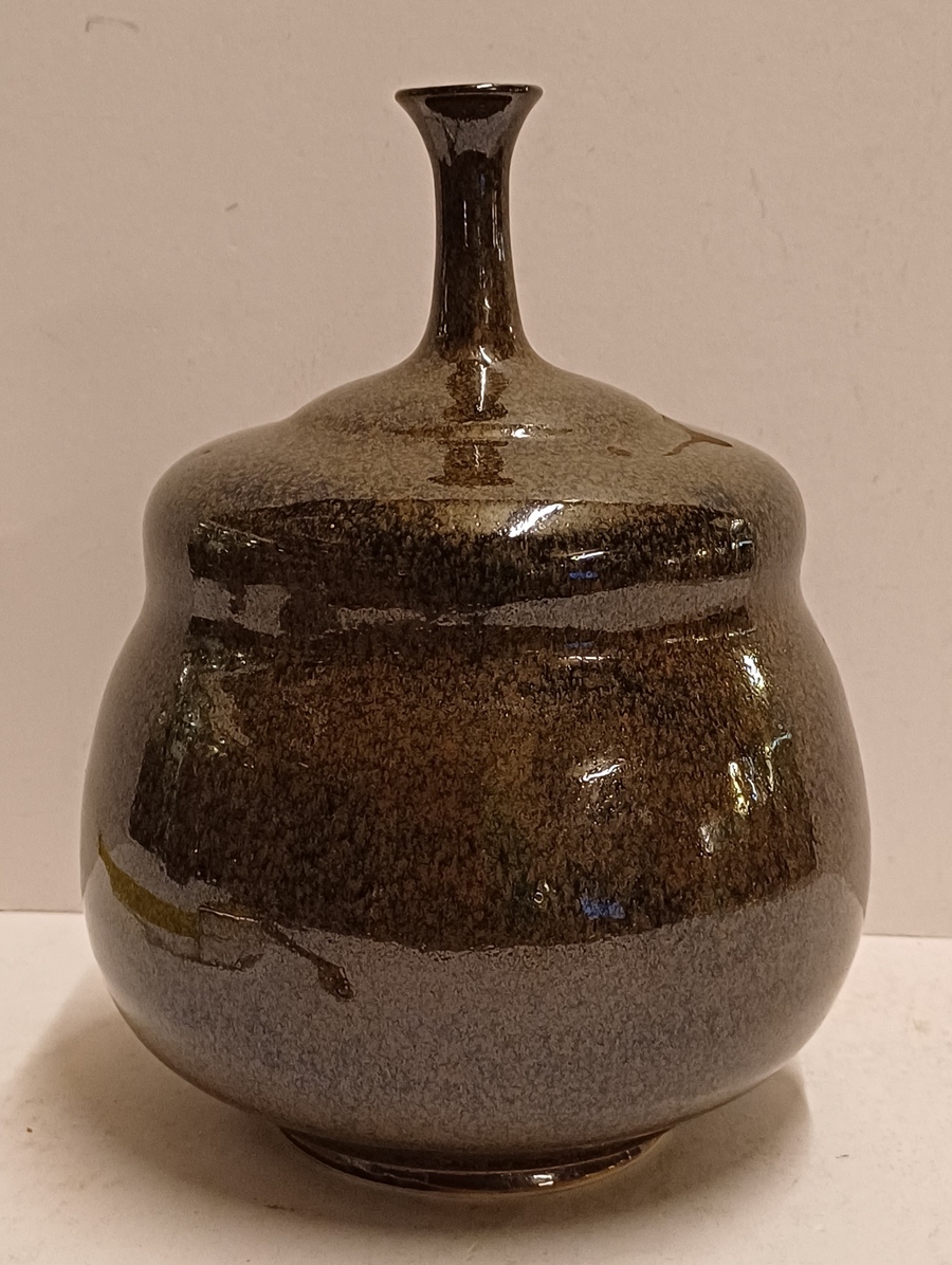 Jarrón de gres con cuello estrecho, con esmalte oscuro moteado. Parte inferior con firma.