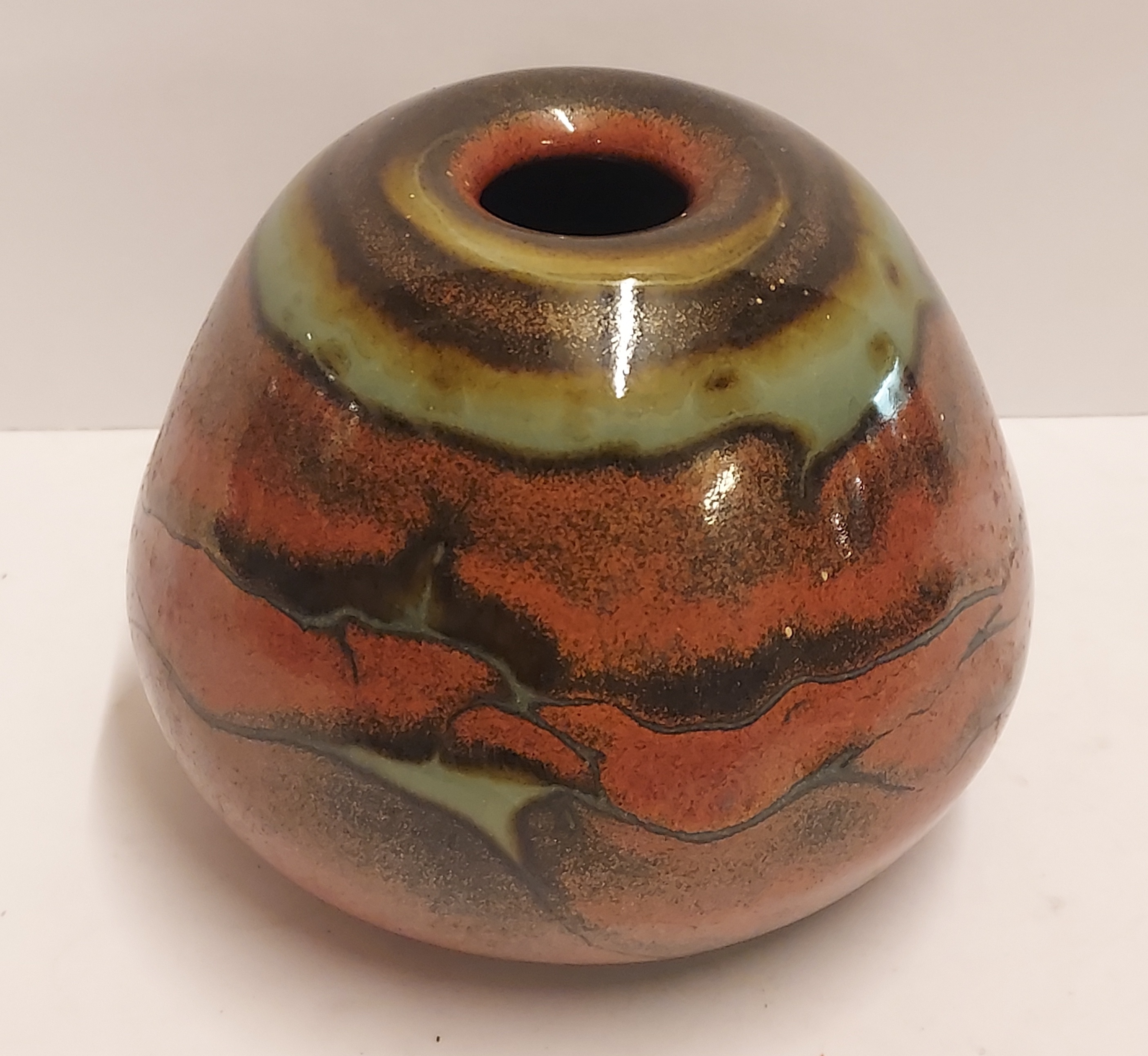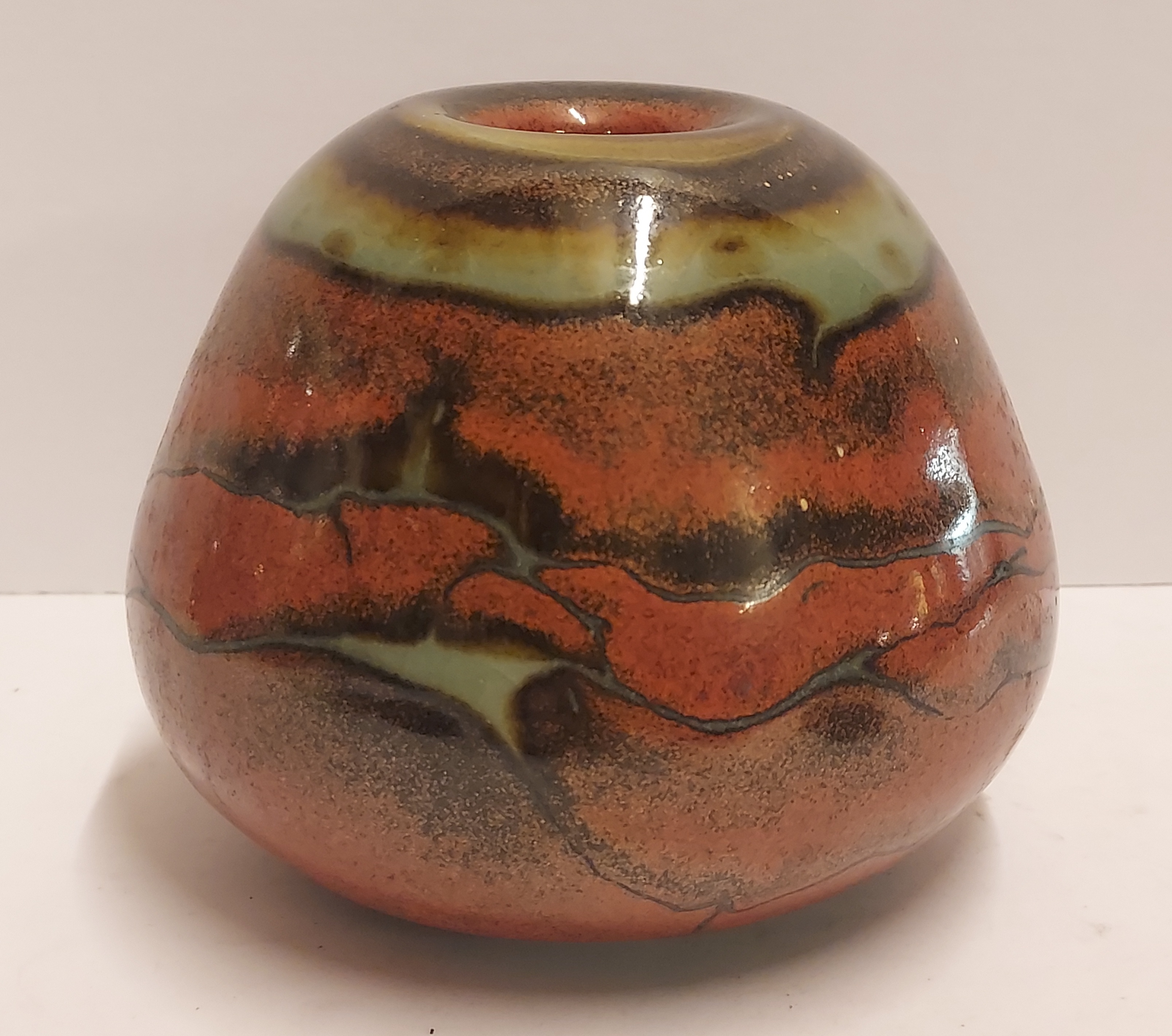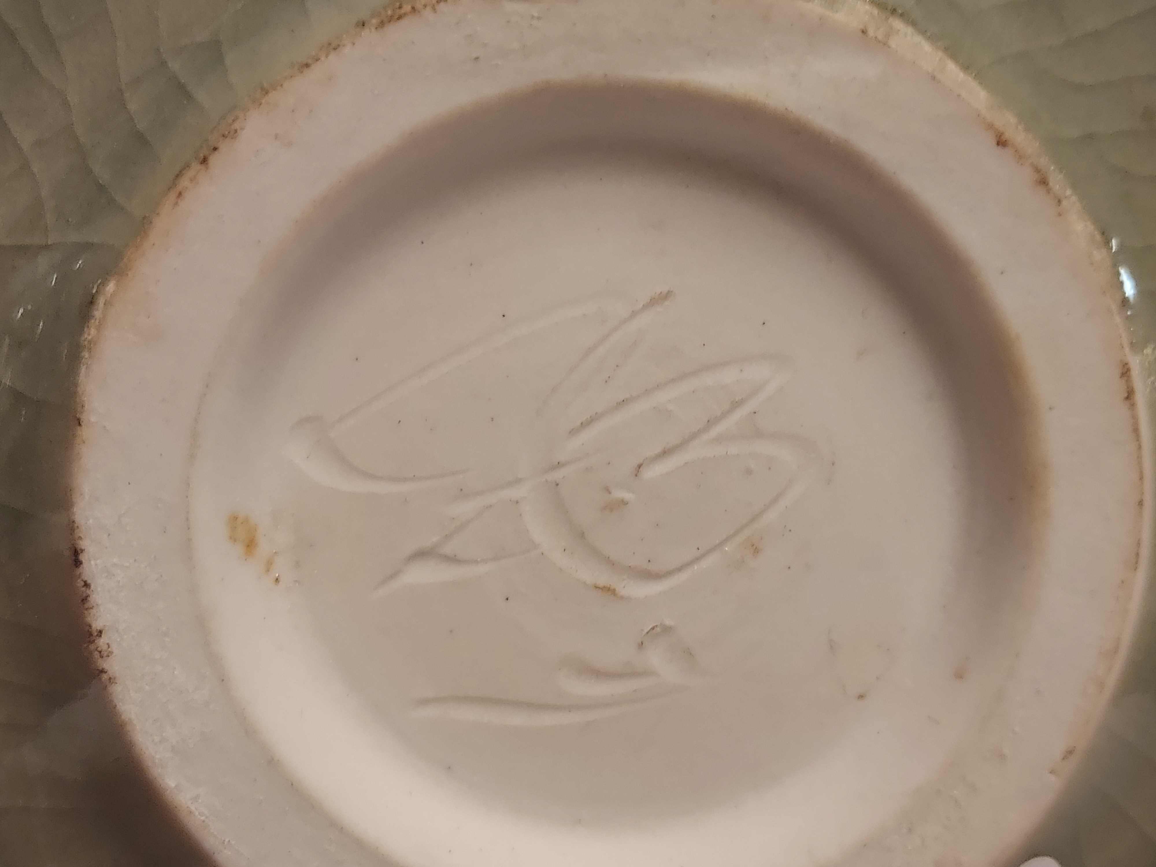 Con esmalte de color naranja oscuro con acentos verdes. Parte inferior firmada.