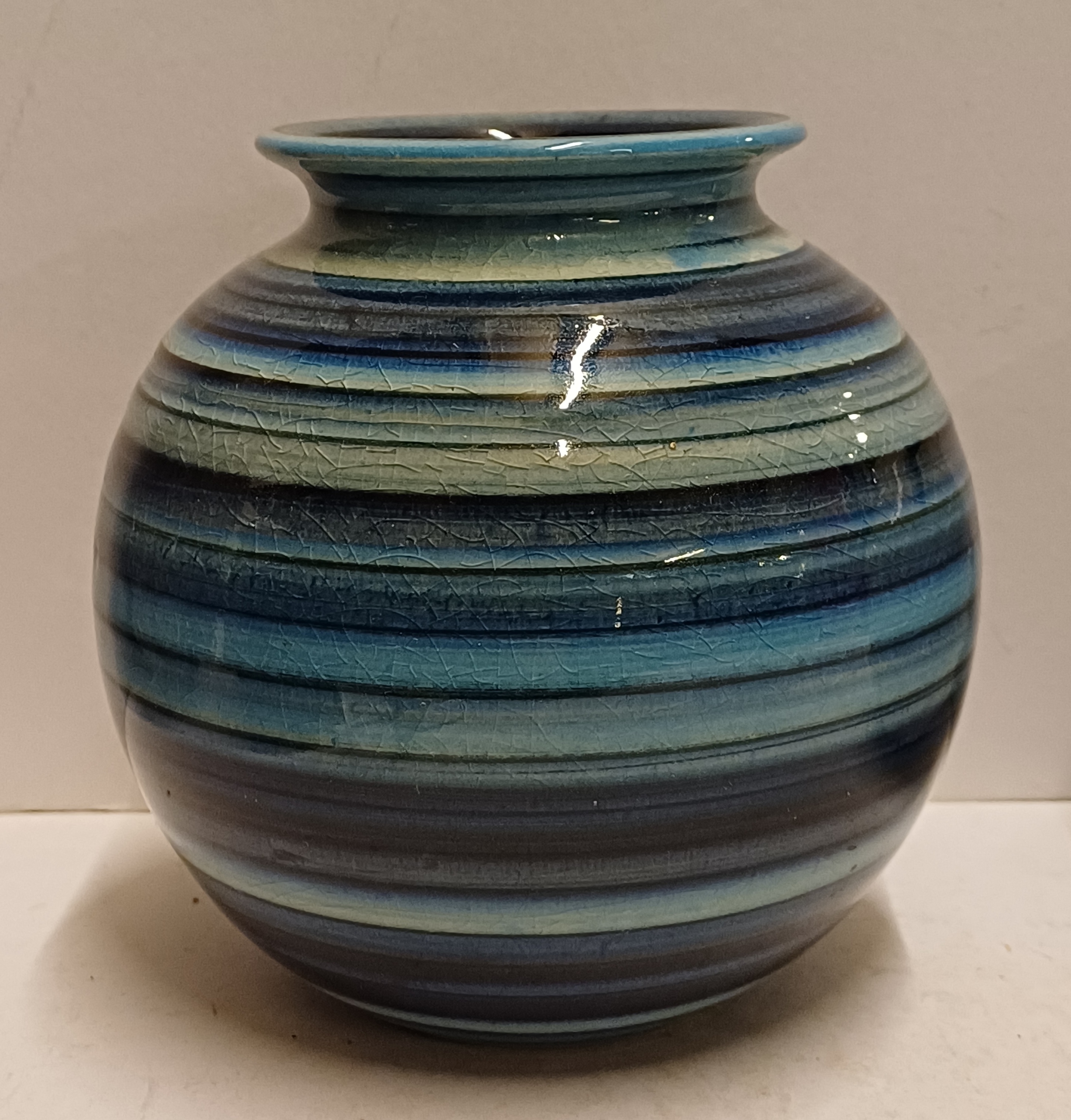 Aardewerken bolle vaas met blauwe banden decor zogenaamde regenboog serie in blauw. Ontwerp Joke Stroes uitvoering Mobach Utrecht.