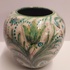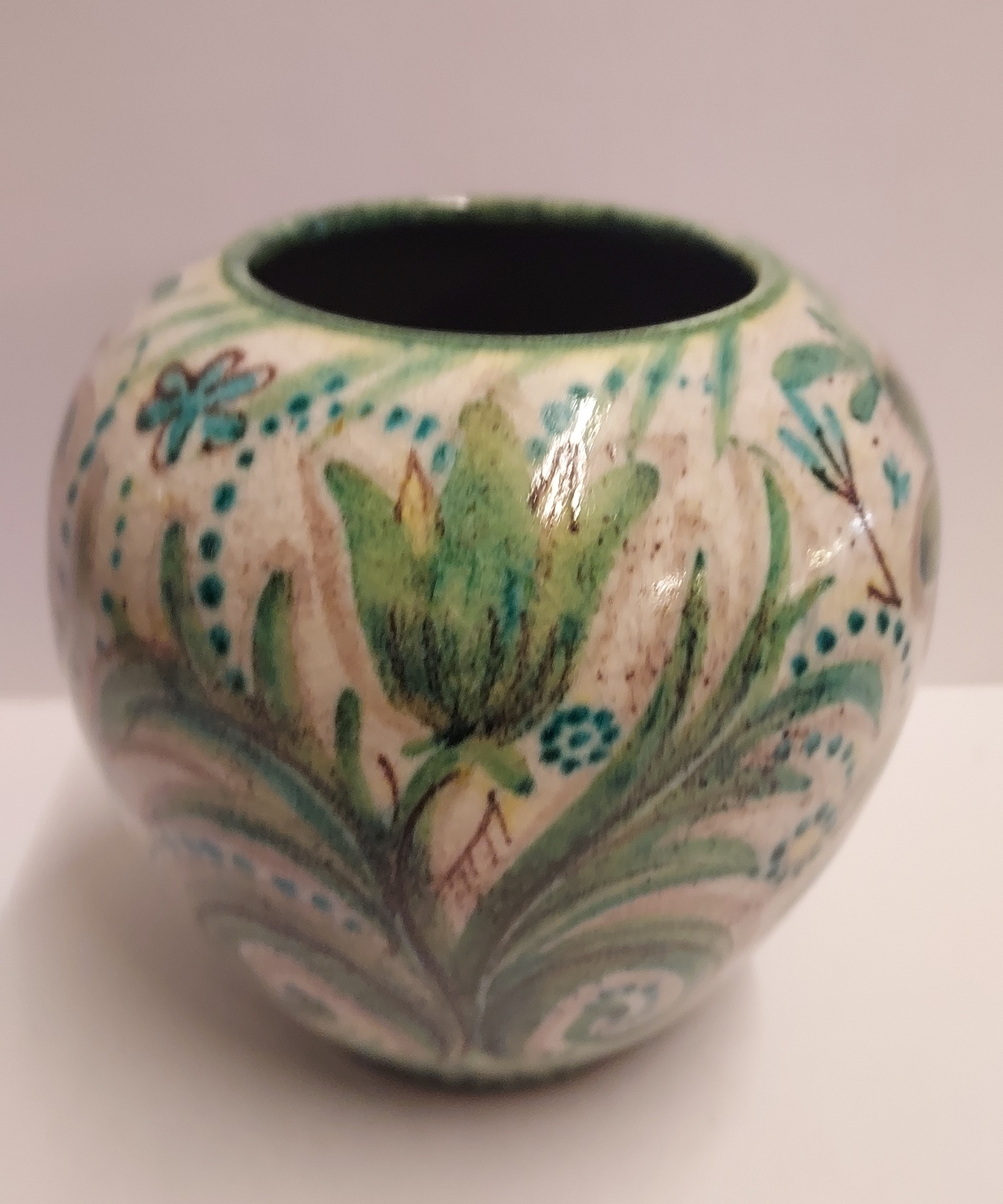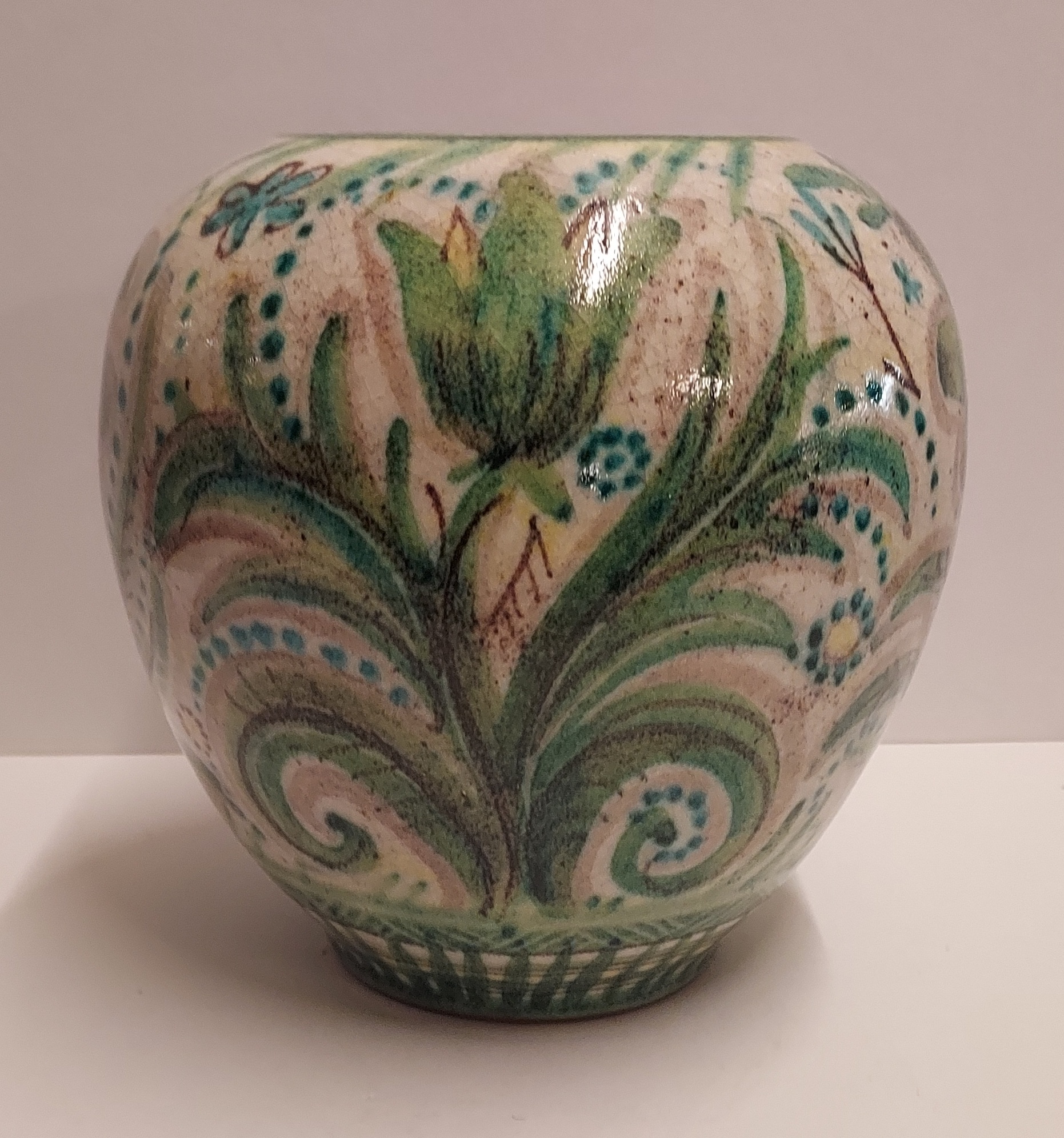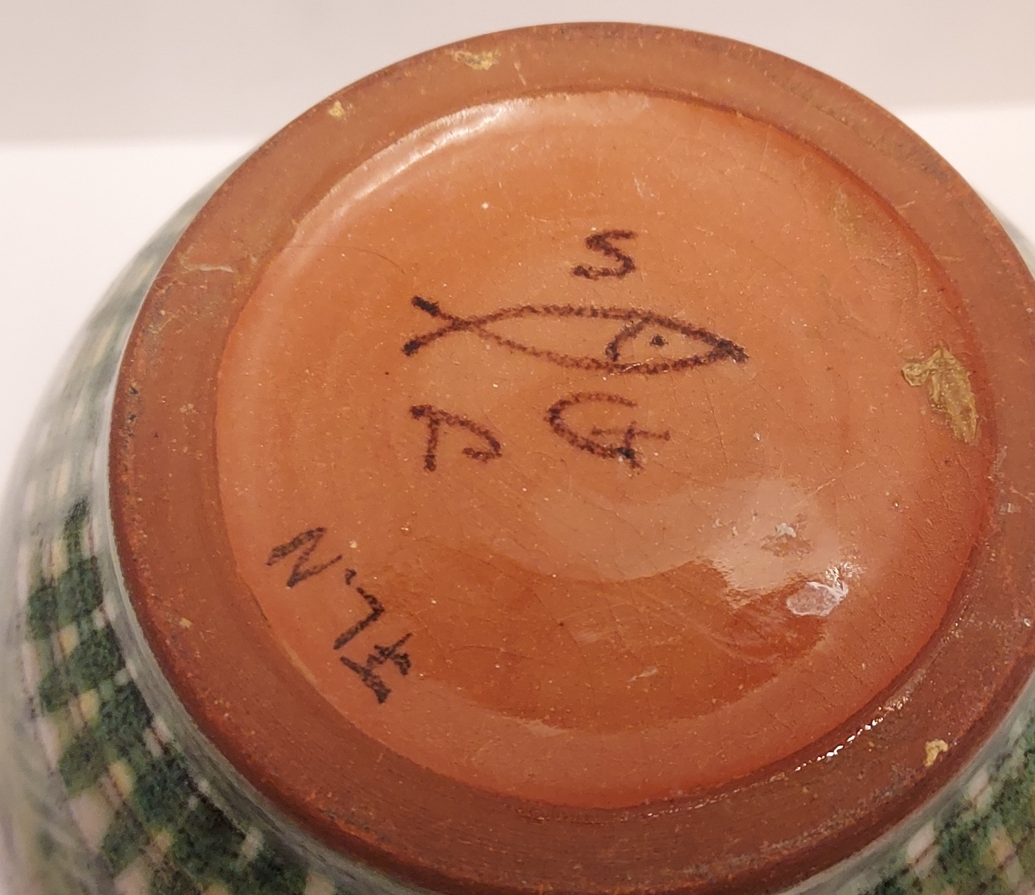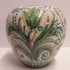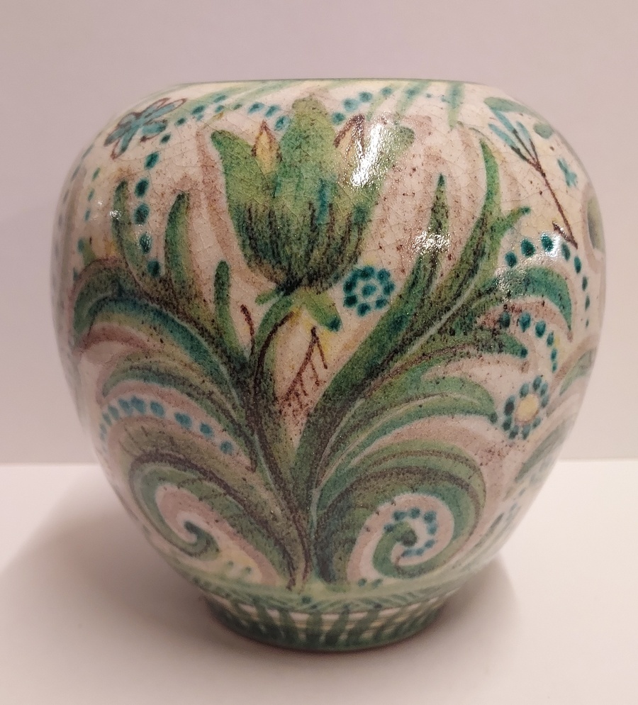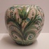 Jarrón de terracota con decoración floral estilizada en verde. Parte inferior con marca de fábrica de un pececito SG.