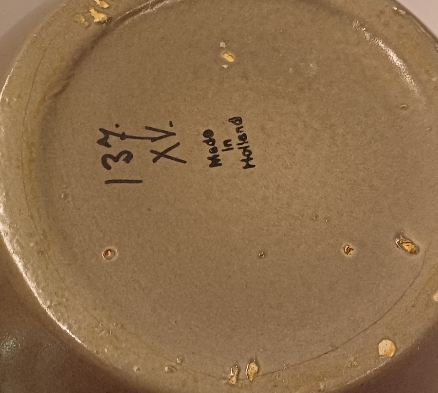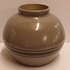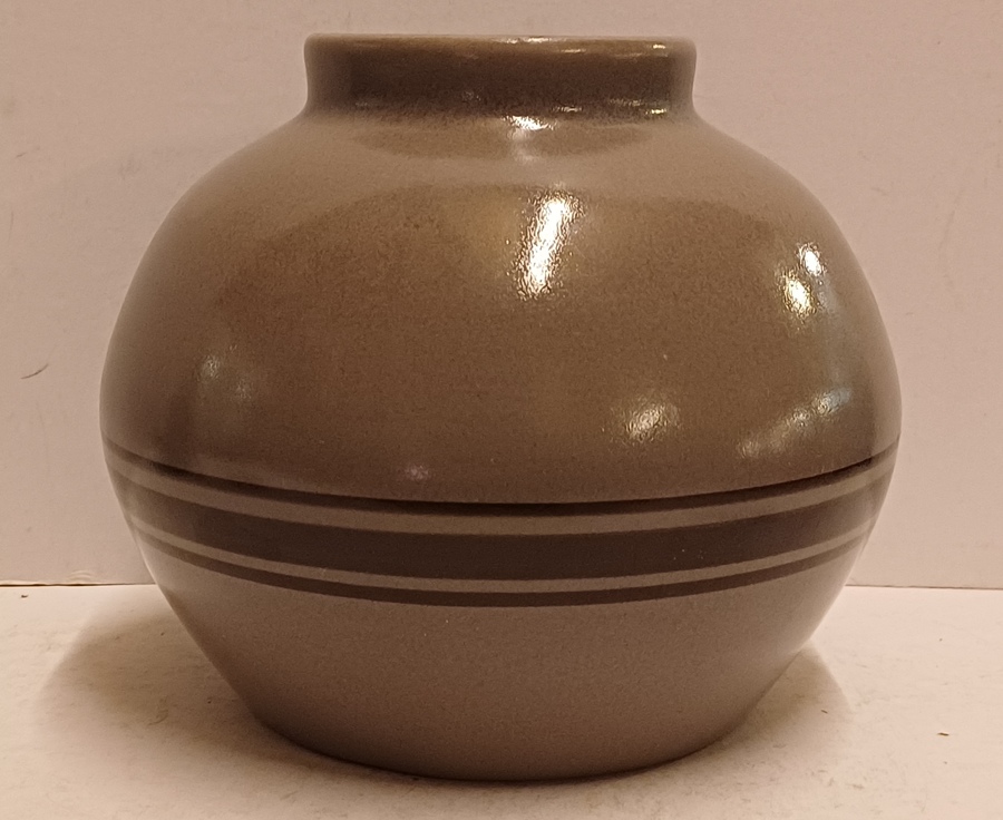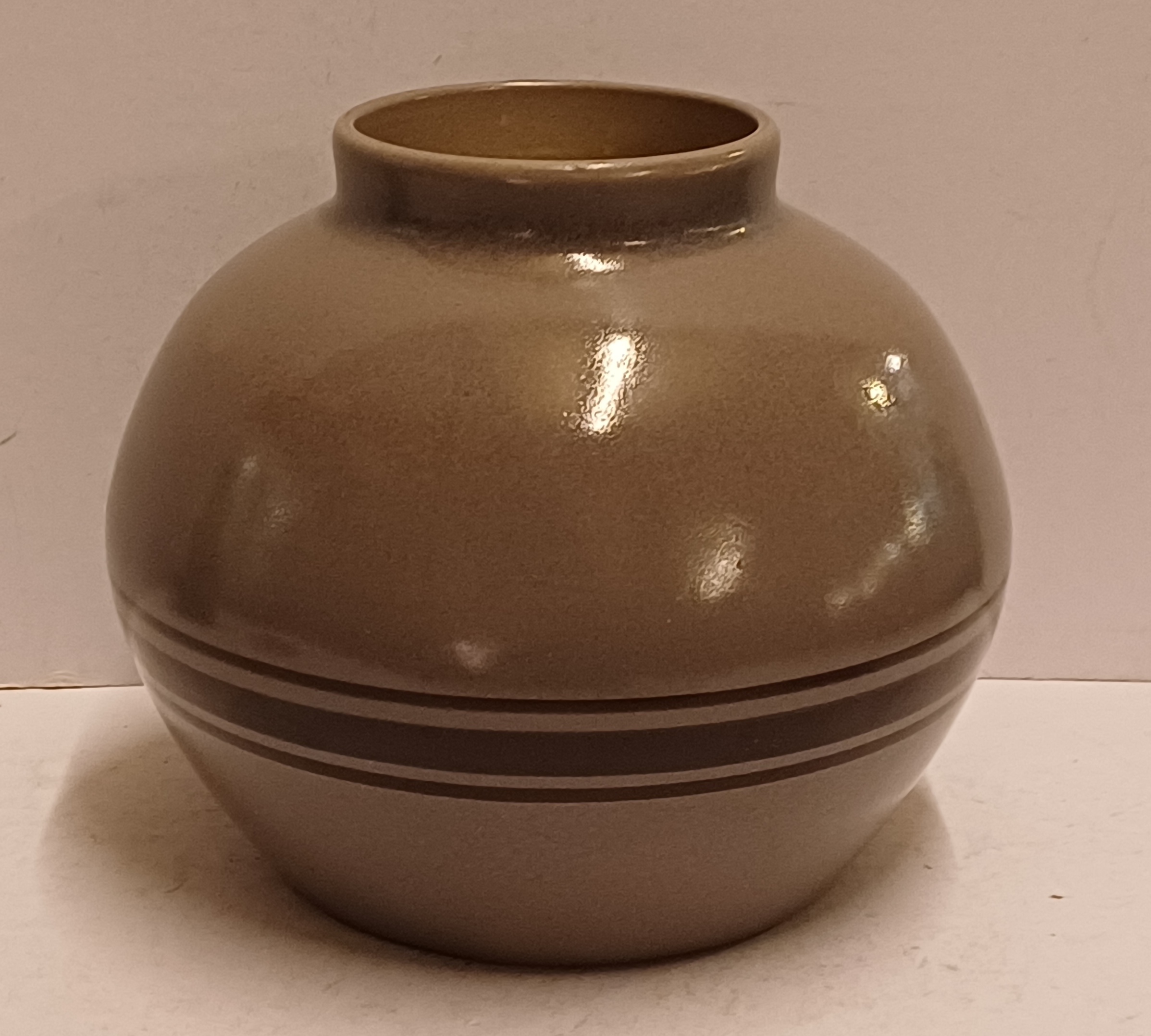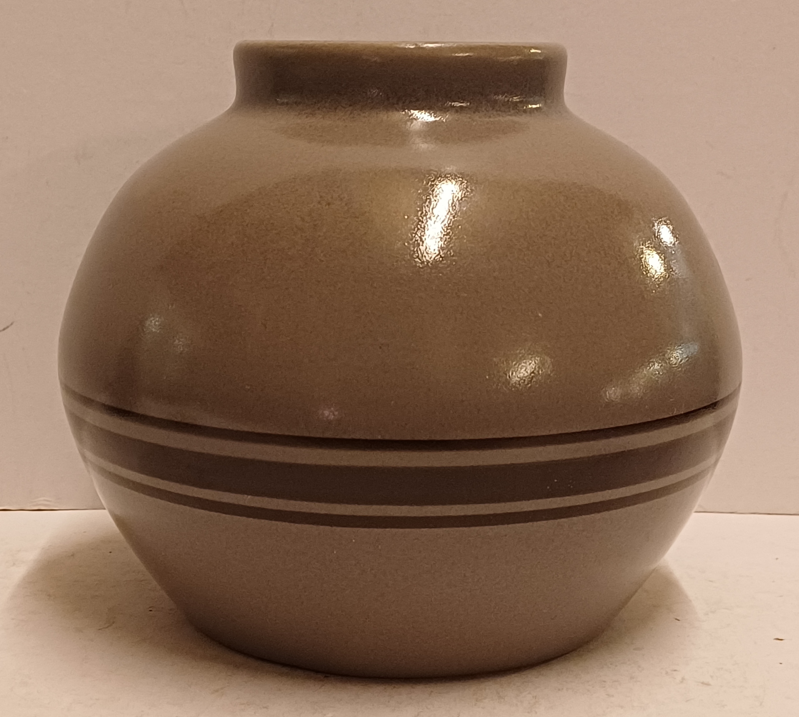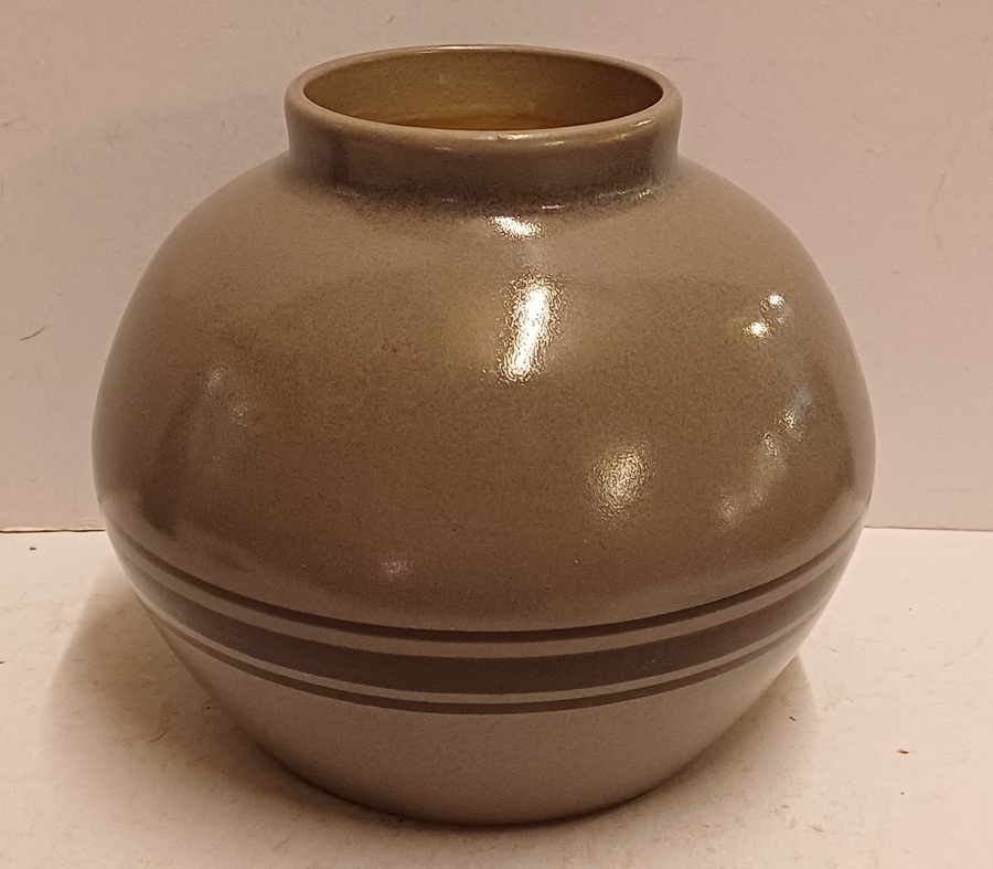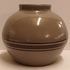 Jarrón de loza con esmalte gris y bandas horizontales negras. Parte inferior con la inscripción "made in holland" con marca y numeración 137 XV.