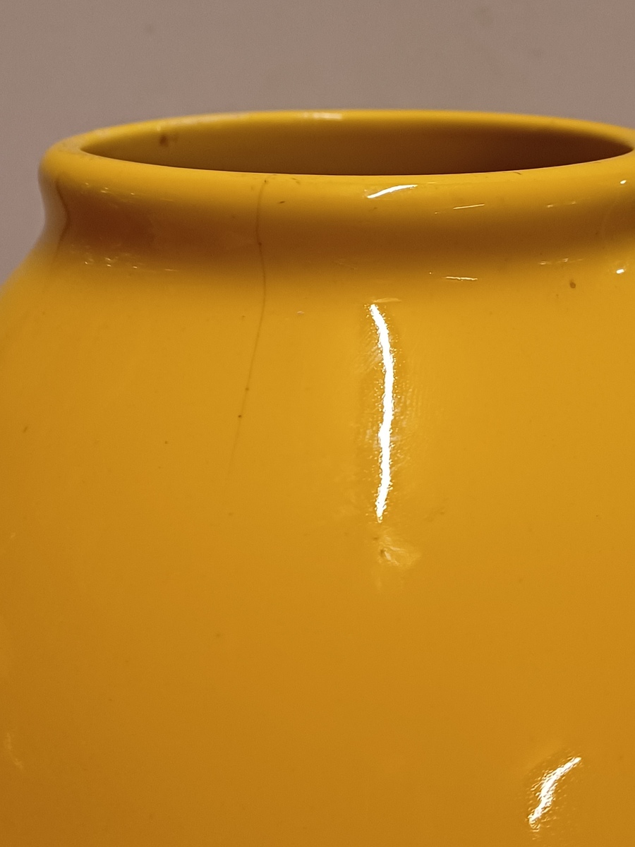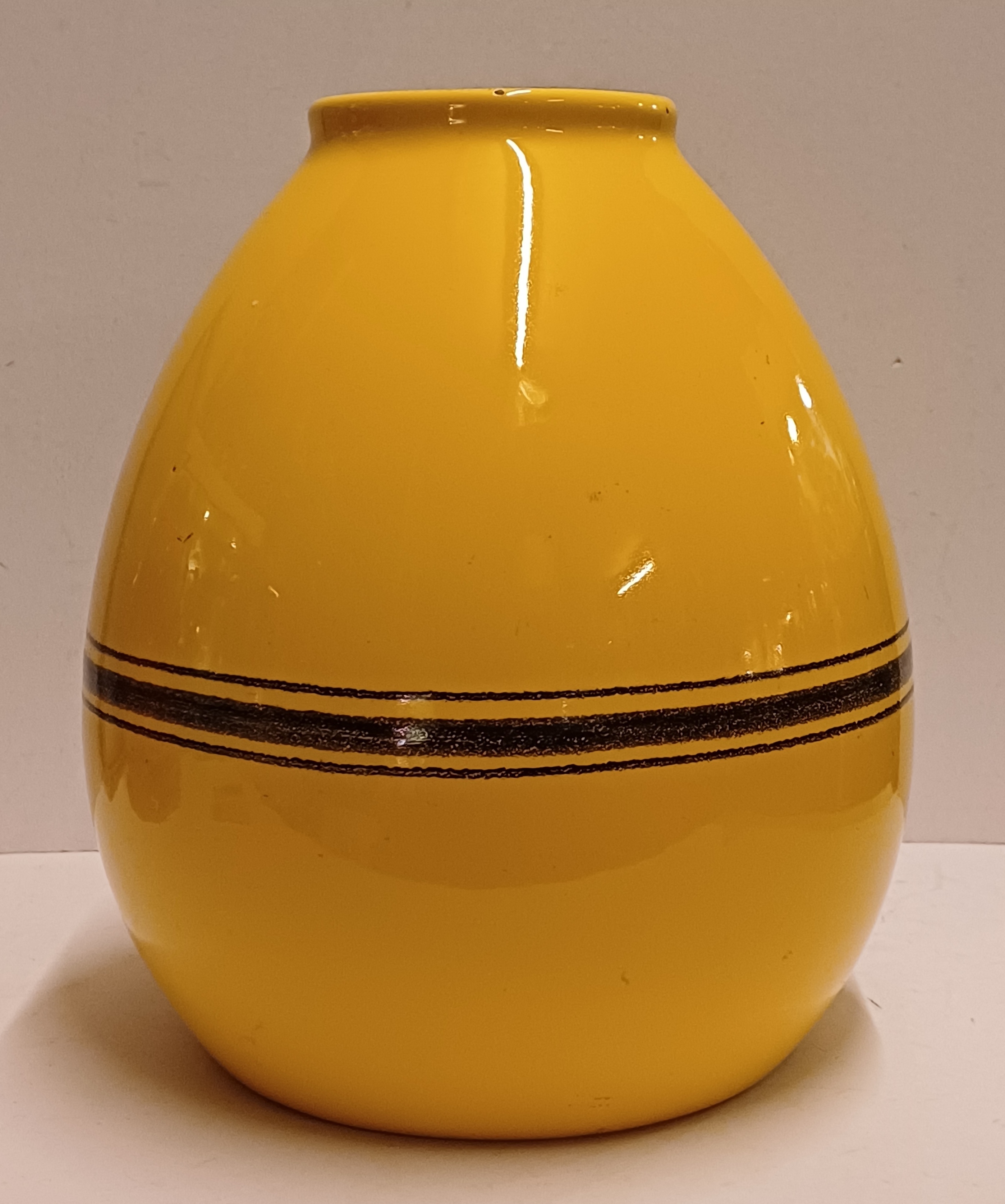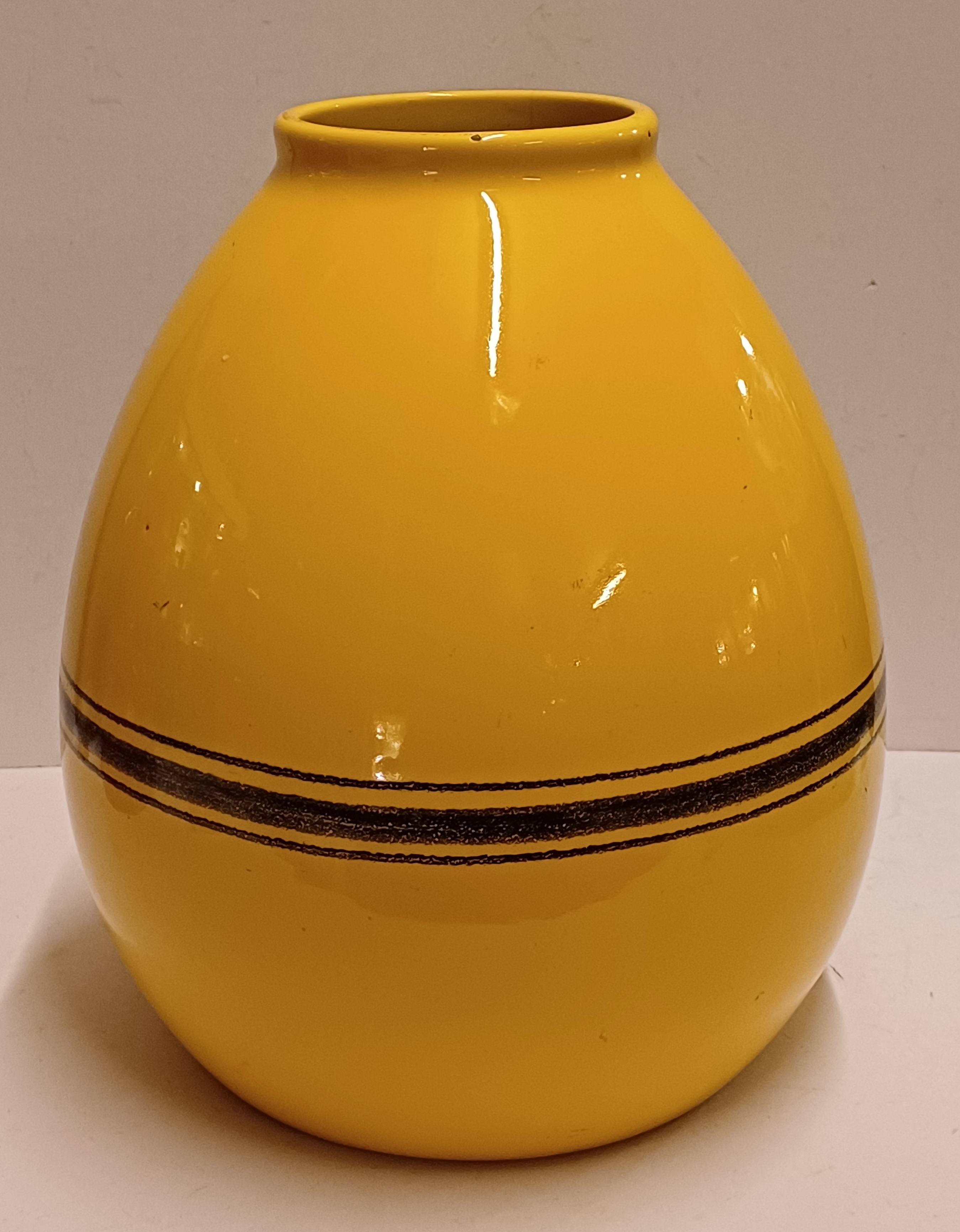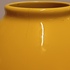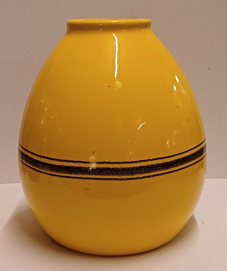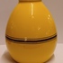 Grote gegoten aardewerken vaas met horizontale zwarte lijnen op geel fond. Onderzijde met fabrieksmerk.