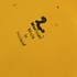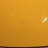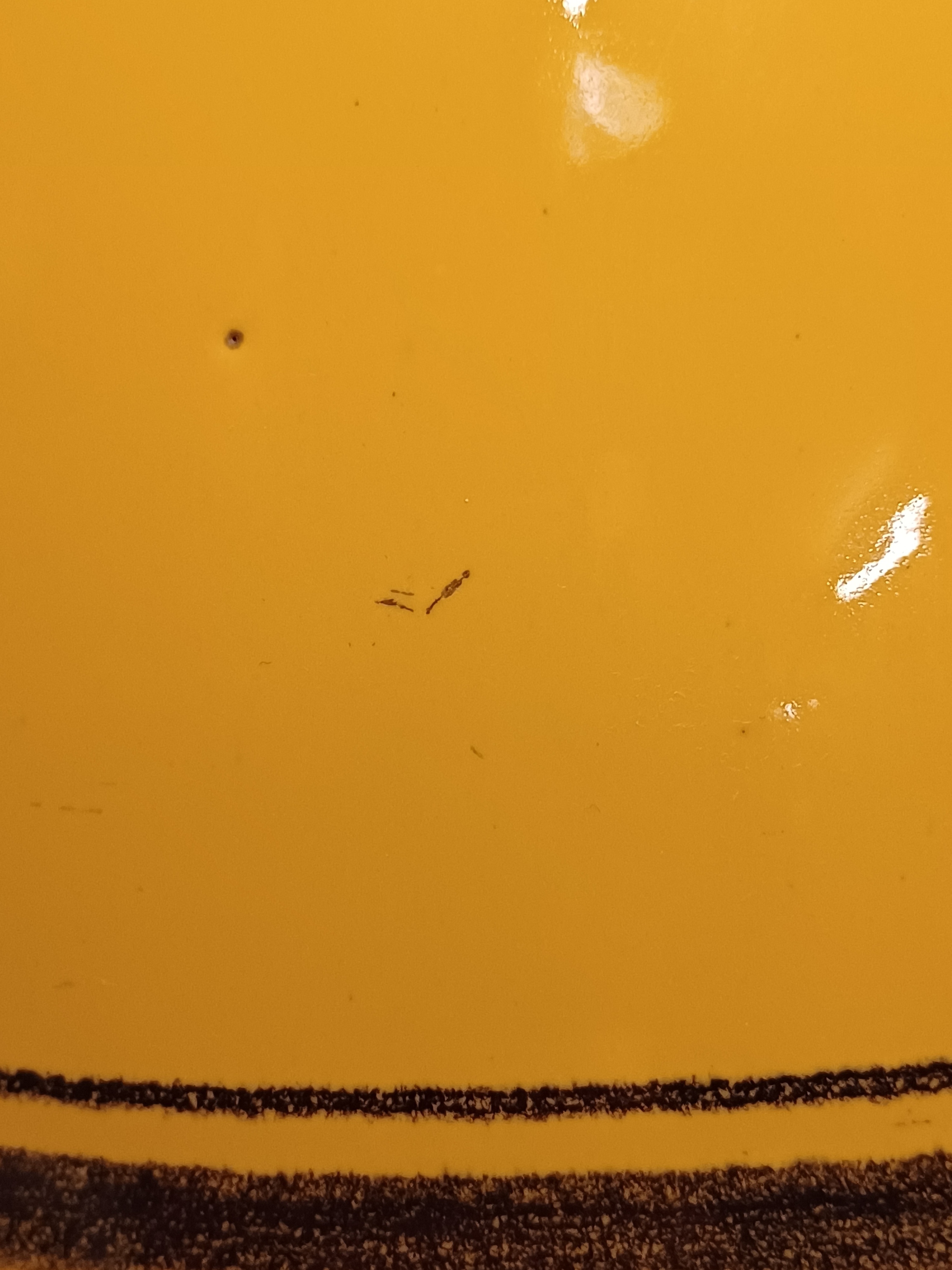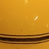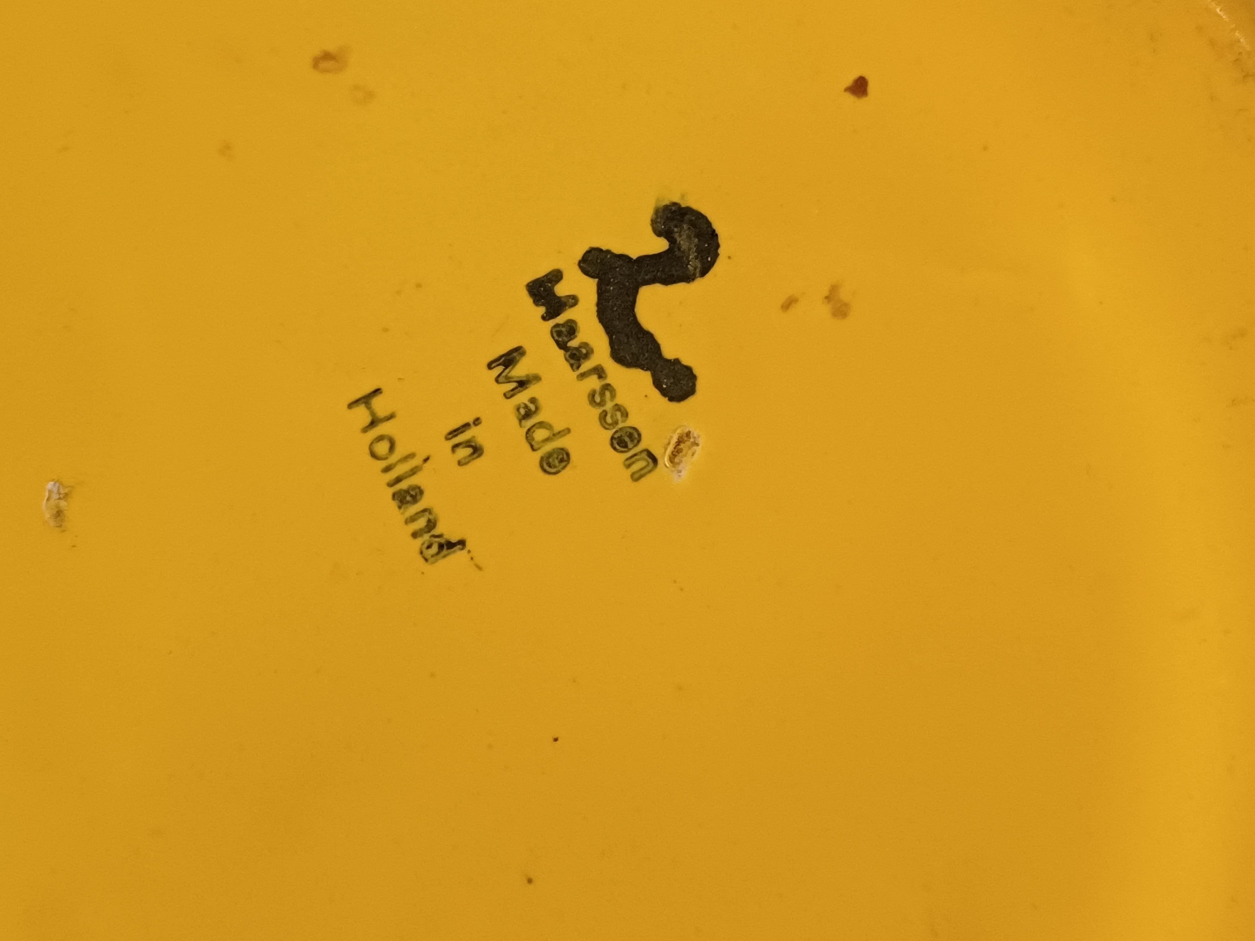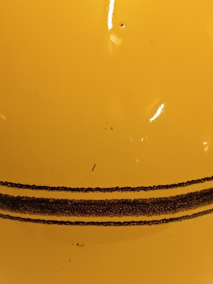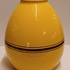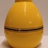 Grote gegoten aardewerken vaas met horizontale zwarte lijnen op geel fond. Onderzijde met fabrieksmerk.