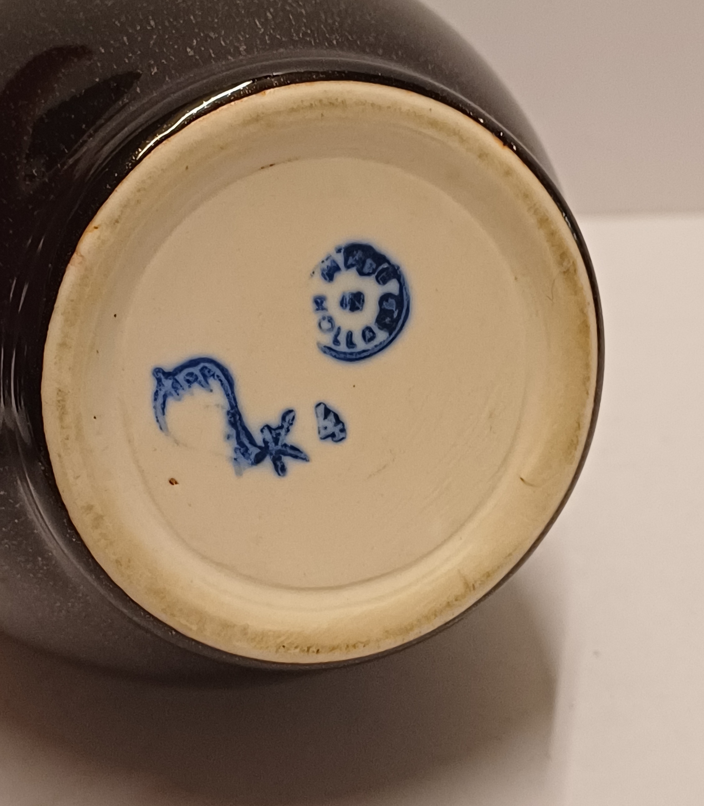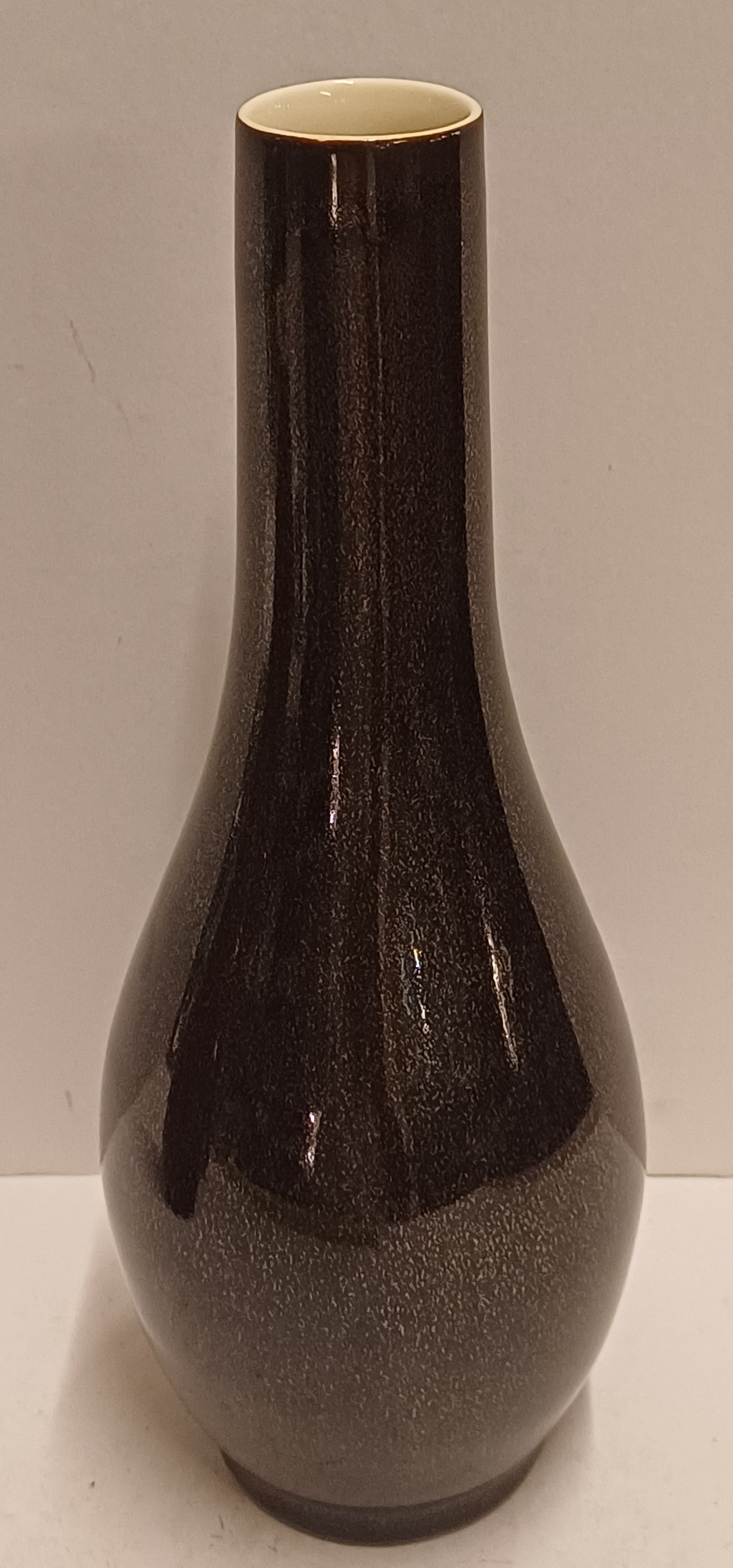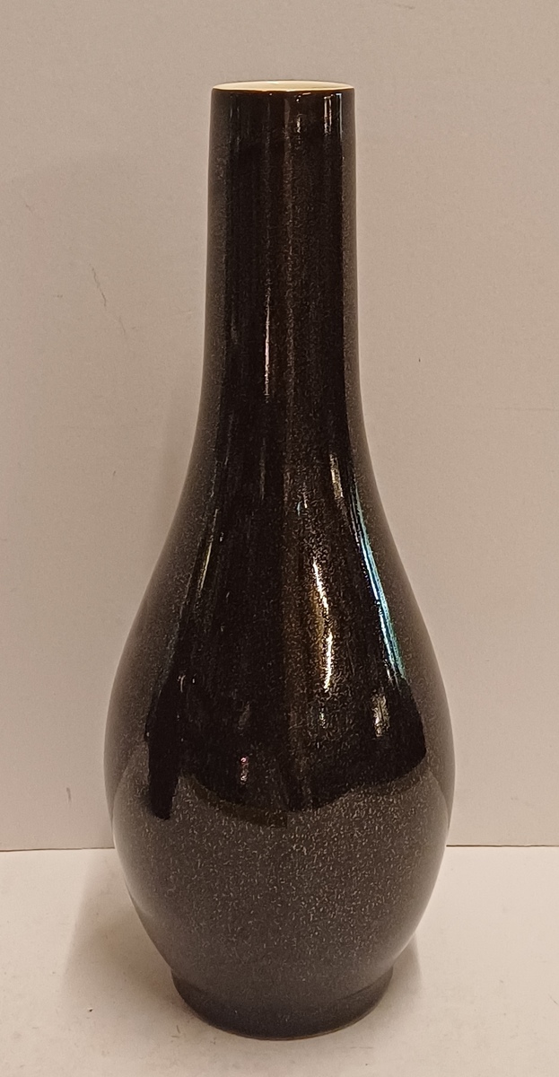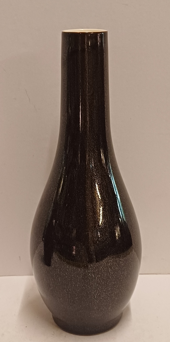Jarrón de porcelana blanca con esmalte tenmoku marrón. Parte inferior con marca de fábrica. Diseño de Han Knaap.