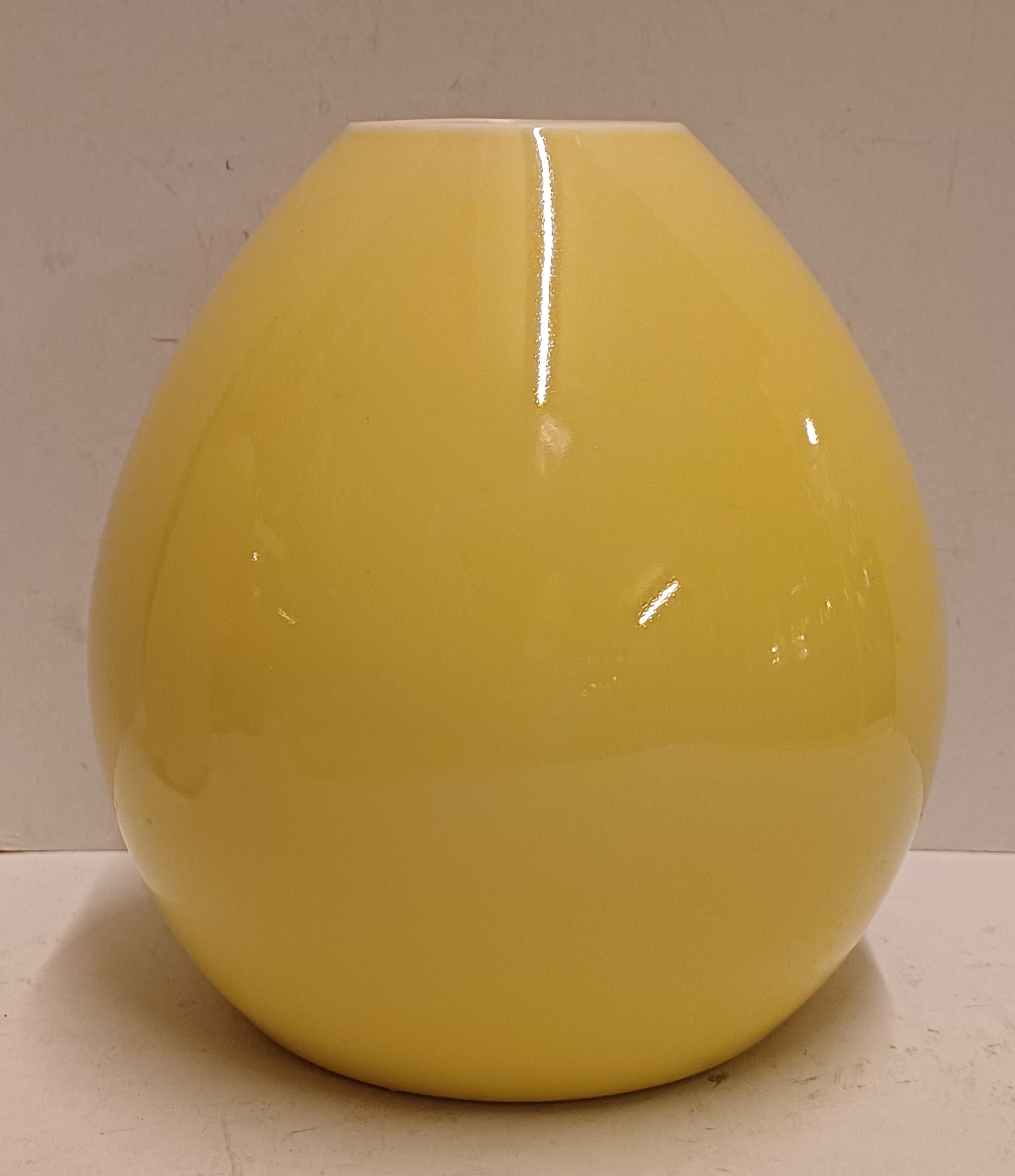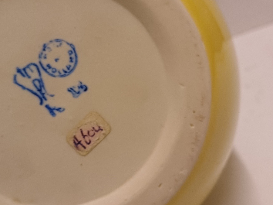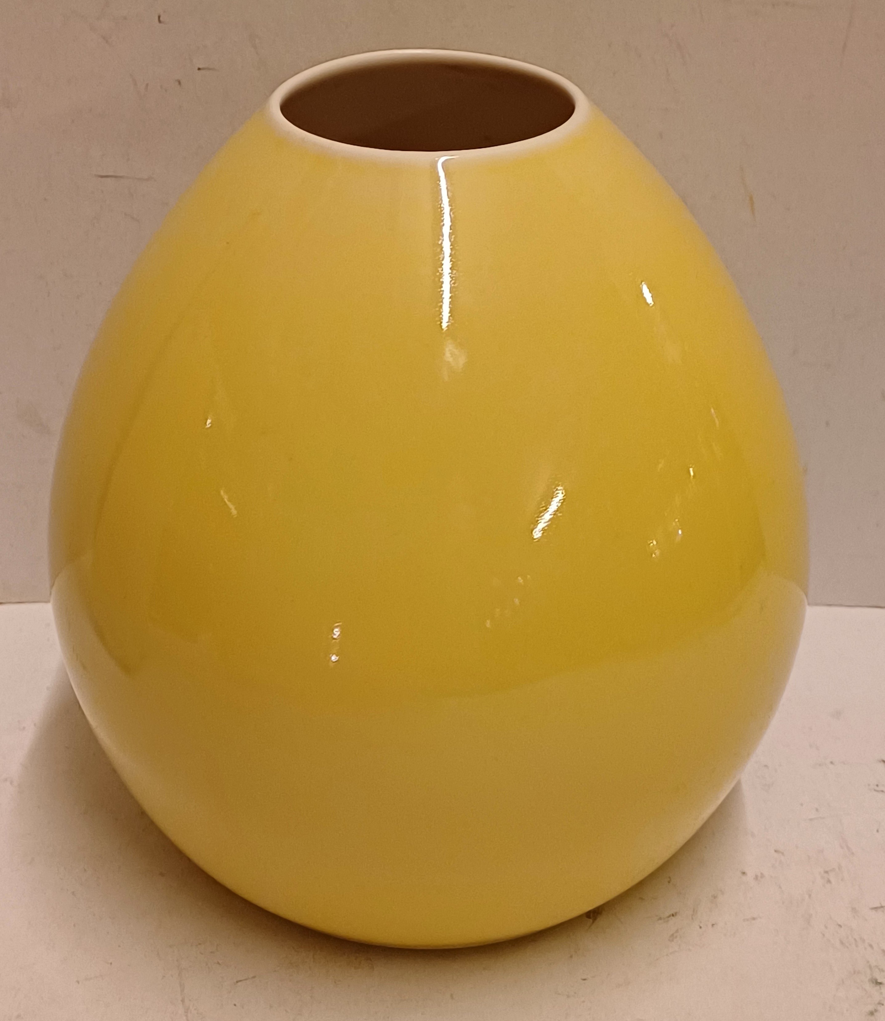 Vaas met gele glazuur en witte binnenzijde. Onderzijde met fabrieksmerk.