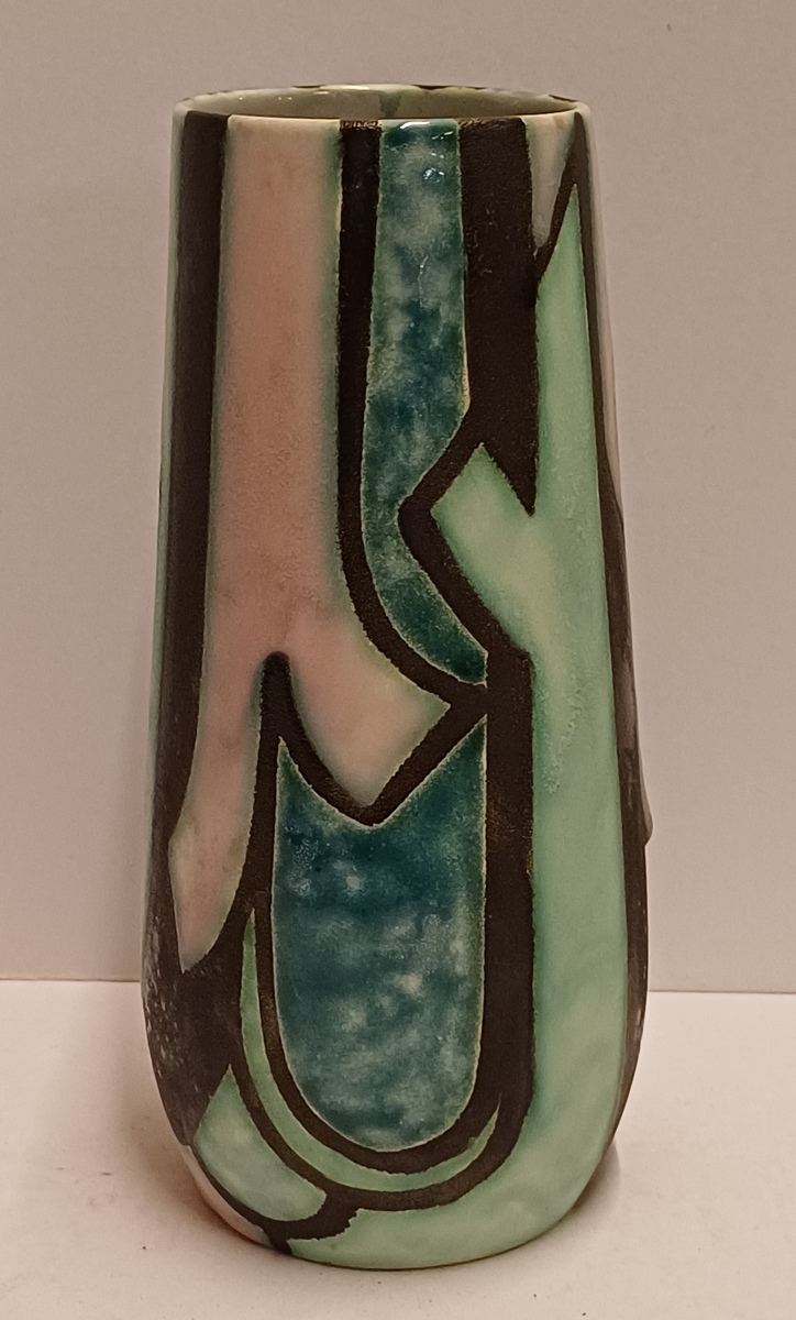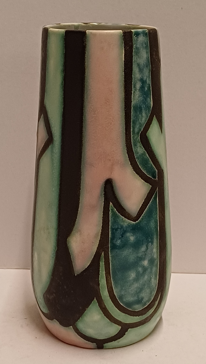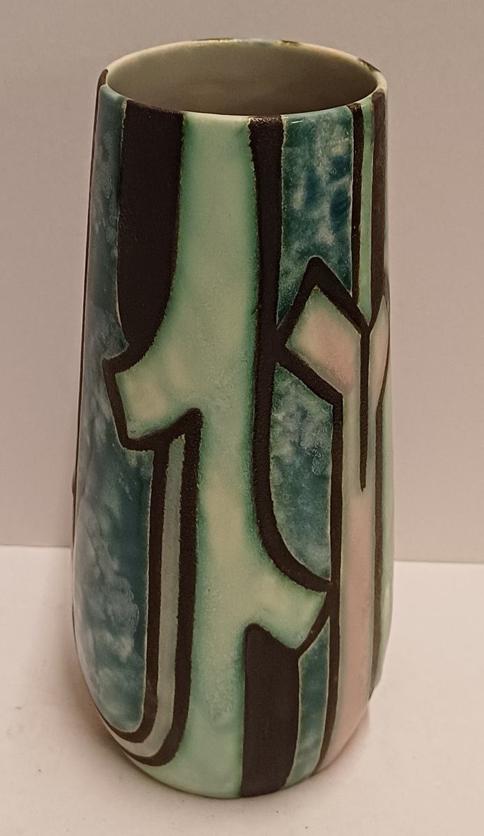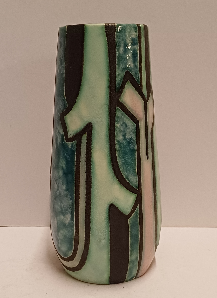 Een gegoten plateel vaas met meerkleurig gestileerd decor Inca. Ontwerp Willem van Norden voor Goedewagen Gouda. Modelnummer 1628A.