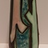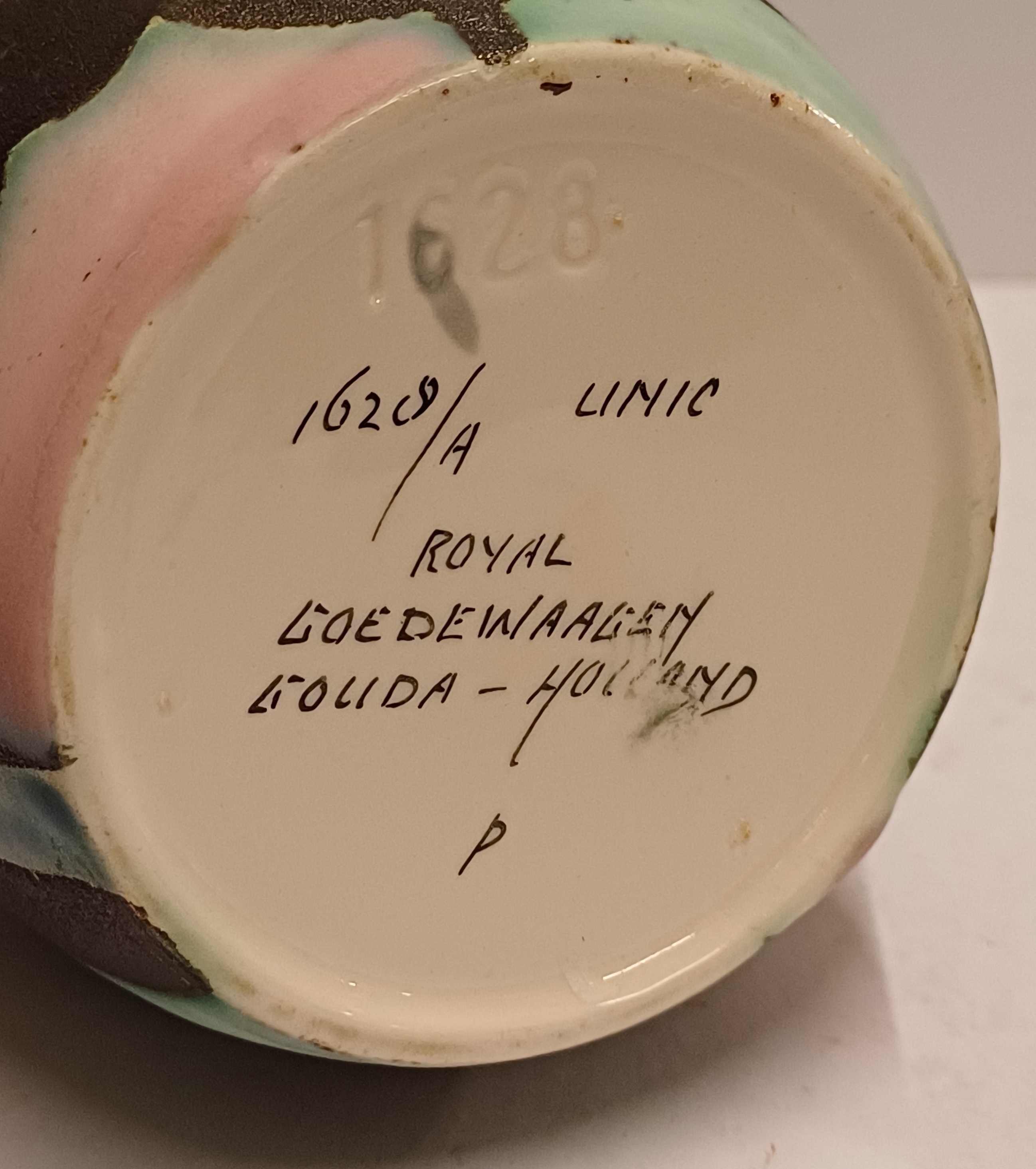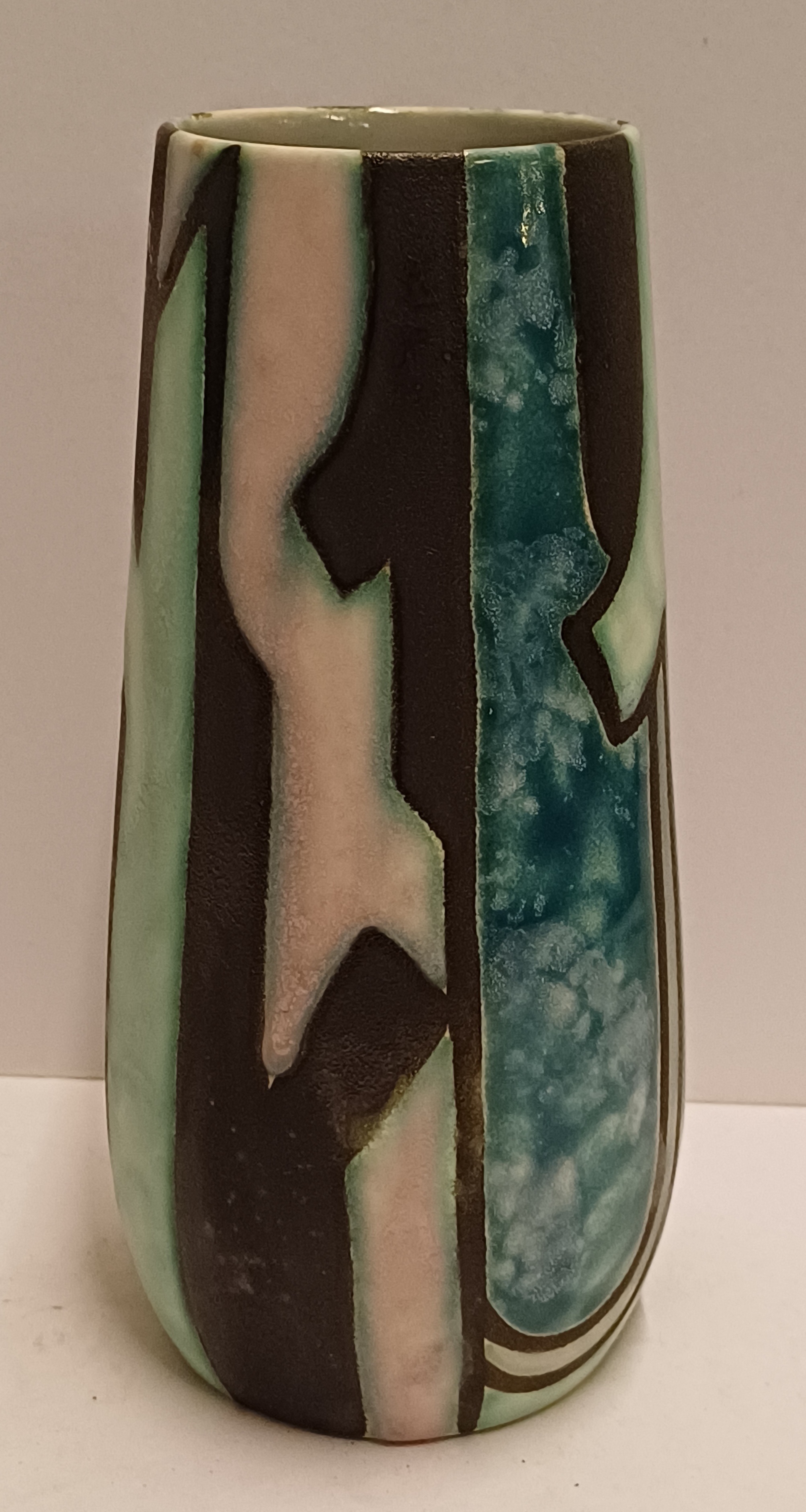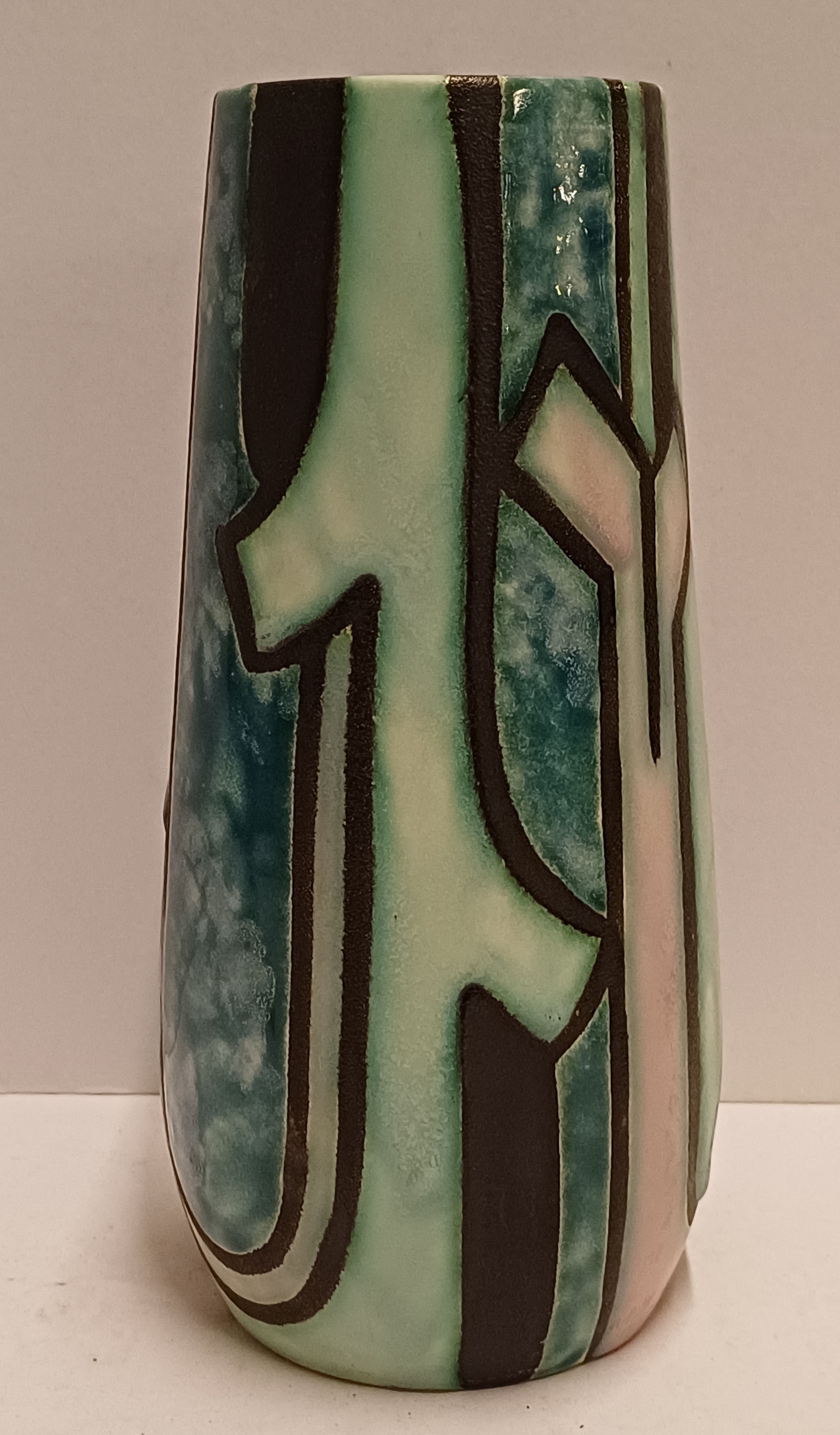 Een gegoten plateel vaas met meerkleurig gestileerd decor Inca. Ontwerp Willem van Norden voor Goedewagen Gouda. Modelnummer 1628A.