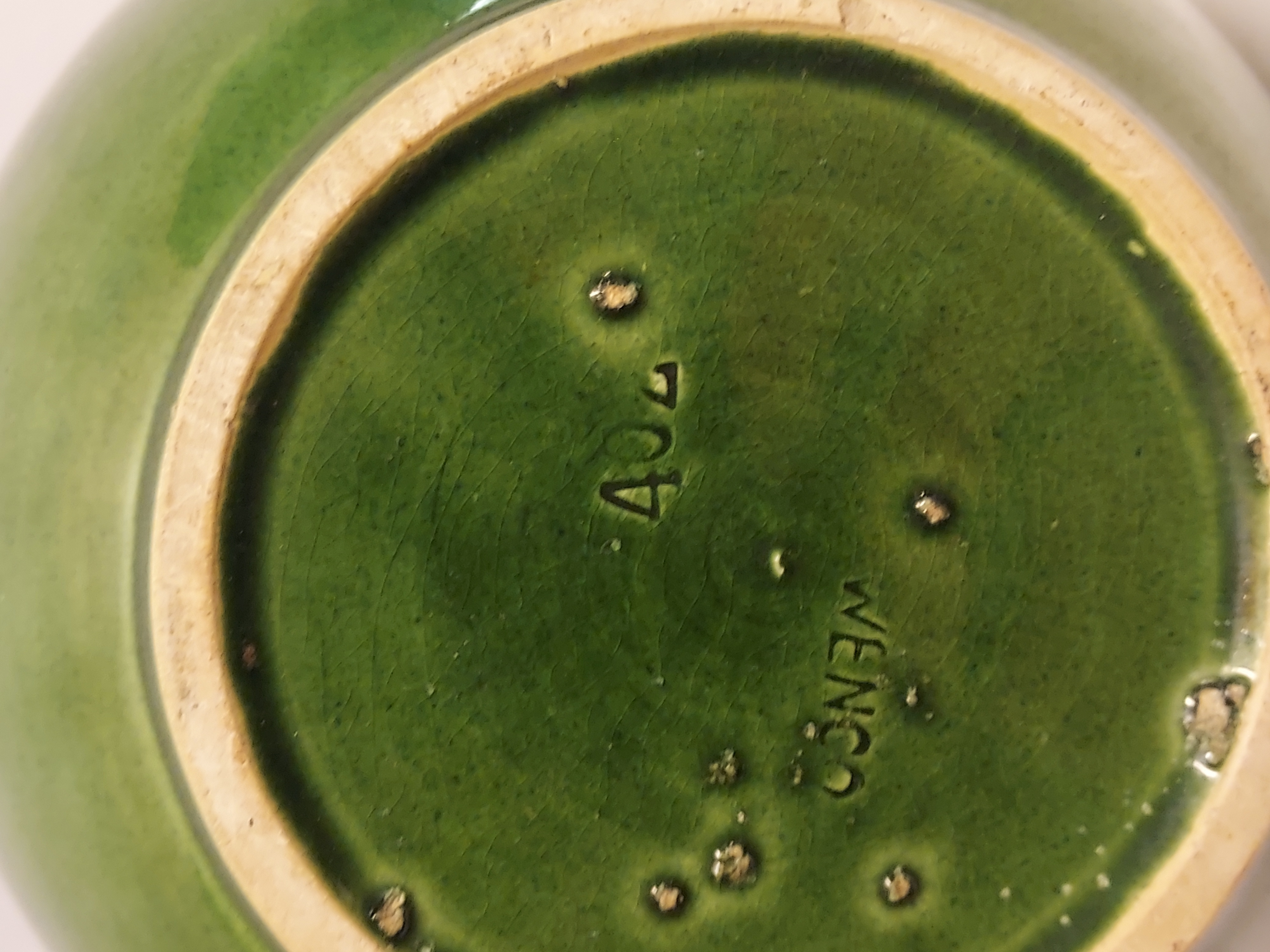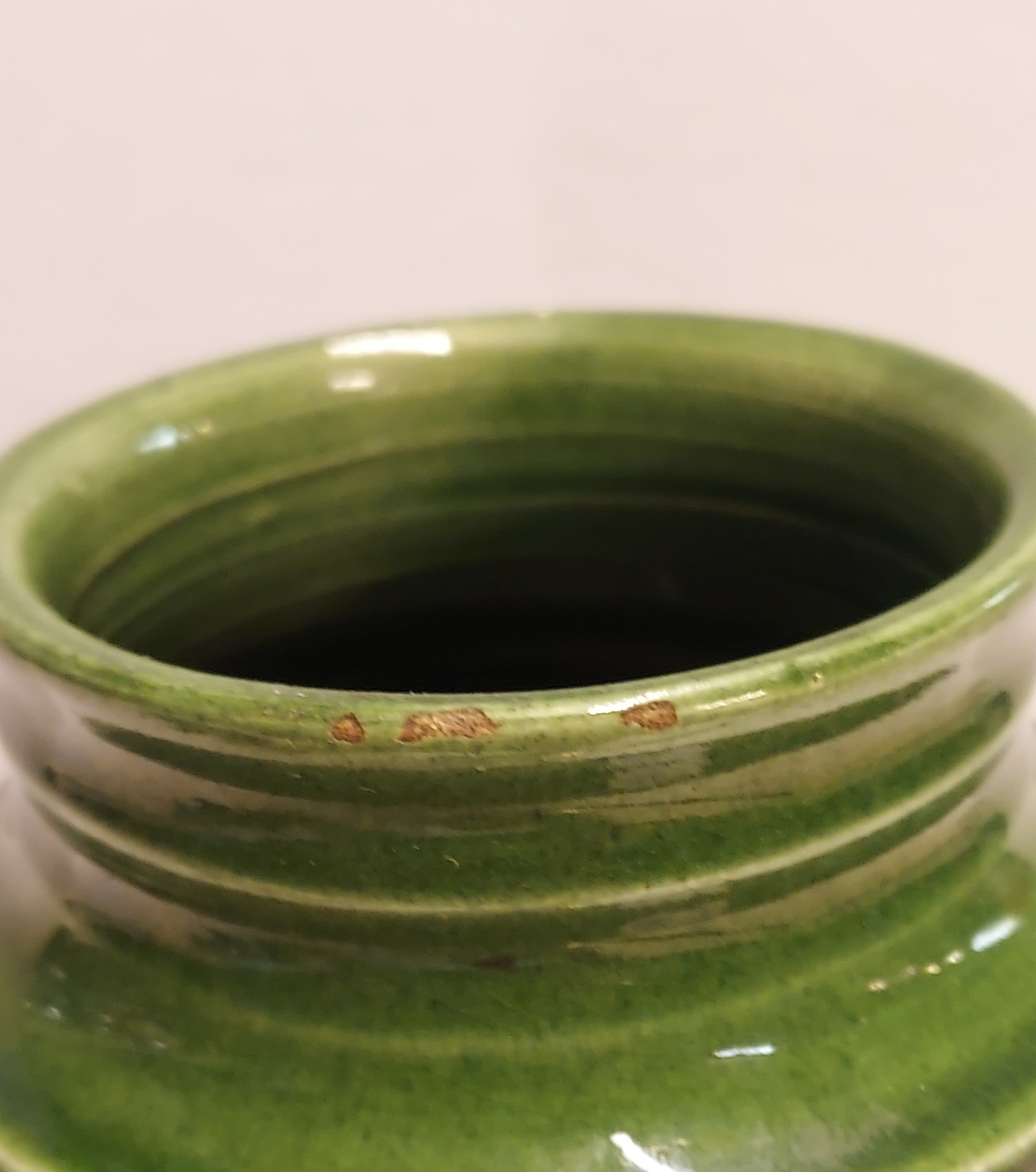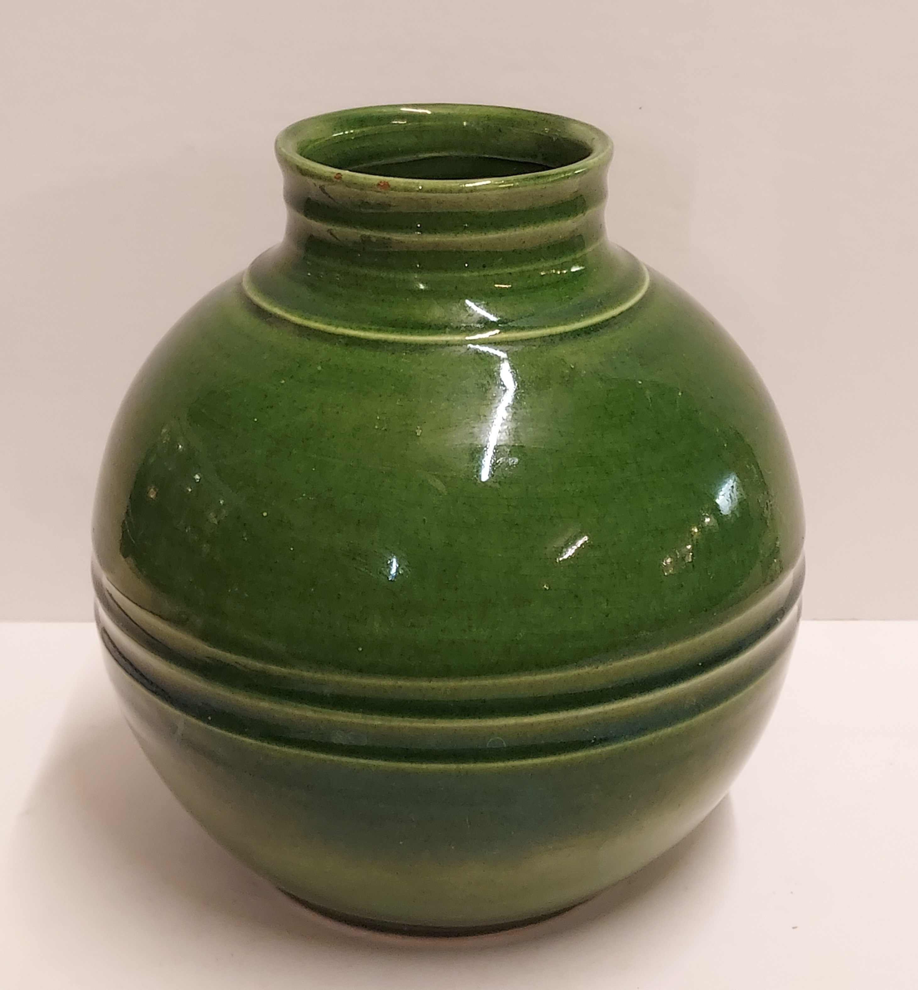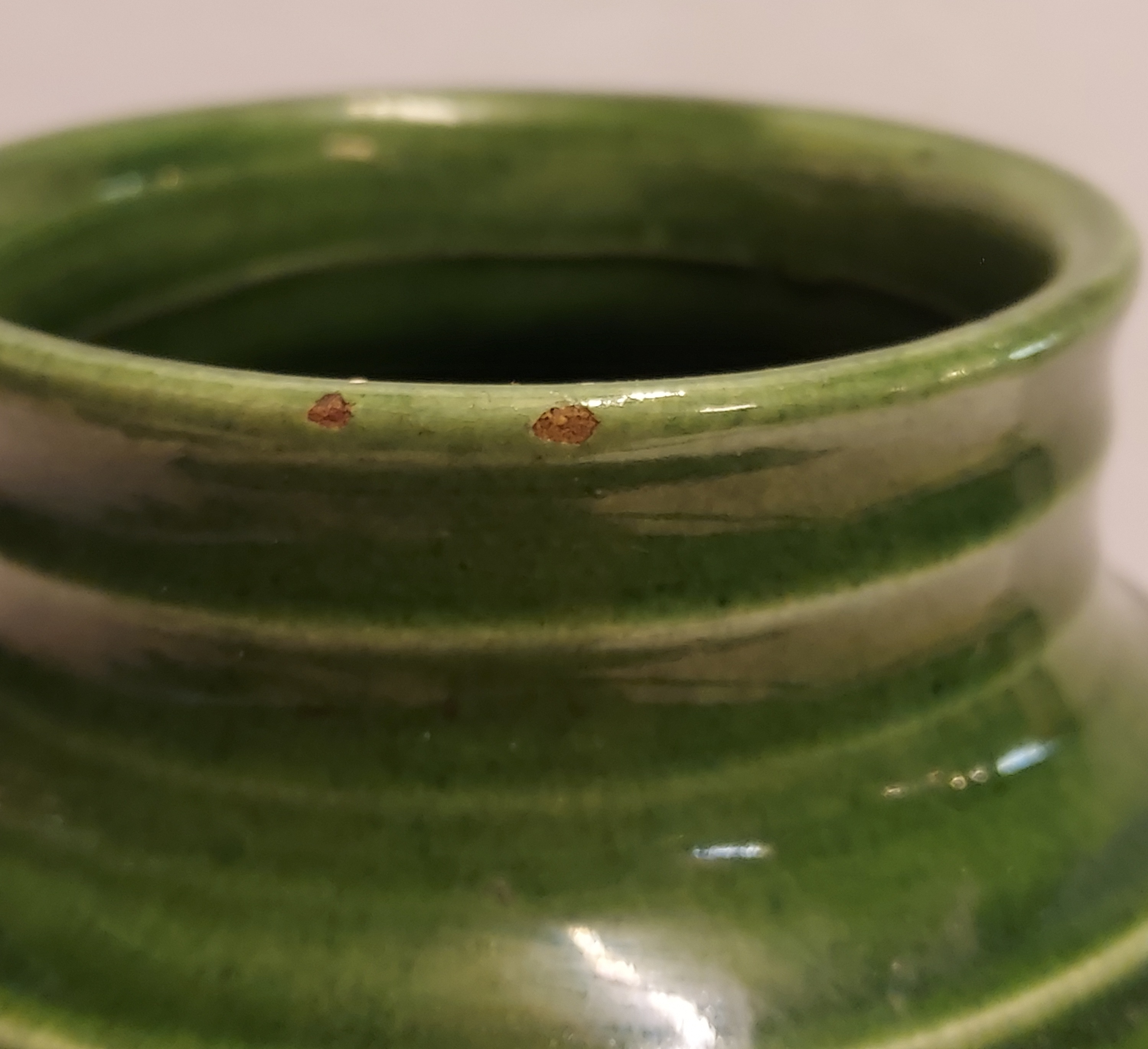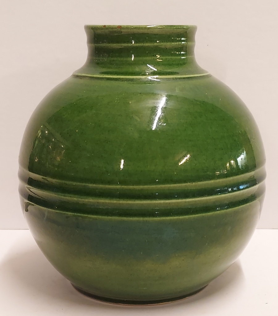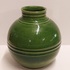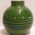 Jarrón de cerámica con bandas en el cuello y vientre con esmalte verde campesino. Parte inferior marcada con WENCO (Wortelboer En Co) y número de modelo 402. Realizado en ADCO en Groningen.