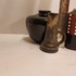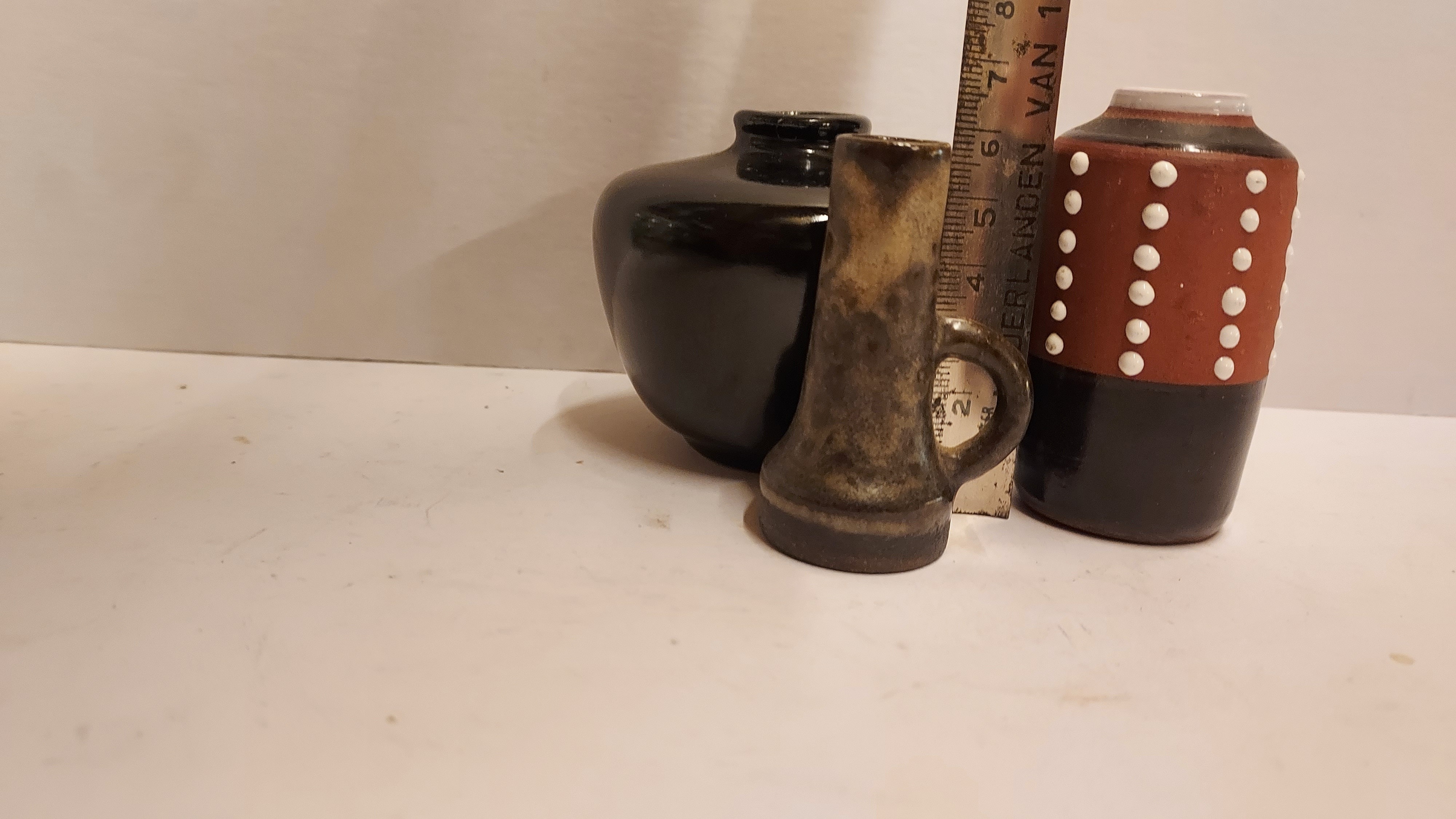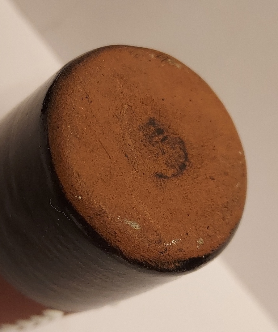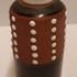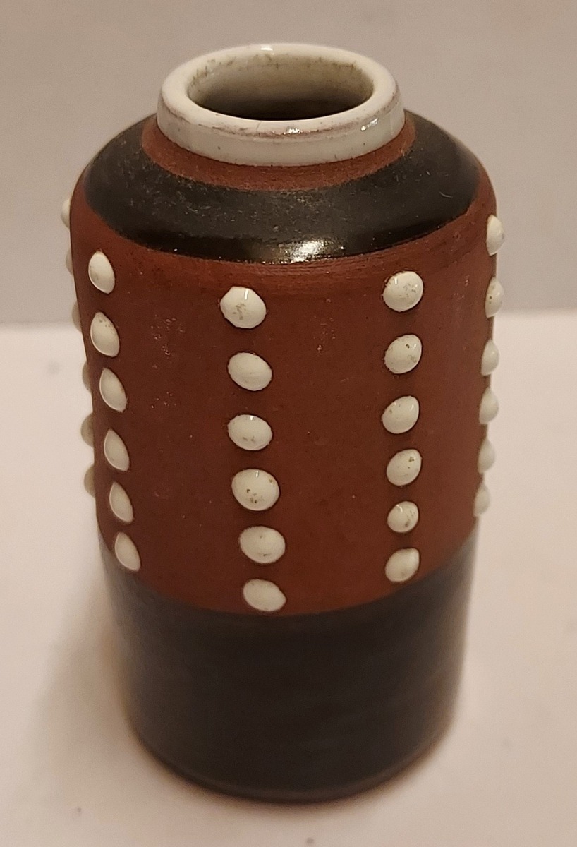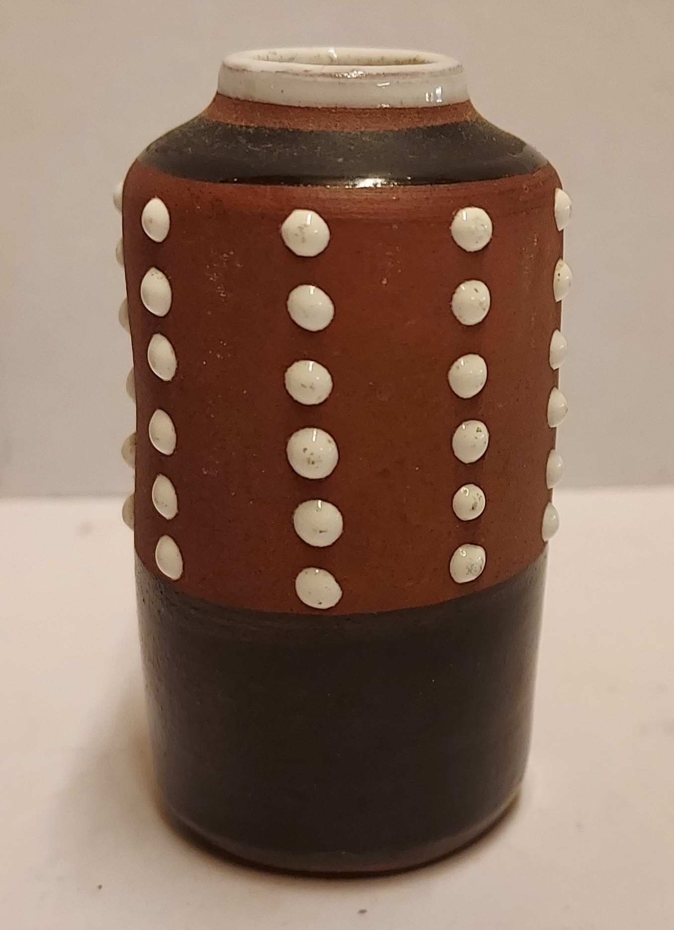 Forma cilíndrica con esmalte parcialmente negro y decoración de puntos blancos. No firmado.
