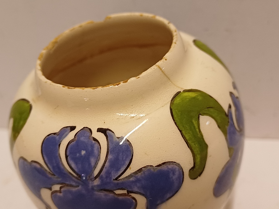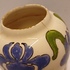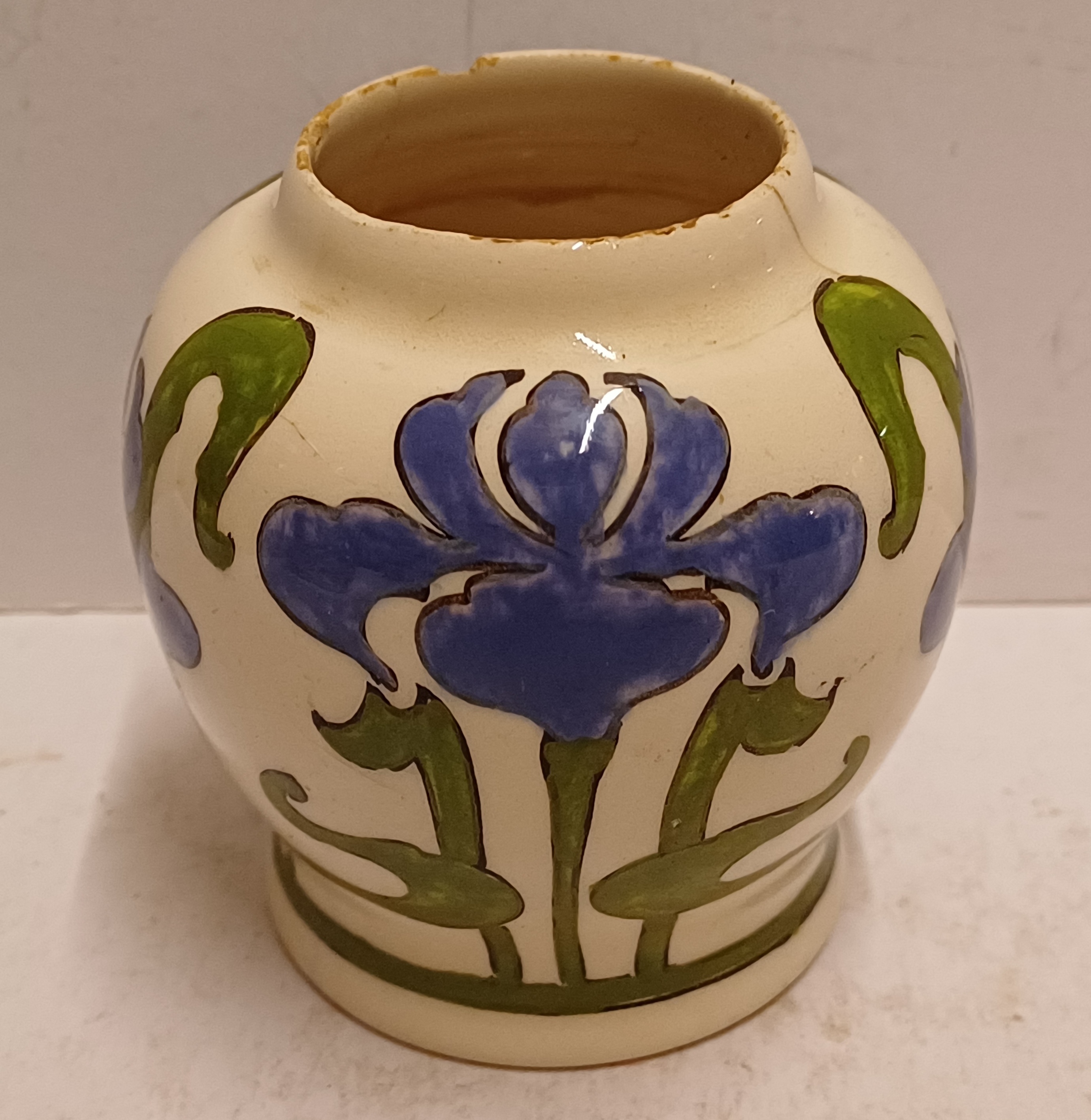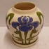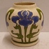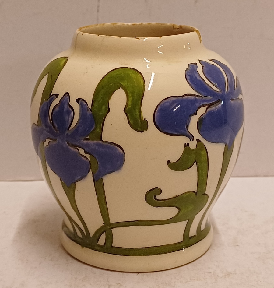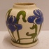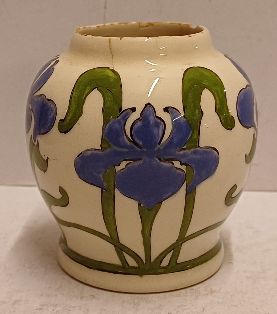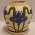 gegoten aardwerken vaasje met gestileerd decor van irissen op crme fond. Onderzijde met gestempeld fabrieksmerk.