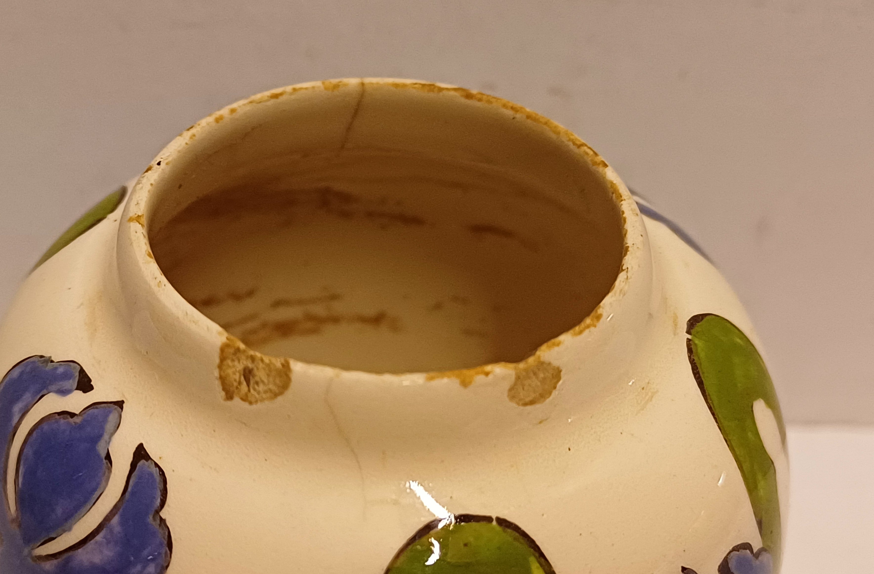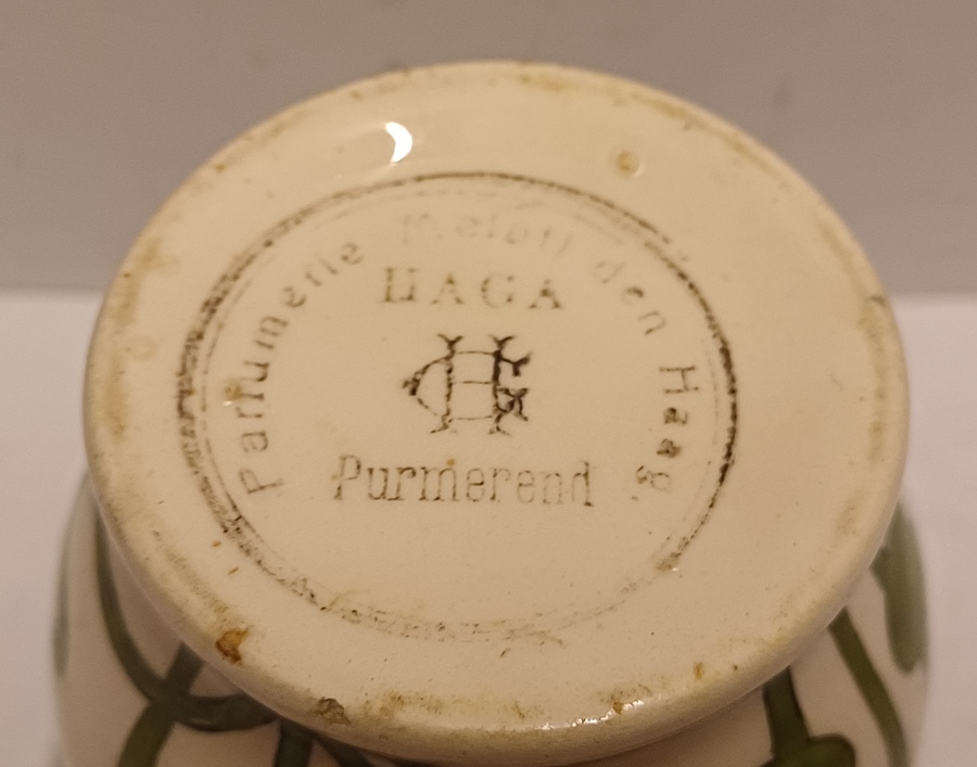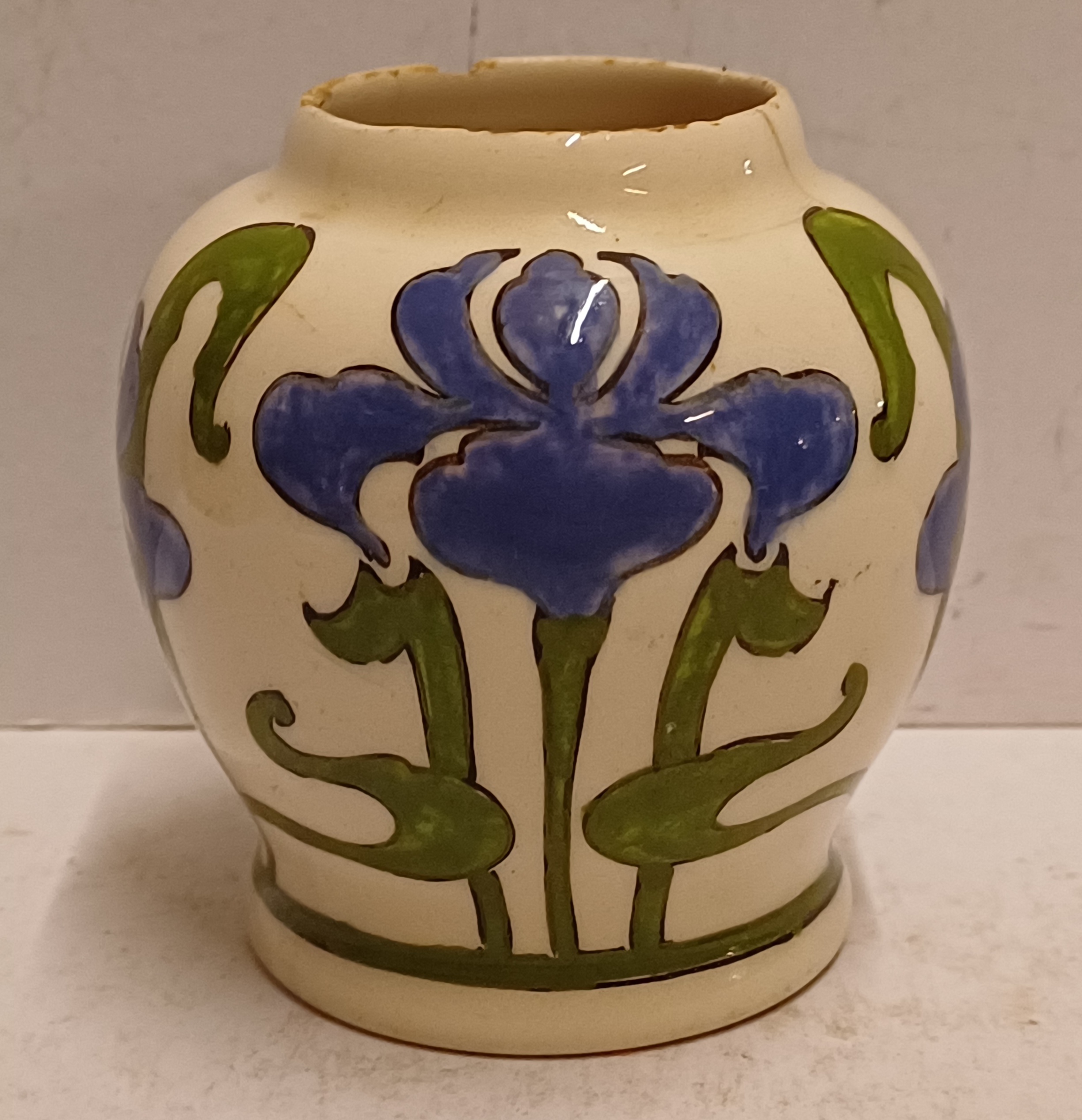 gegoten aardwerken vaasje met gestileerd decor van irissen op crme fond. Onderzijde met gestempeld fabrieksmerk.