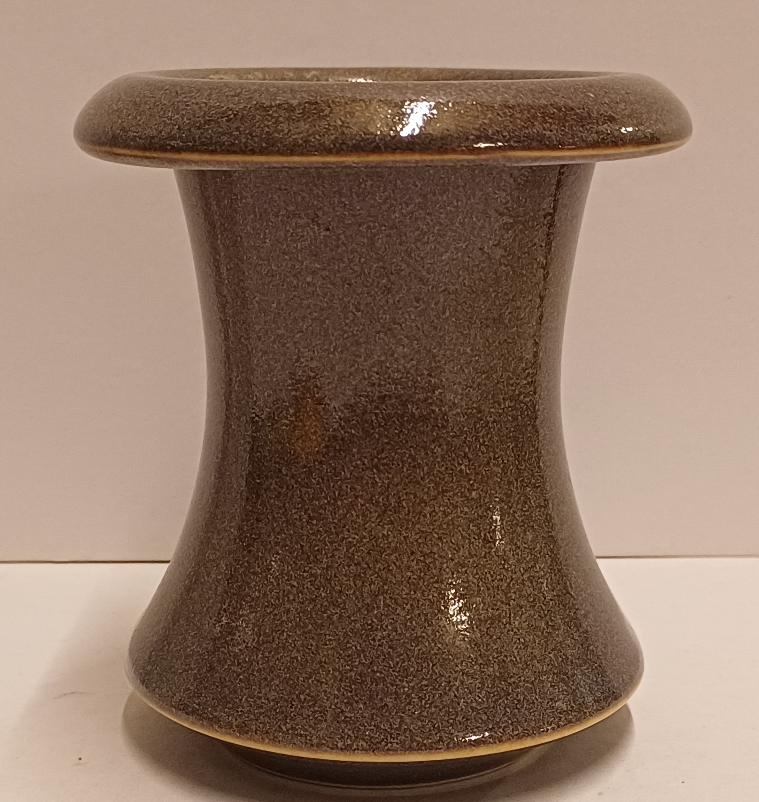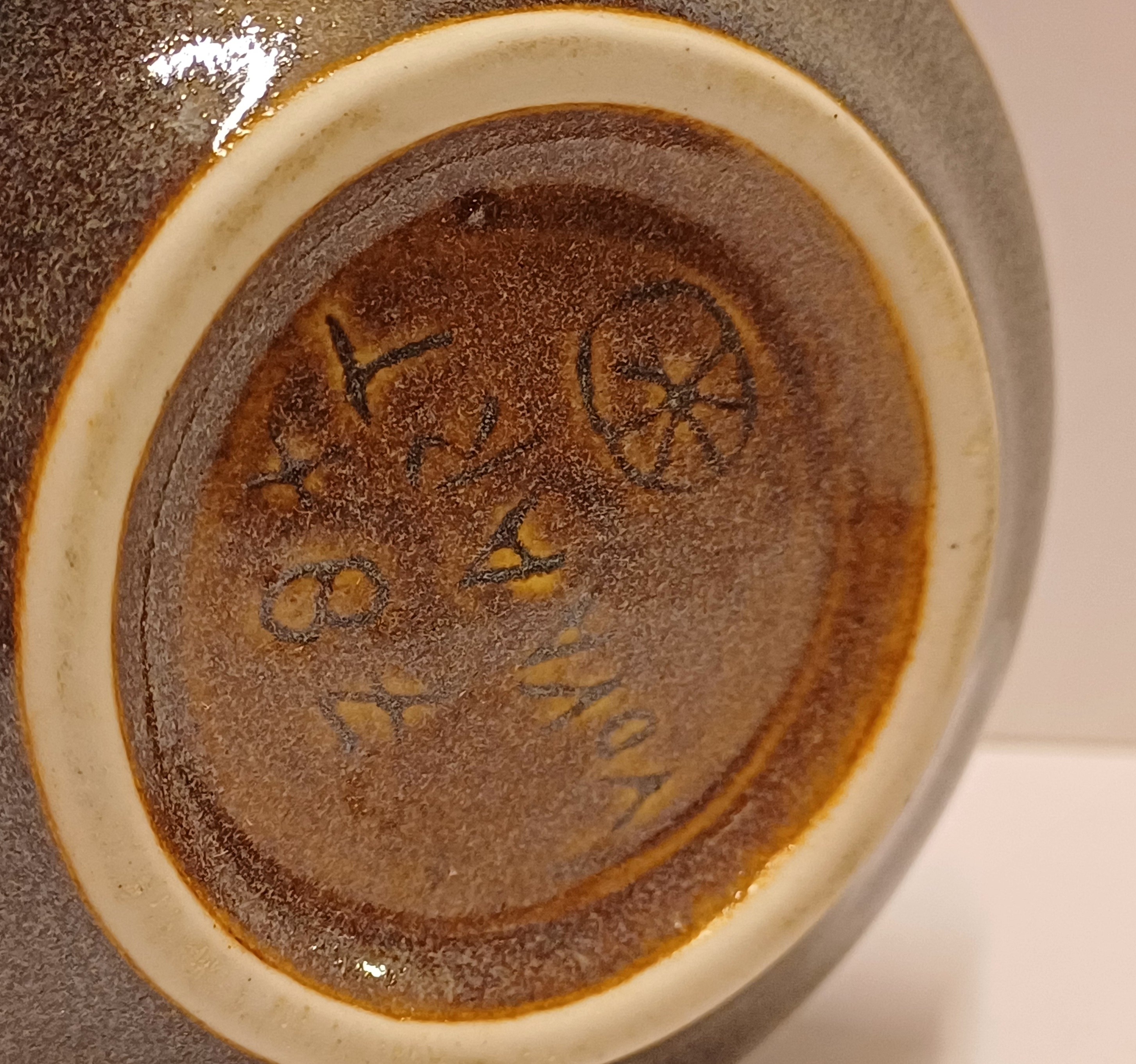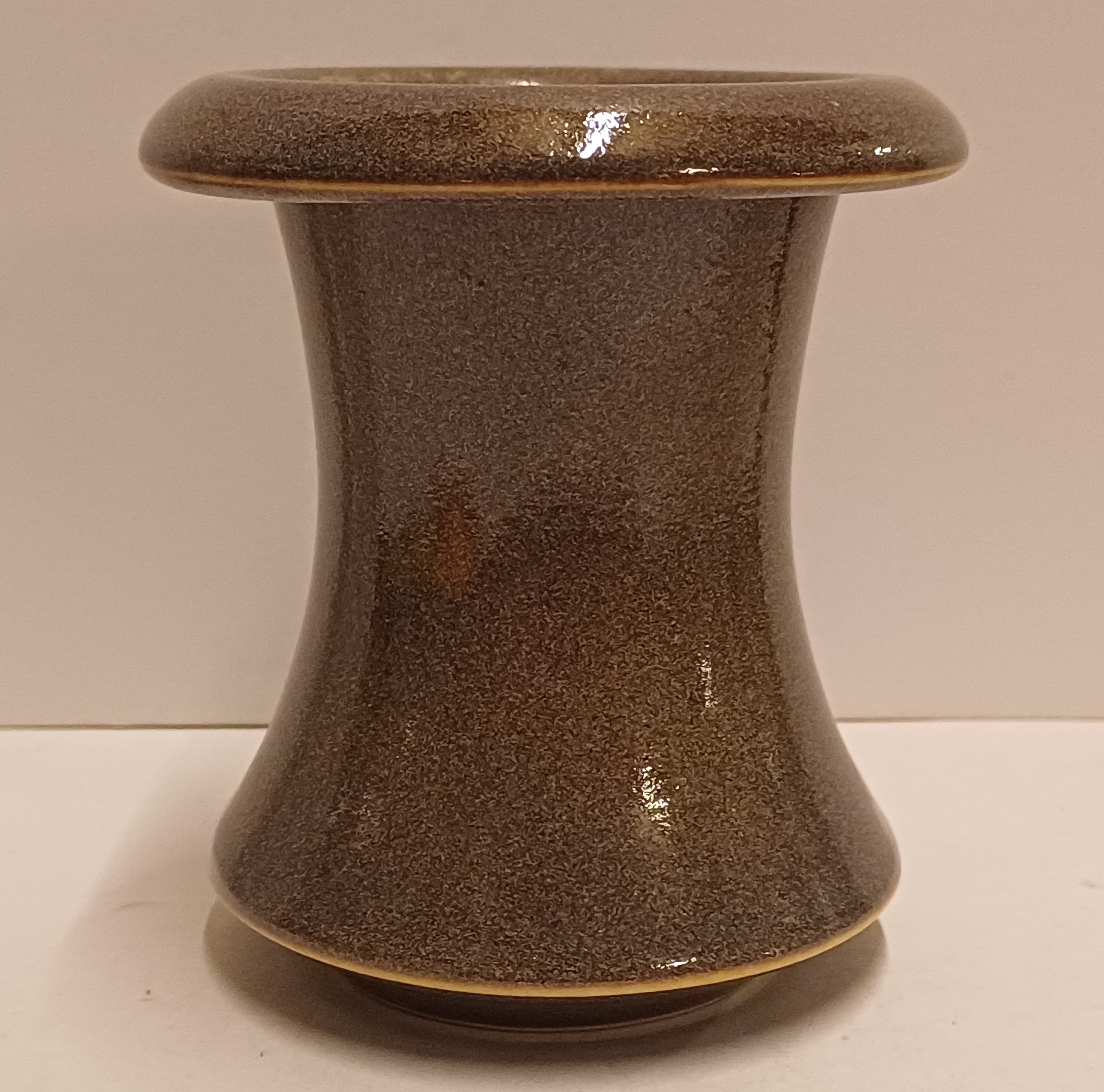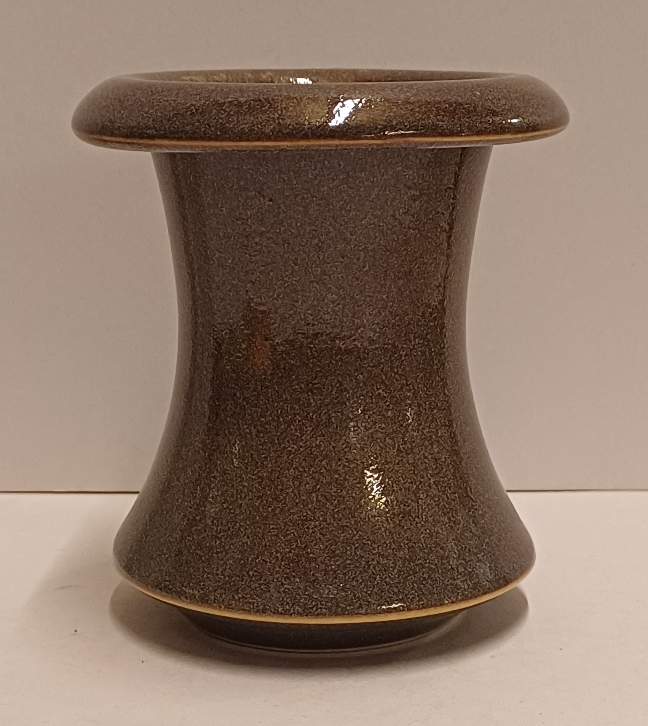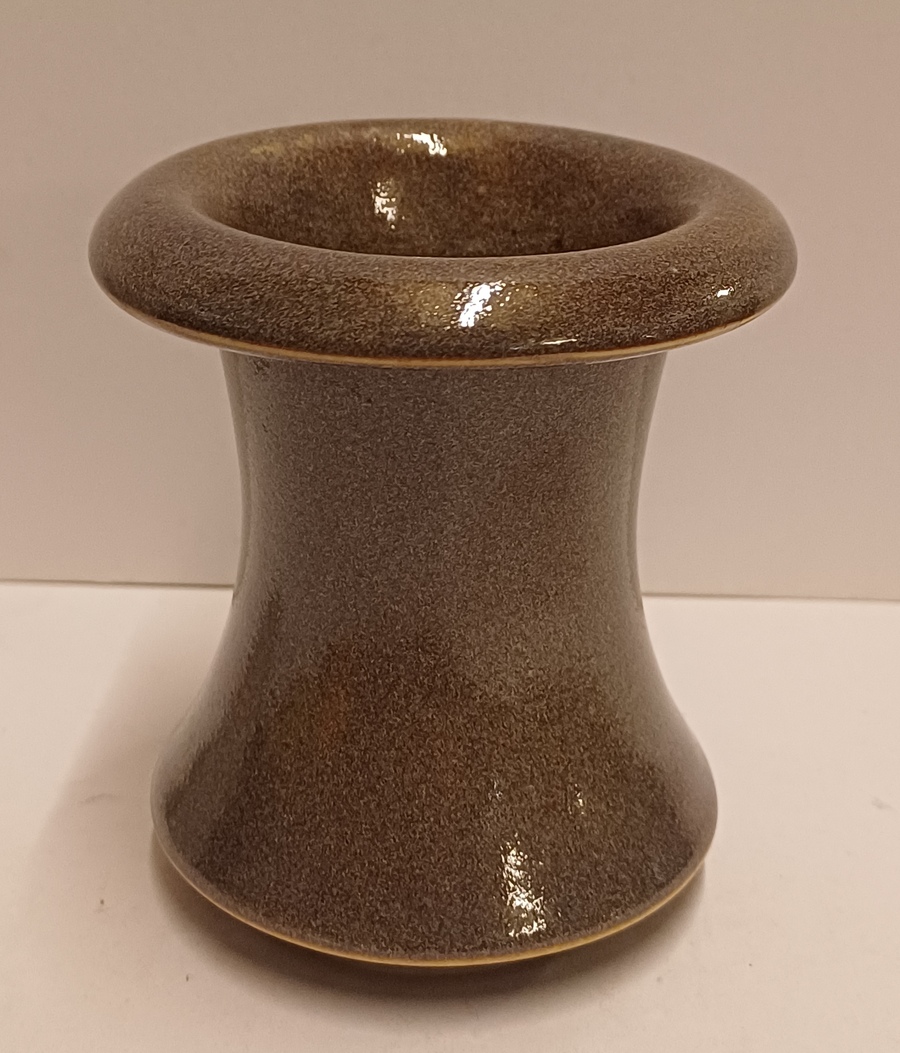 Diabolo vaasje met grijze licht gevlekte glazuur. Onderzijde met levenswiel en signatuur.
