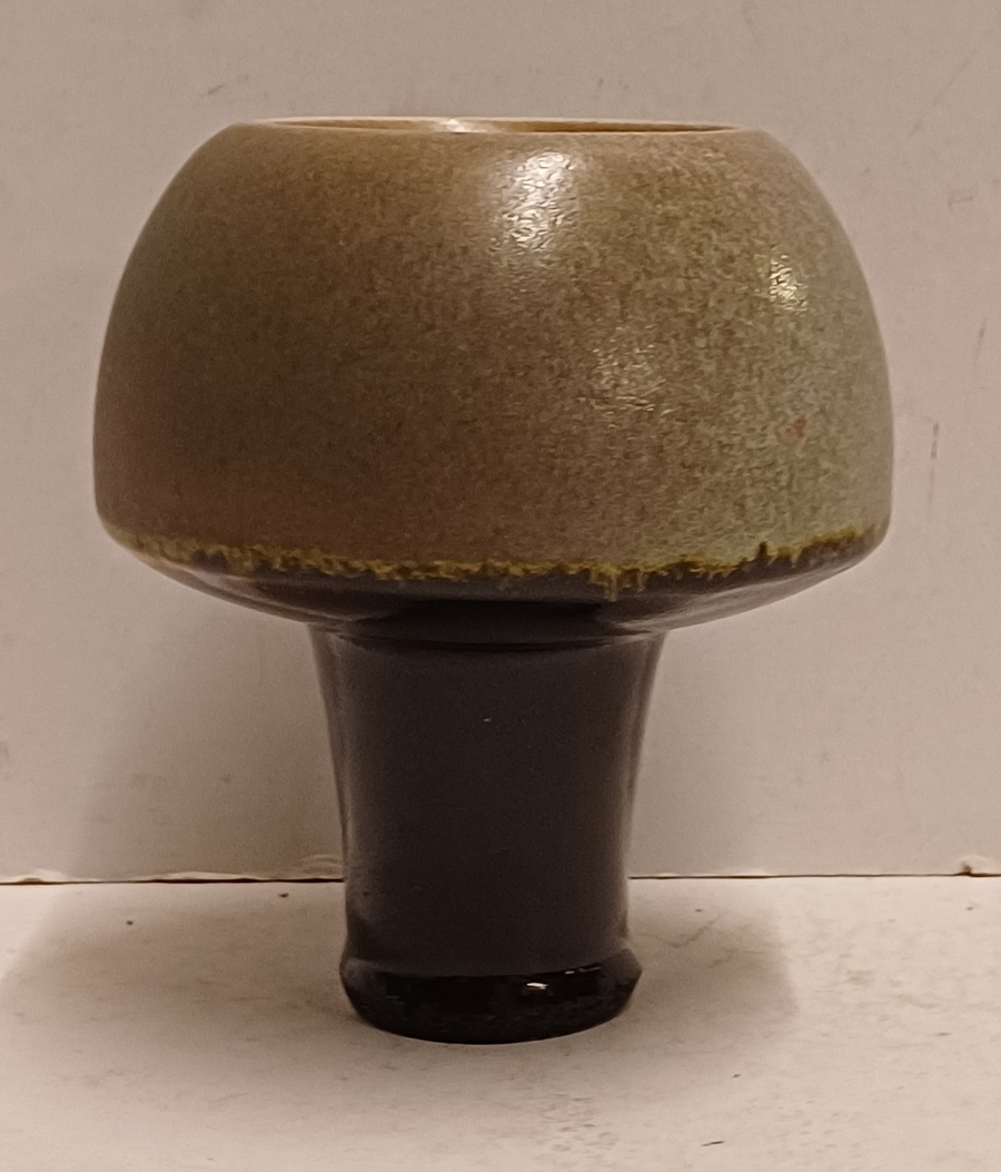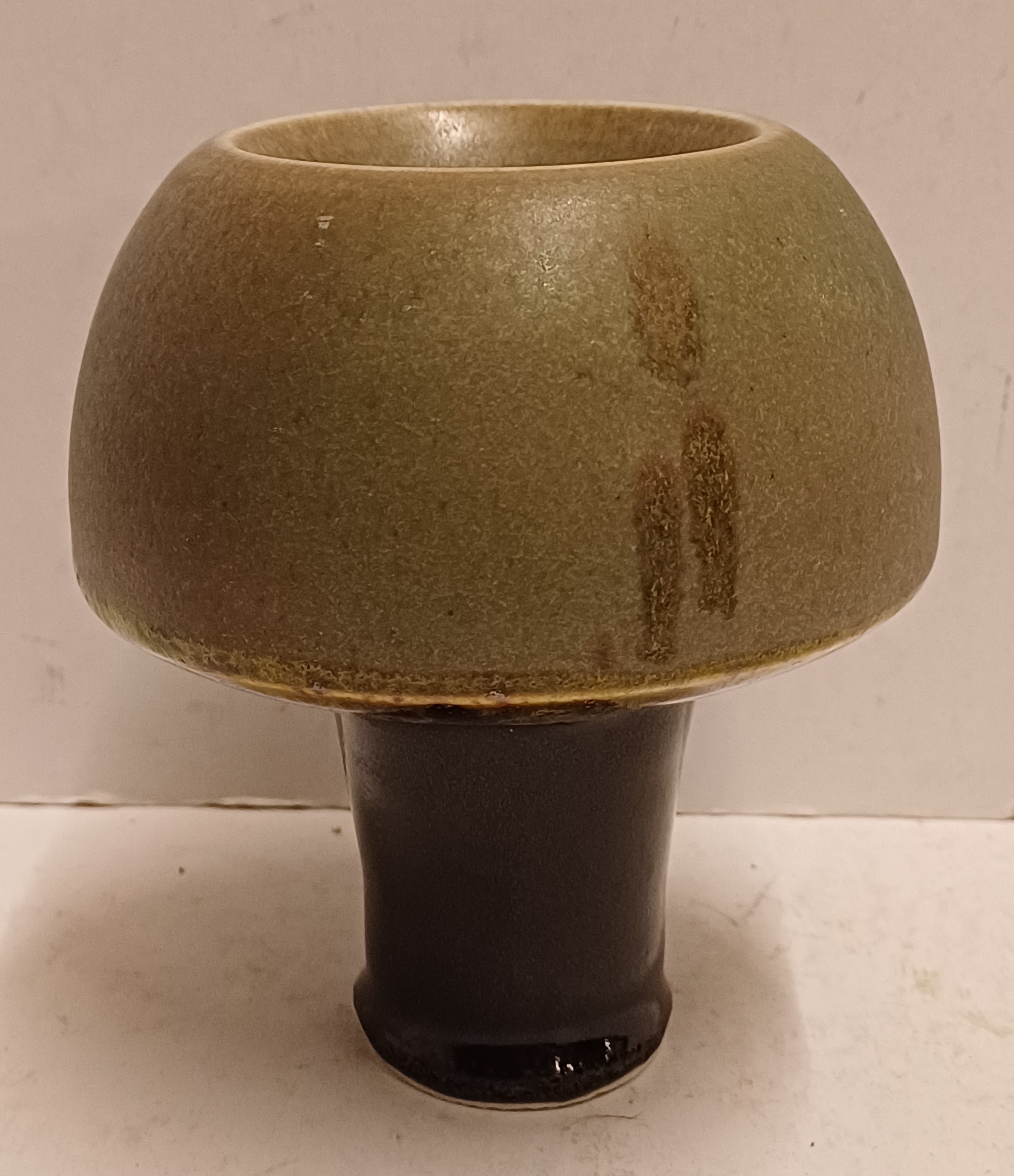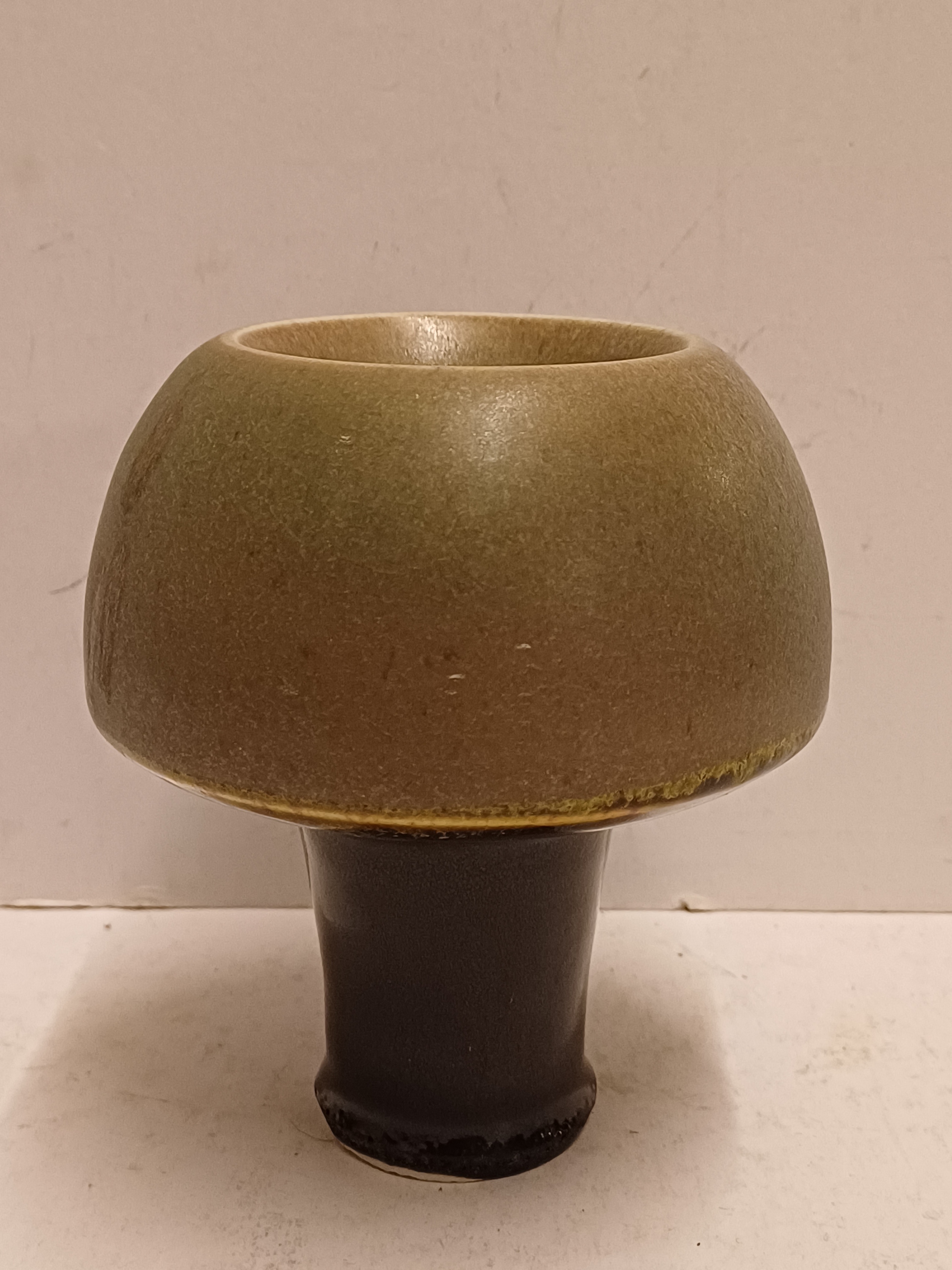 Jarrón de gres en forma de seta con la parte superior esmaltada en verde y el tallo negro. Parte inferior firmada.
