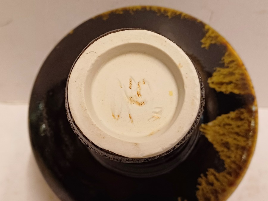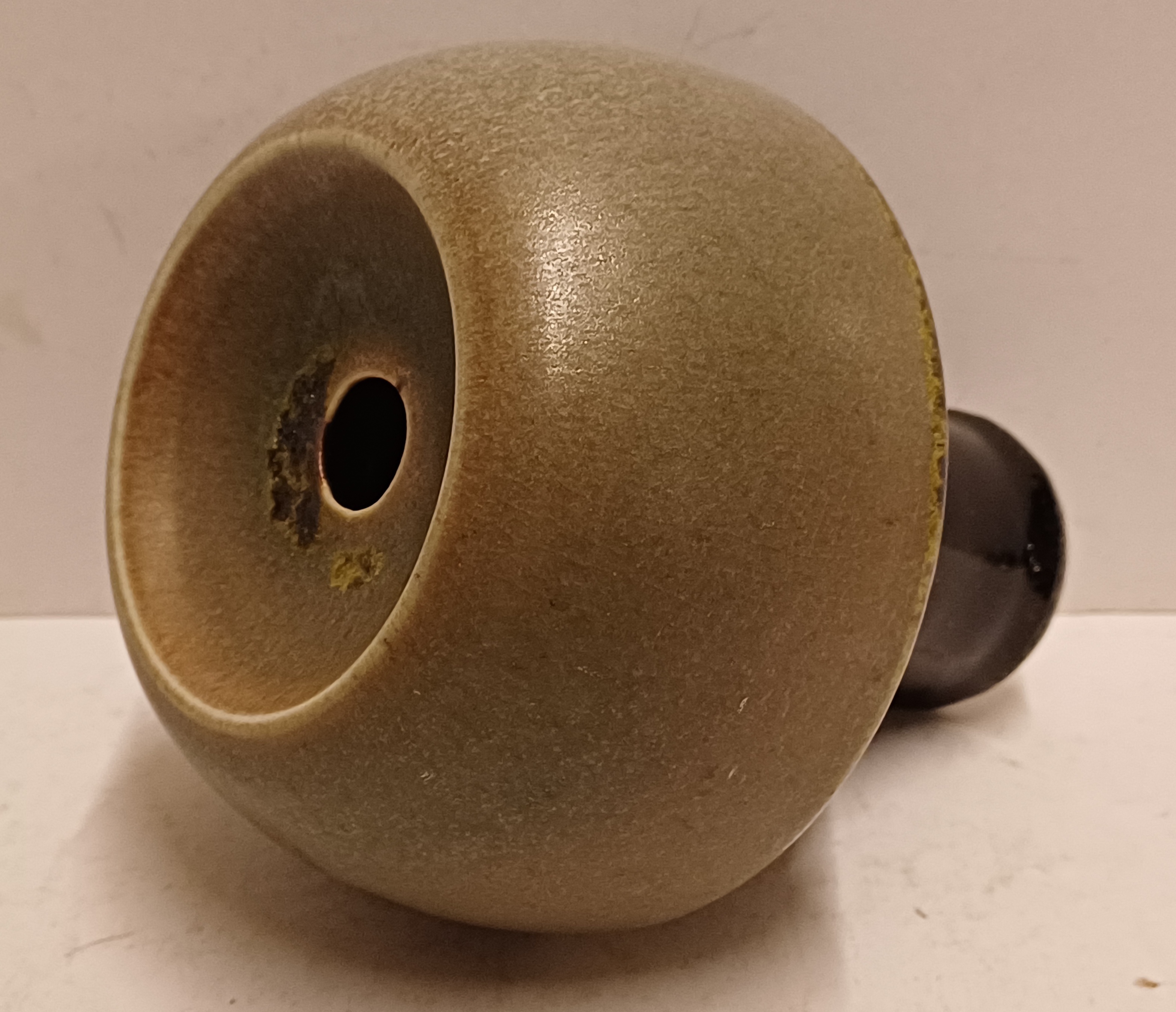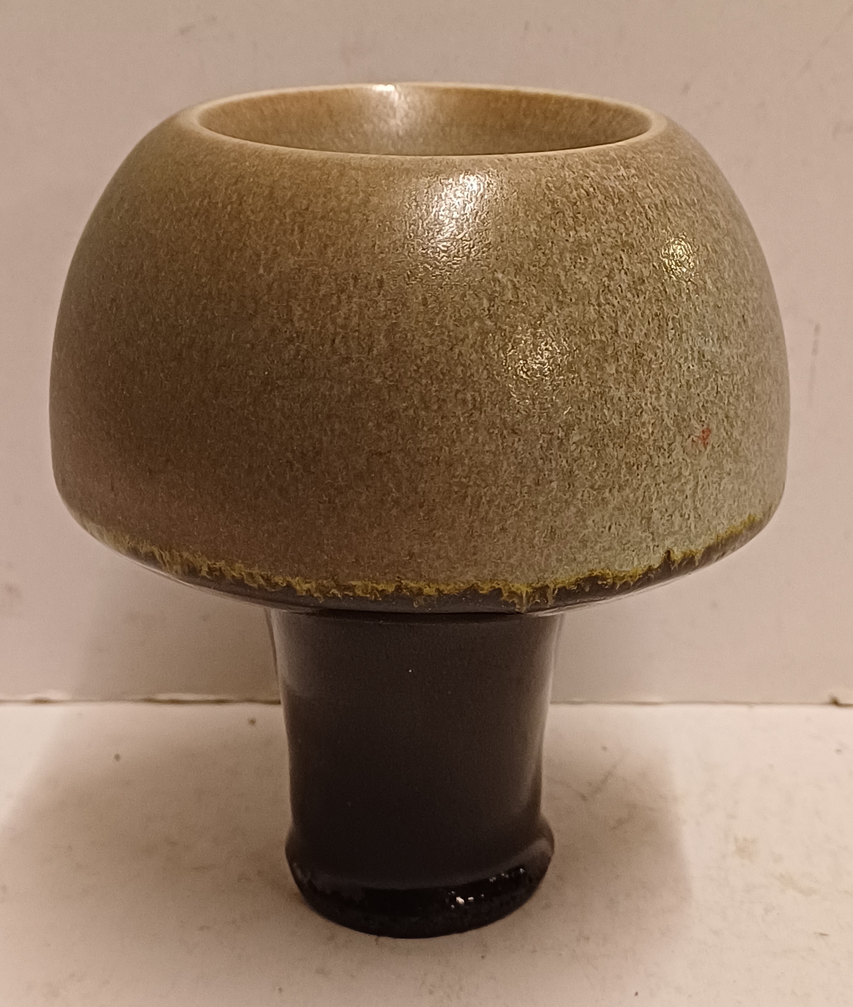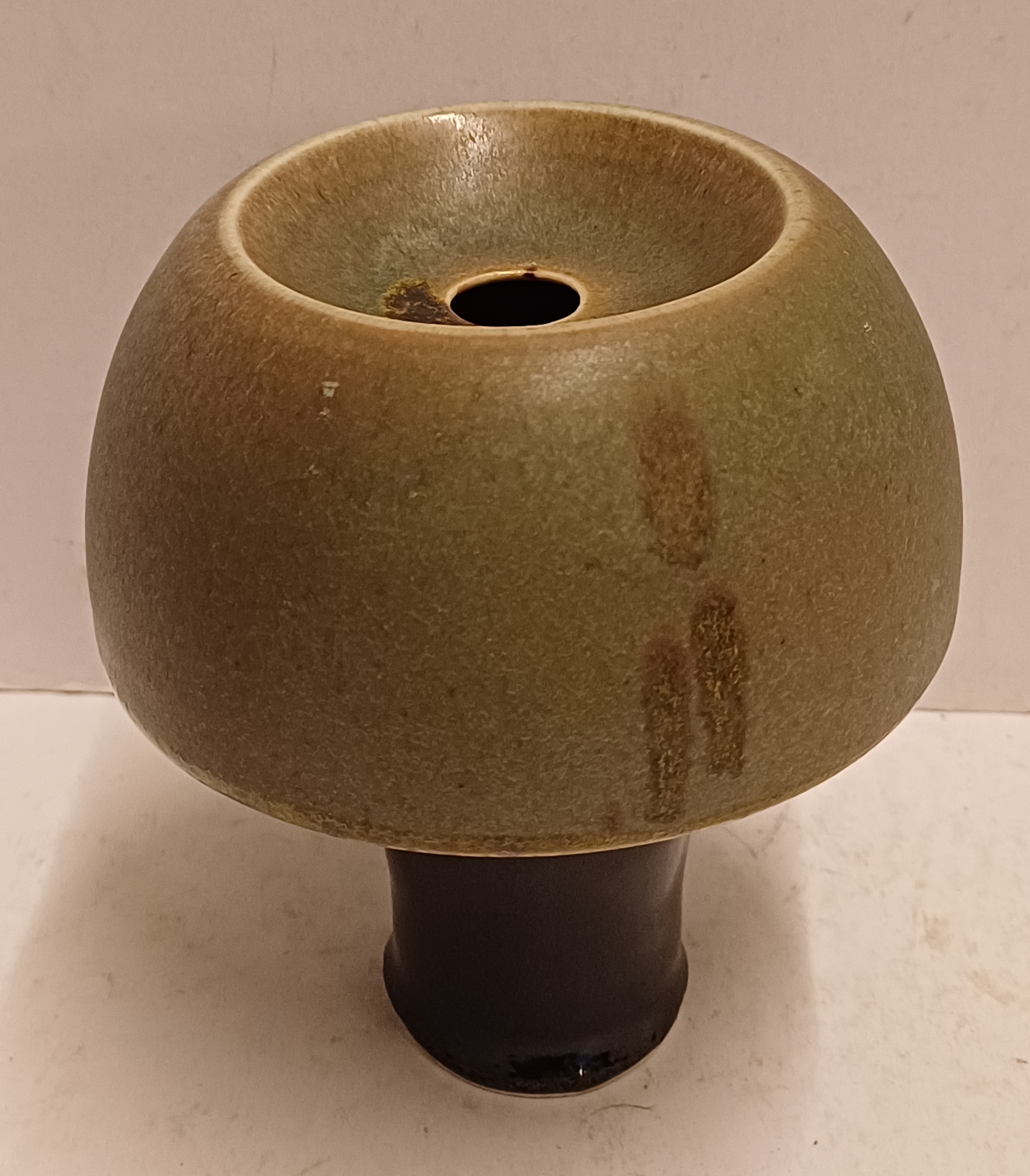 Jarrón de gres en forma de seta con la parte superior esmaltada en verde y el tallo negro. Parte inferior firmada.