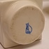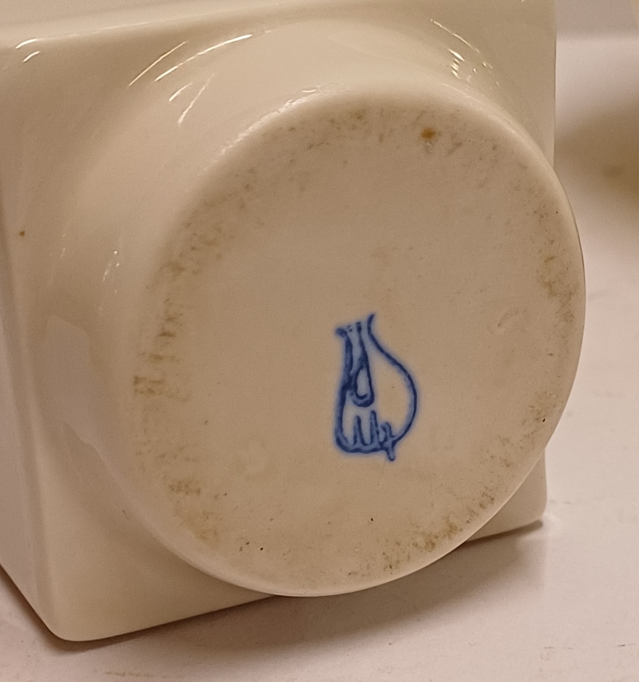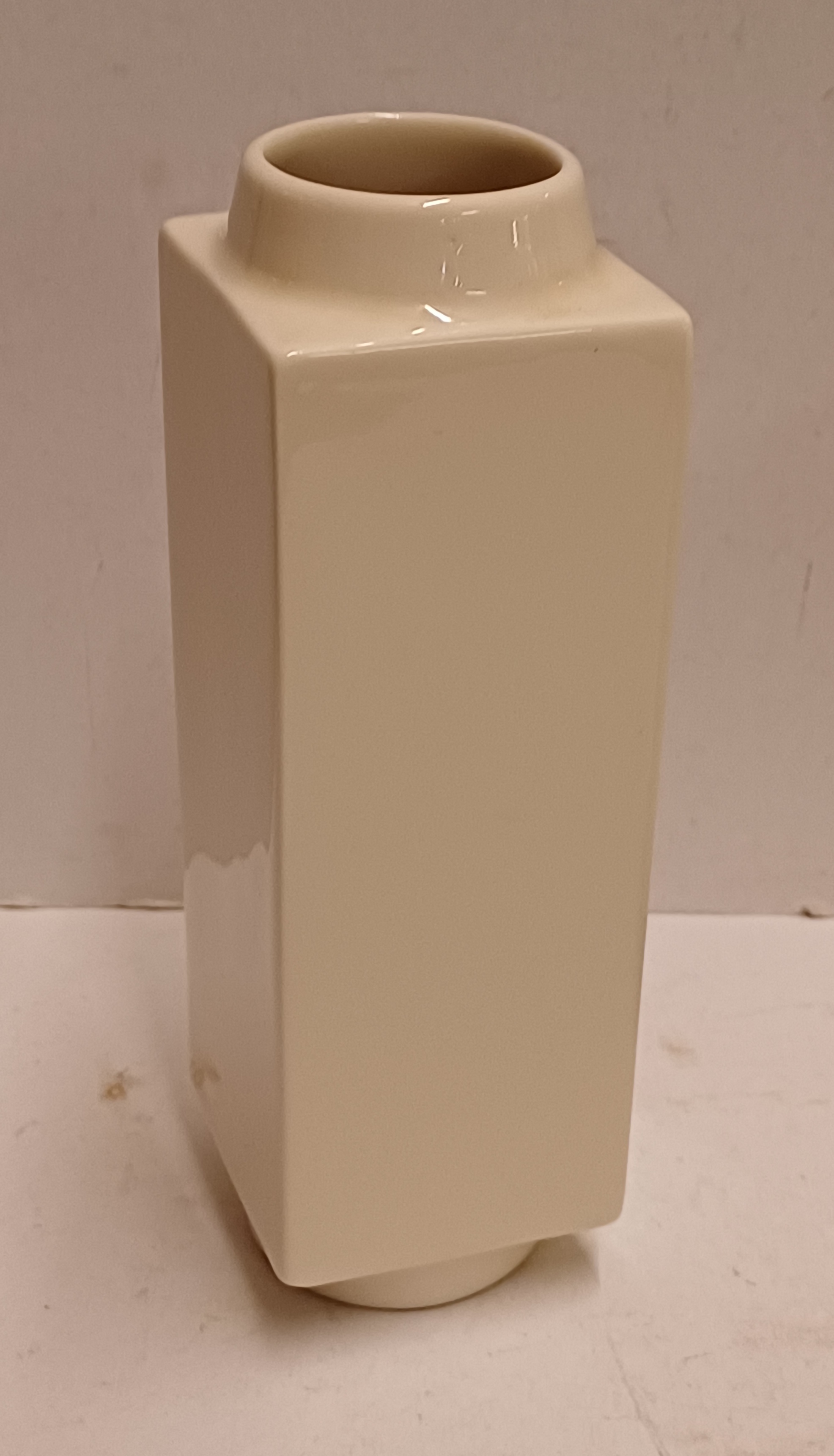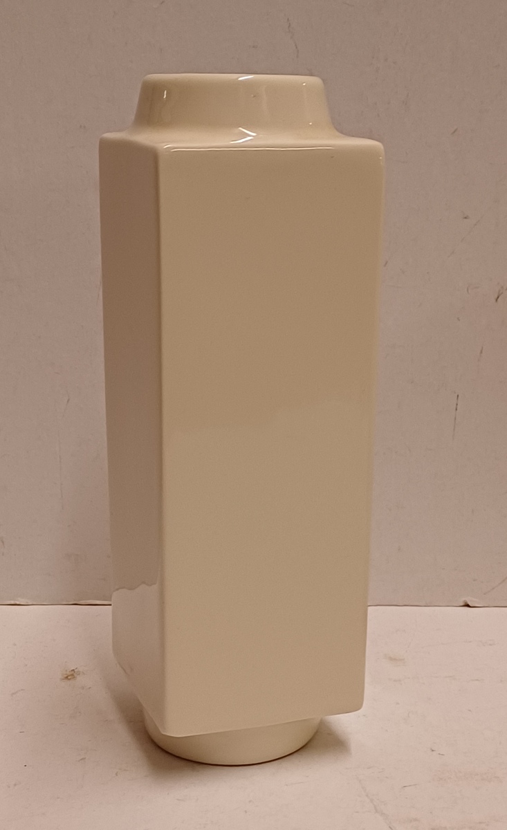 Vierkante witte blokvaas met transparante glazuur. Onderzijde met fabrieksmerk. Ontwerp Han Knaap