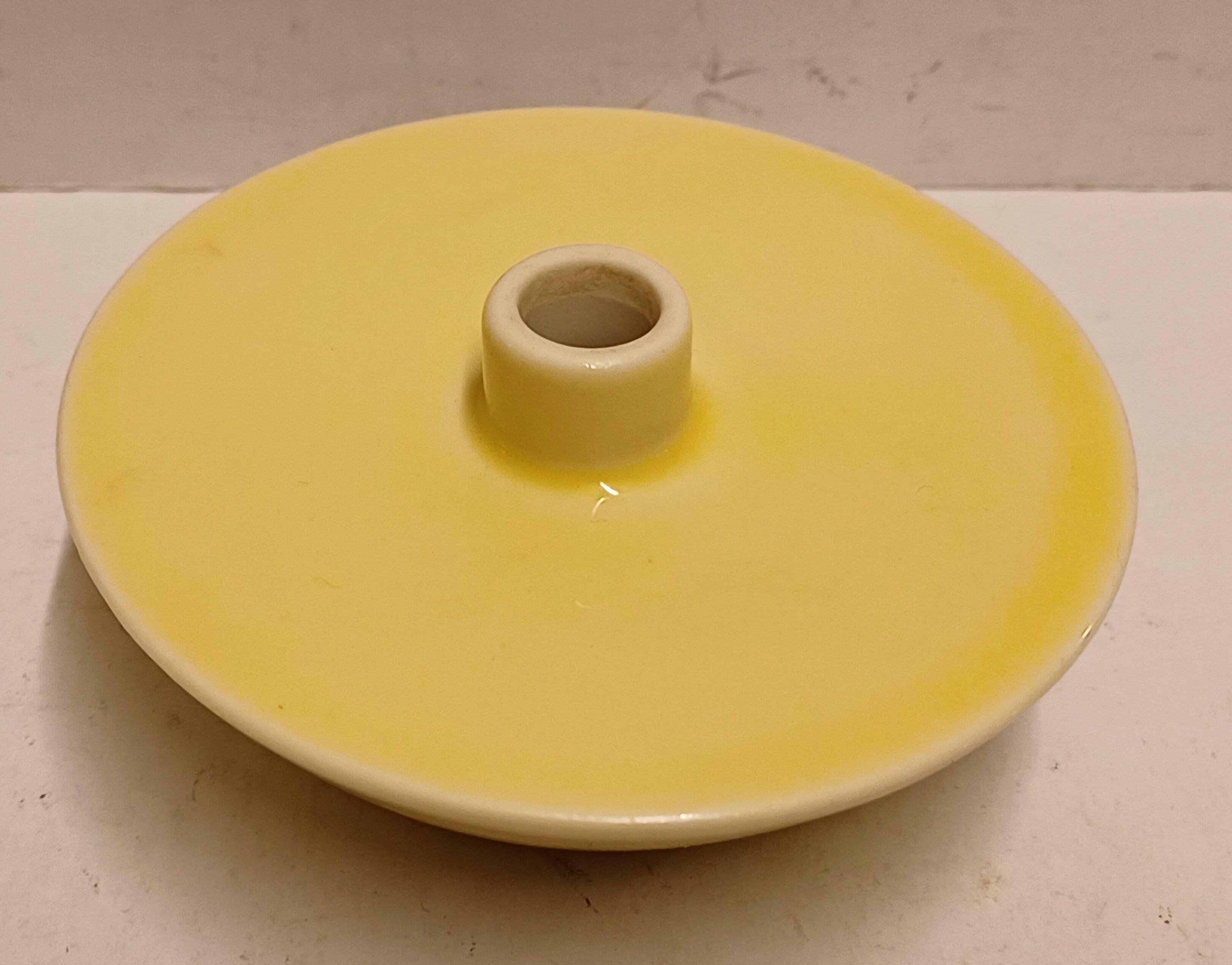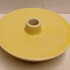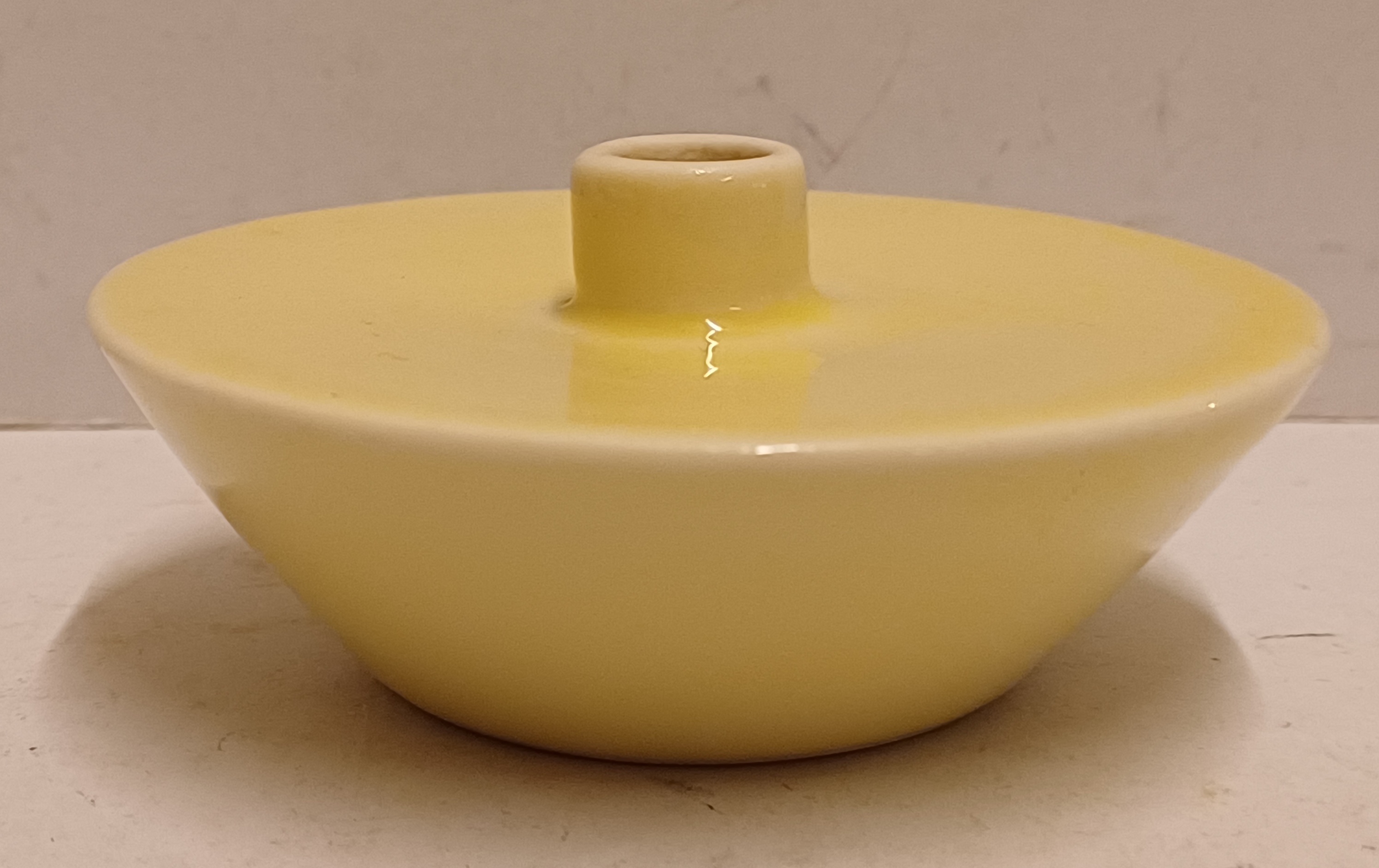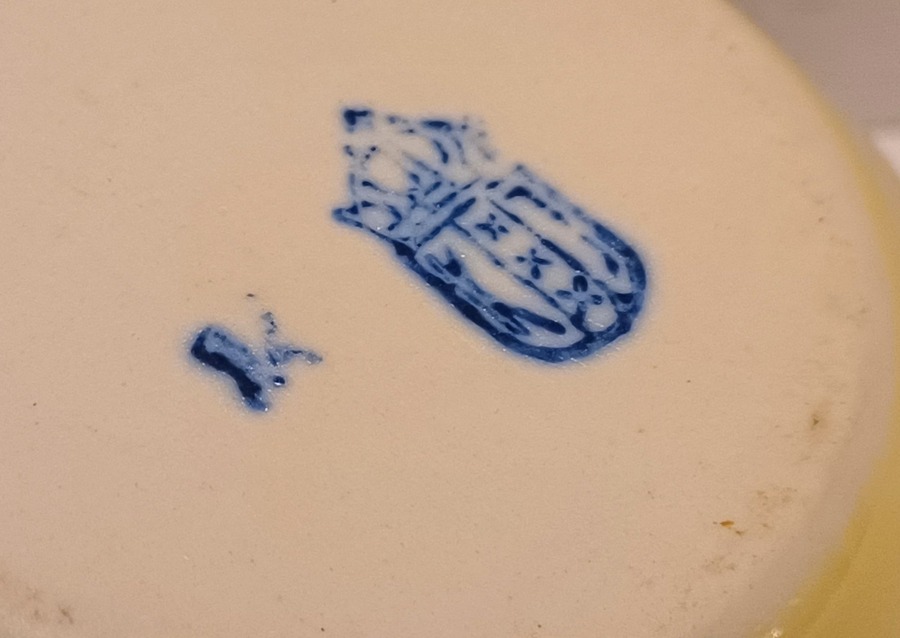 Vaasje met gele glazuur en witte binnenzijde. Onderzijde met K en Amsterdams wapenschild merk.