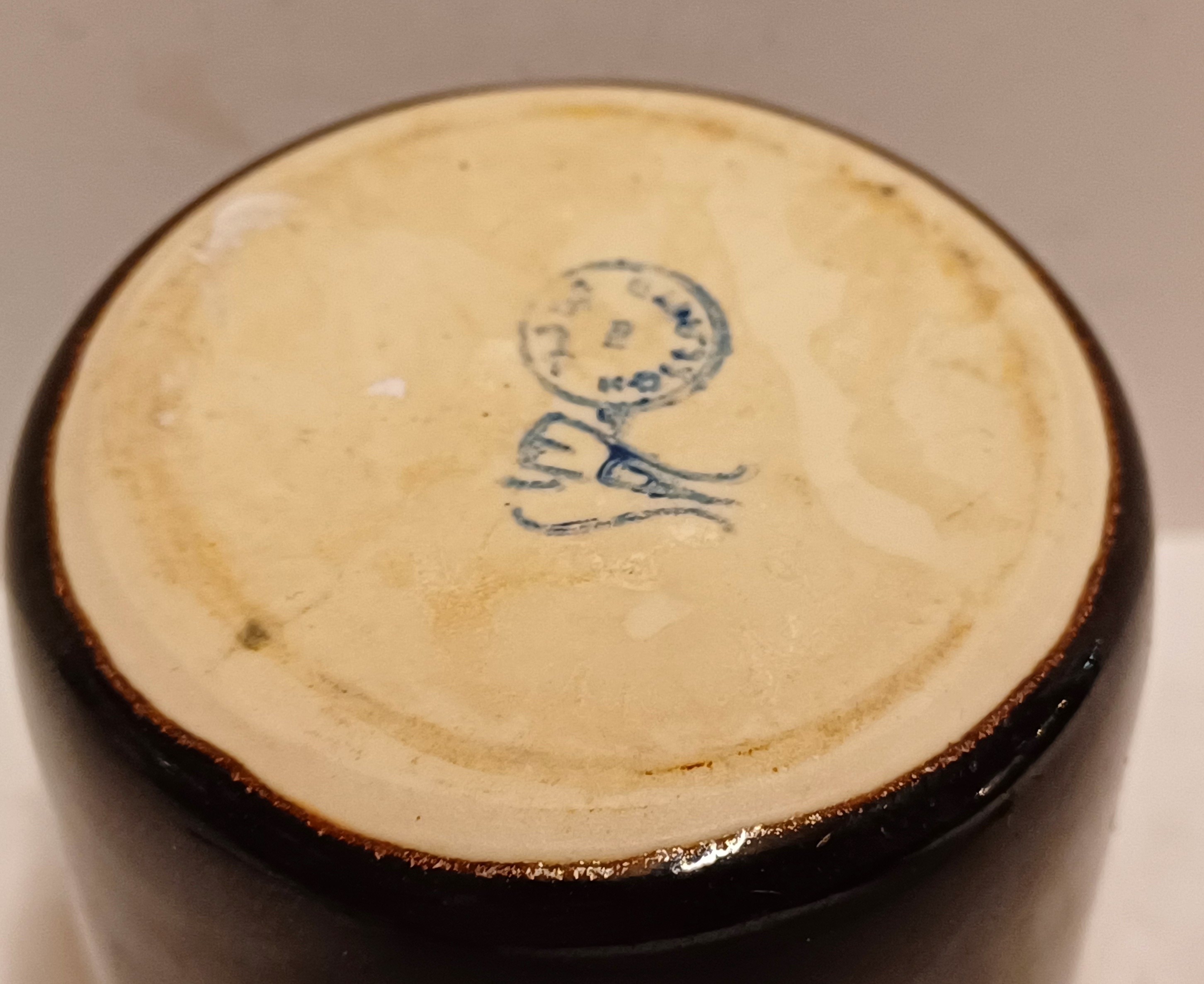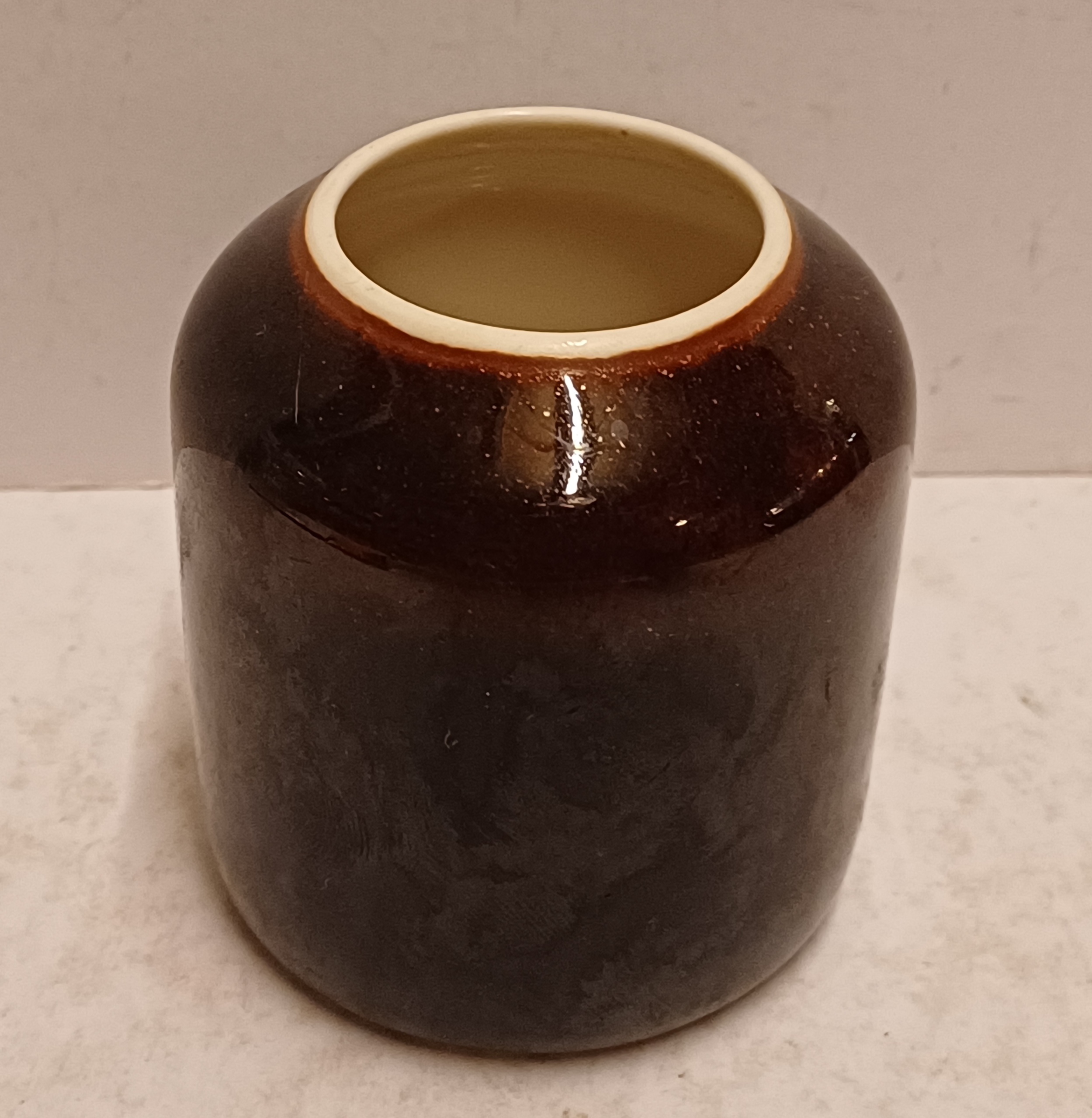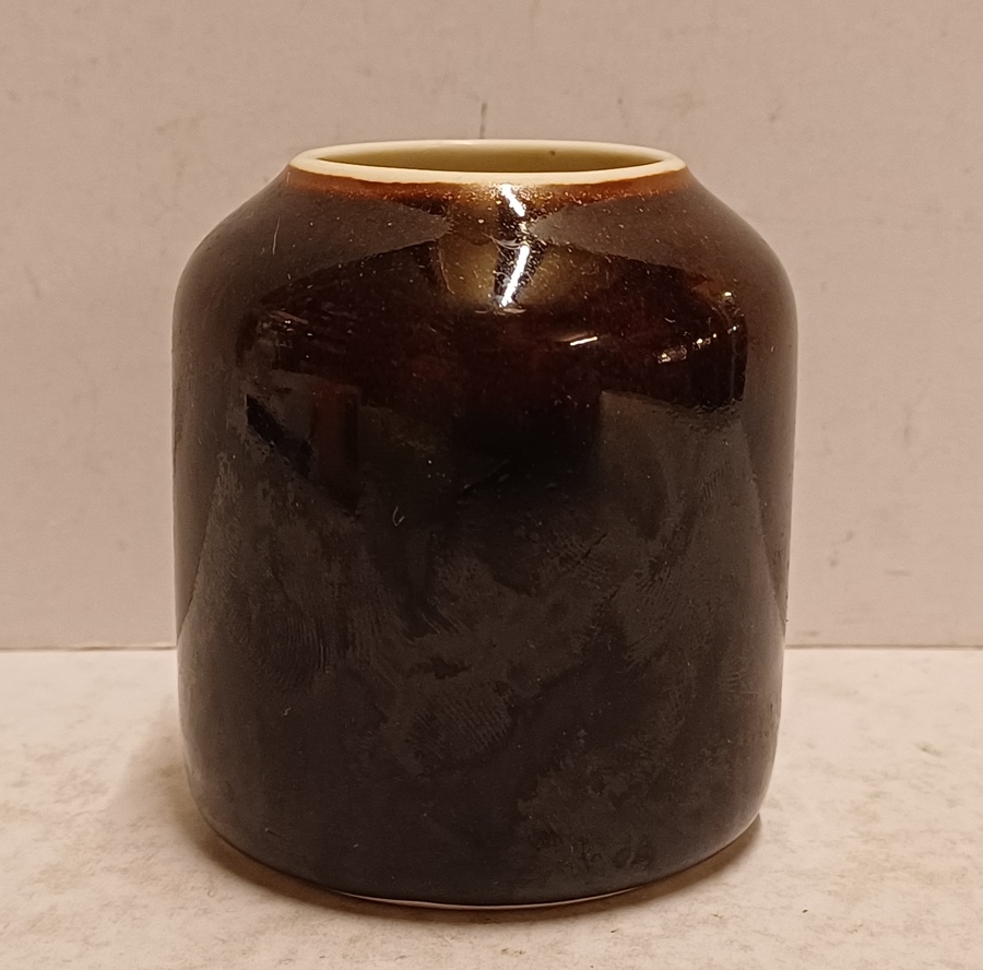 Wit porseleinen vaasje met bruine tenmoku glazuur. Ontwerp Han Knaap. Onderzijde met fabrieksmerk.