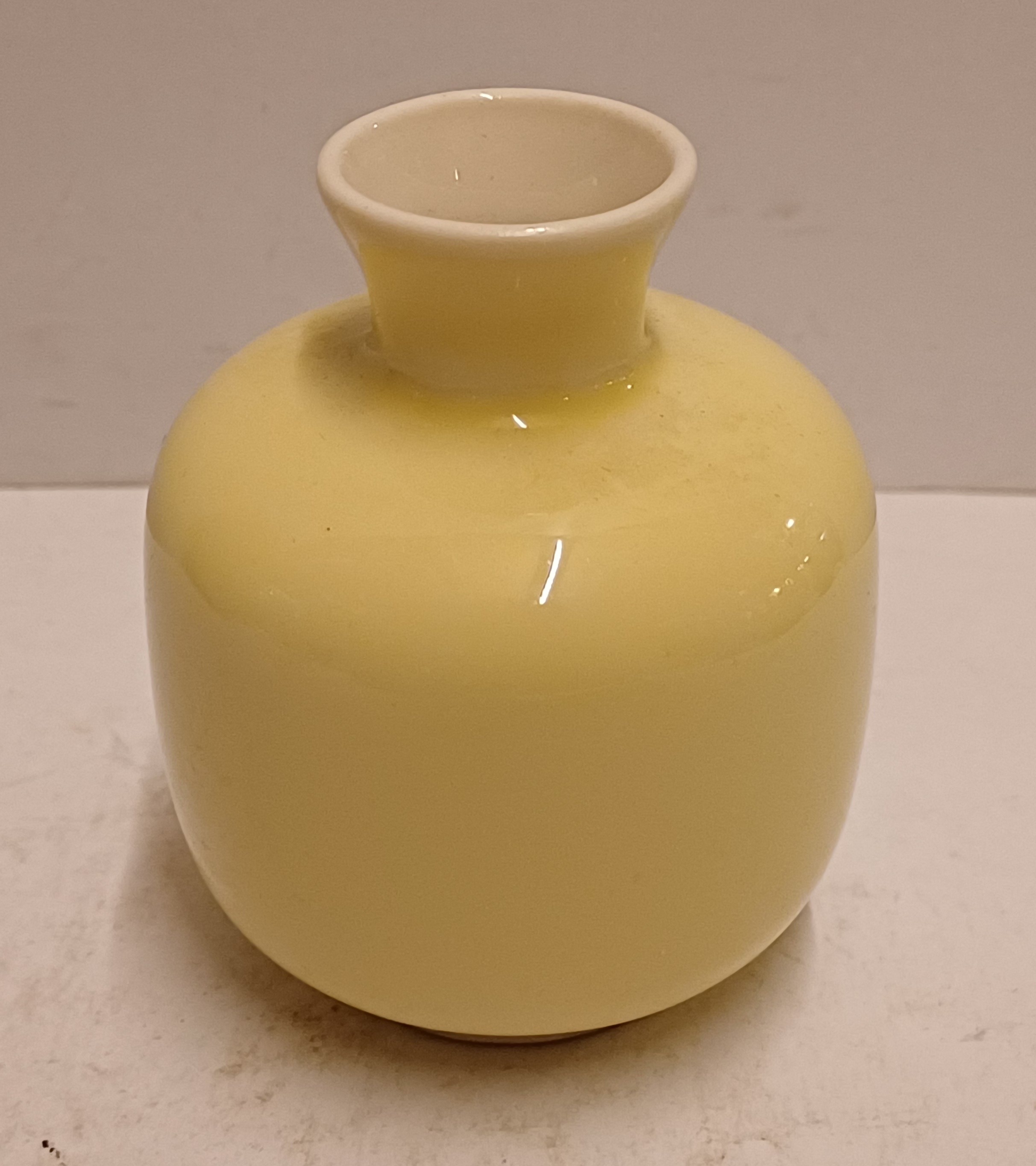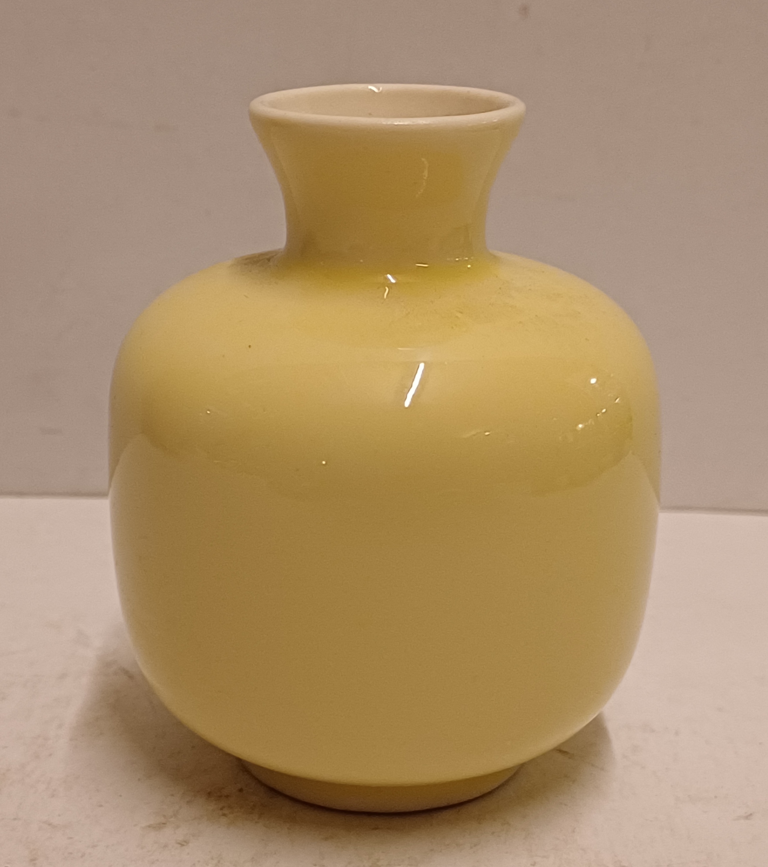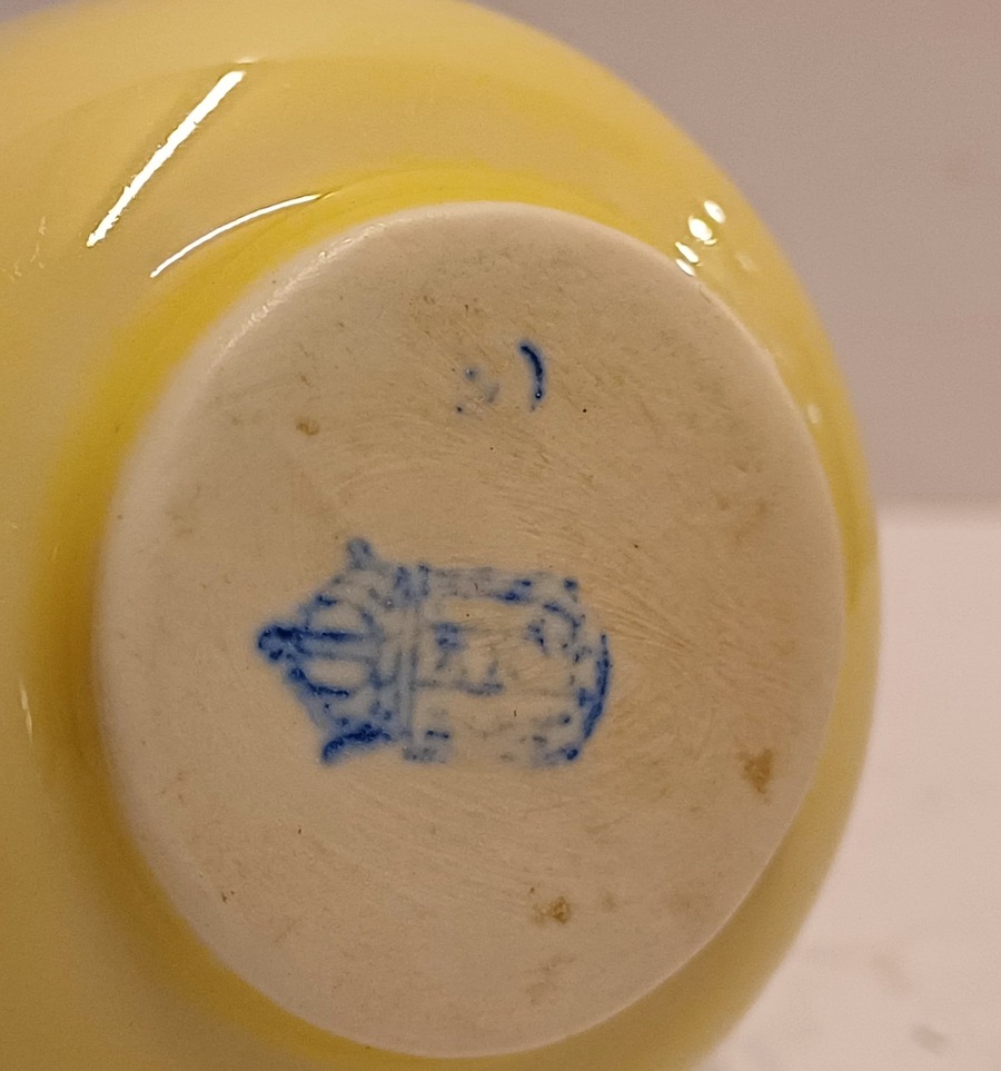 Jarrón de porcelana con esmalte amarillo suave. Parte inferior con el escudo de la ciudad de Amsterdam como marca.