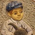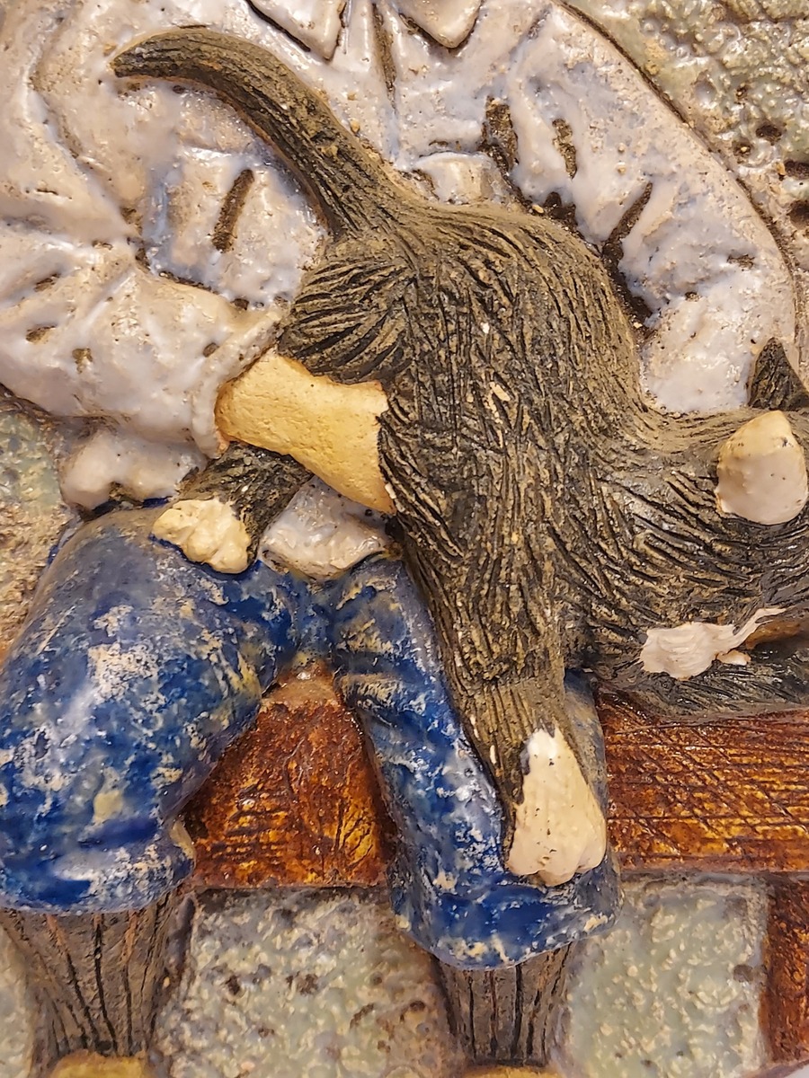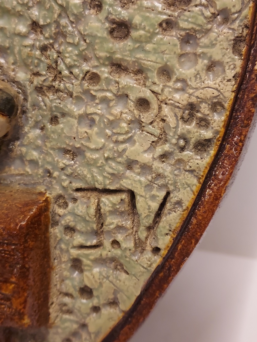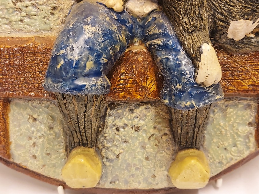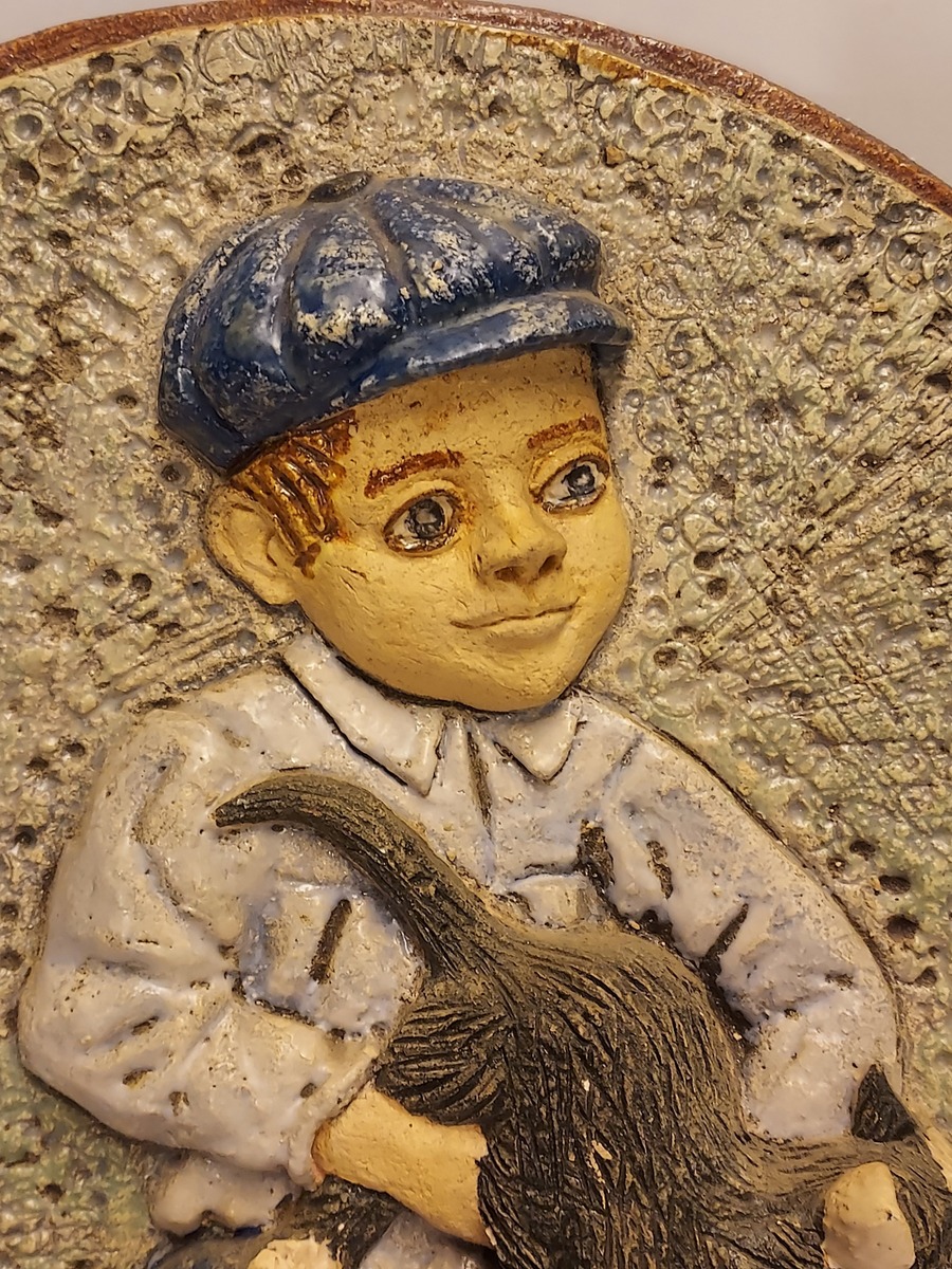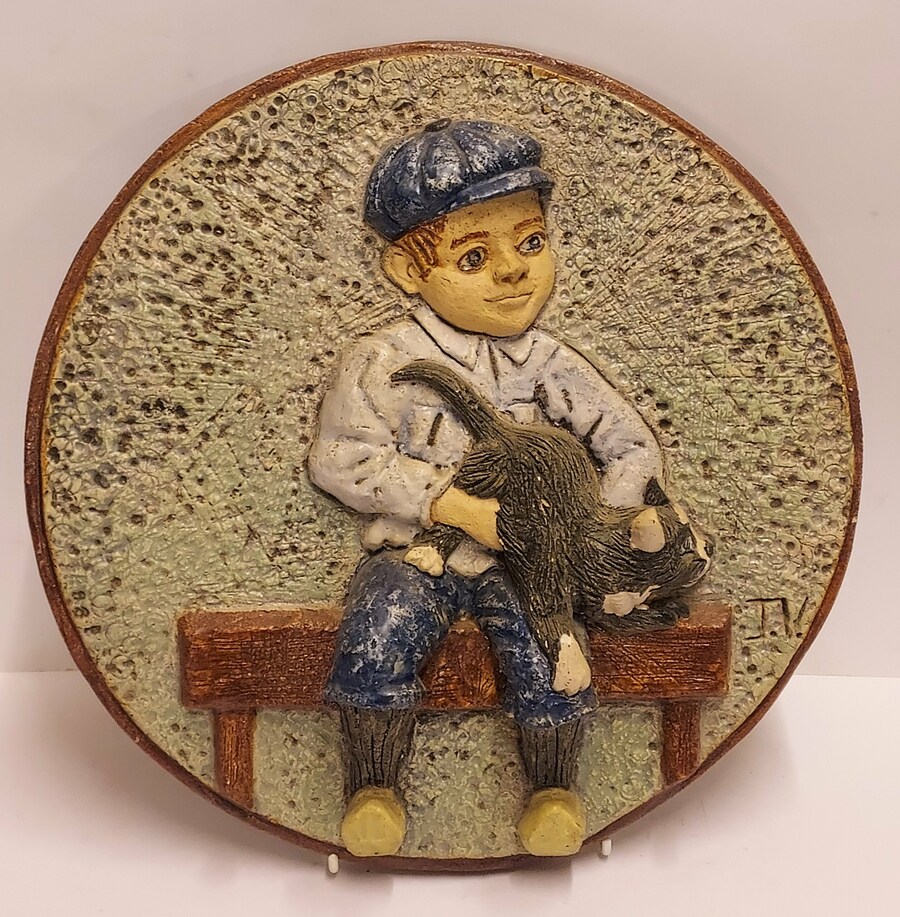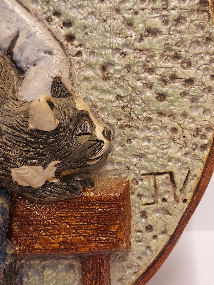 Con decoración en relieve de un niño sentado con un gato en el regazo. En la parte trasera lleva un sello de la marca. En el frente con monograma JV (=Janye Vest).