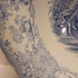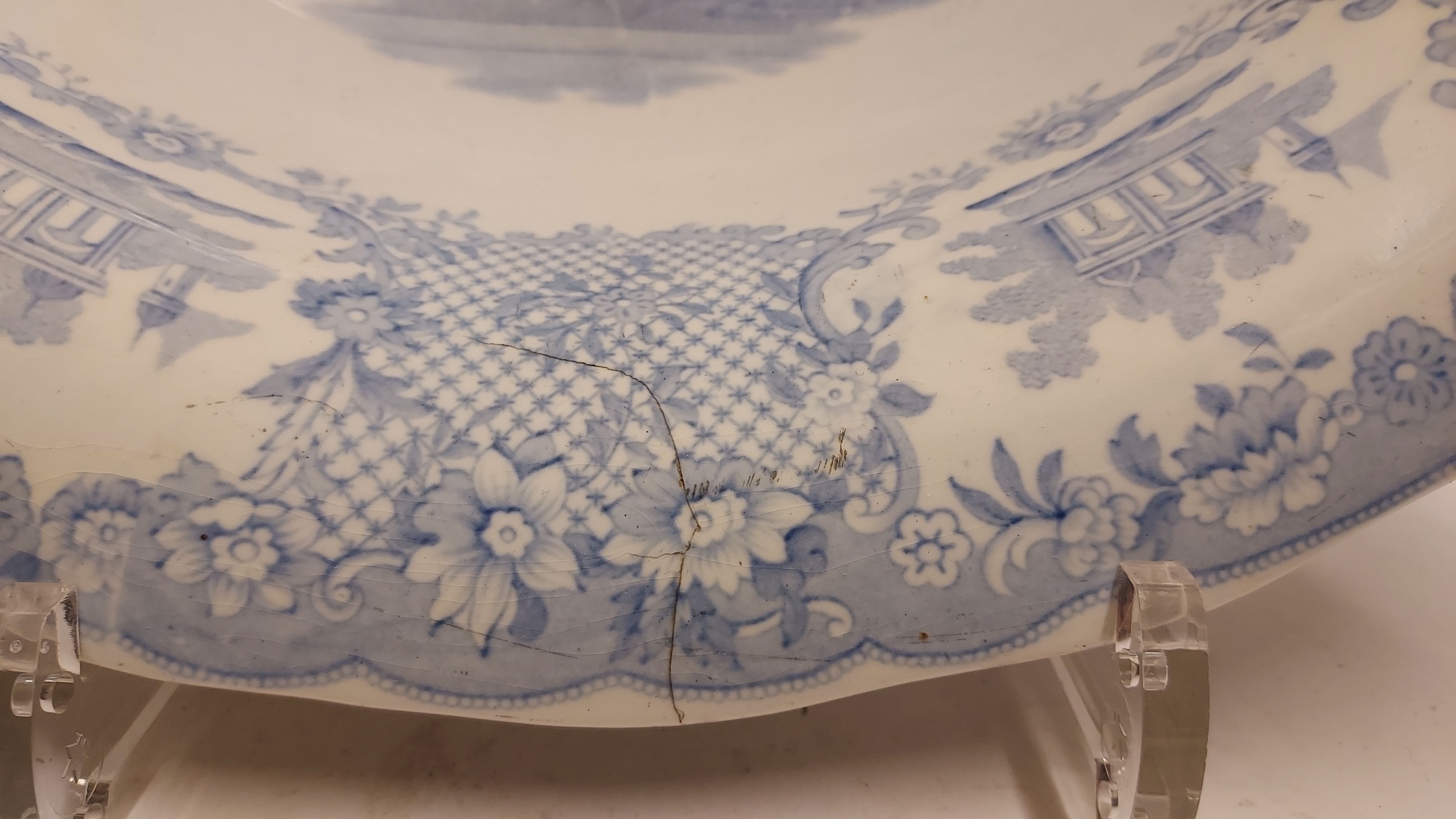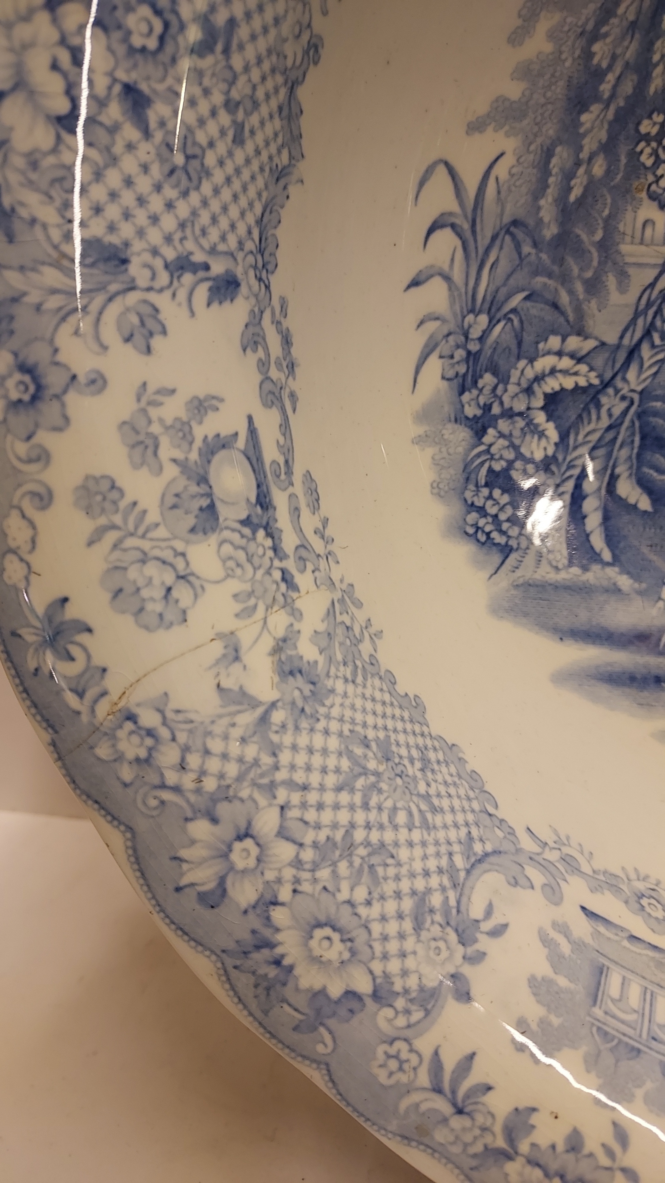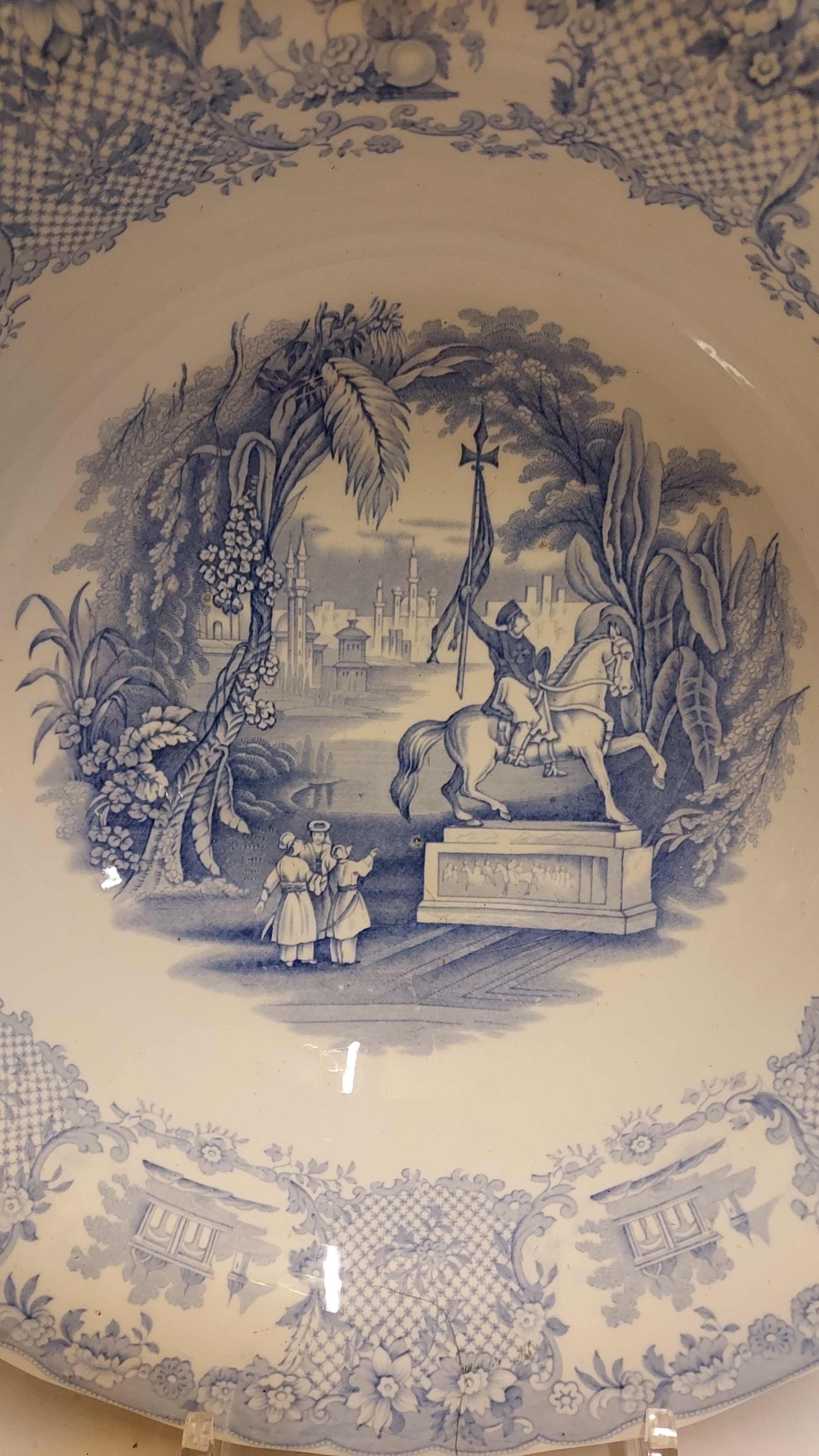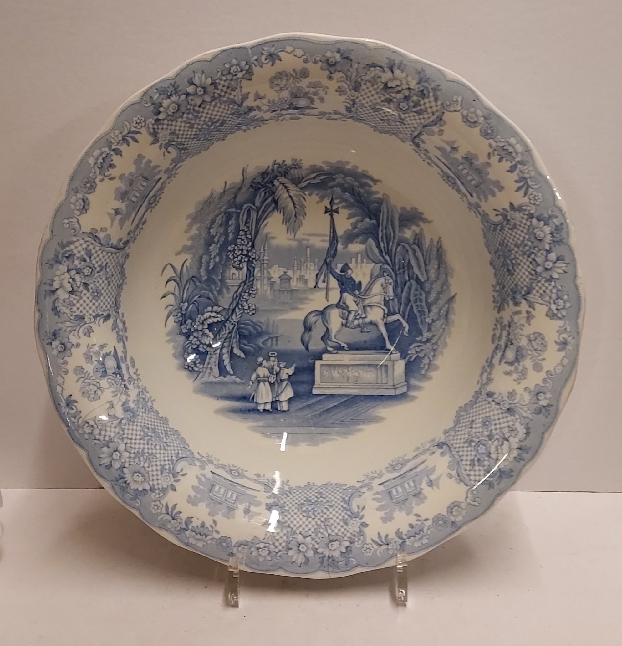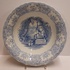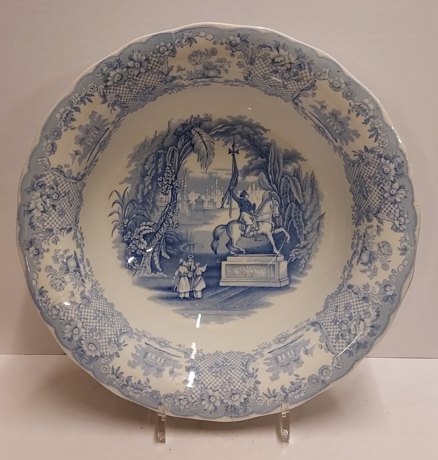 Decoración transfer monocroma en azul claro. Representación de un paisaje con la imagen de Willem de Zwijger. Parte trasera con marca de fábrica y nombre del decorado. Período de producción 1859-1899.