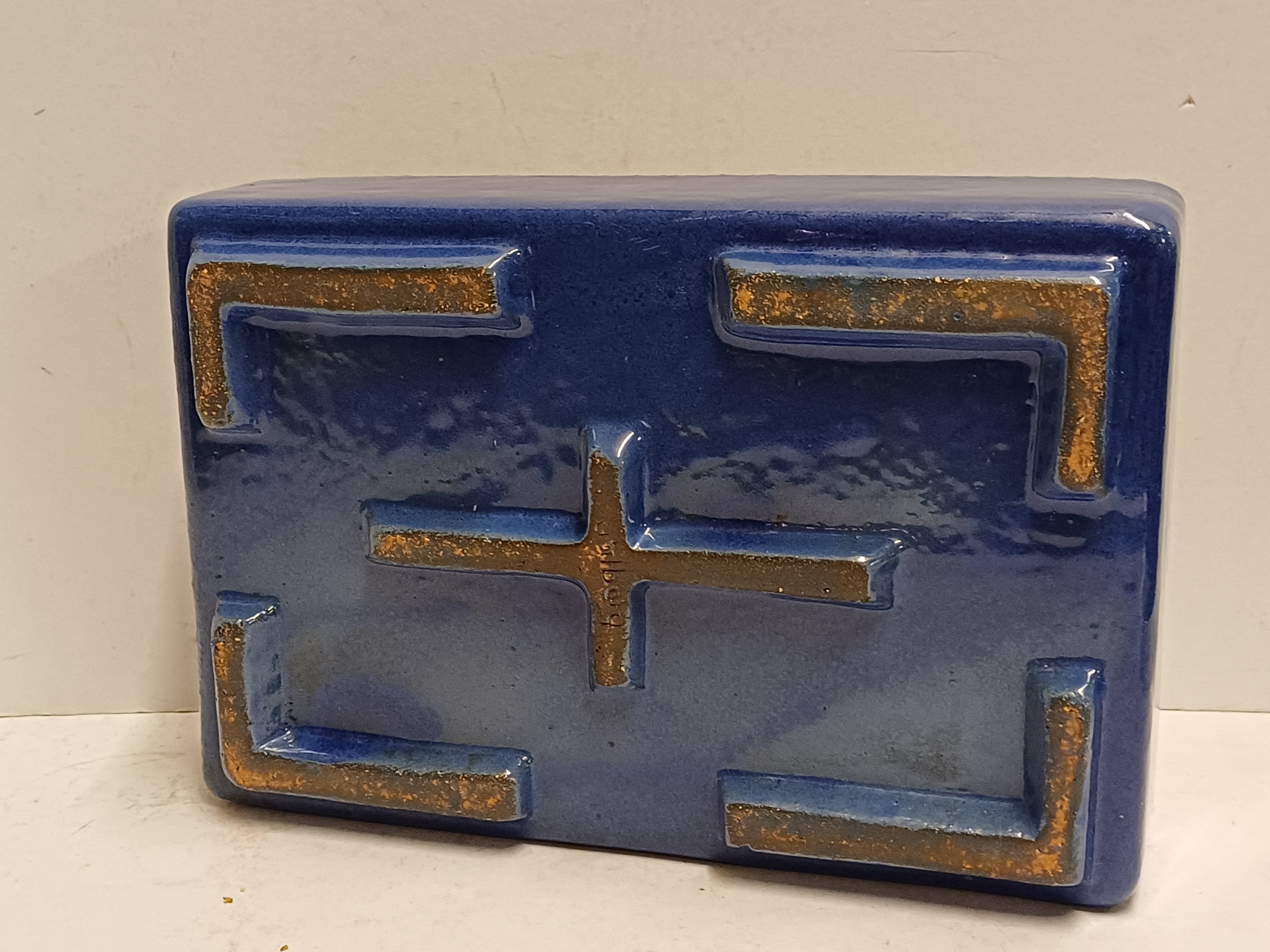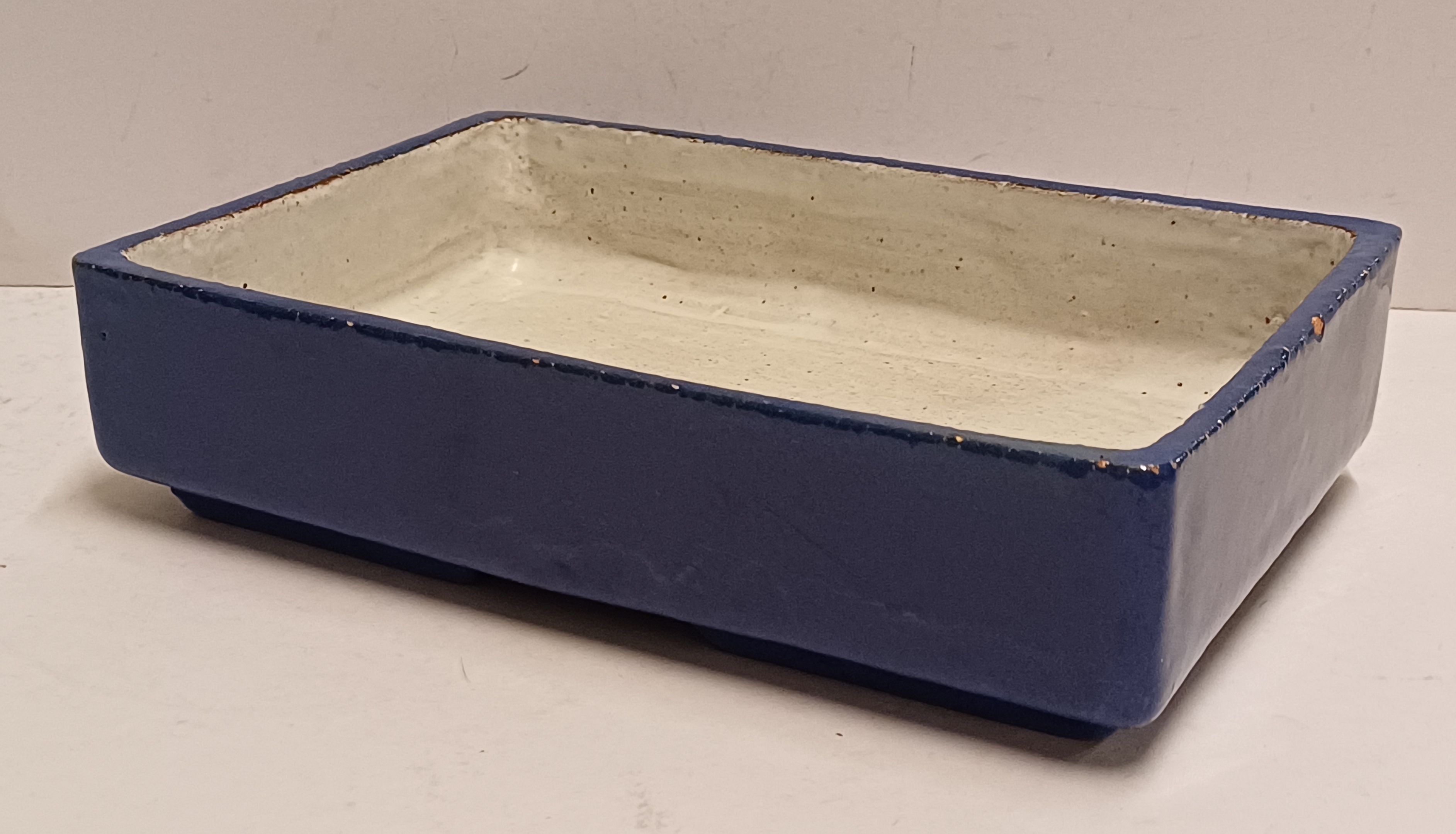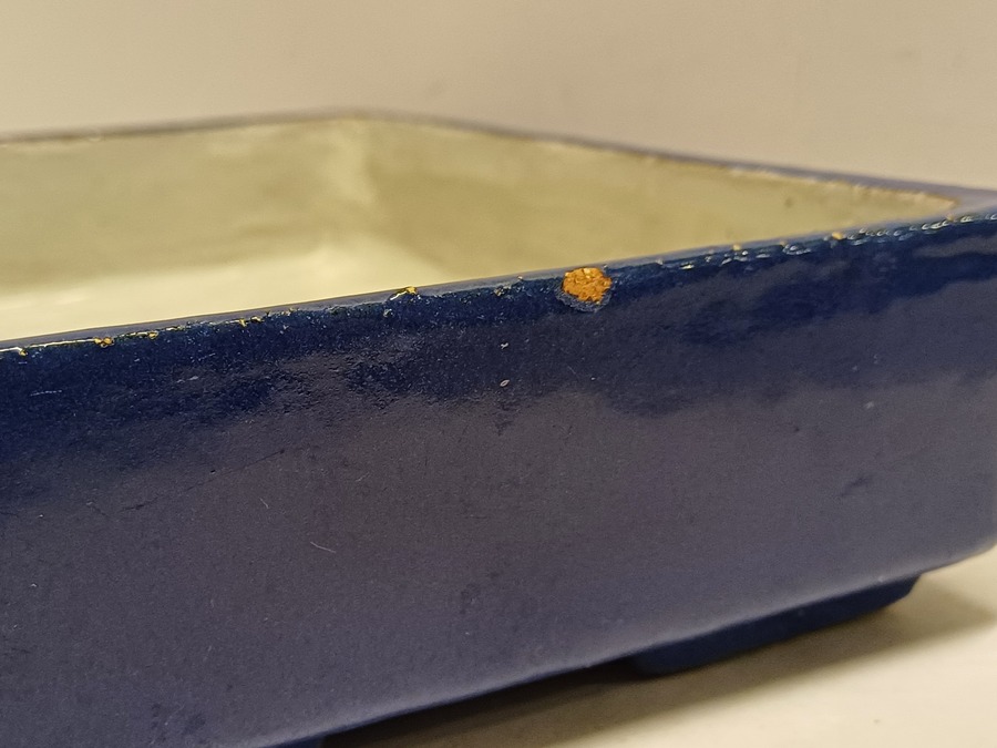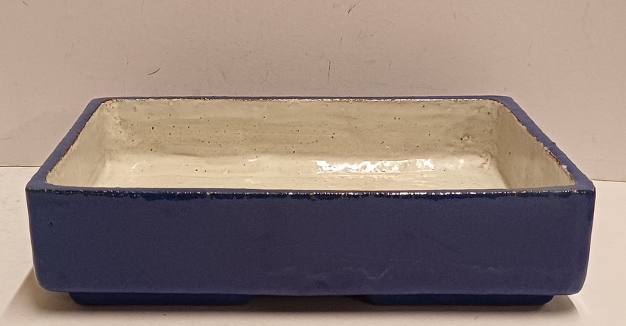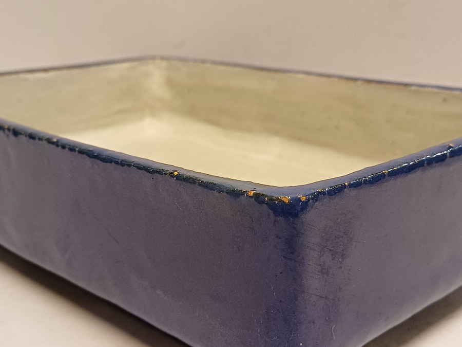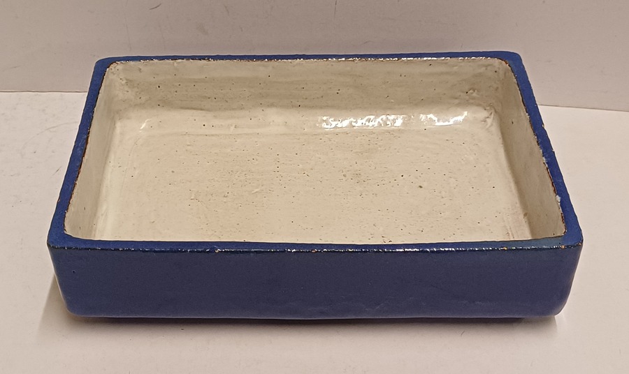 Rechthoekige aardewerken plantenschaal met blauwe geglazuurde buitenzijde. Niet gesigneerd.