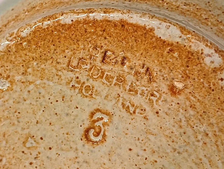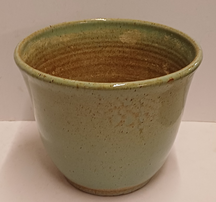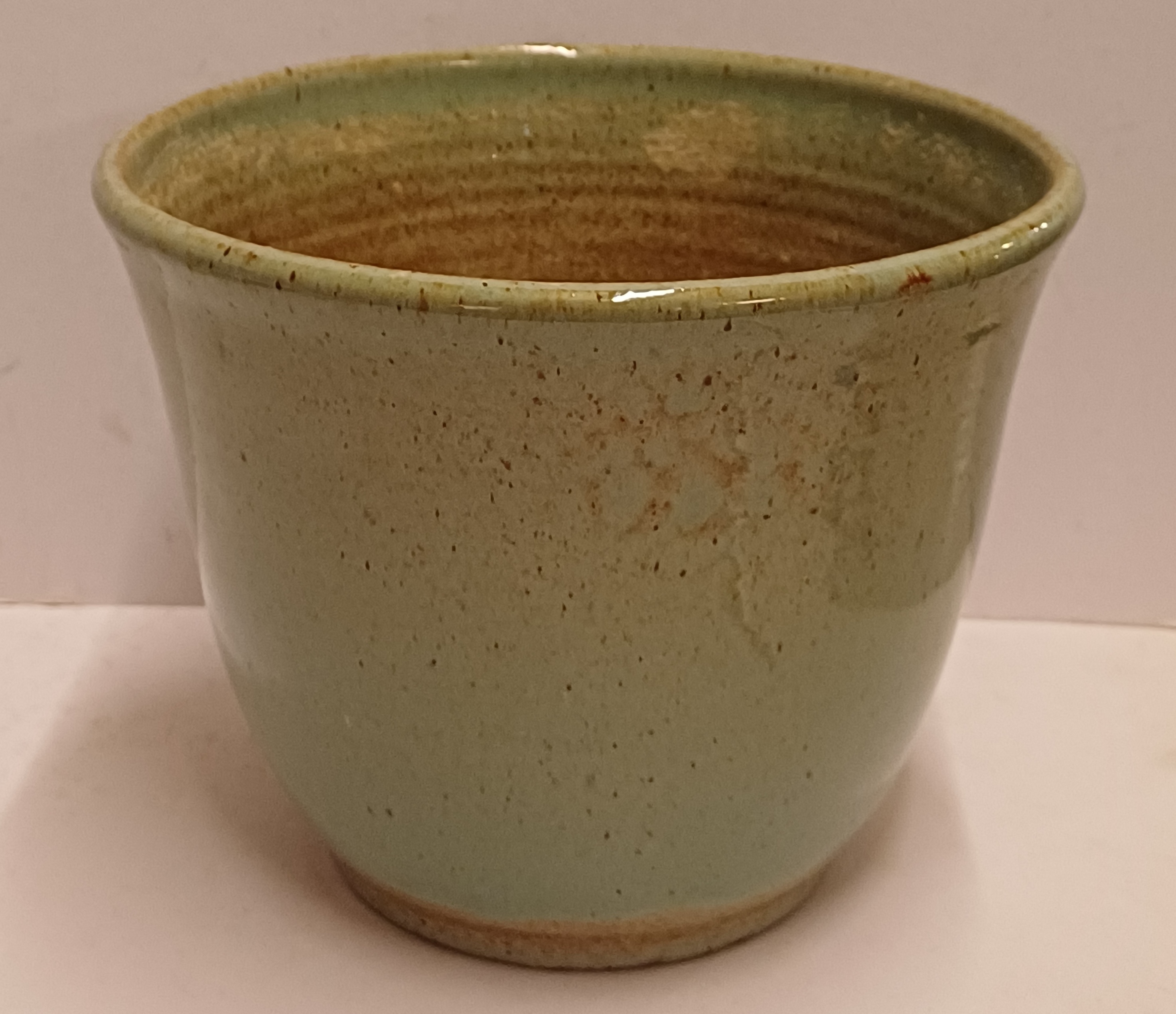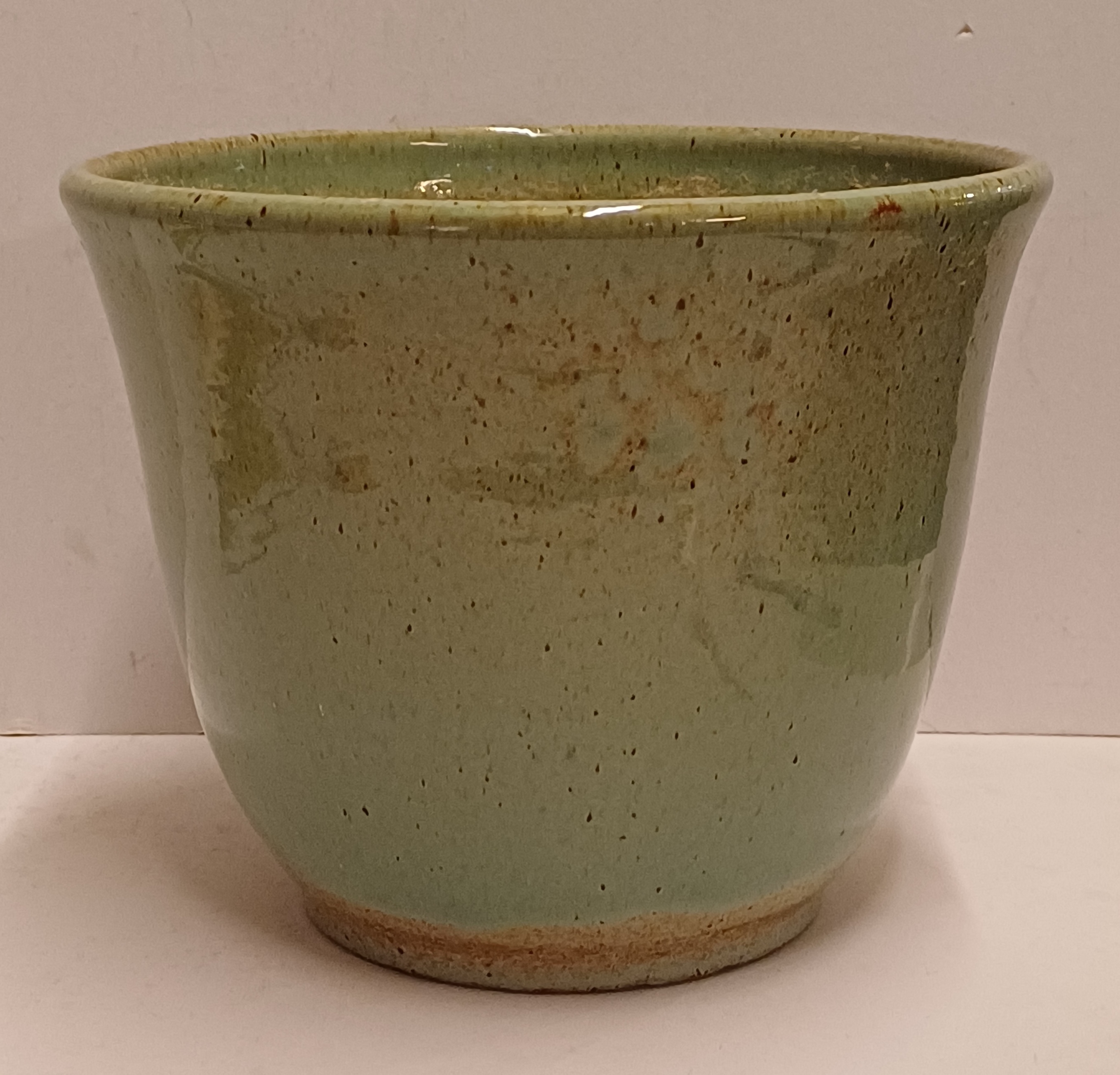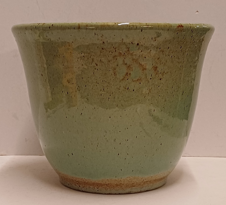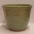Grote bloempot met groene glazuur. Onderzijde met fabrieksmerk.