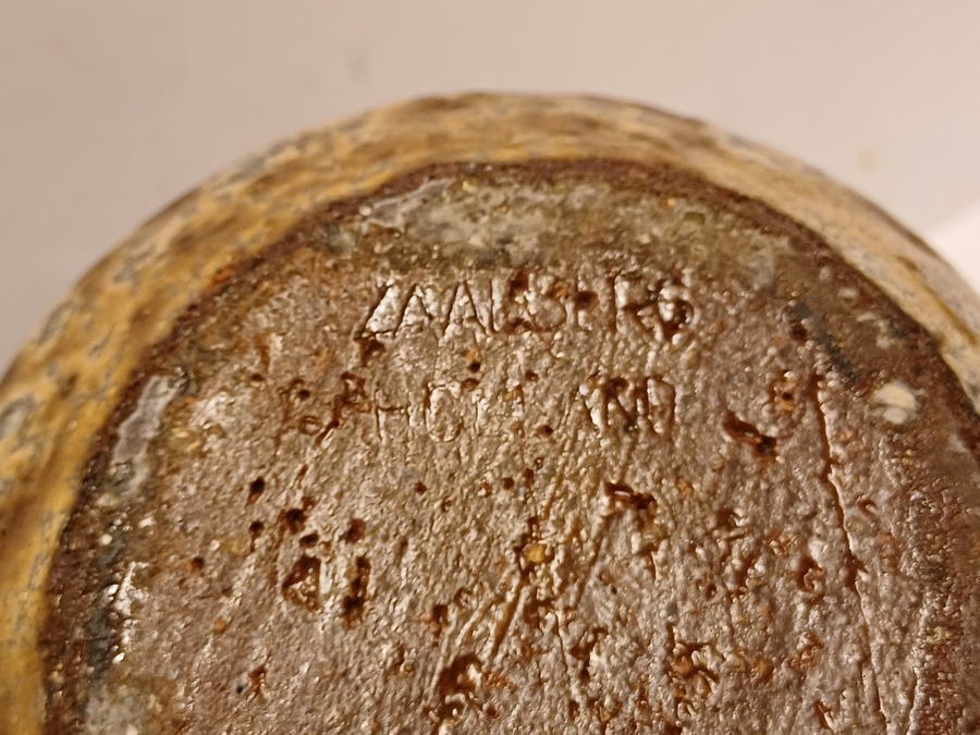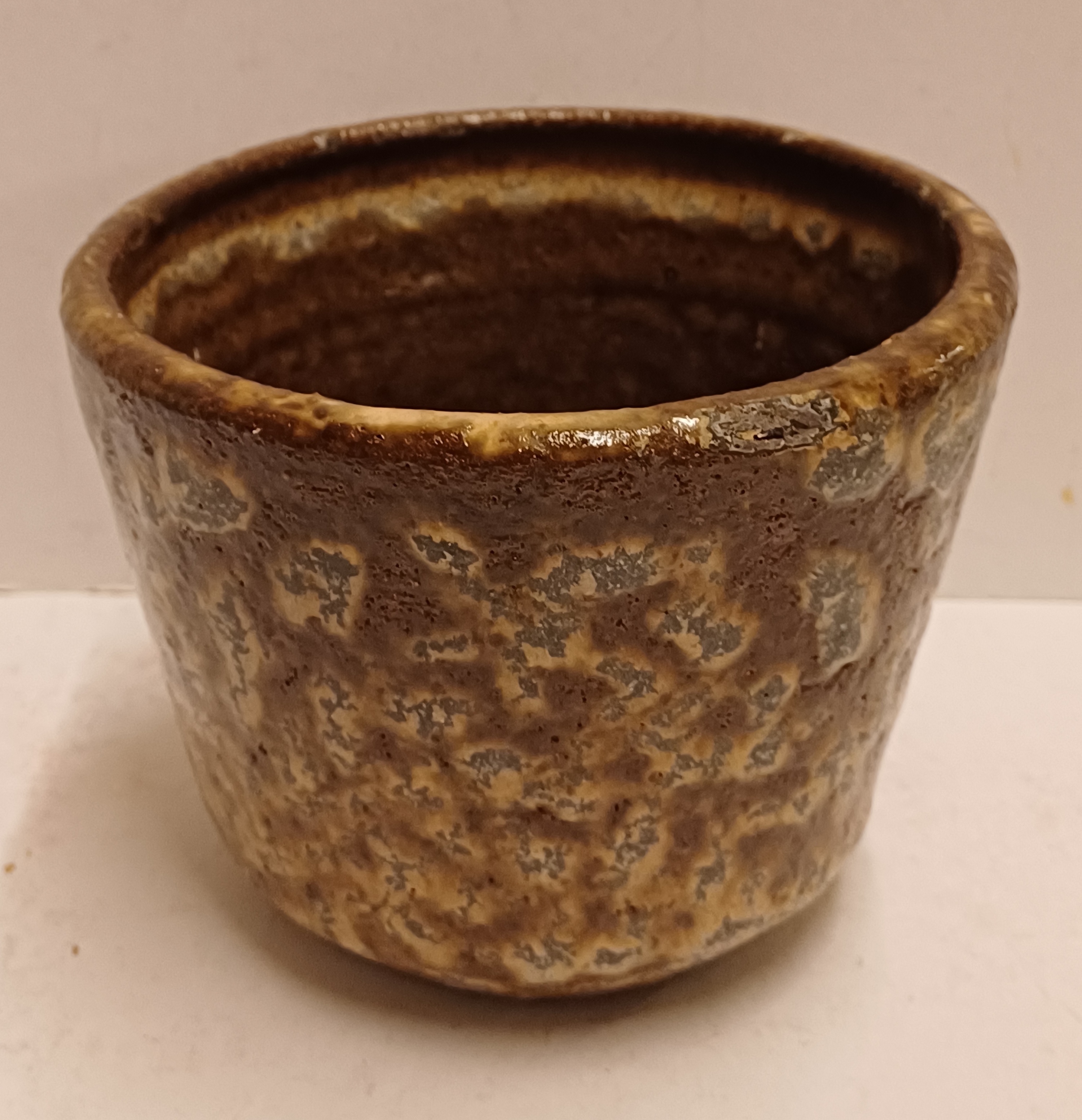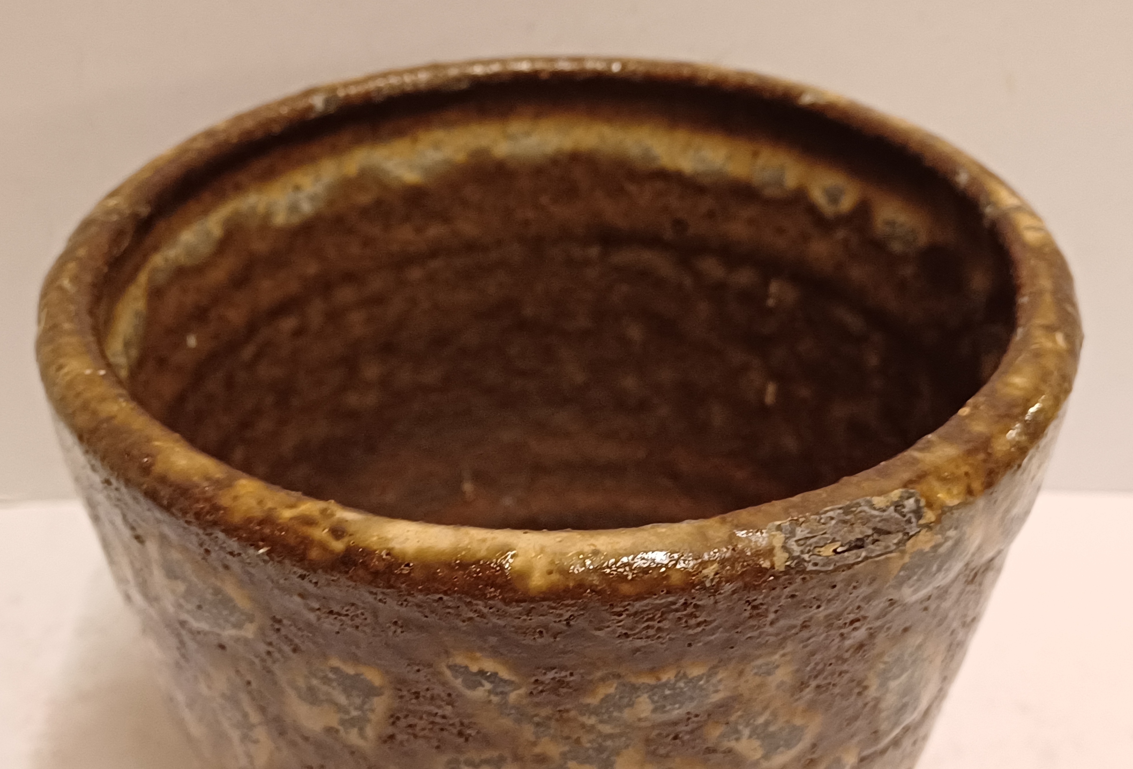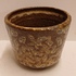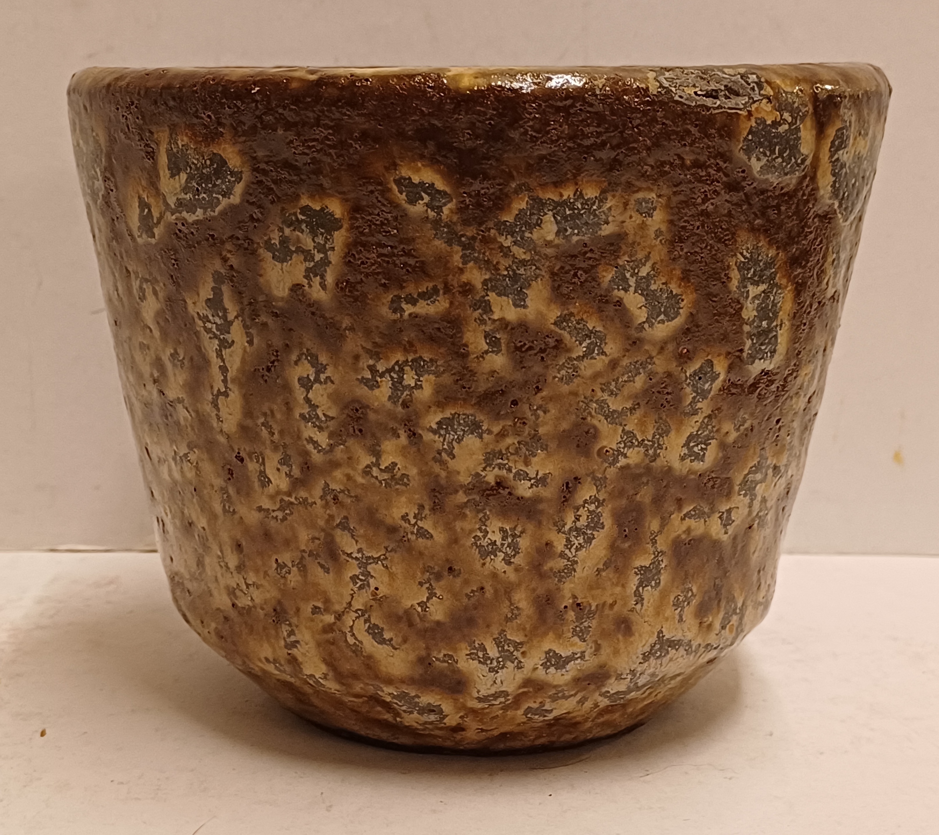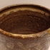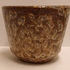 Aardewerken bloempot met bruine glazuur. Onderzijde met fabrieksmerk.