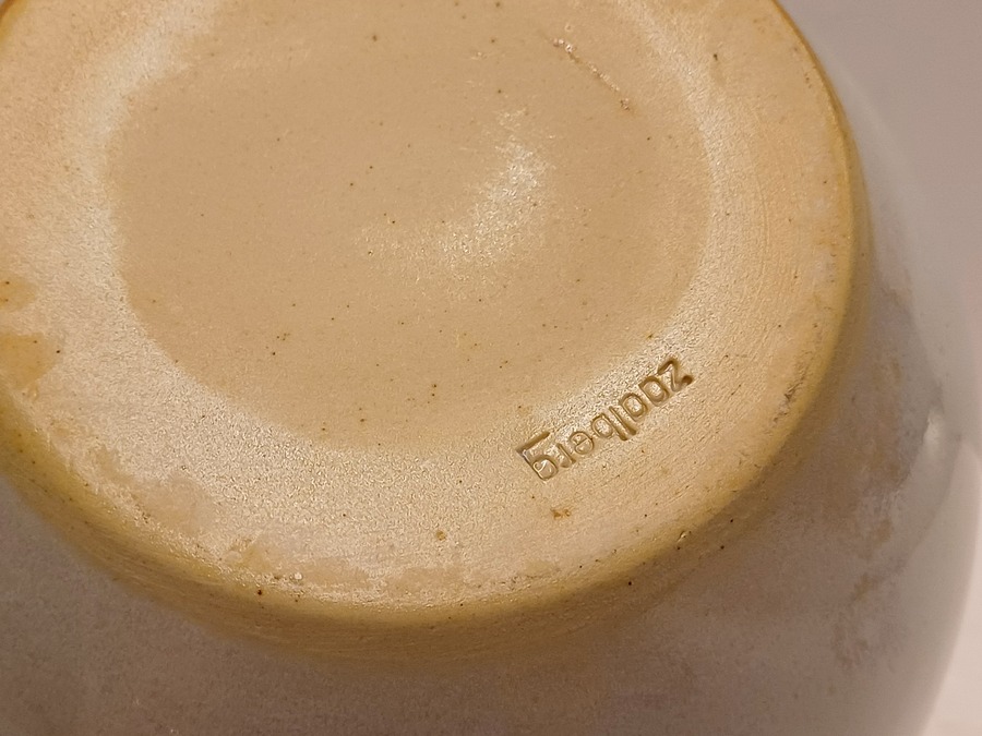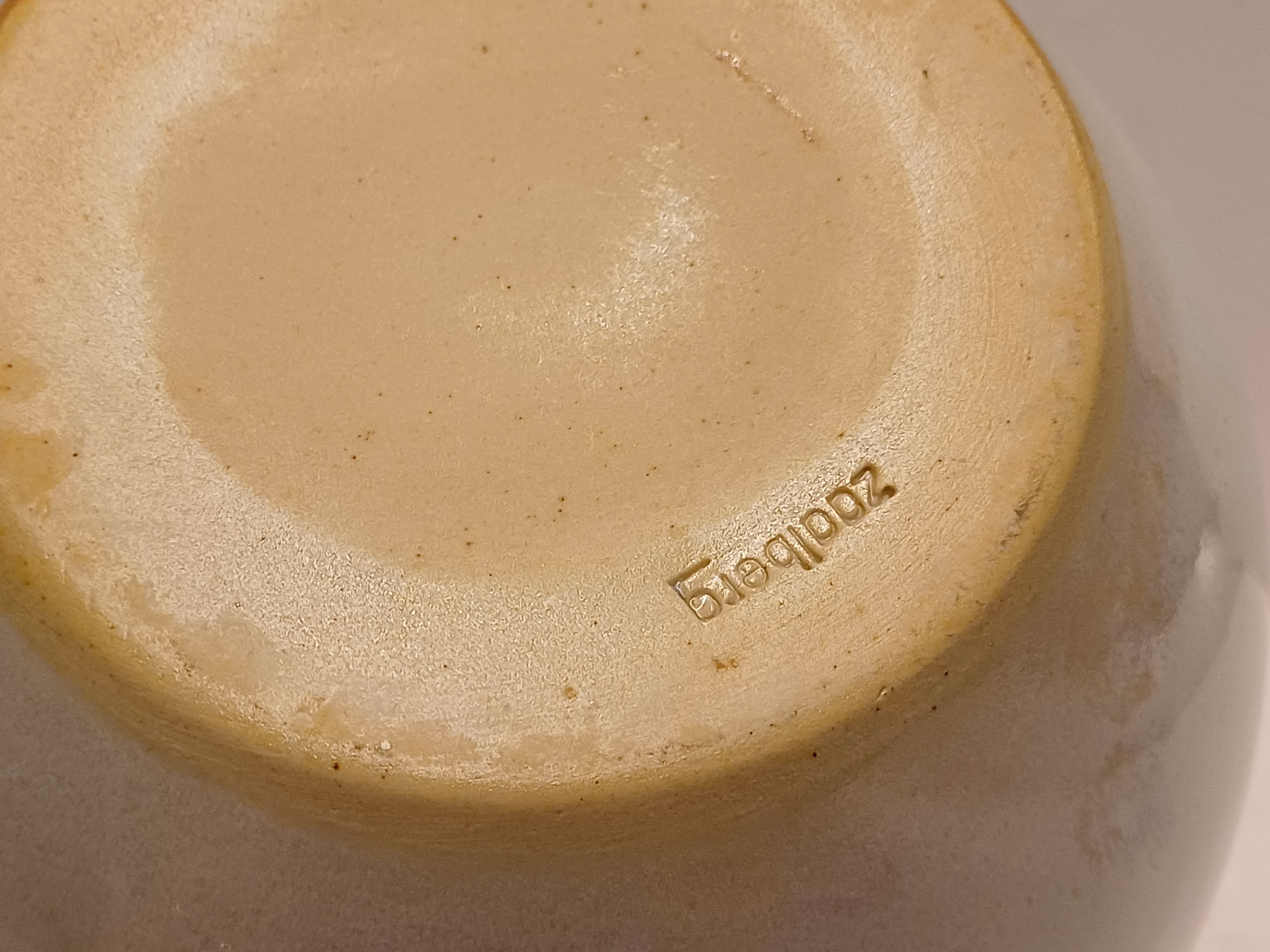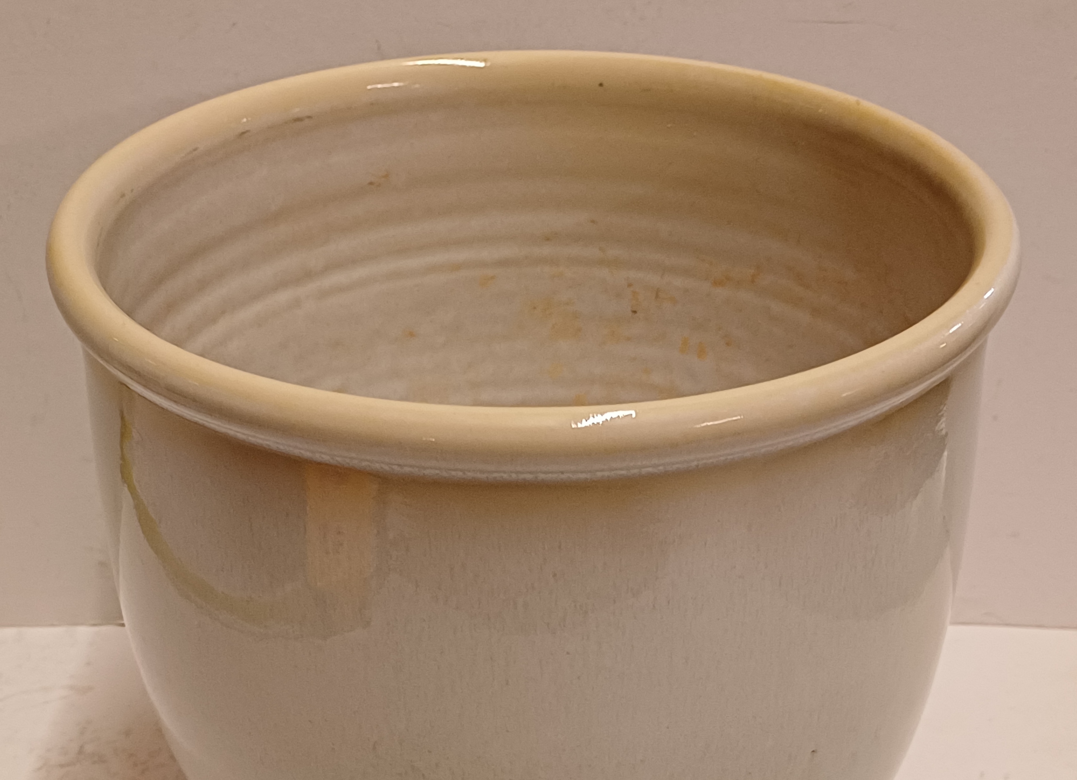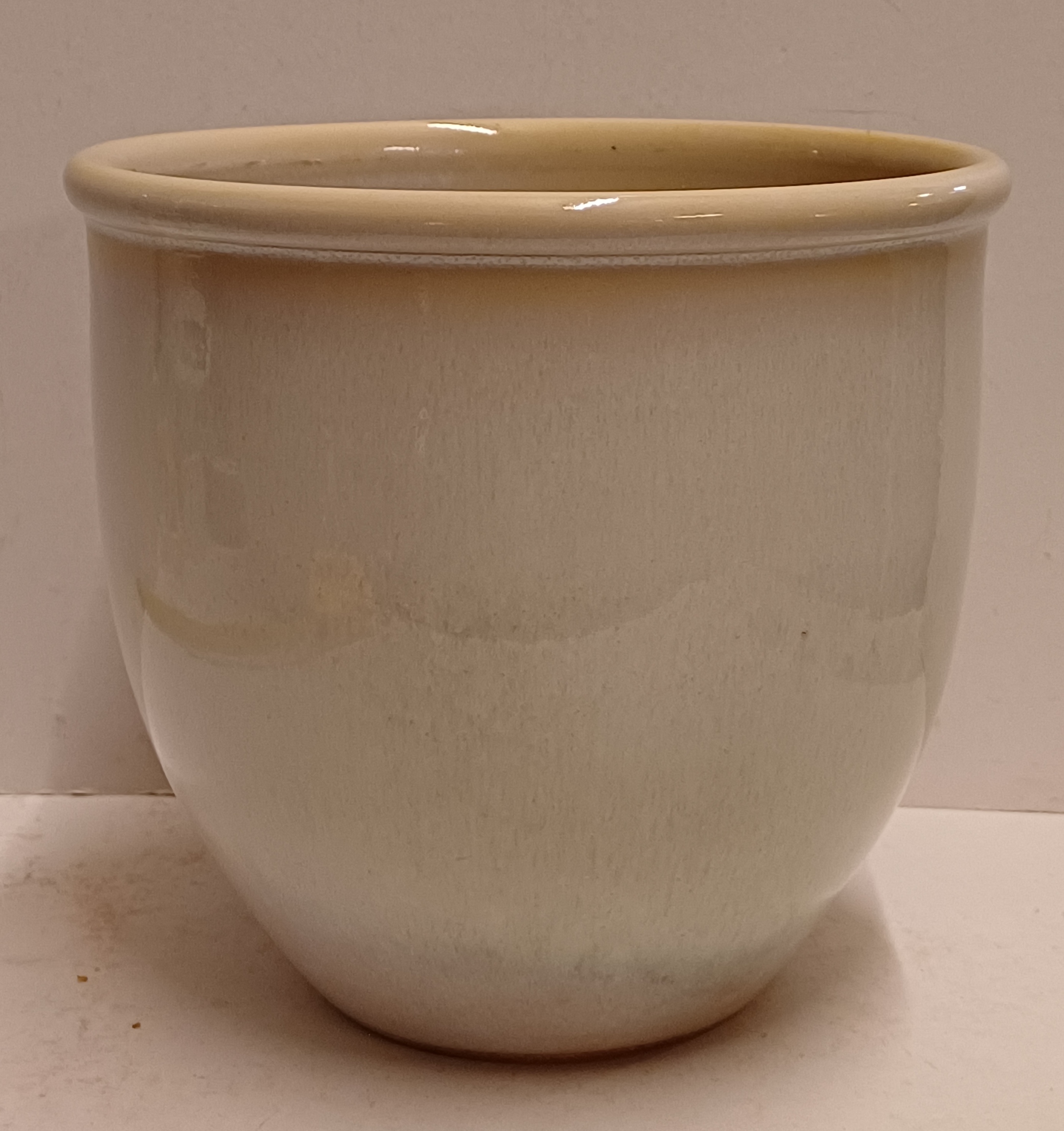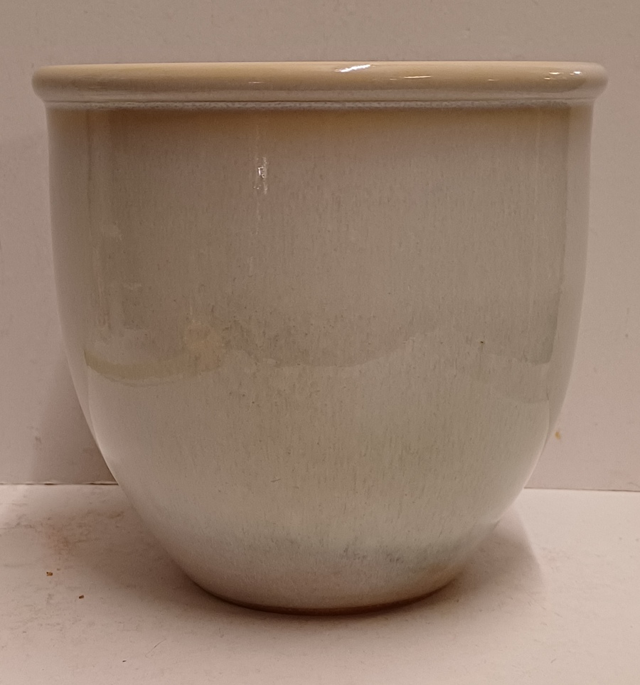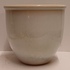 Grote aardewerken bloempot met lichtblauwe gemêleerde glazuur. Onderzijde gemerkt.