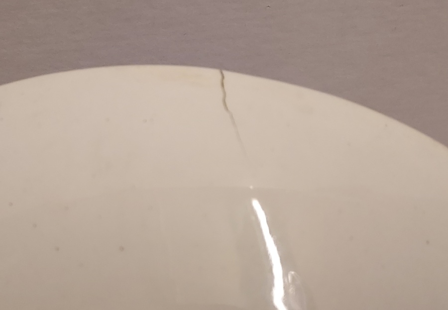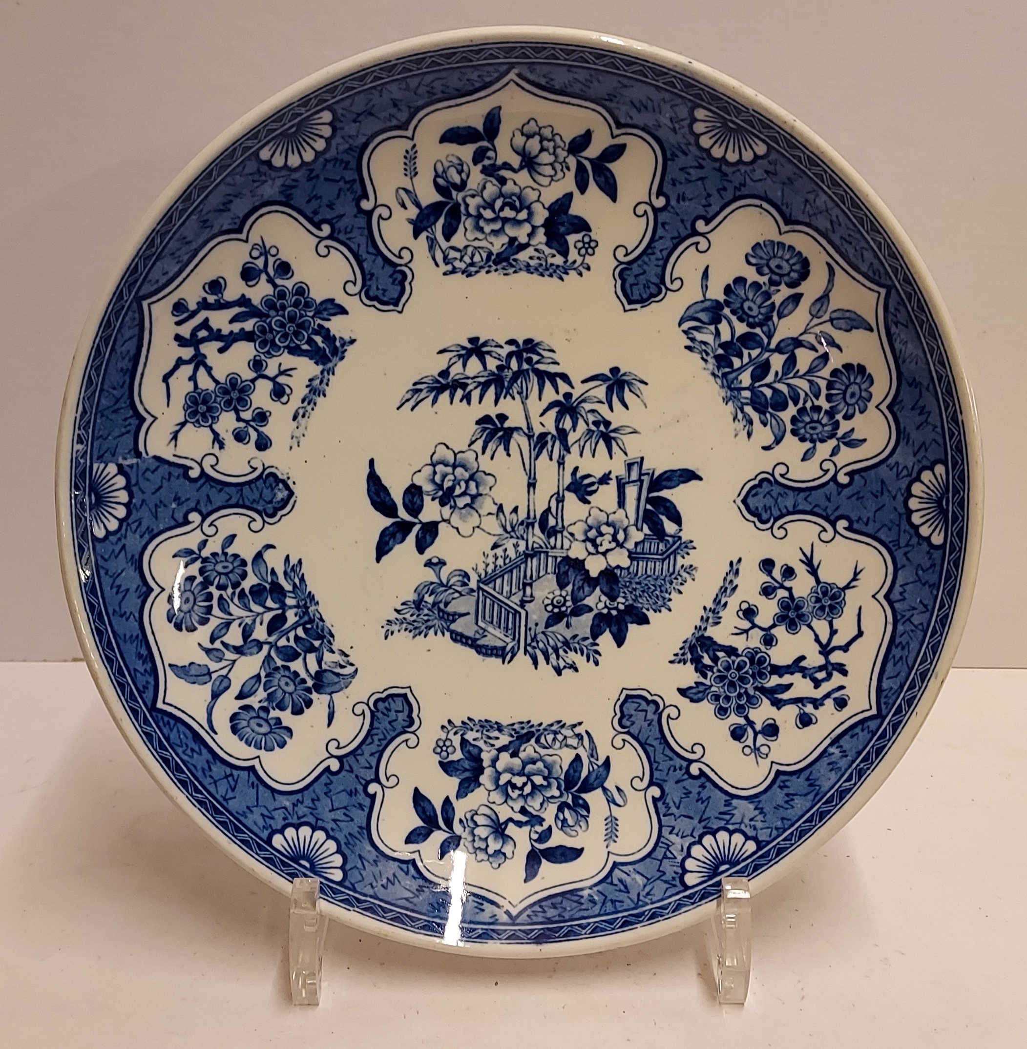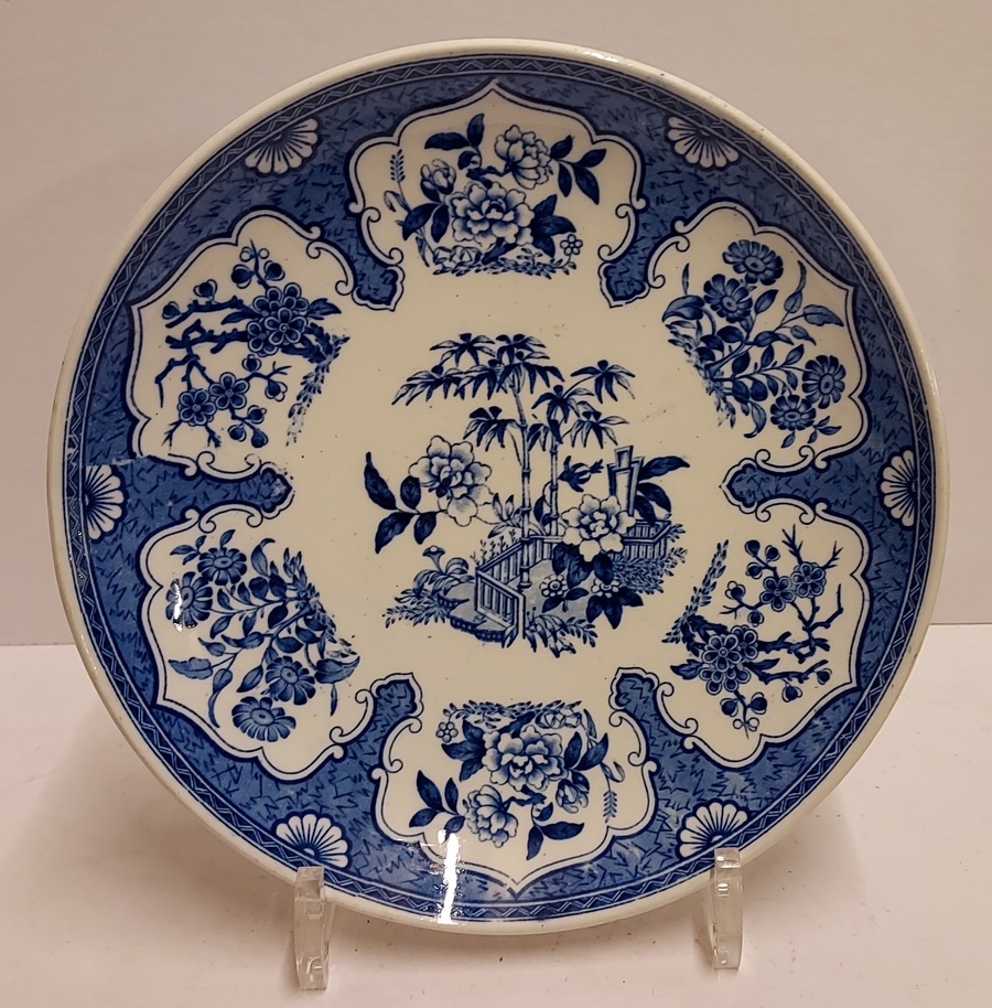 Décor en transfert bleu. Verso avec marque de fabrique et datation au tourbe 1892.