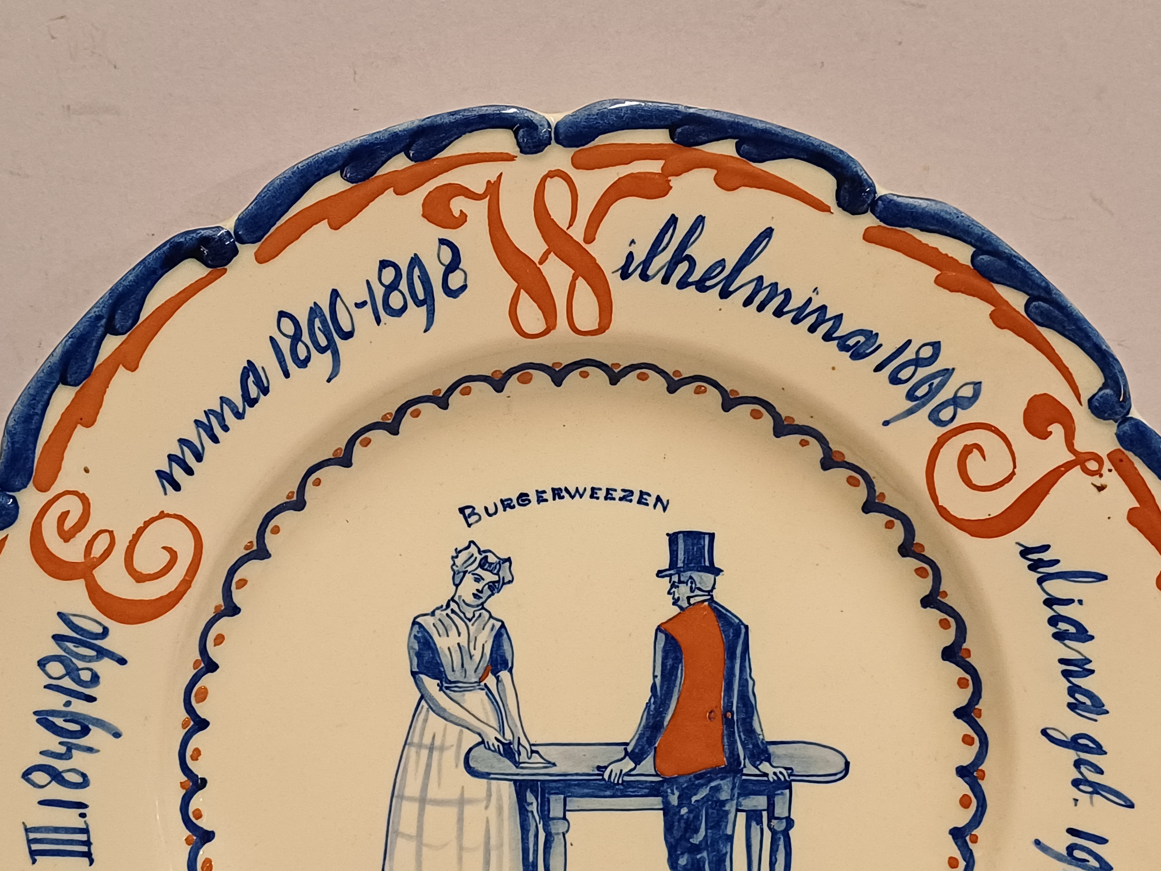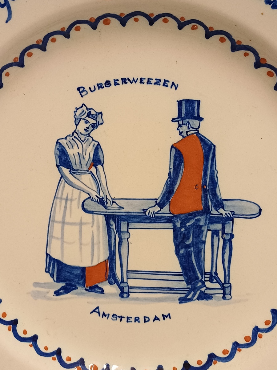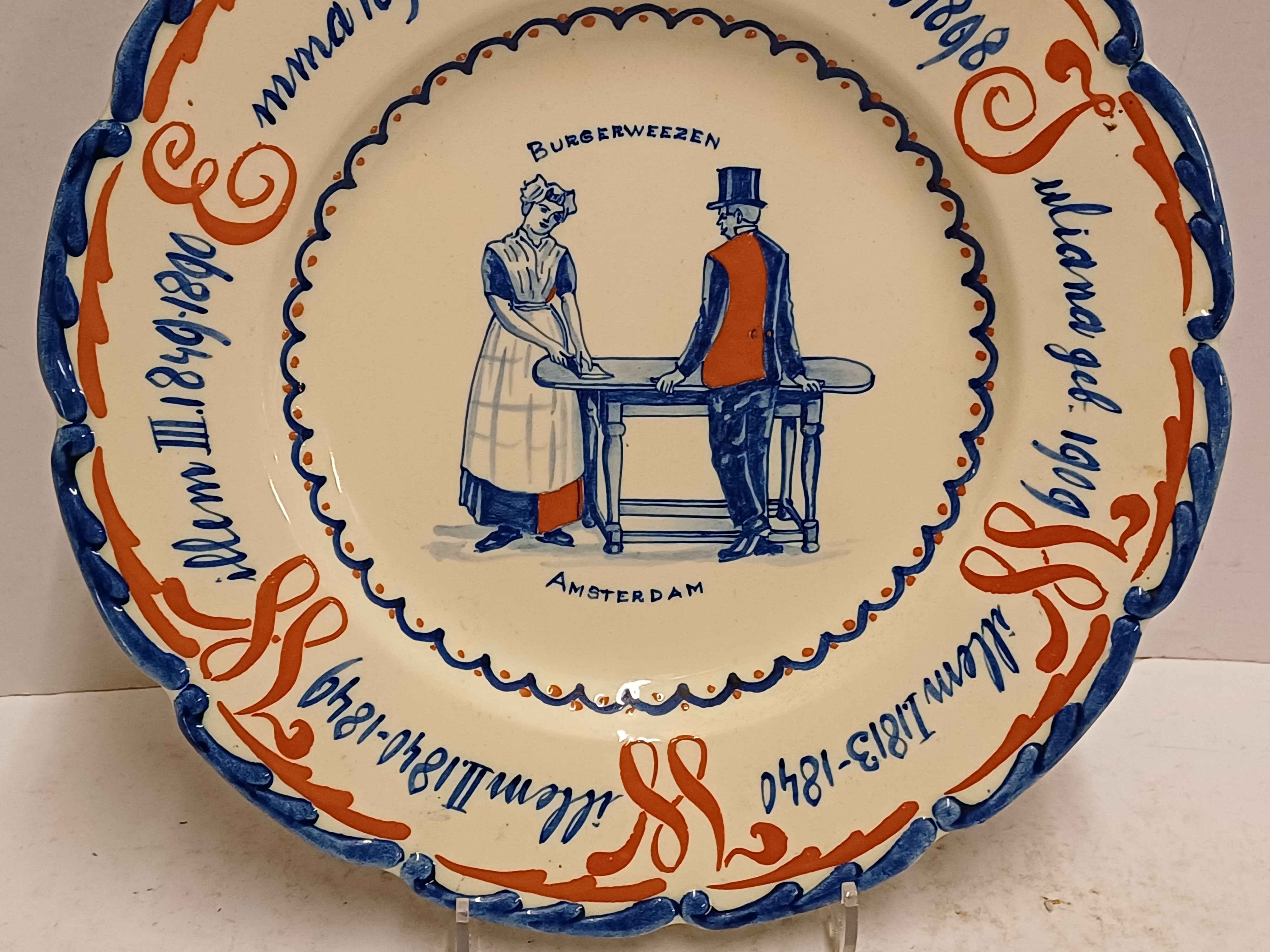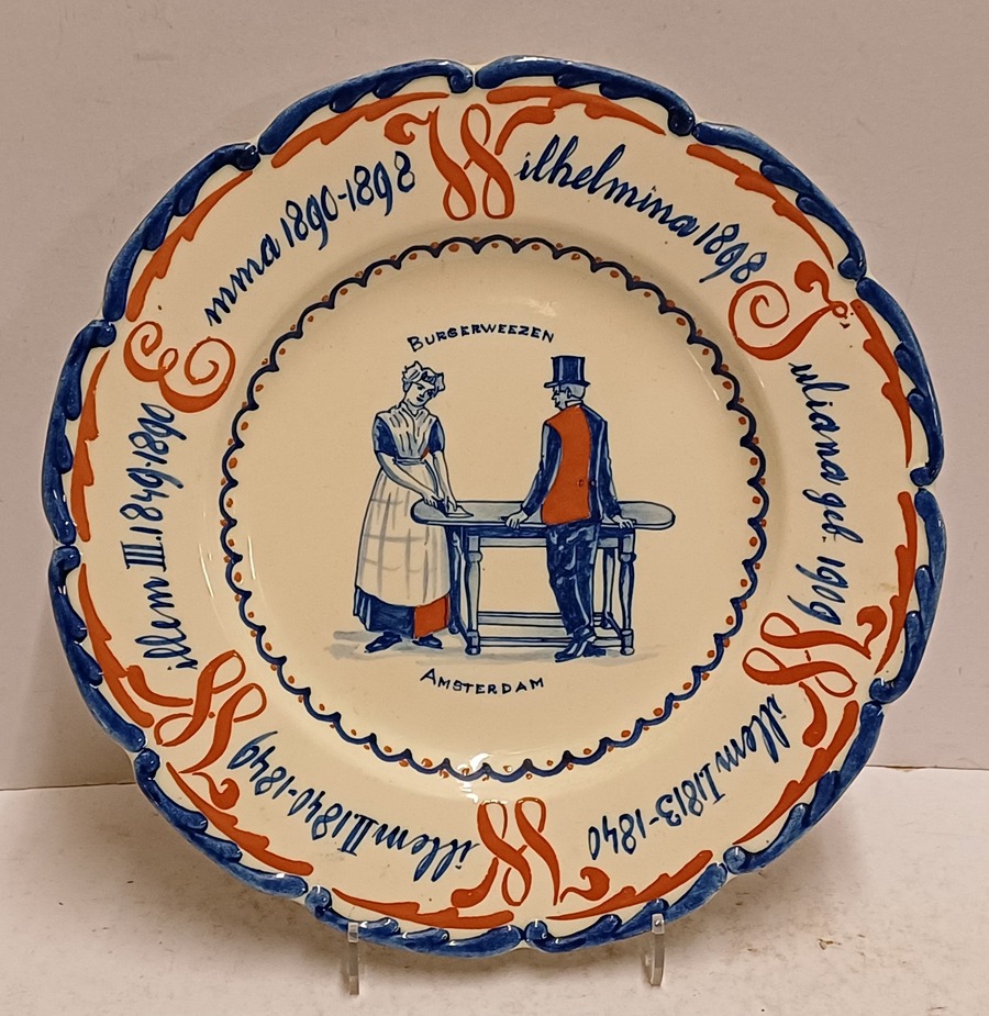 Platelen bord met op de lip de de staatshoofden op chronologische volgorde. Op het plat Afbeelding van het burgerwezen Amsterdam, uit de serie over het Burgerweeshuis te Amsterdam . Achterzijde met fabrieksmerk.