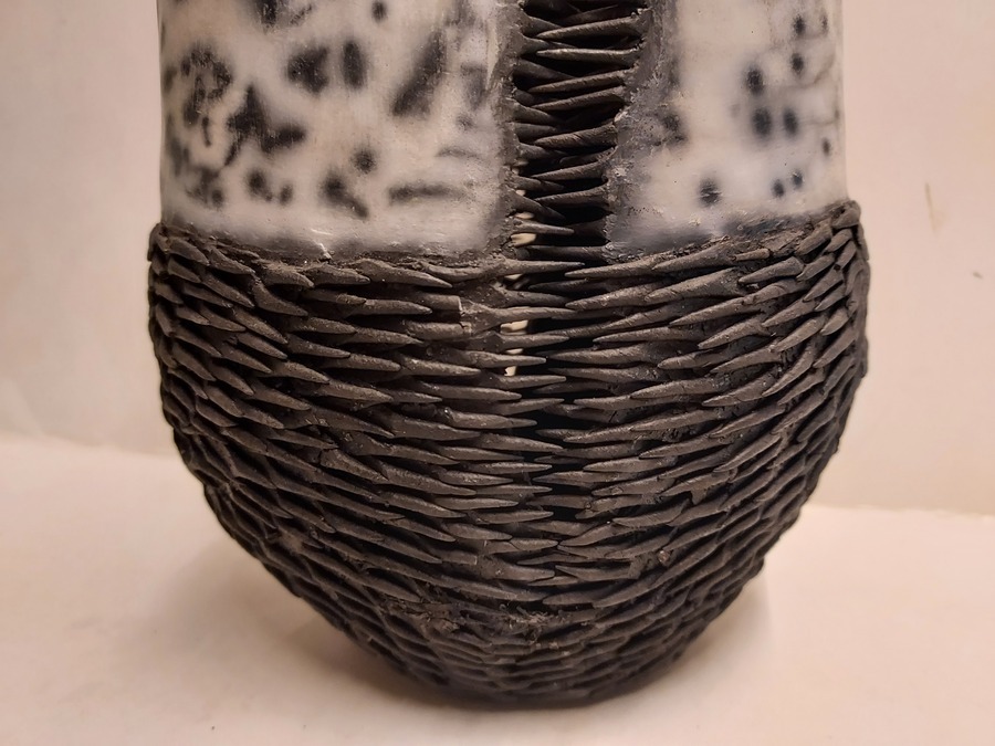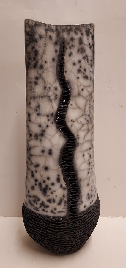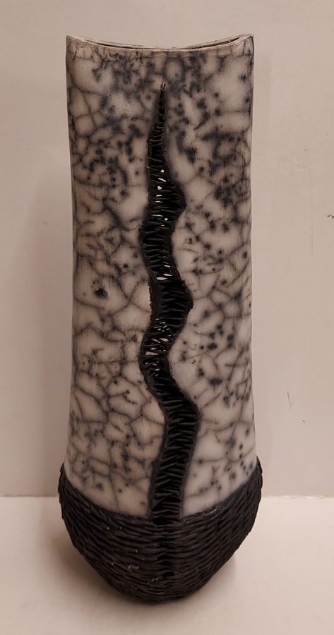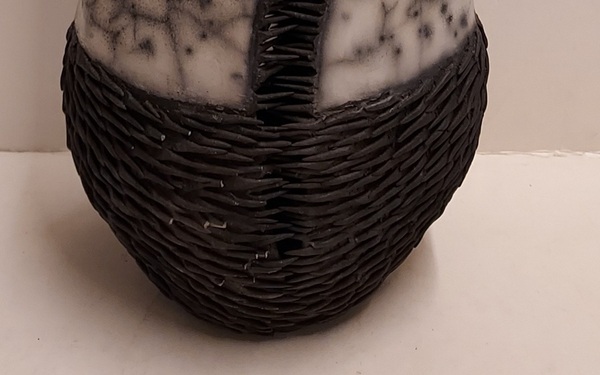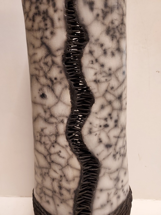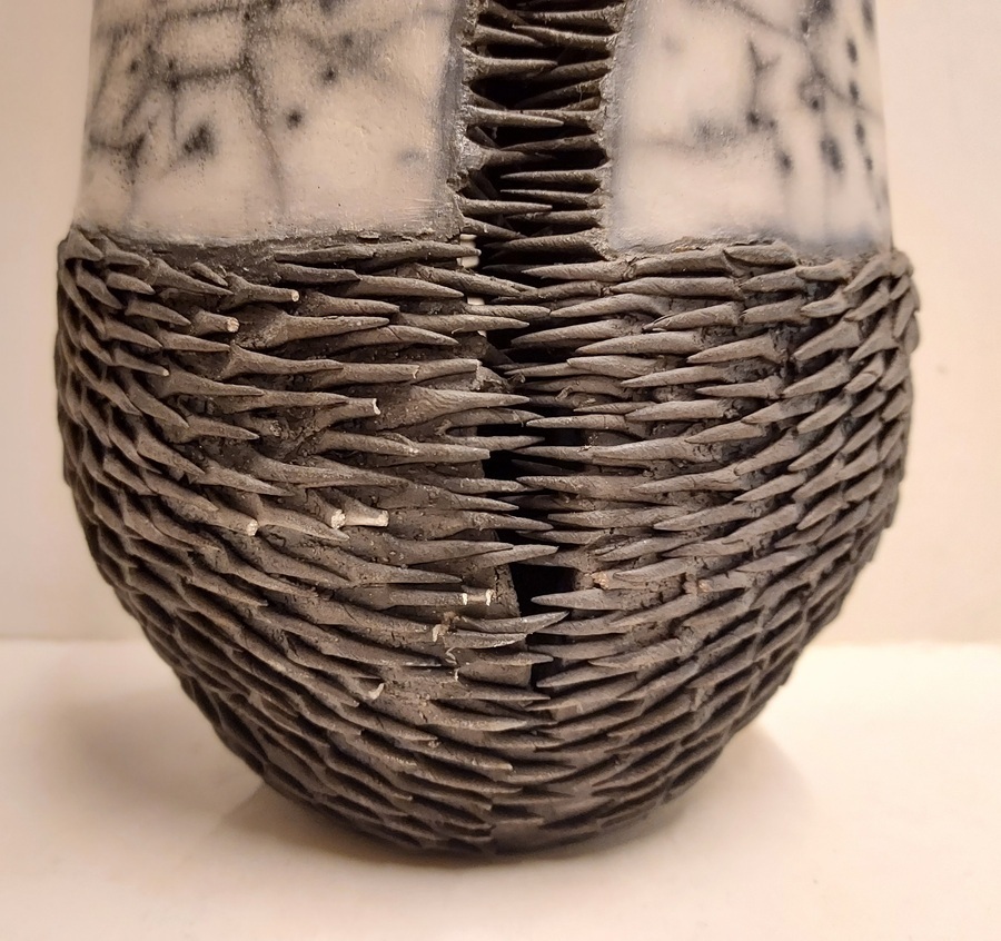 Vase en céramique cuit au raku avec des épines noires.