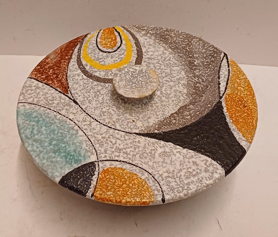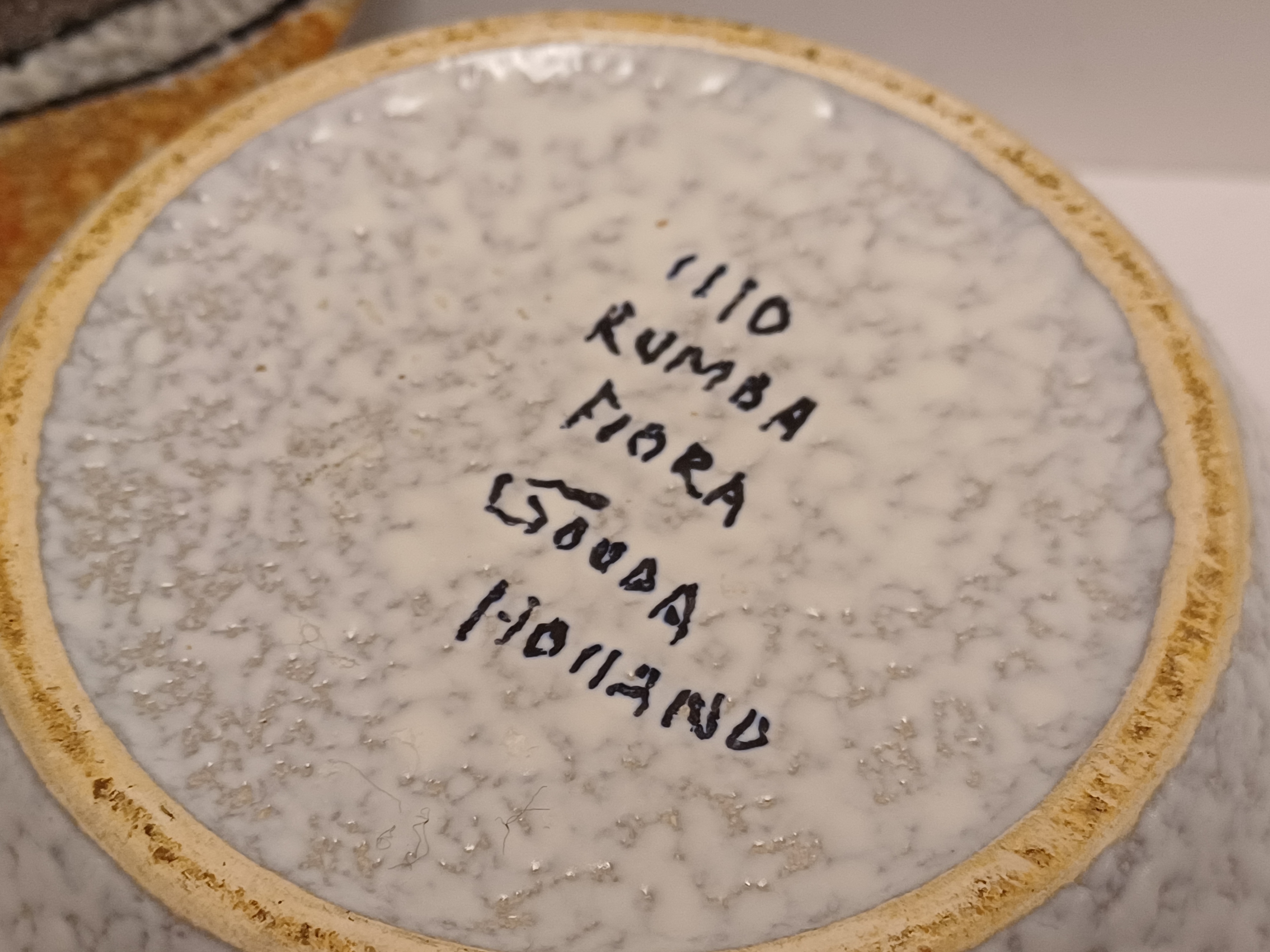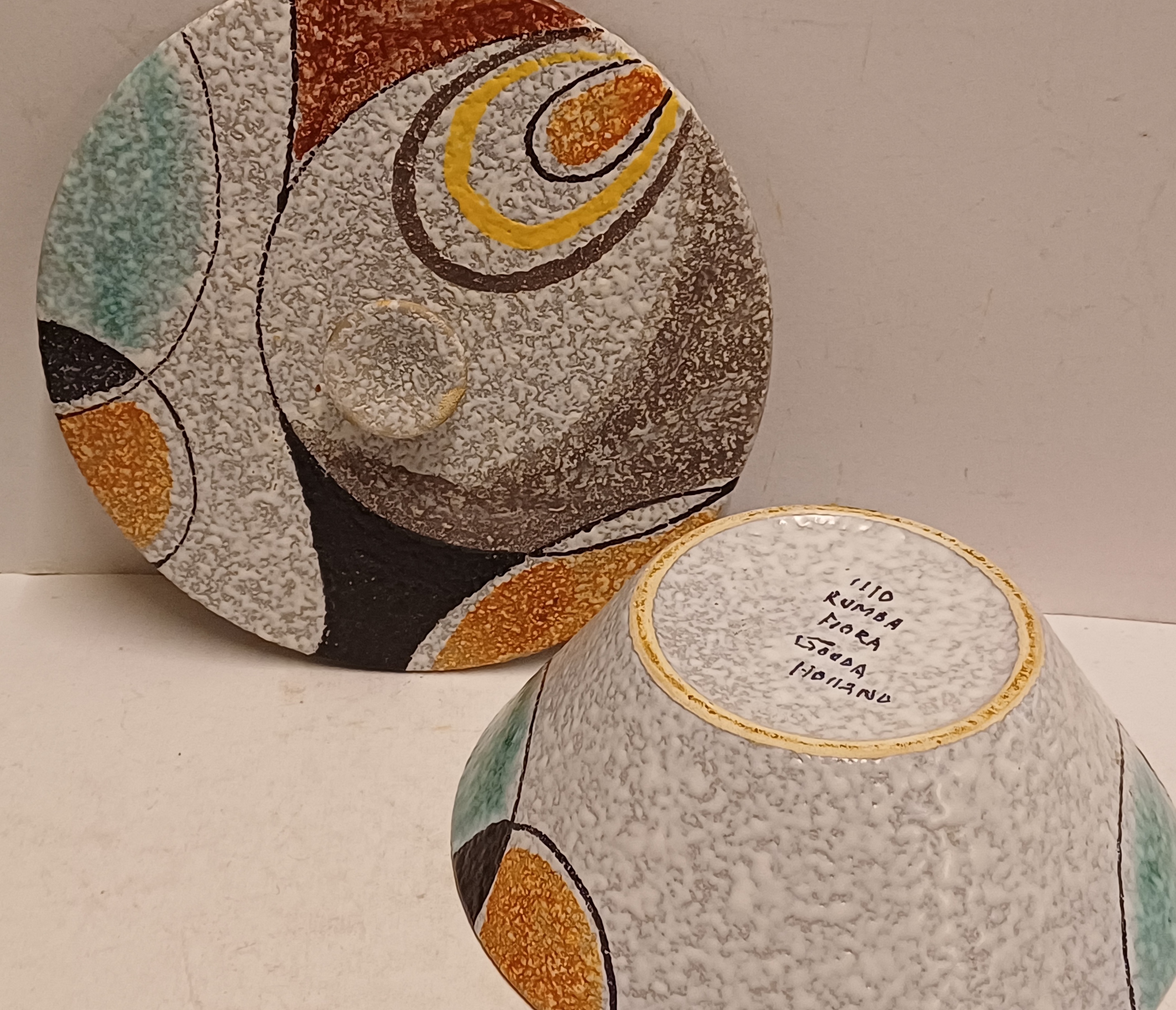 Platelen dekseldoos met decor Rumba op grijs fond. Onderzijde met fabrieksmerk en modelnummer.